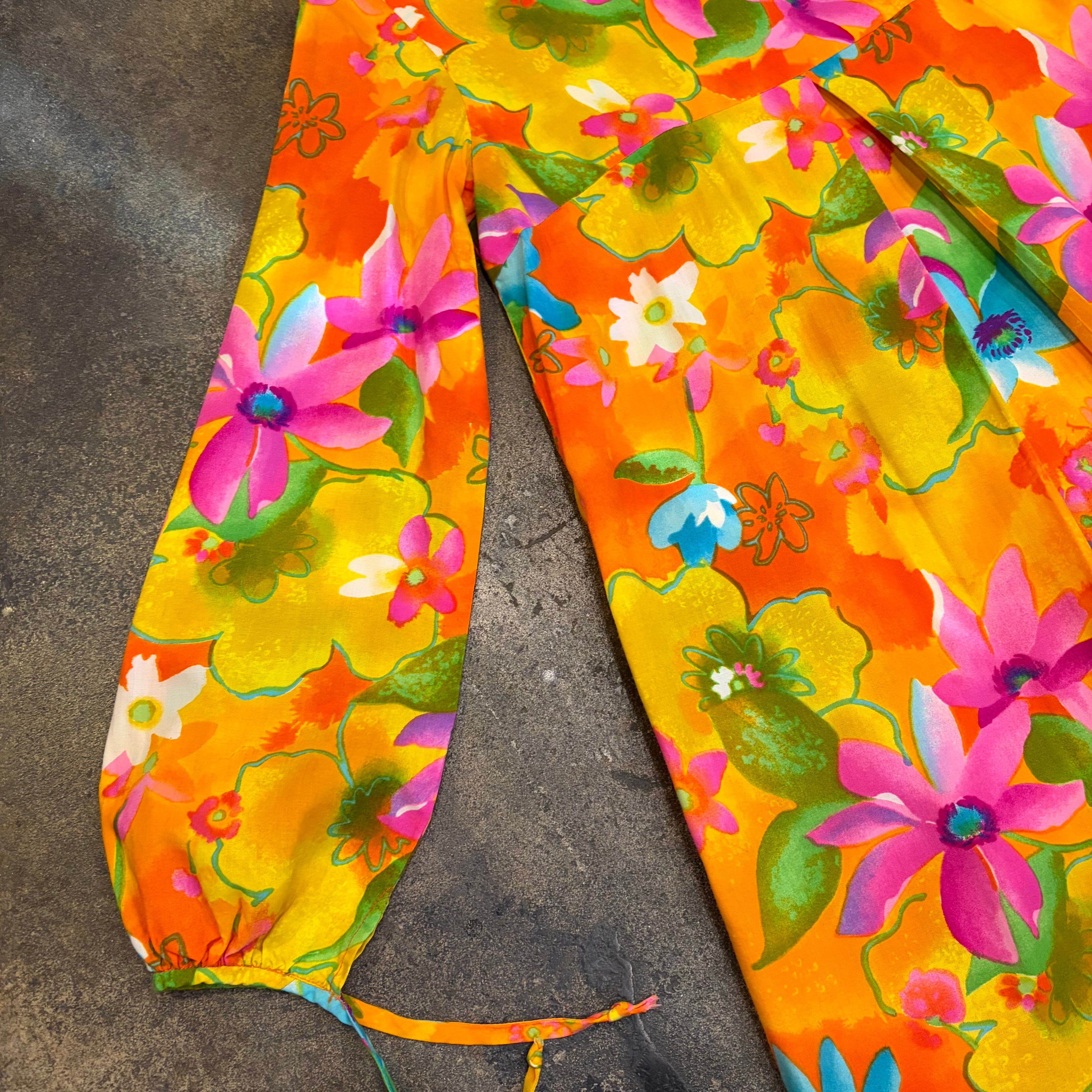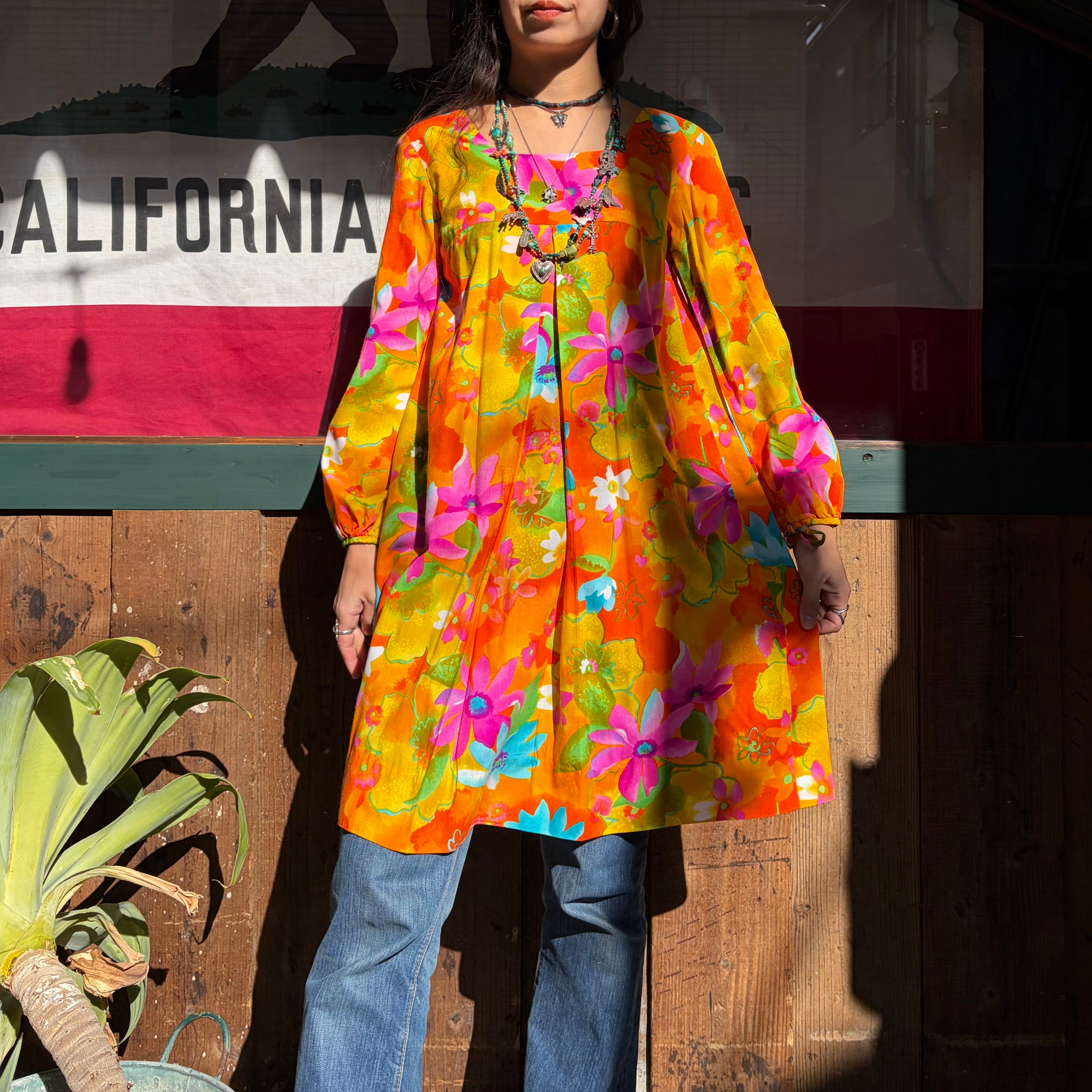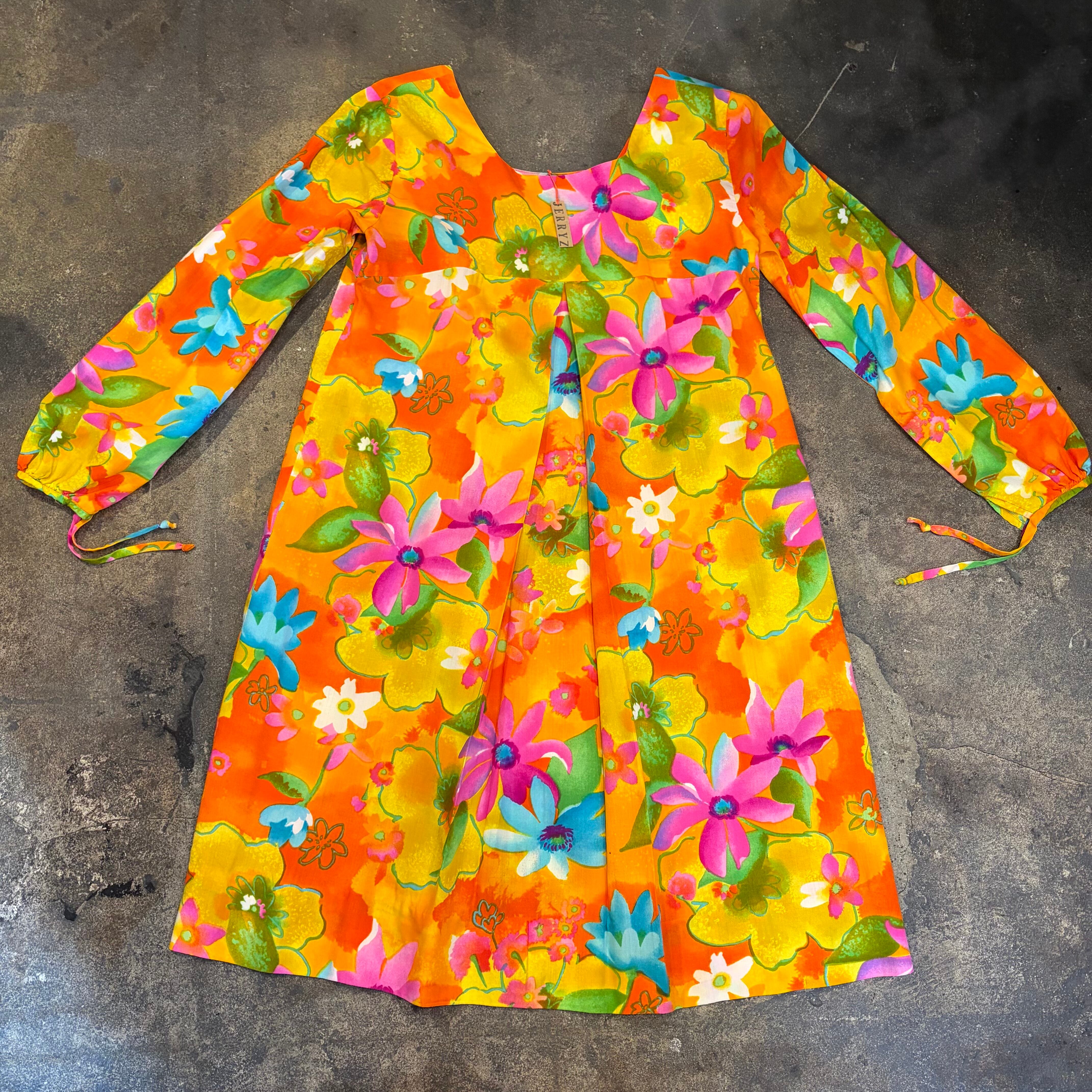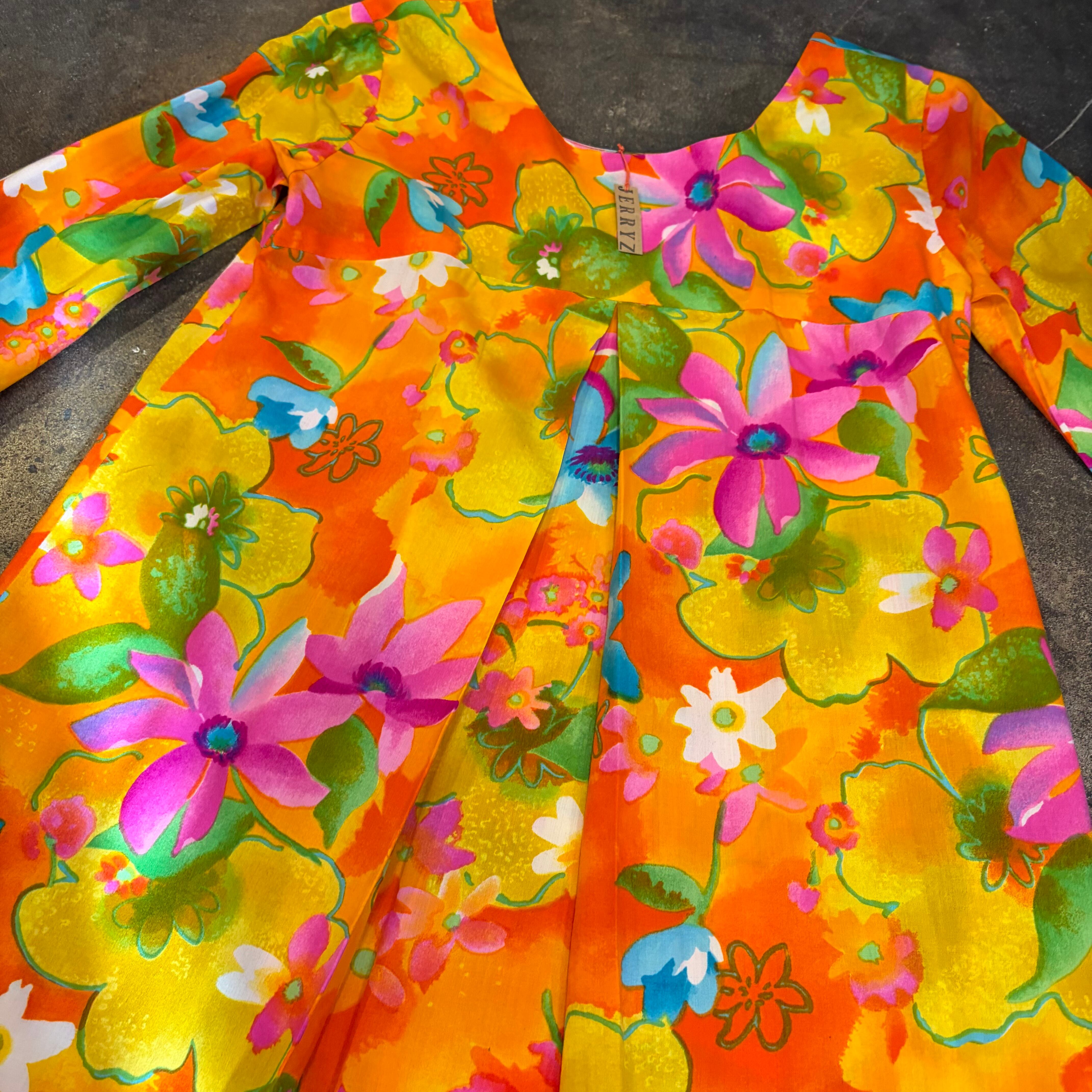 オレンジや黄色、ピンクメインの色合いがとてもハッピーで暖かみがあってかわいいワンピースです。