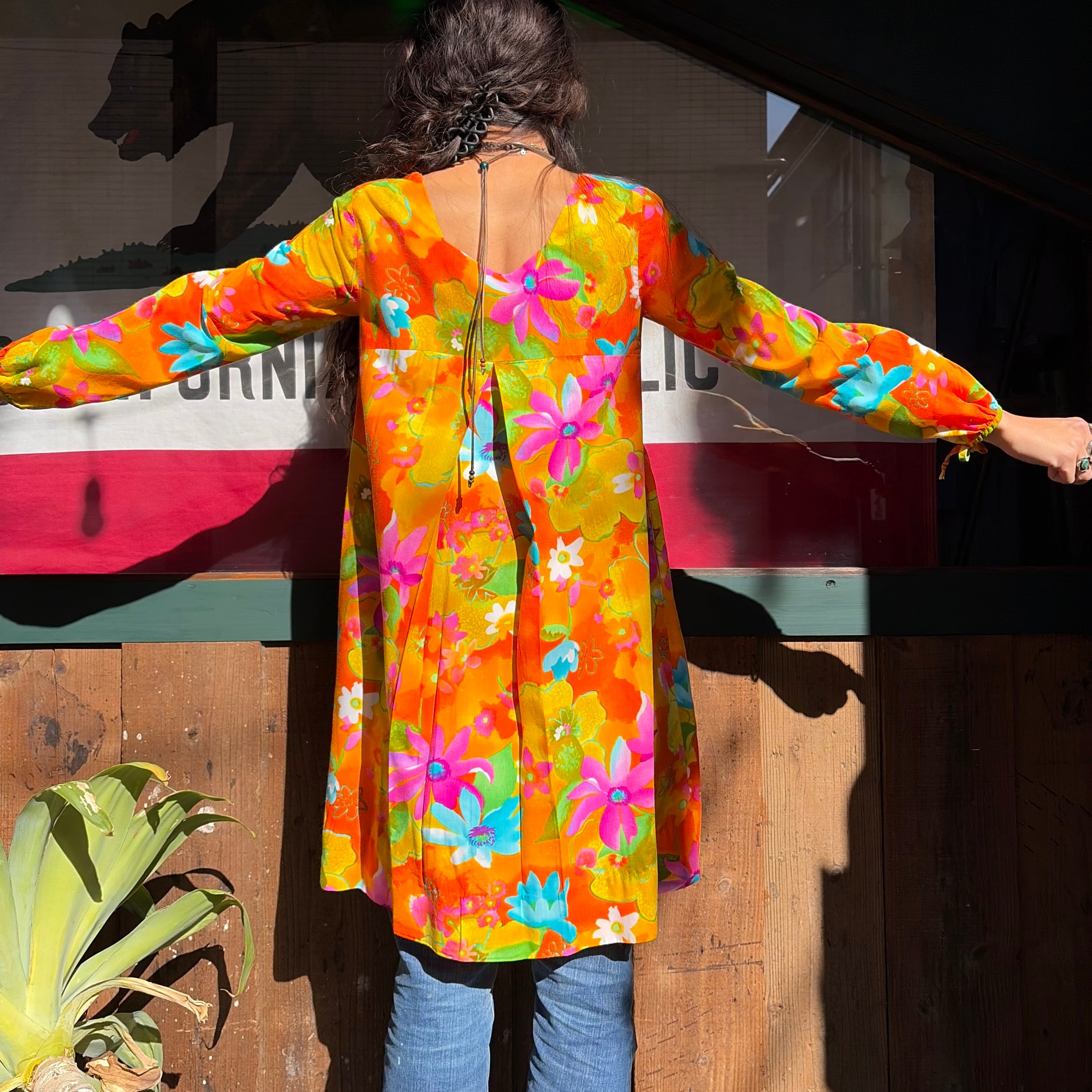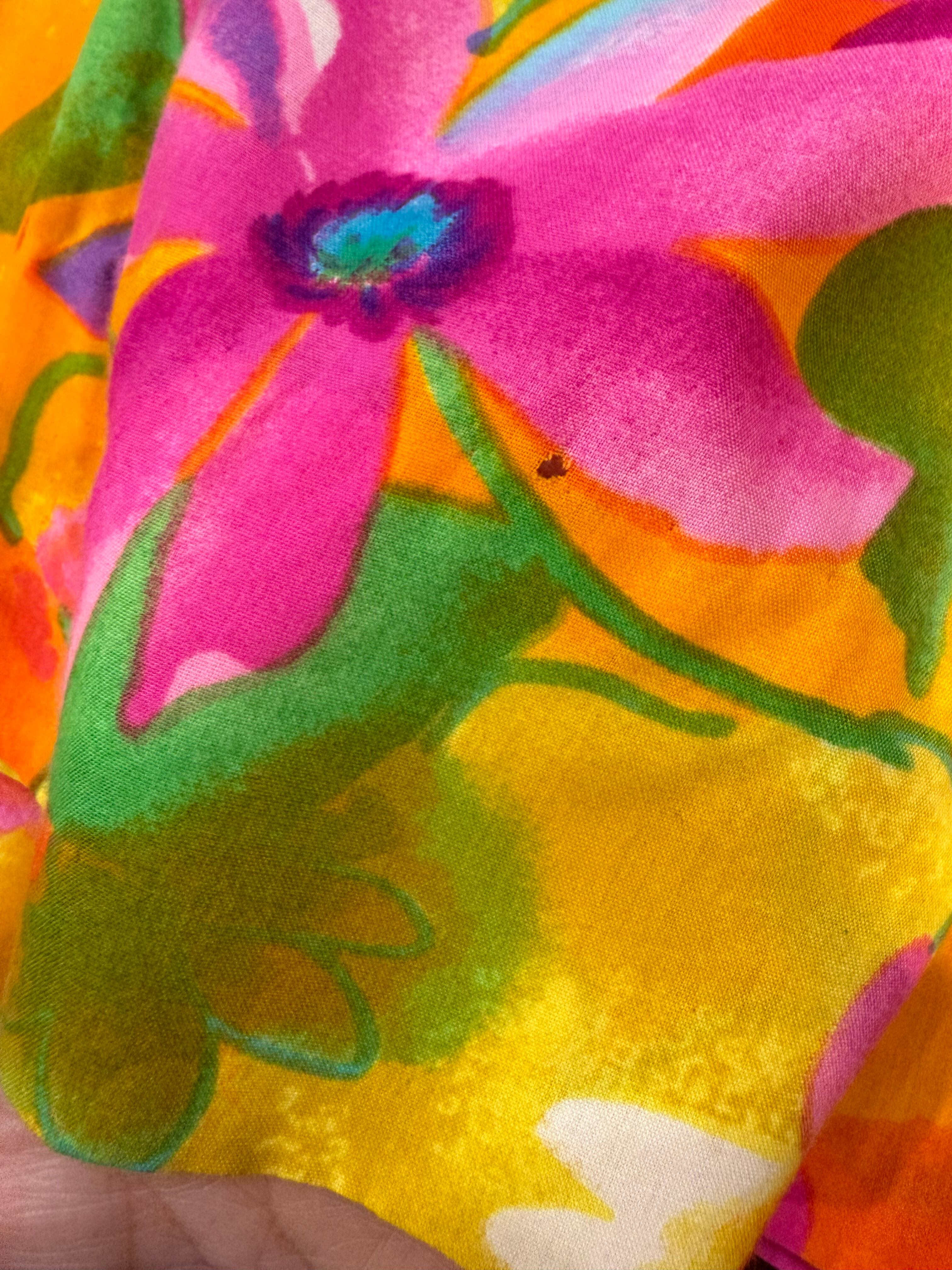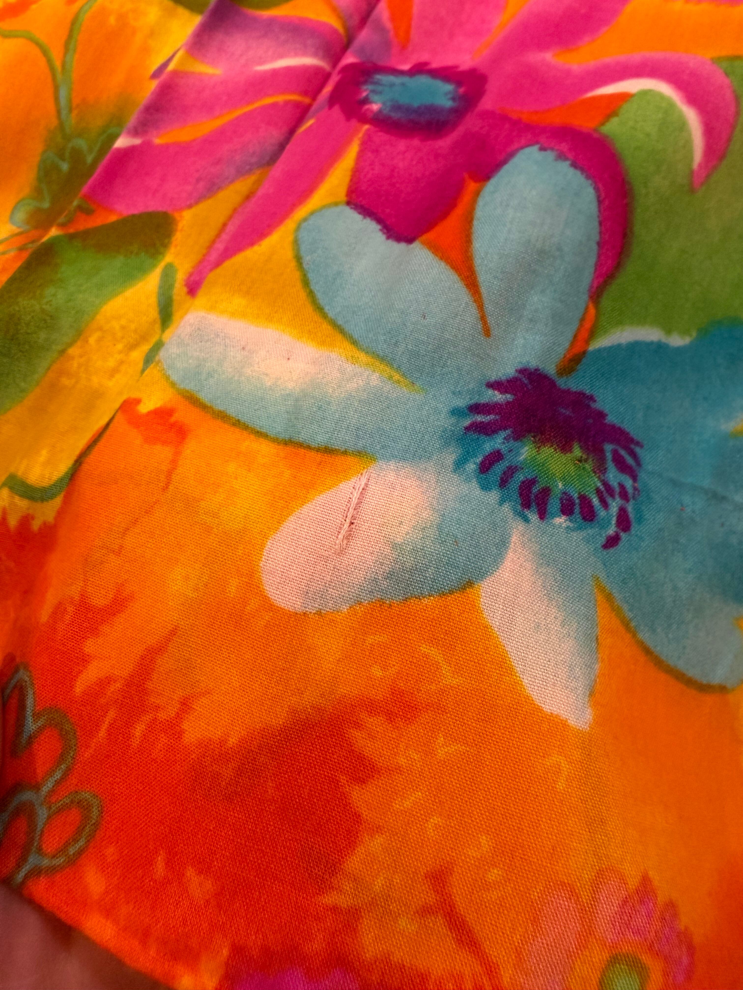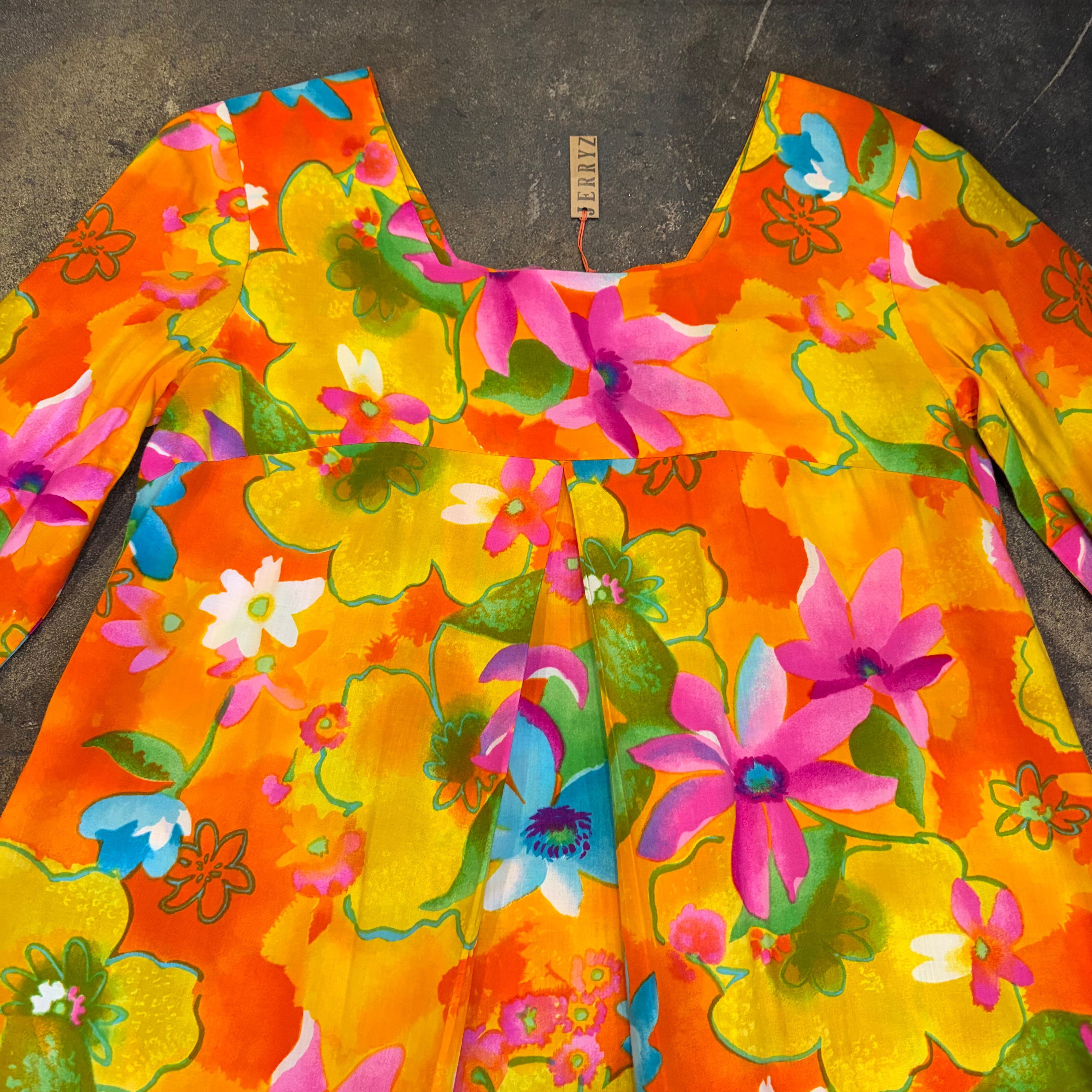 オレンジや黄色、ピンクメインの色合いがとてもハッピーで暖かみがあってかわいいワンピースです。