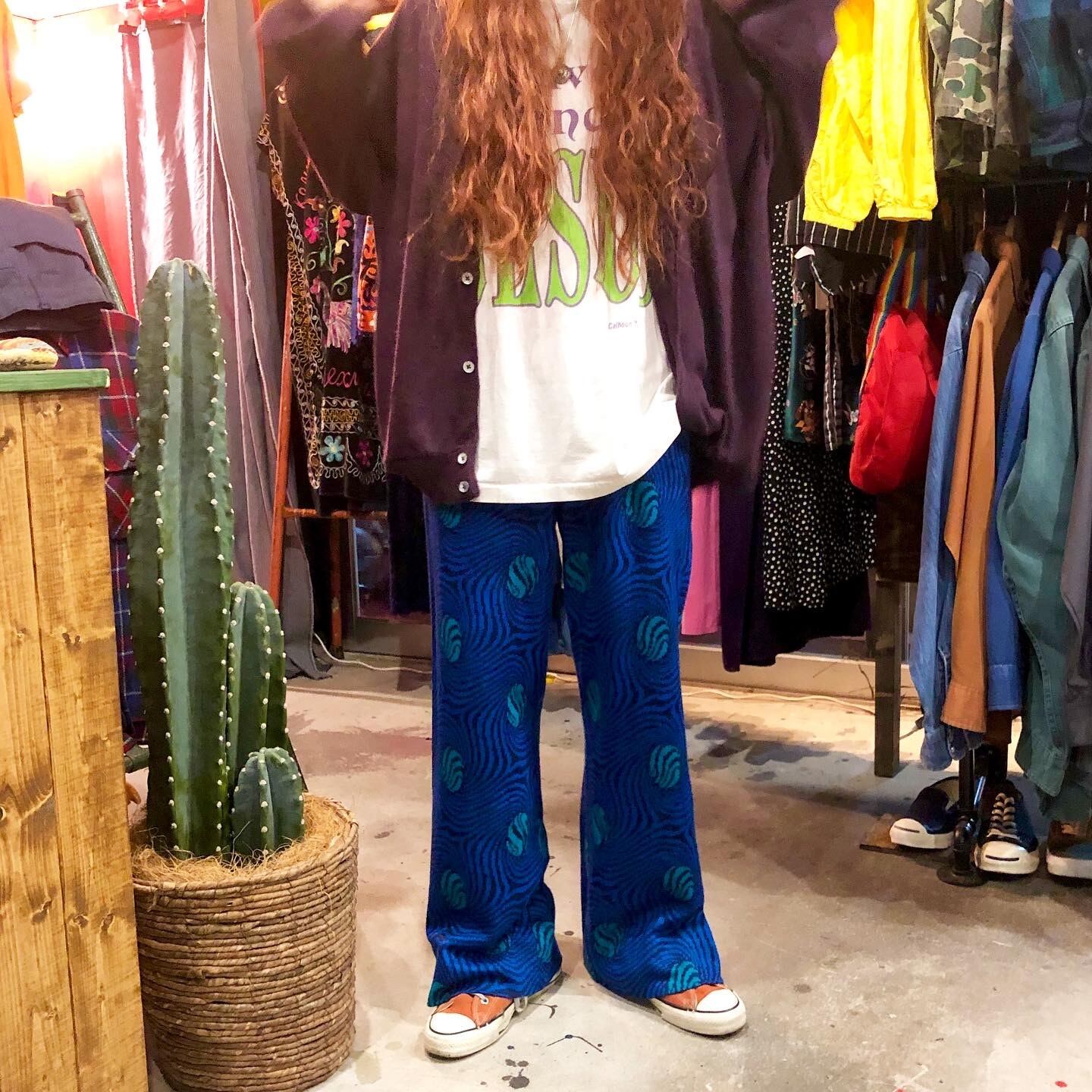 個性的な柄のフレアパンツです。ウエストがゴムになっており全体的に伸縮性があるため着心地の良い一着です。