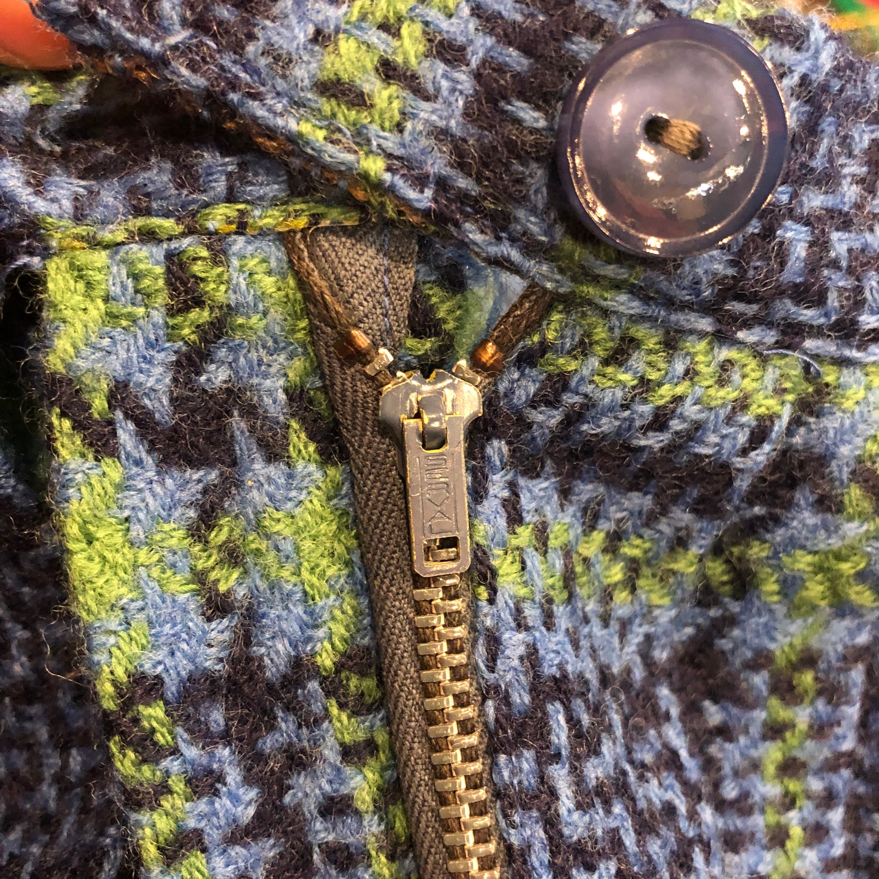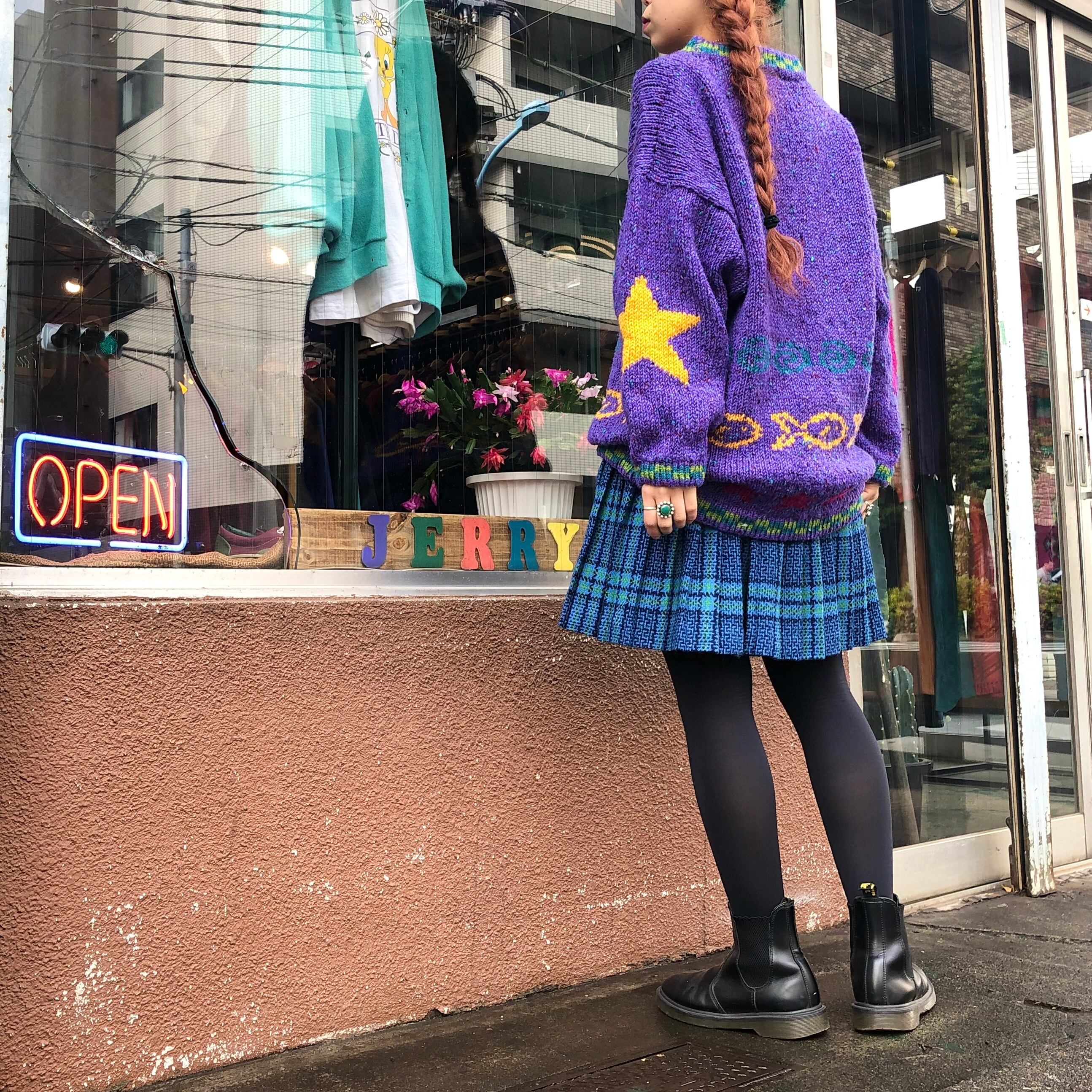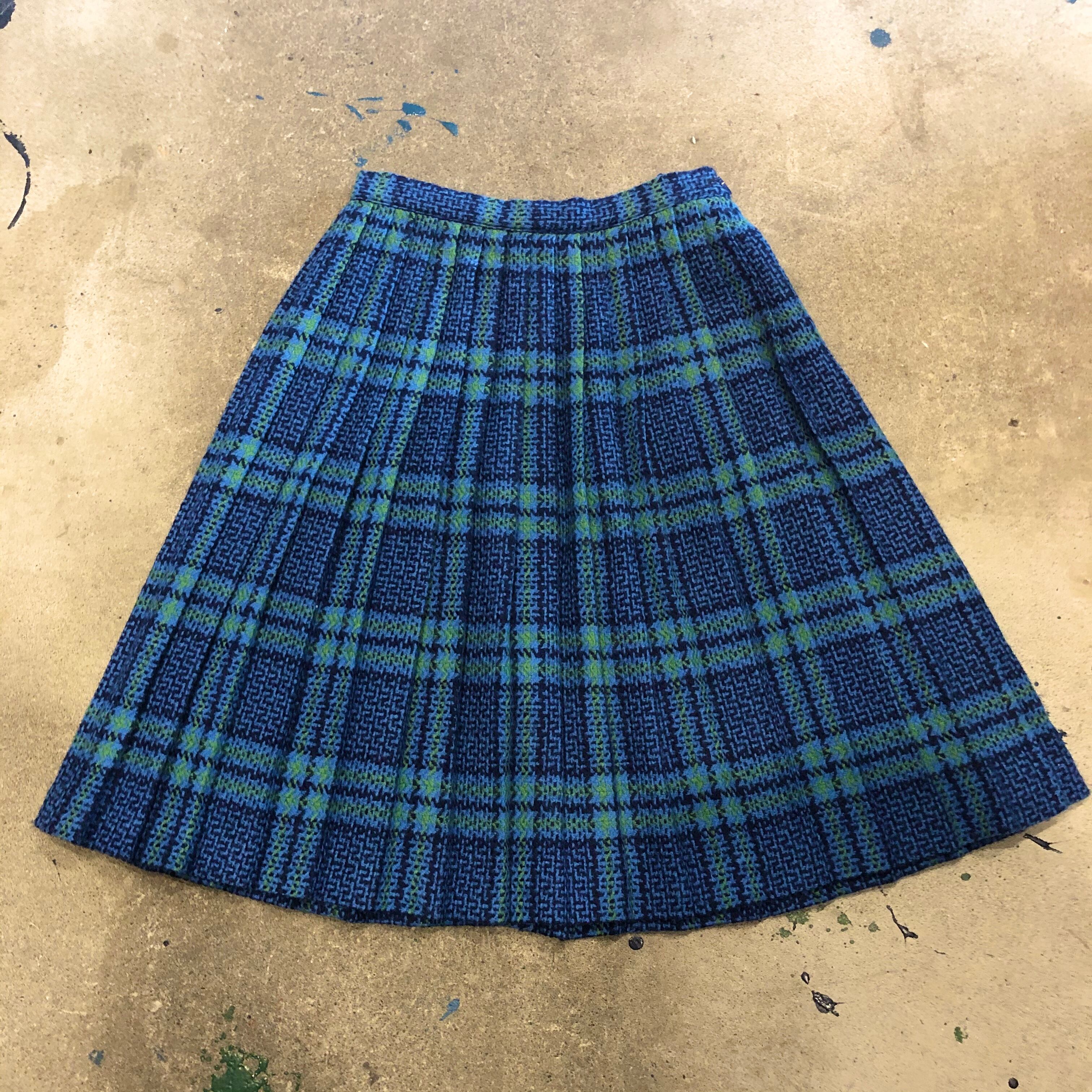 青×黄緑の色合いと不思議なチェック柄が個性的なスカートです。スクールガールな感じにも、パンクな雰囲気にも合うと思います。
