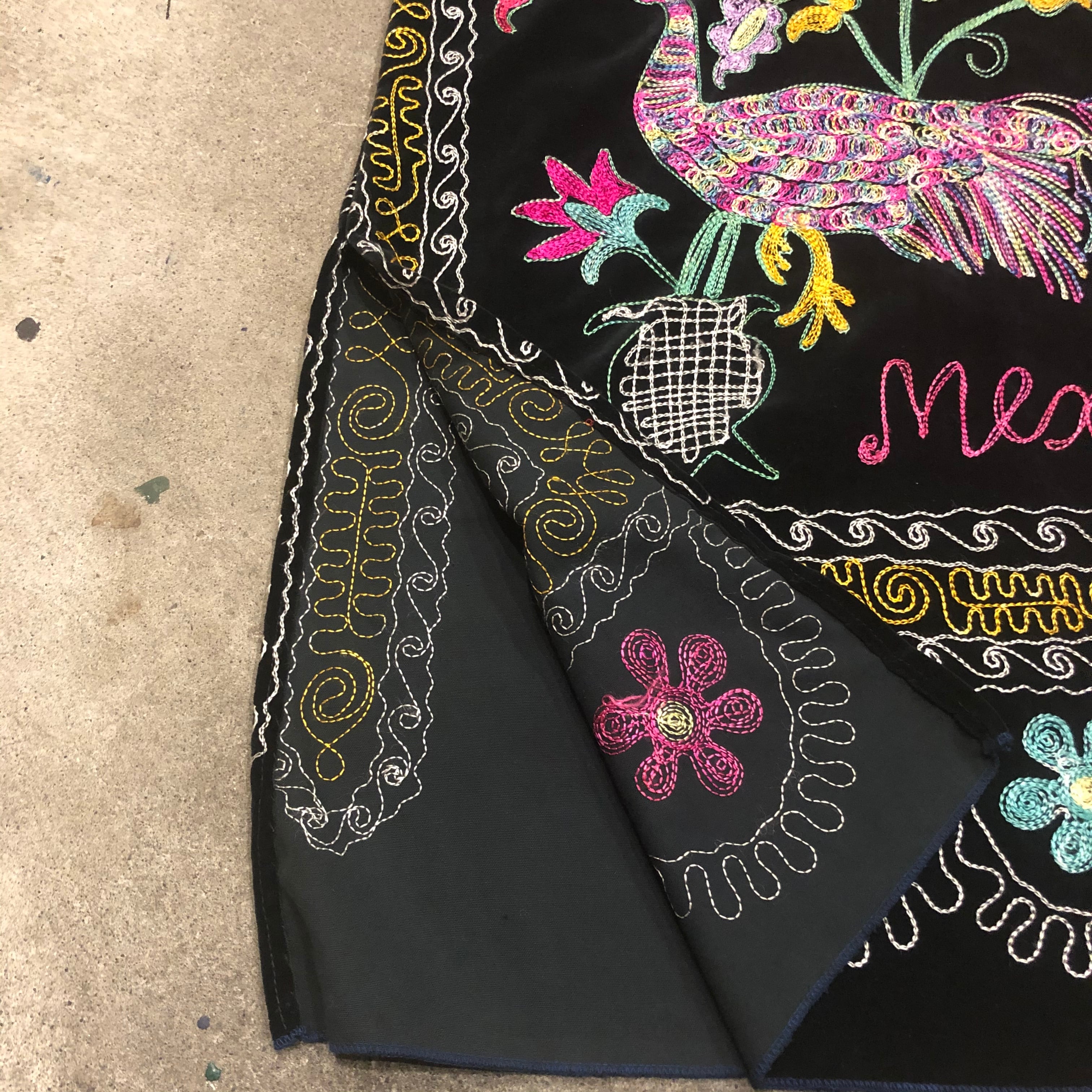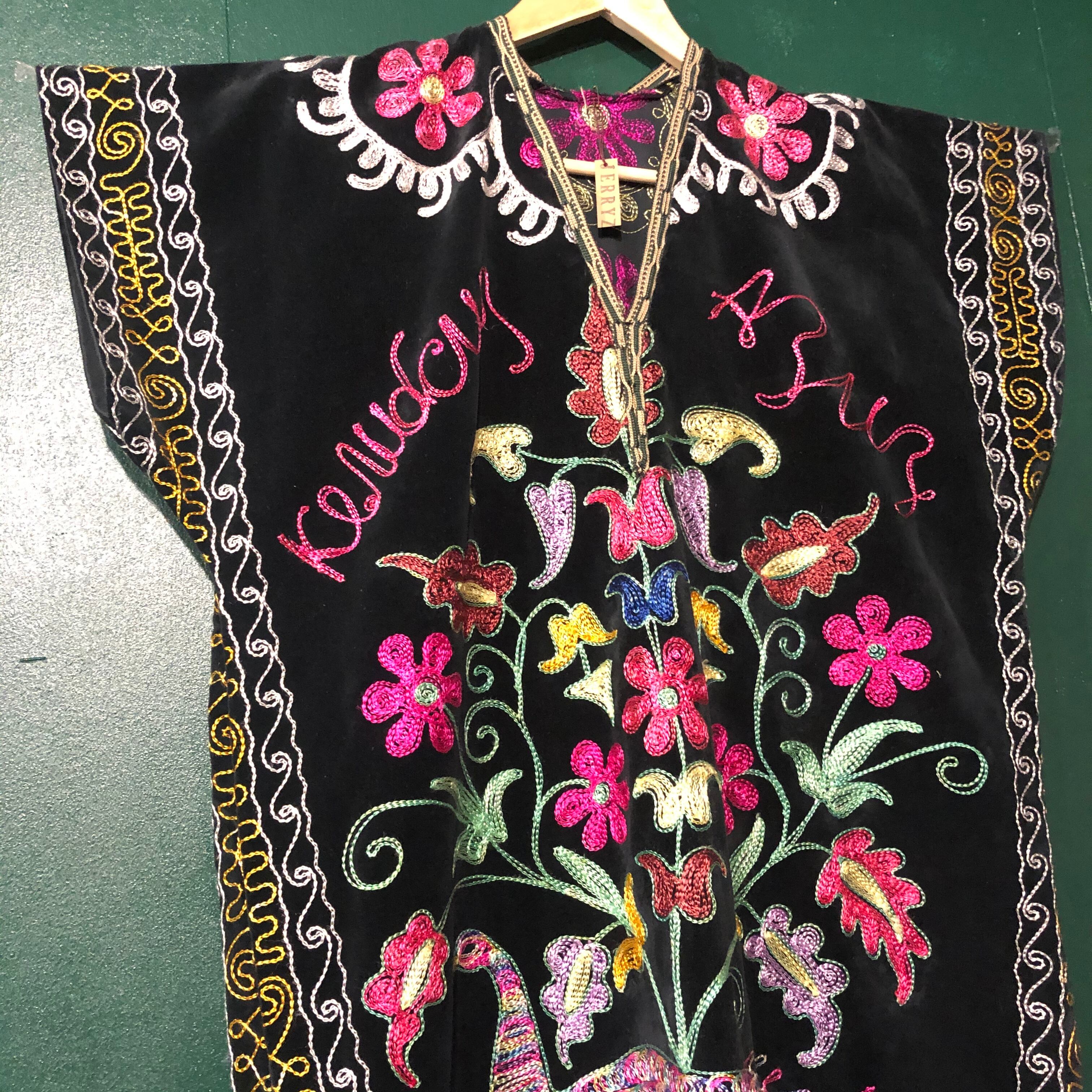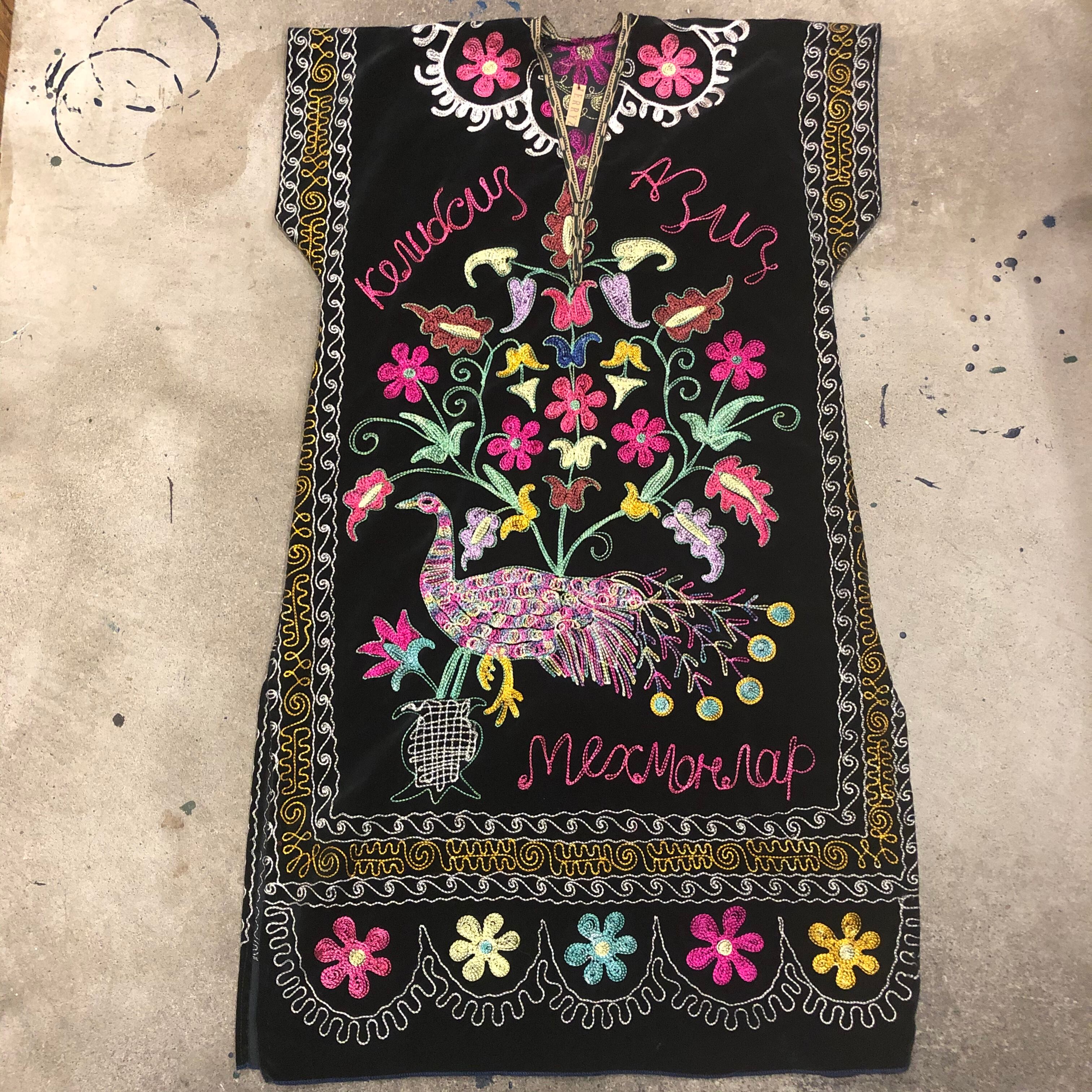 黒のベロア地にカラフルな機械刺繍が映えるウズベキスタン製のスザニドレスです。中にニットやパーカーなどと合わせても可愛いと思います!