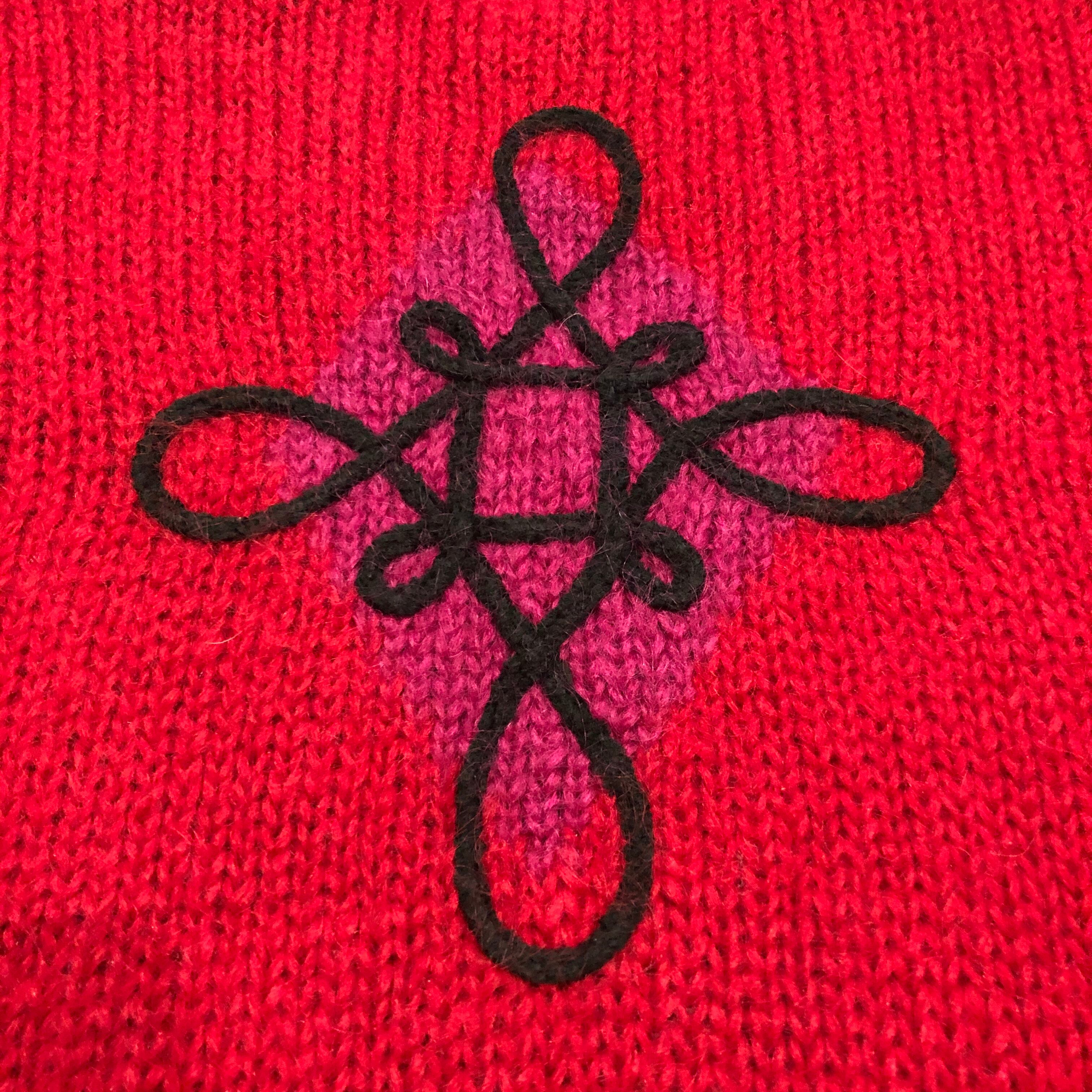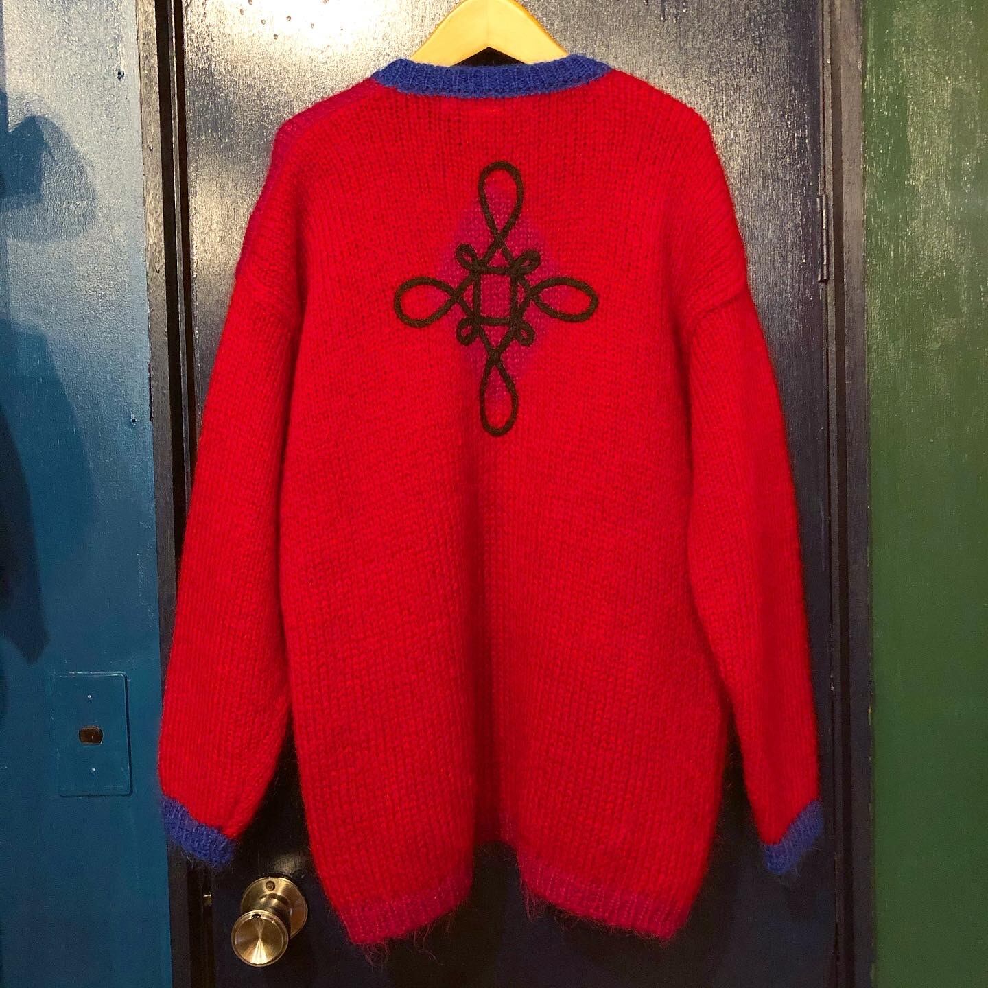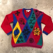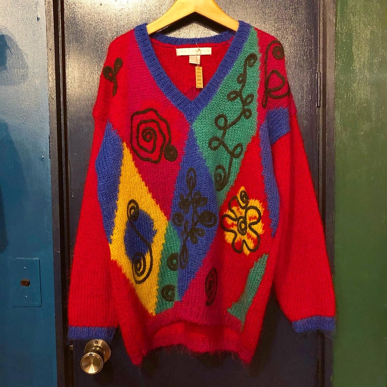 かなり大胆なデザインが個性的なニットです。黒のコード刺繍が不思議でかわいいです。
