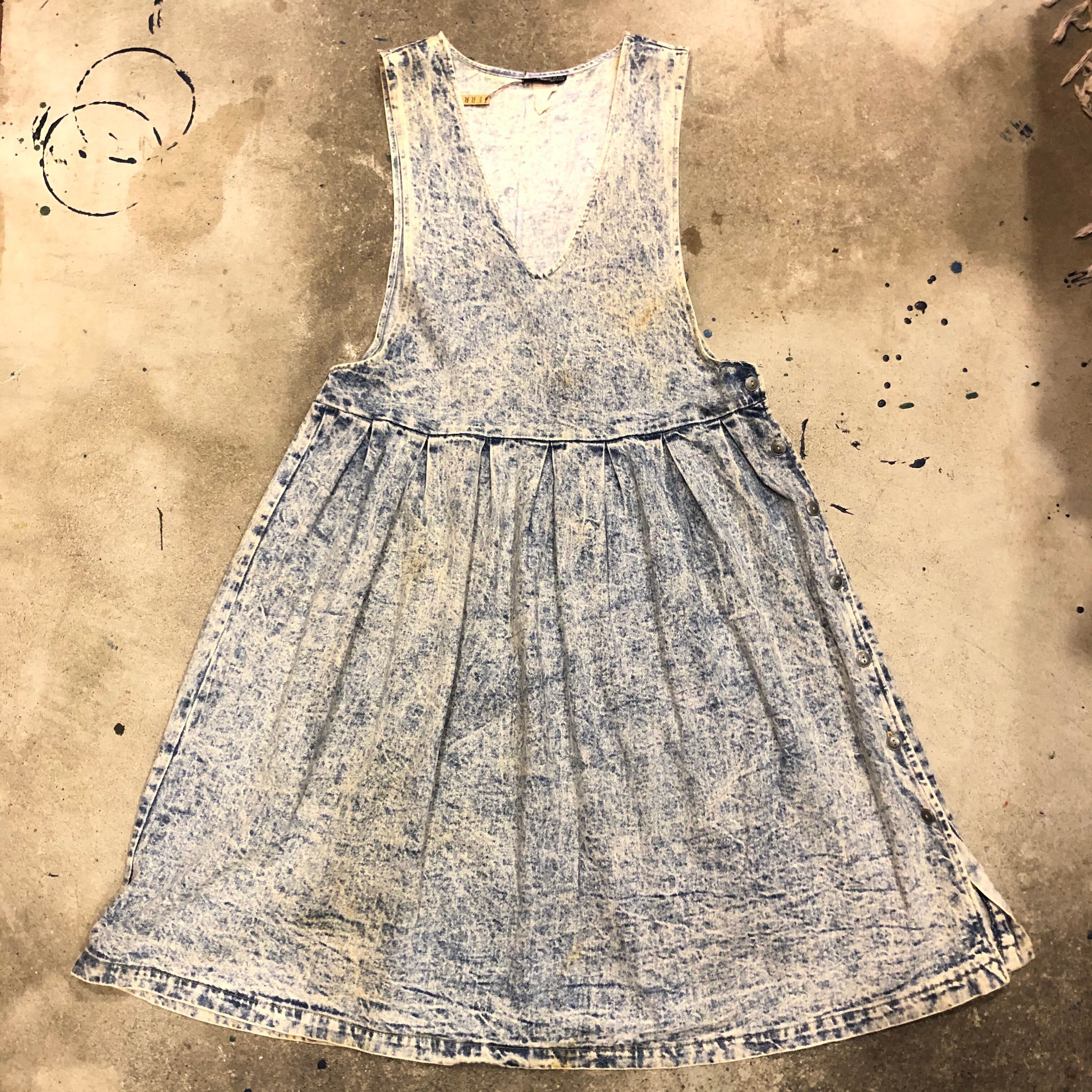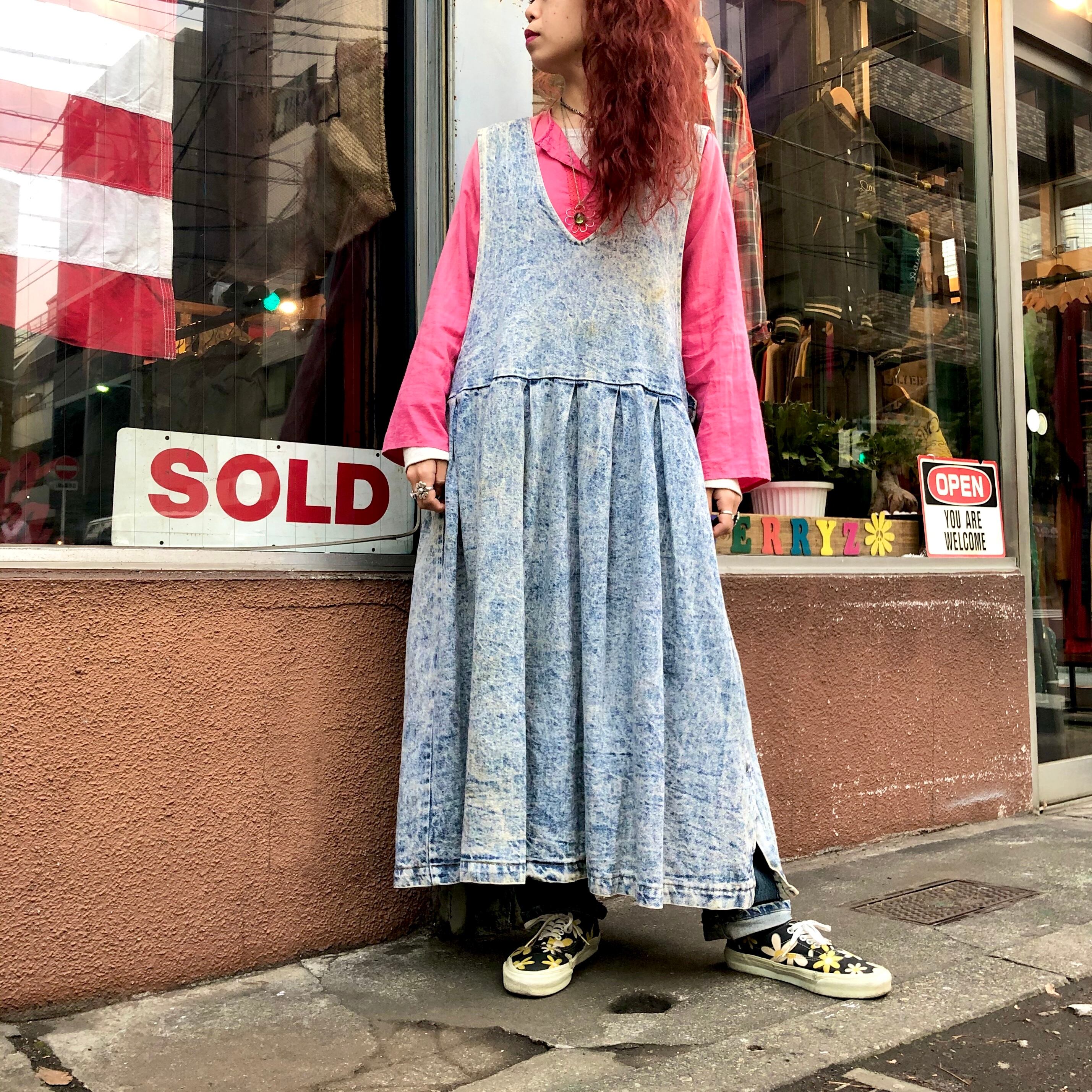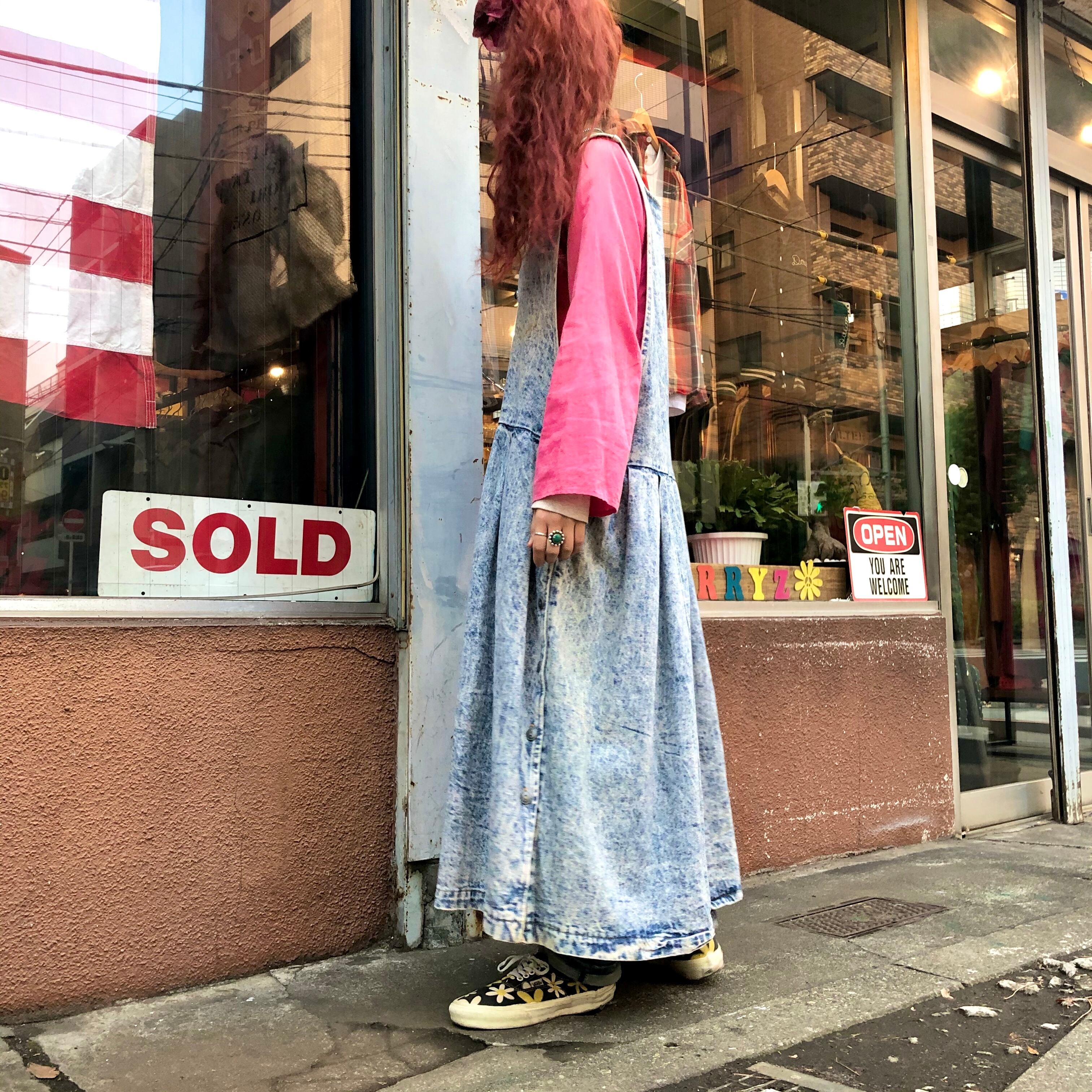 ゆるいシルエットがかわいいケミカルデニムドレスです。大きめのオーバーオールを着るような気持ちでガバッと着れて、袖ぐりもウエストの位置ぐらいまであるので中に厚手のパーカーやニットなどたくさん重ね着することもできます!