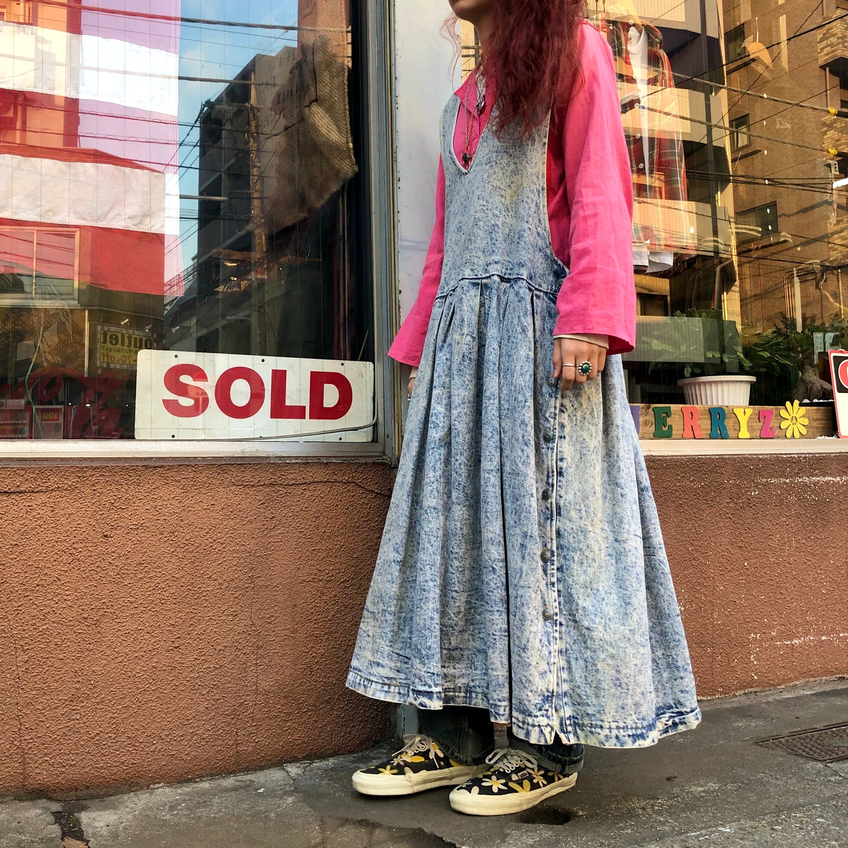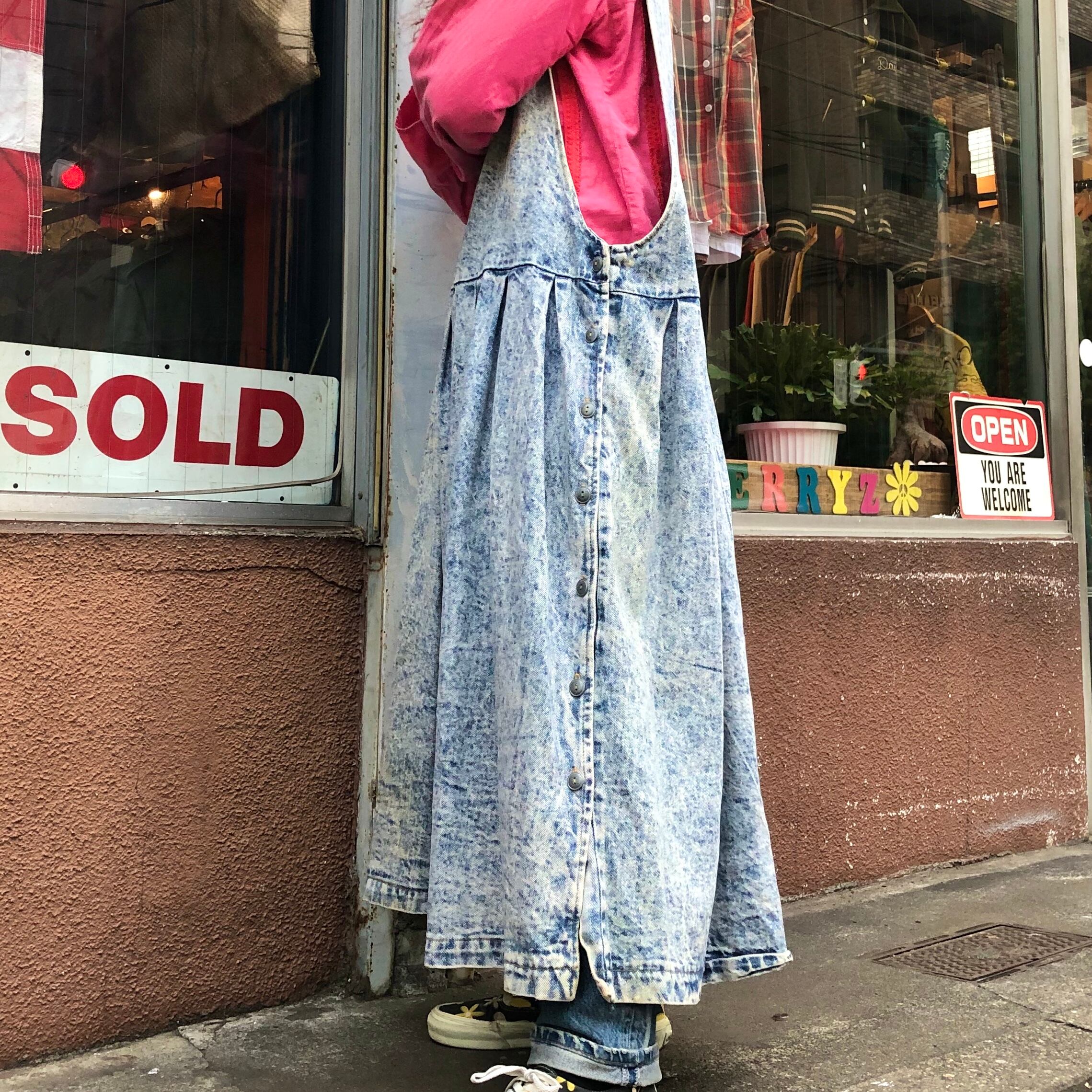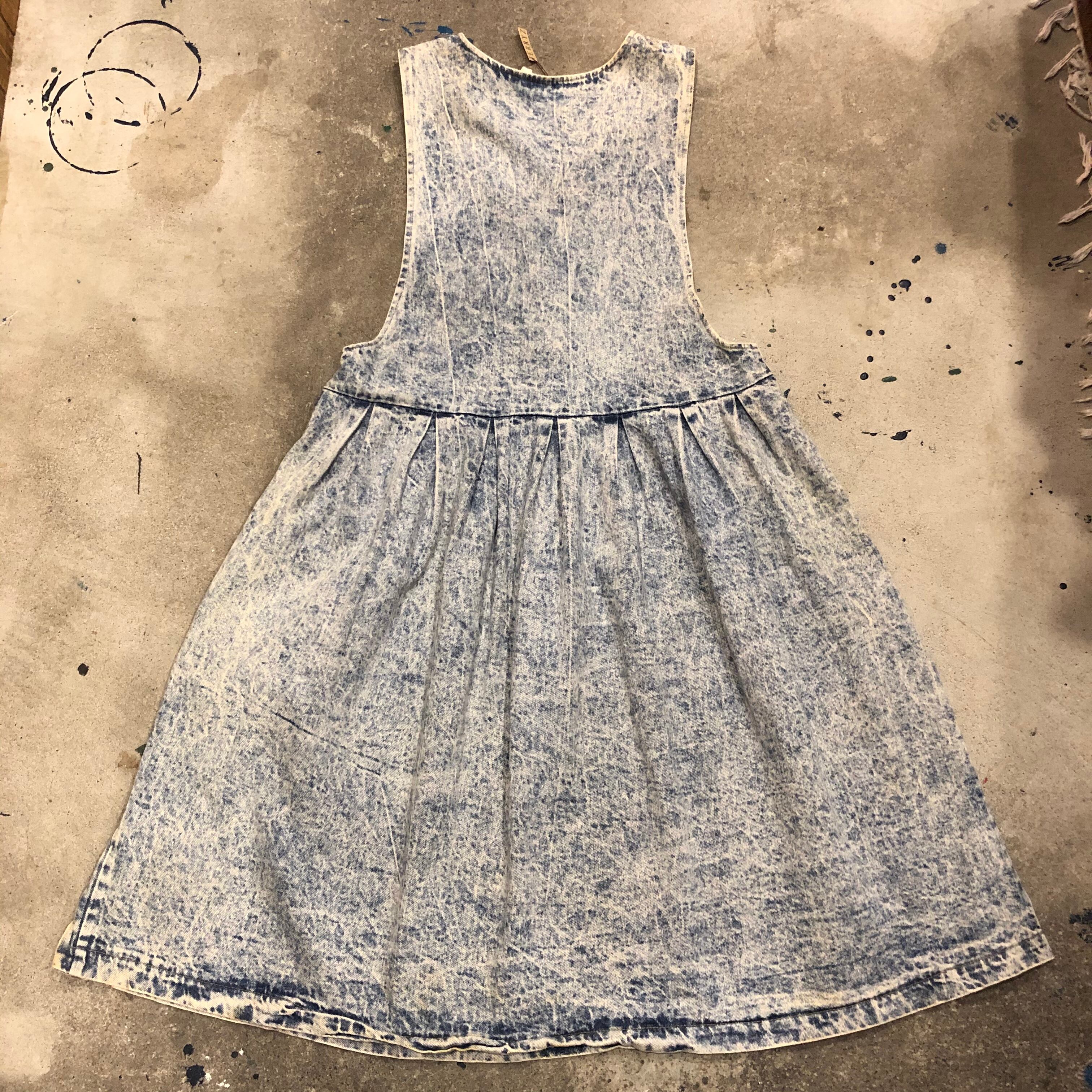 ゆるいシルエットがかわいいケミカルデニムドレスです。大きめのオーバーオールを着るような気持ちでガバッと着れて、袖ぐりもウエストの位置ぐらいまであるので中に厚手のパーカーやニットなどたくさん重ね着することもできます!