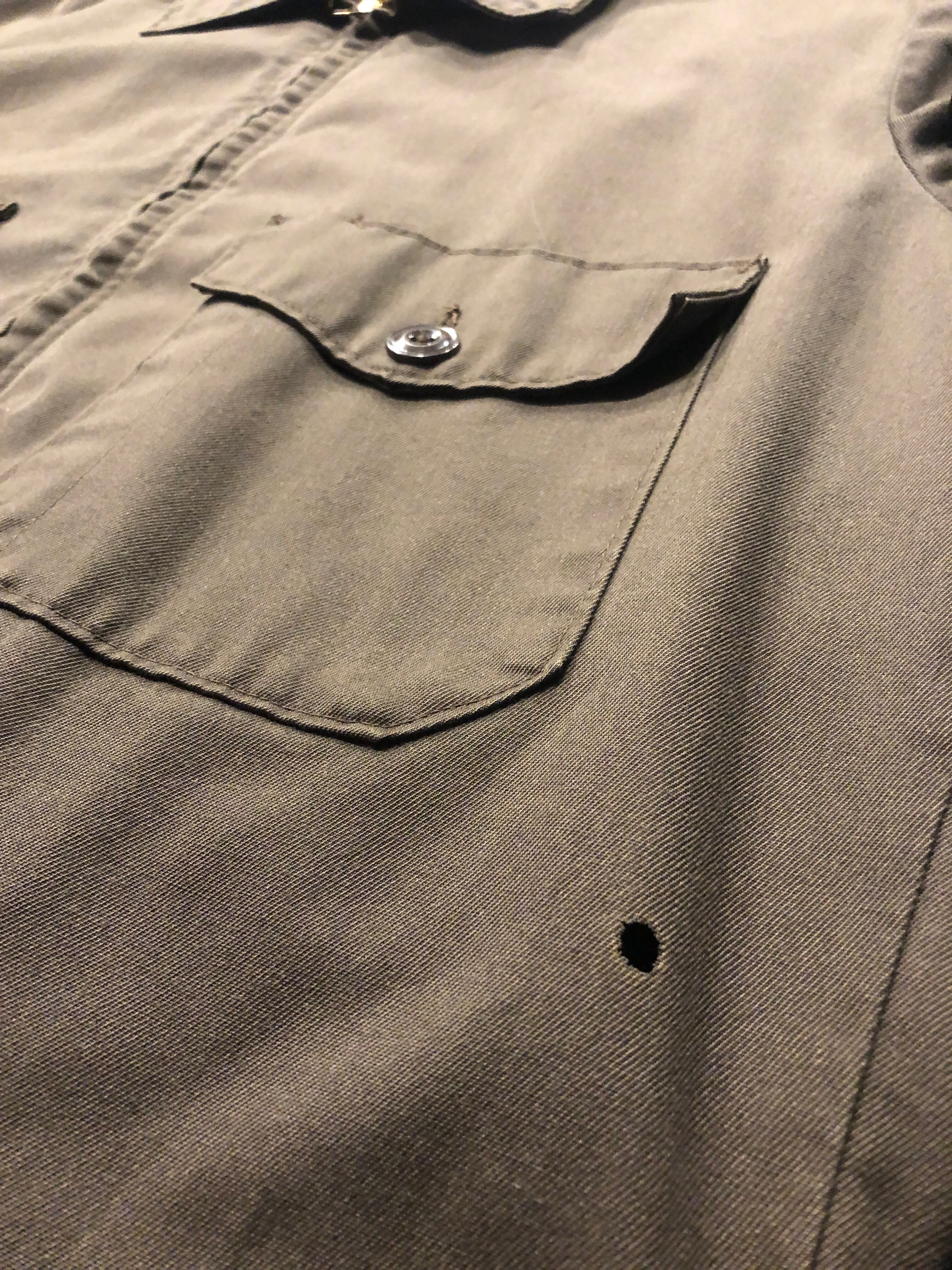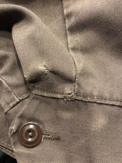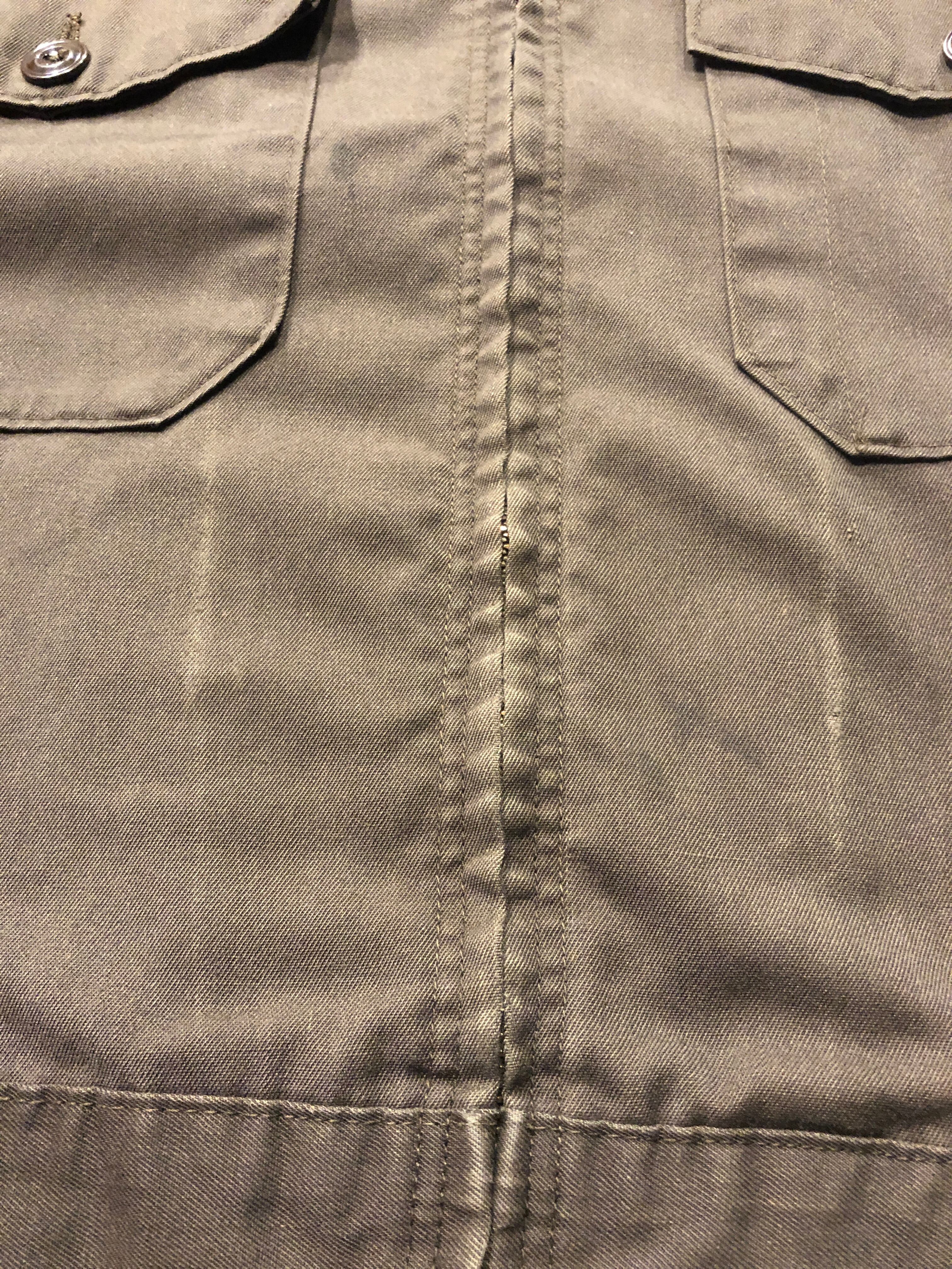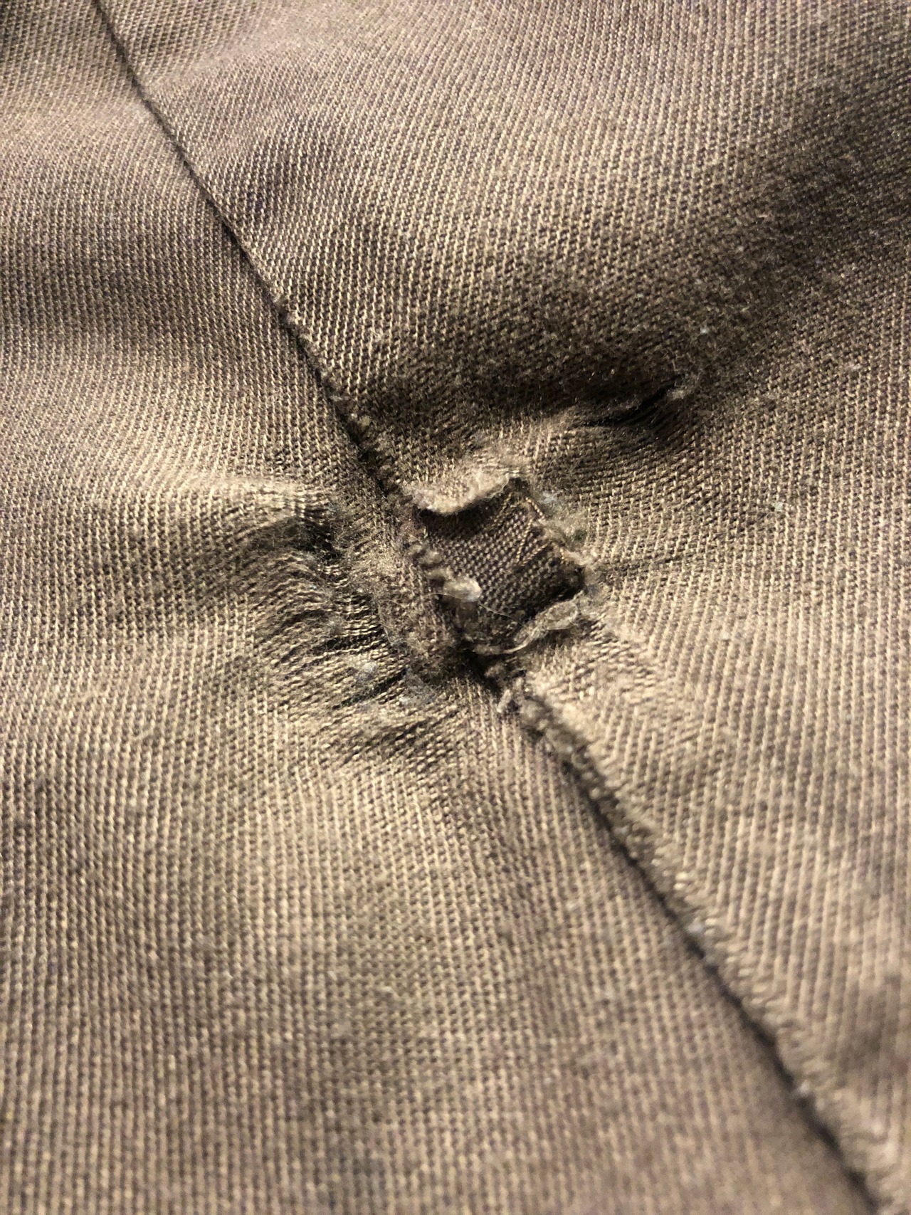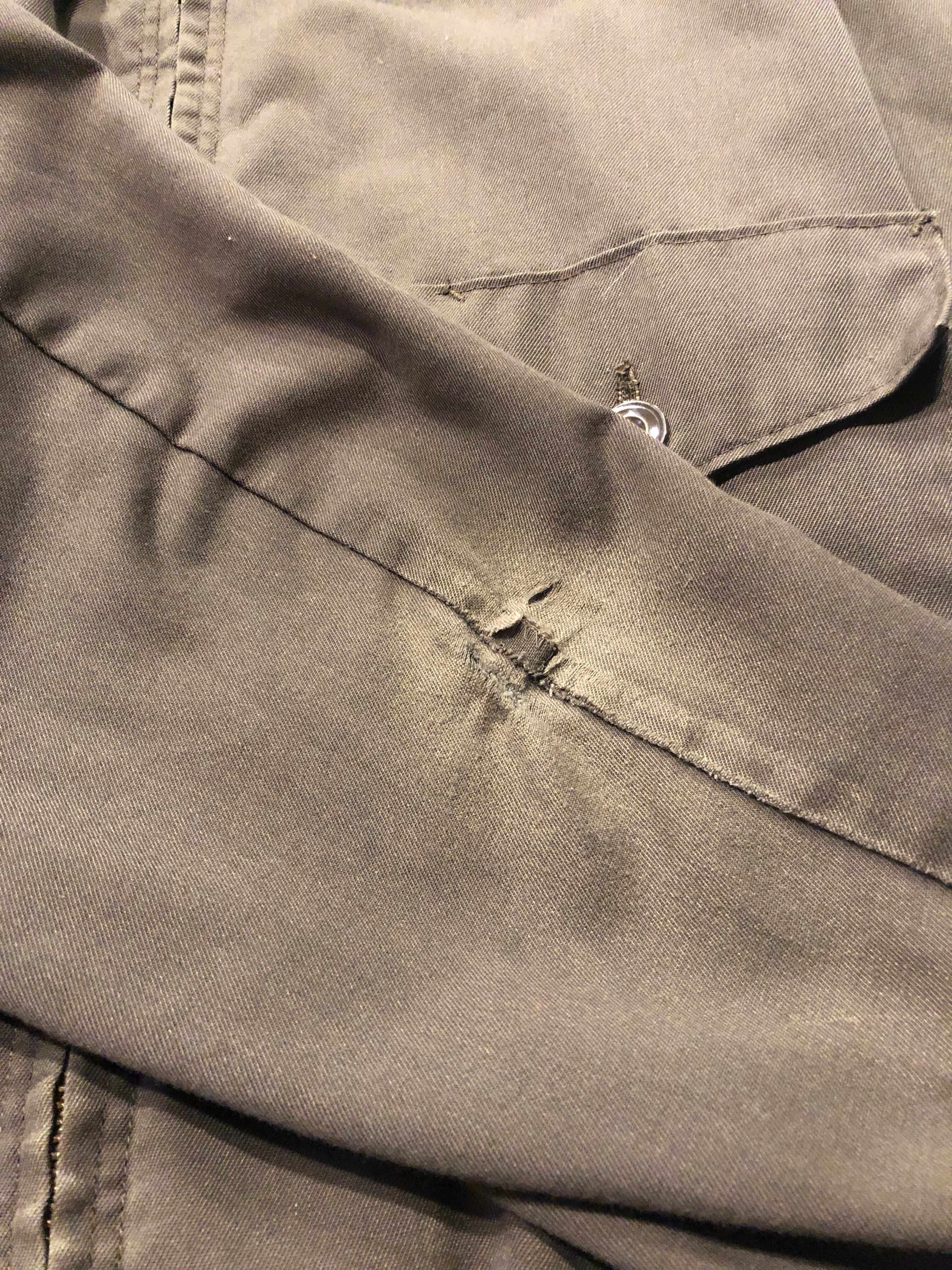 右袖口、ひじにダメージ、左脇ピンホール、前見頃ポケット下に白い線が入っています。