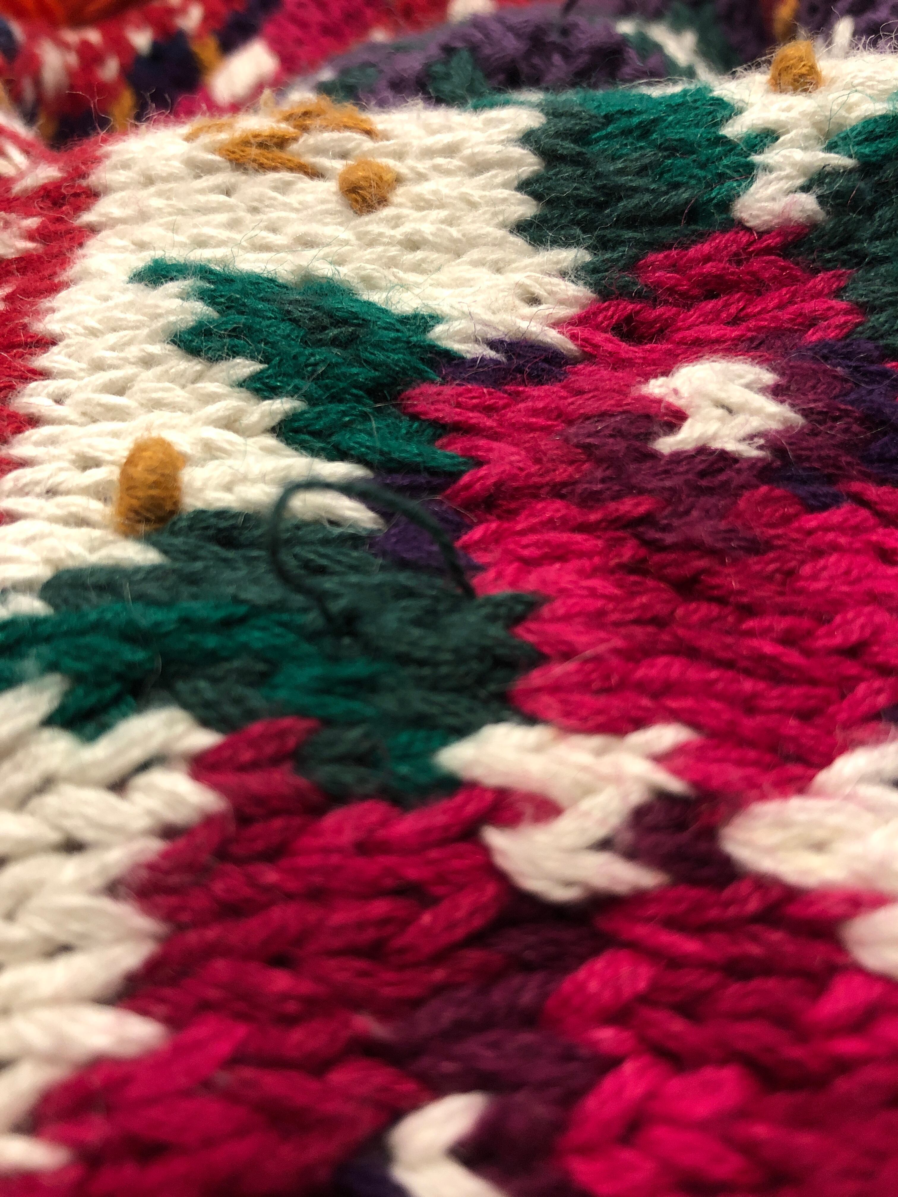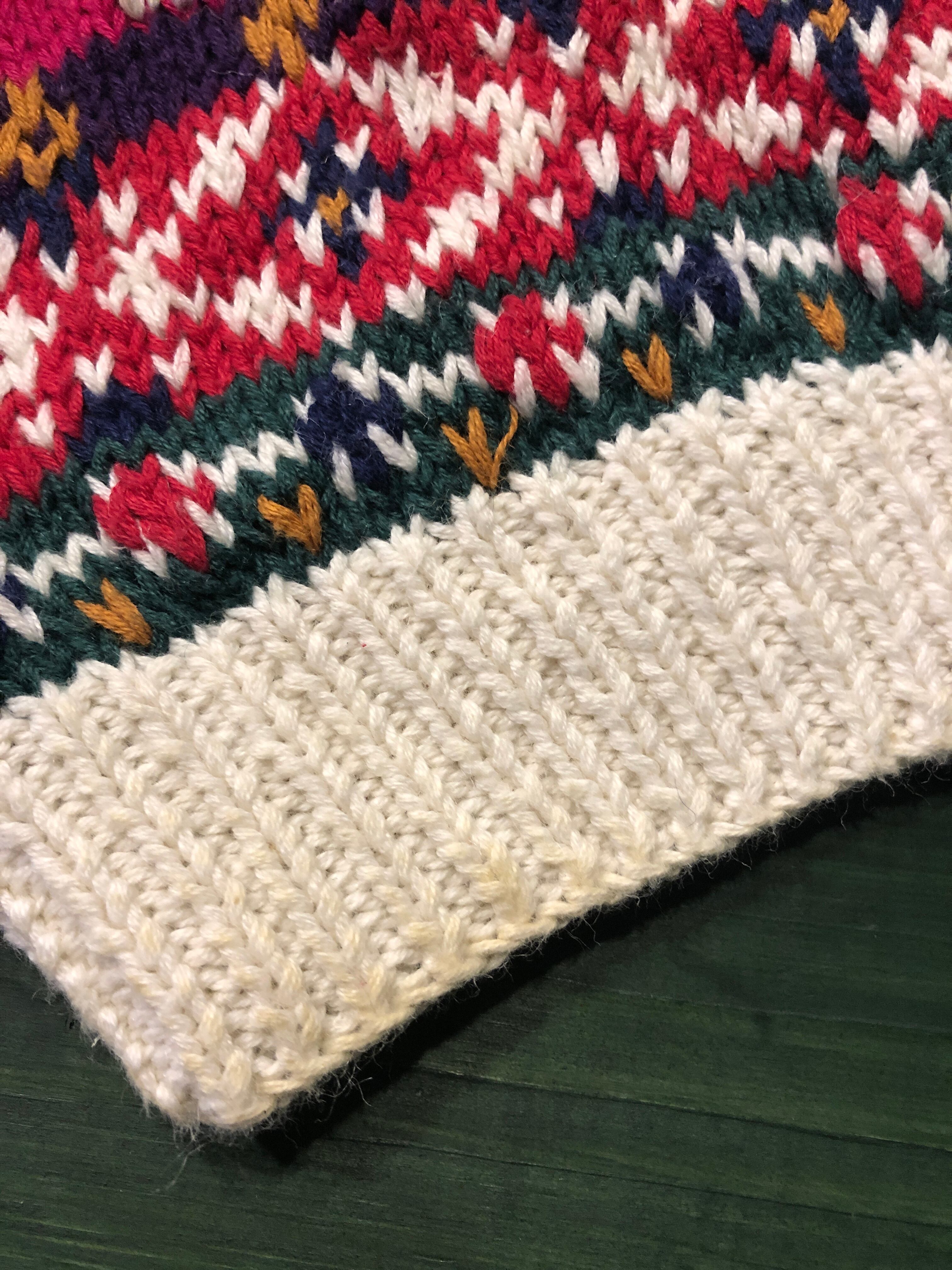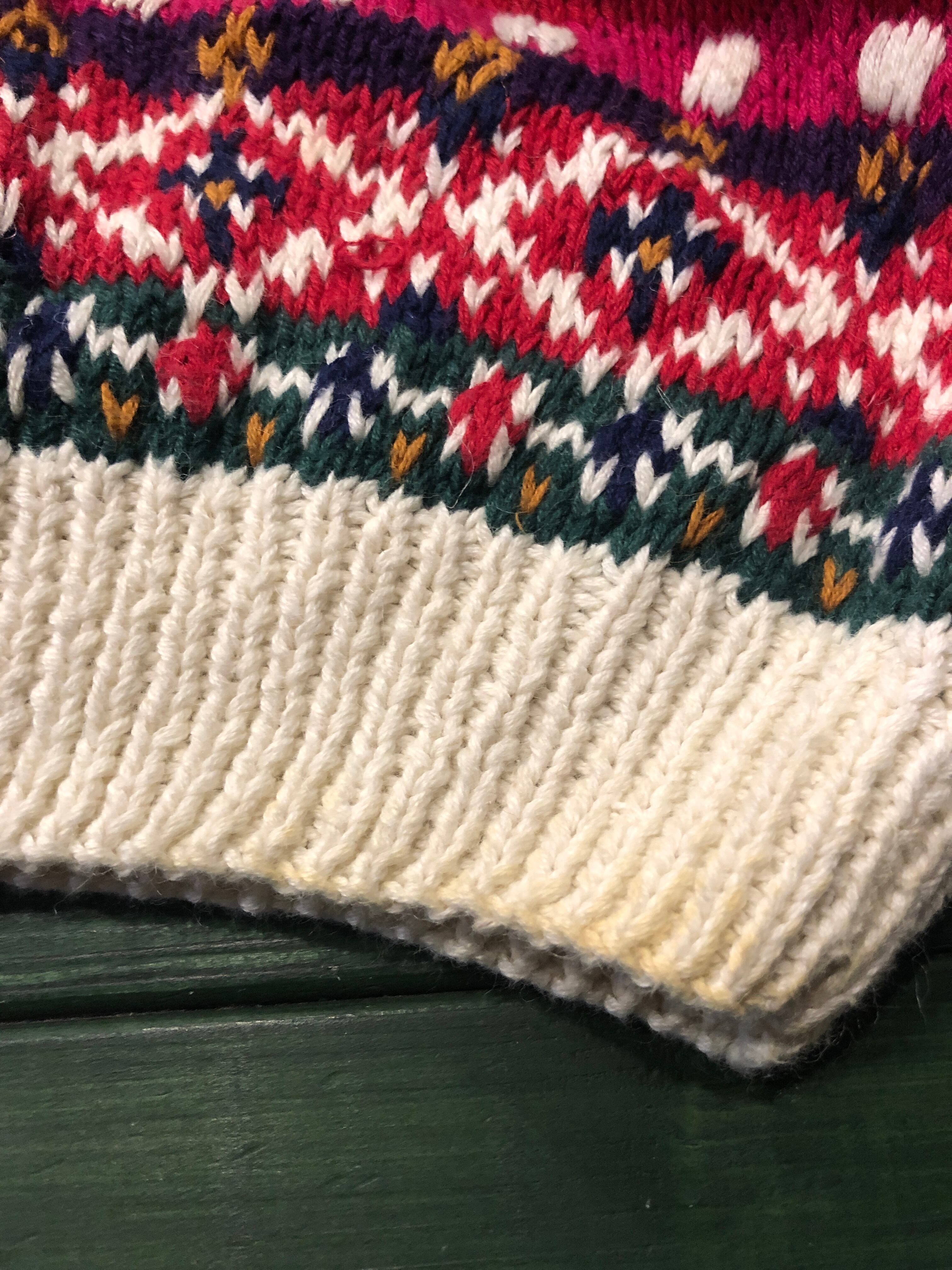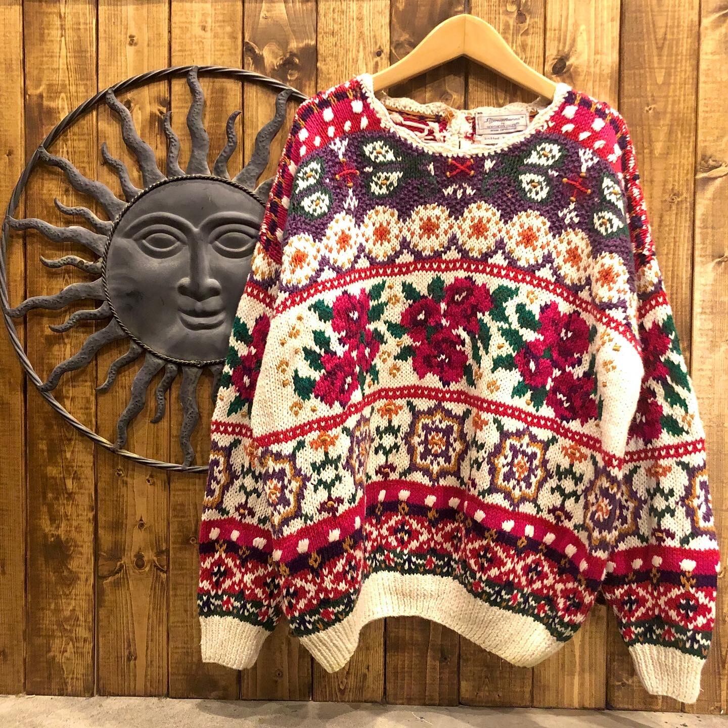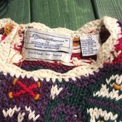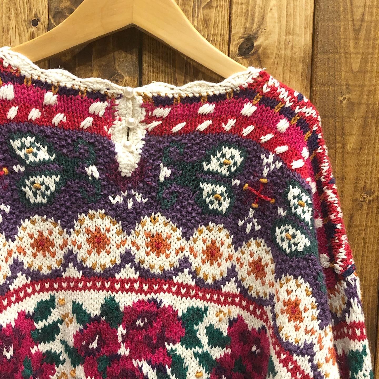 色合いや、柄が女性らしい手編みのコットンセーターです。柔らかい肌触りも良い感じです。首回りがスカラップになっているところもポイントです!