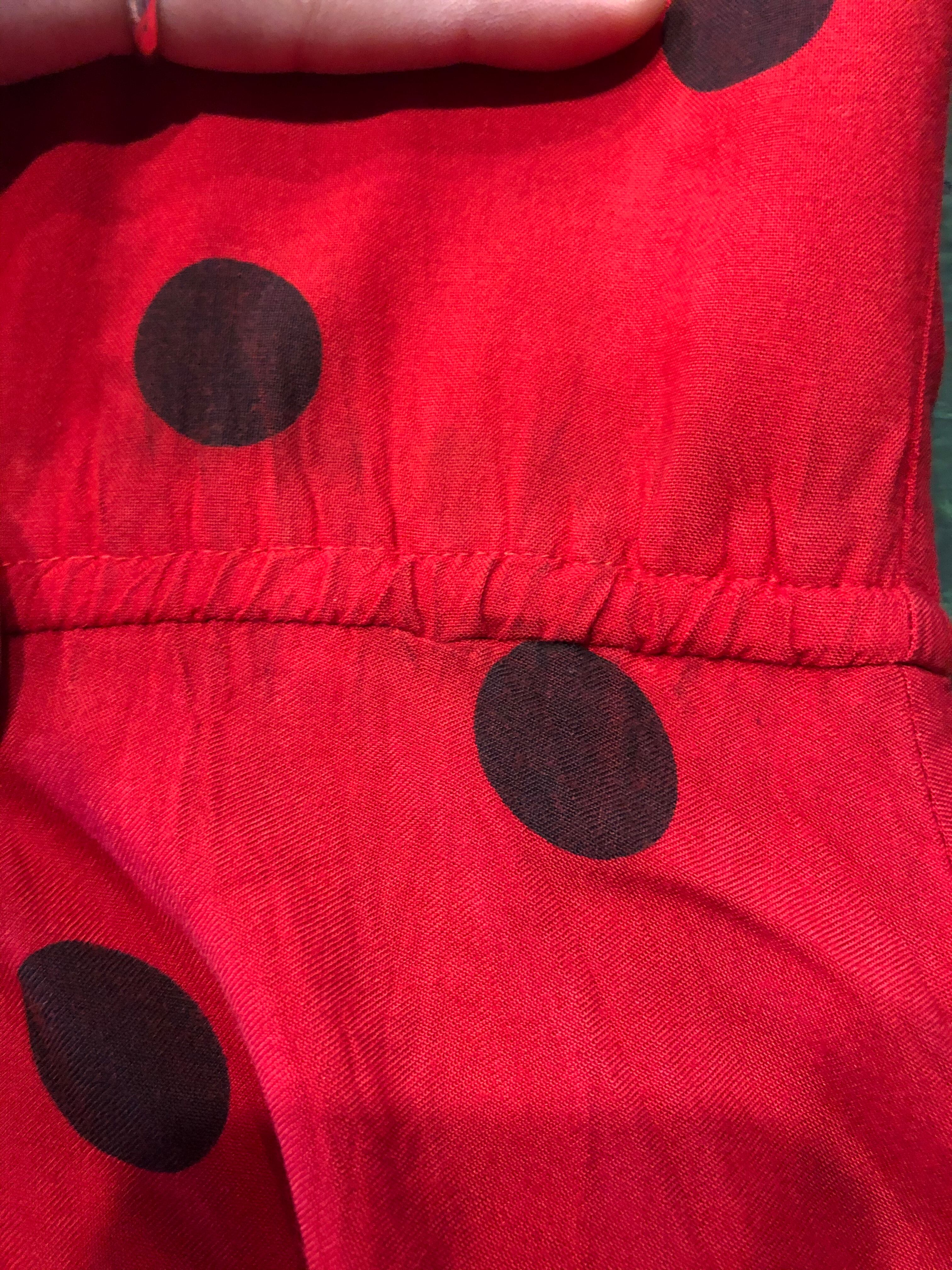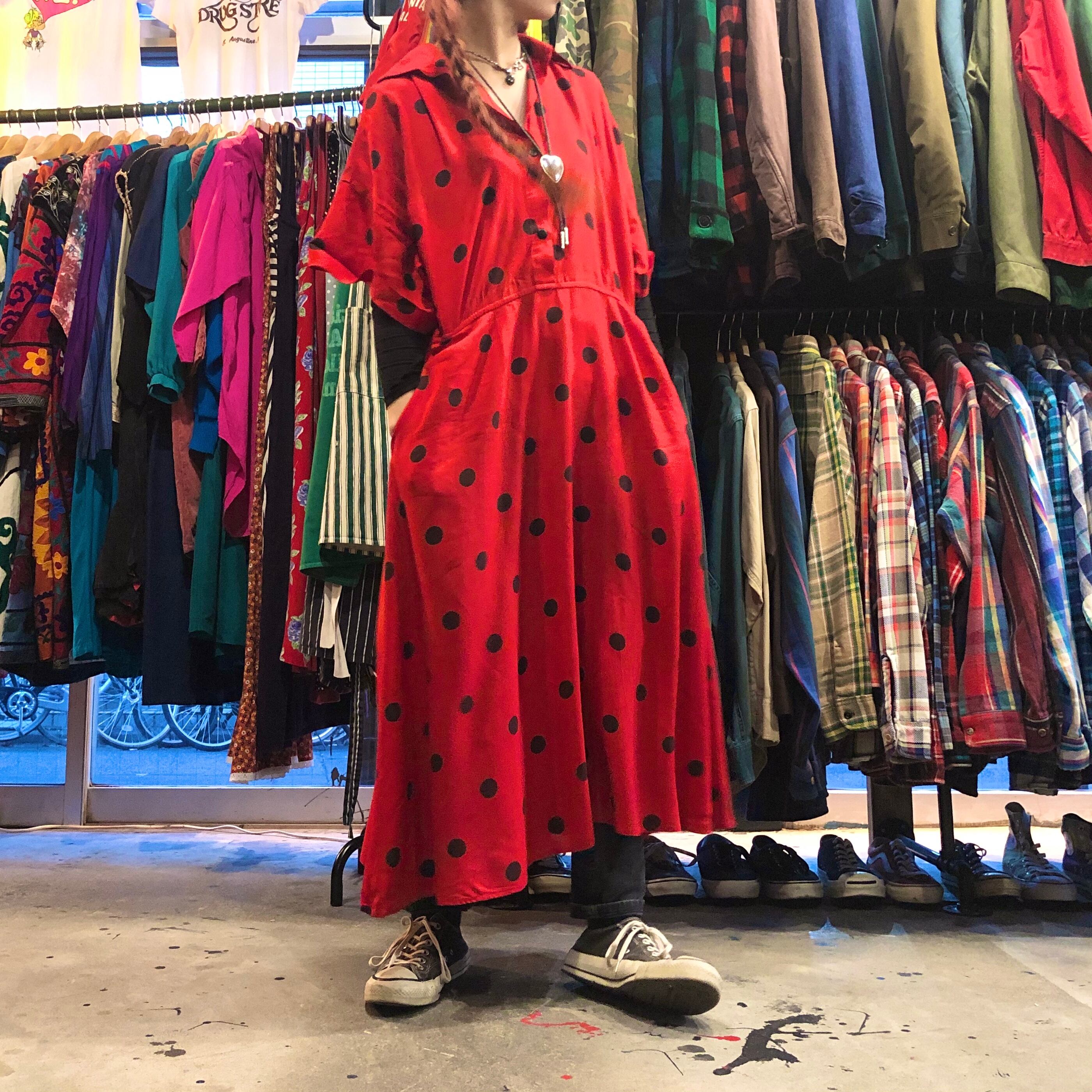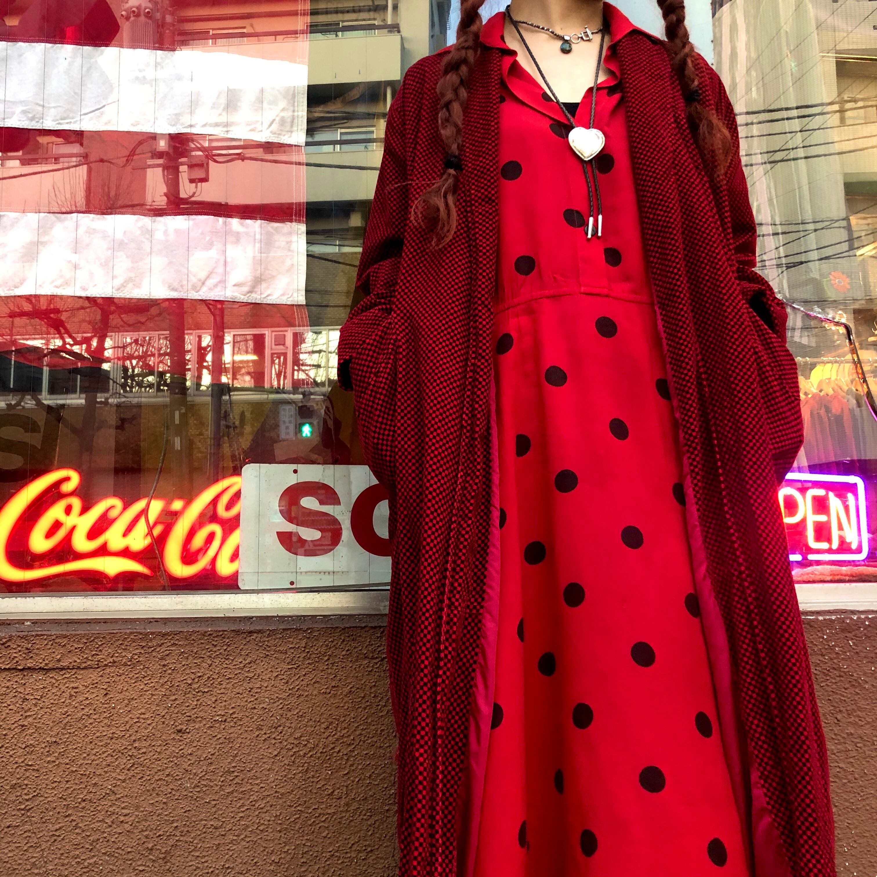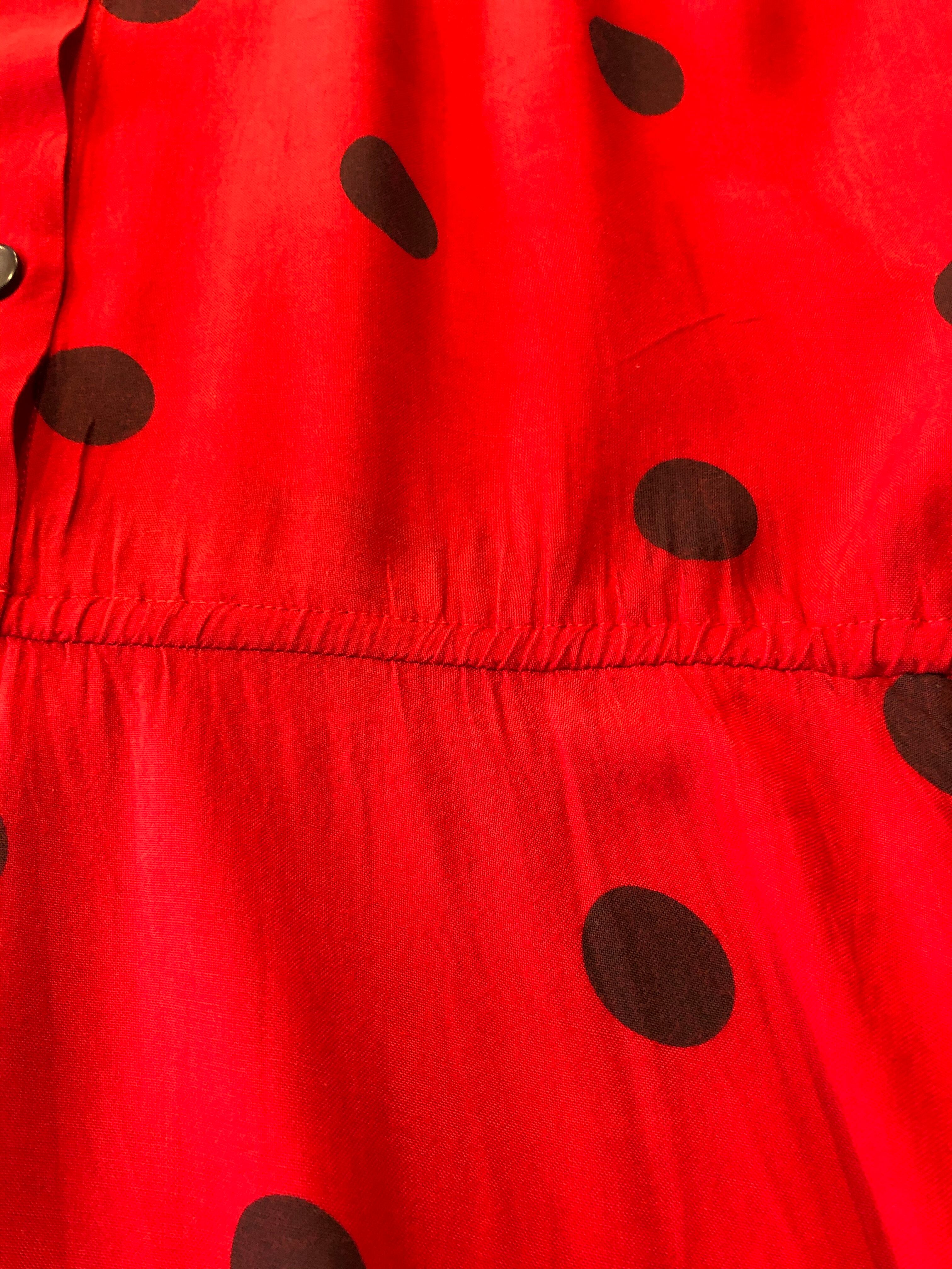 真っ赤に黒の大きめドットがかわいいワンピース。上半身はゆったりしたデザインになっており、袖口も広くて楽ちんです。襟元が広いので首もスッキリ大人な感じです!