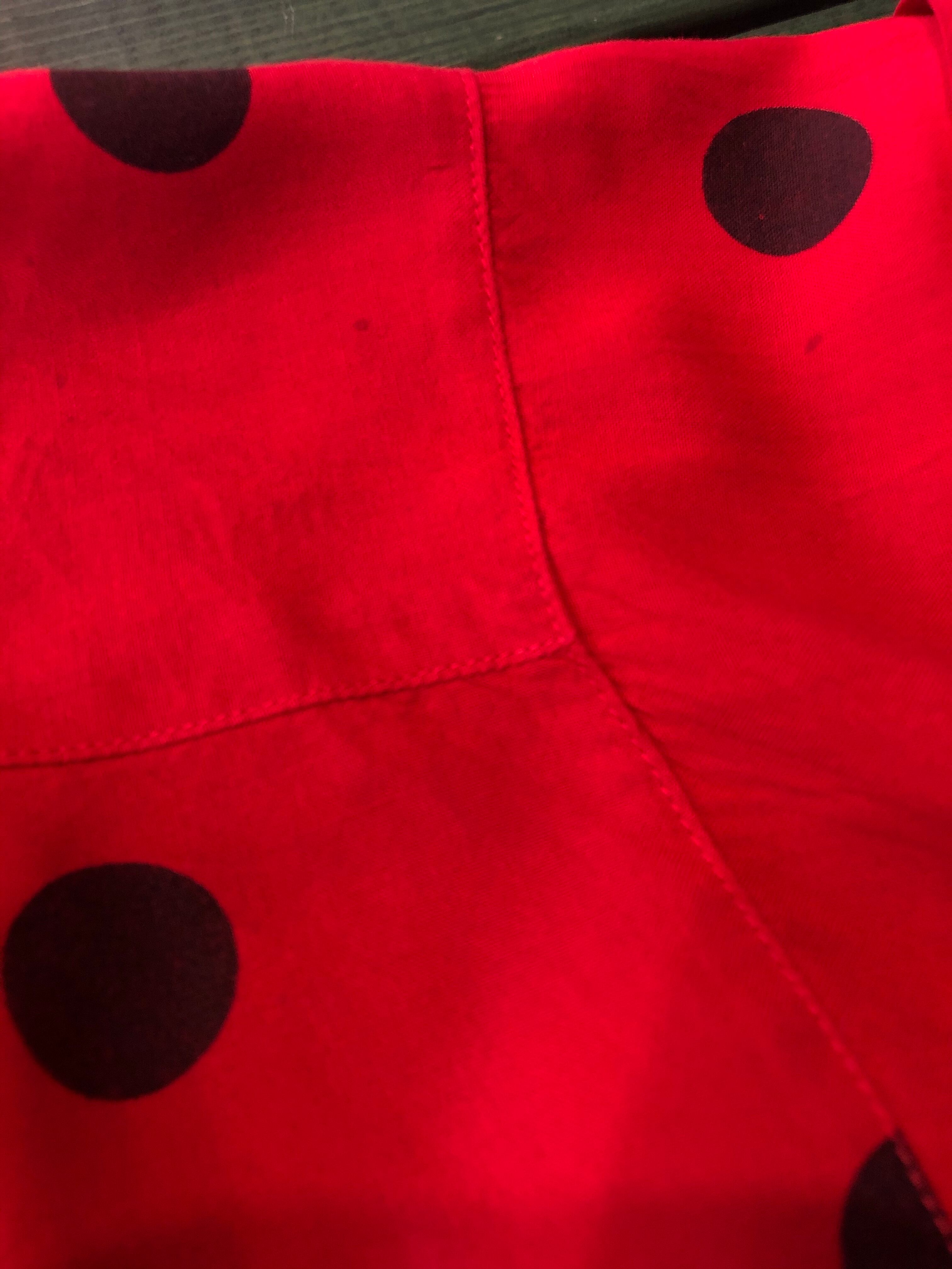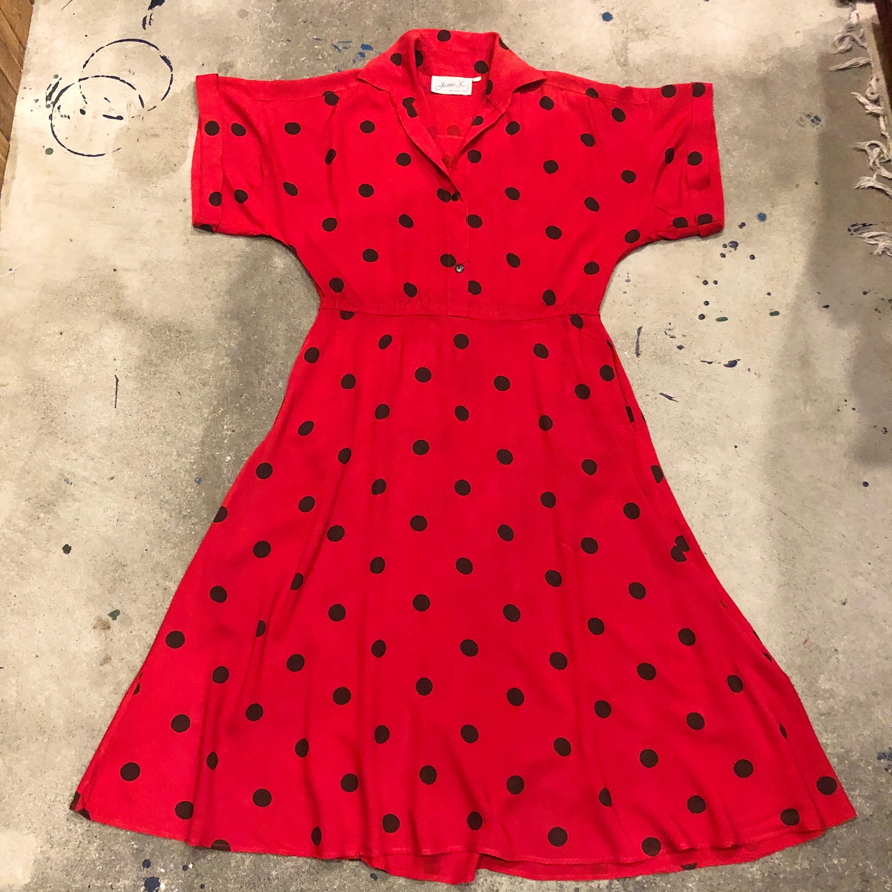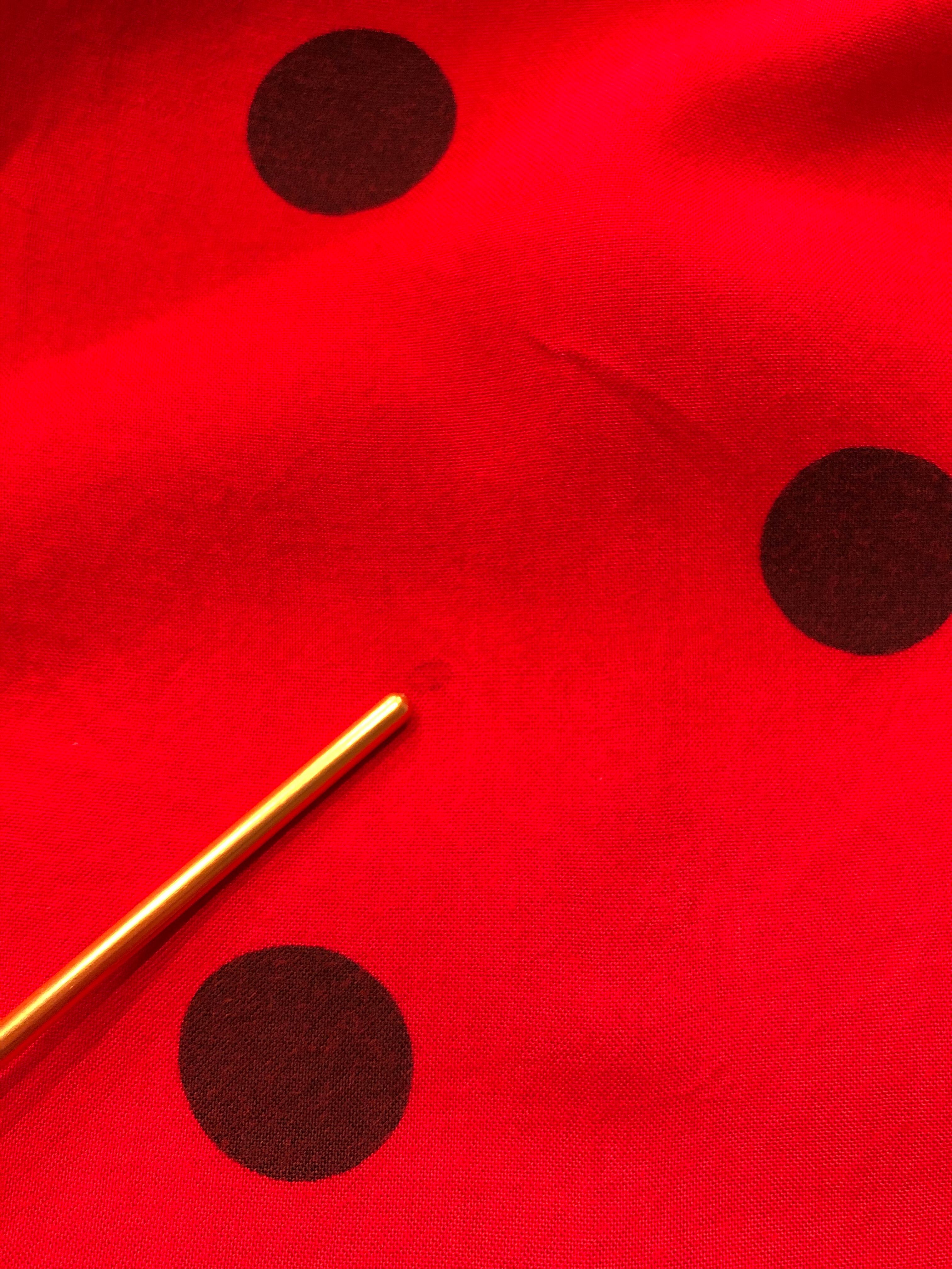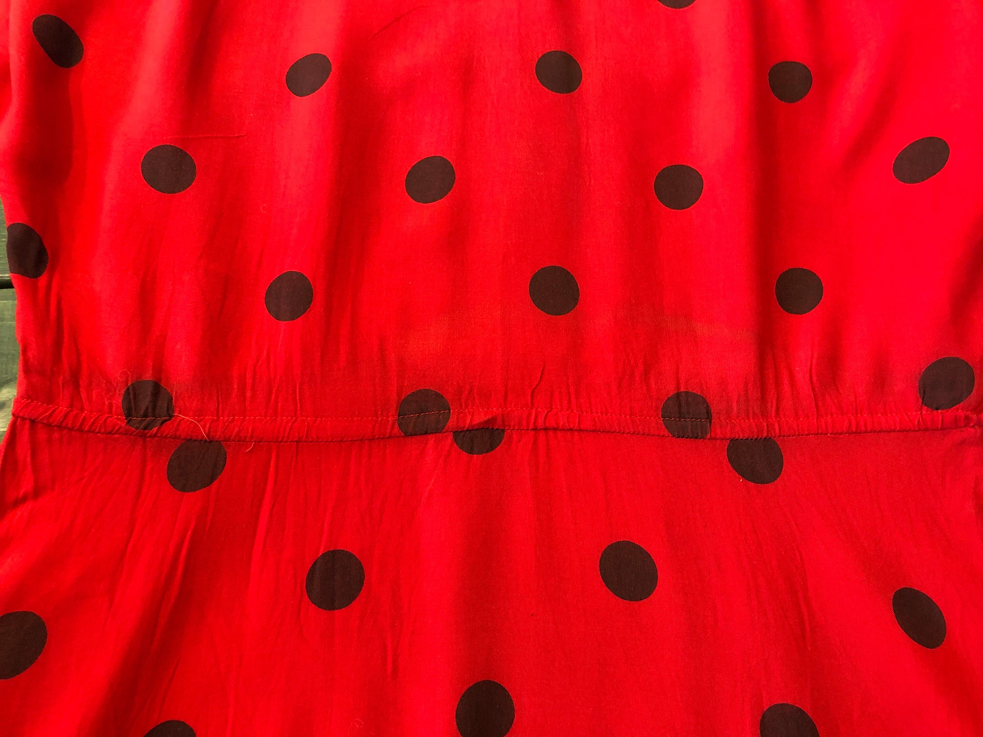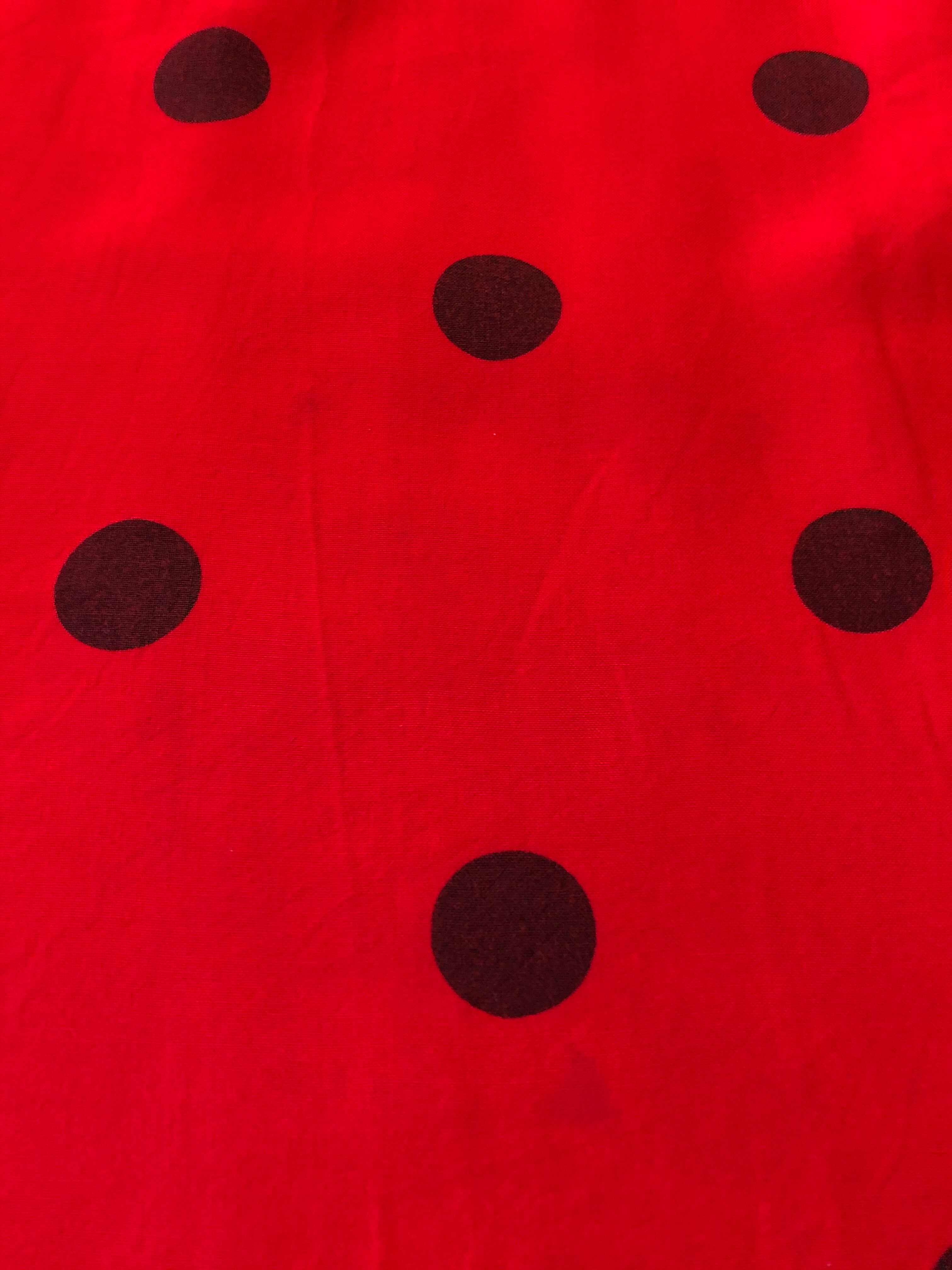 真っ赤に黒の大きめドットがかわいいワンピース。上半身はゆったりしたデザインになっており、袖口も広くて楽ちんです。襟元が広いので首もスッキリ大人な感じです!