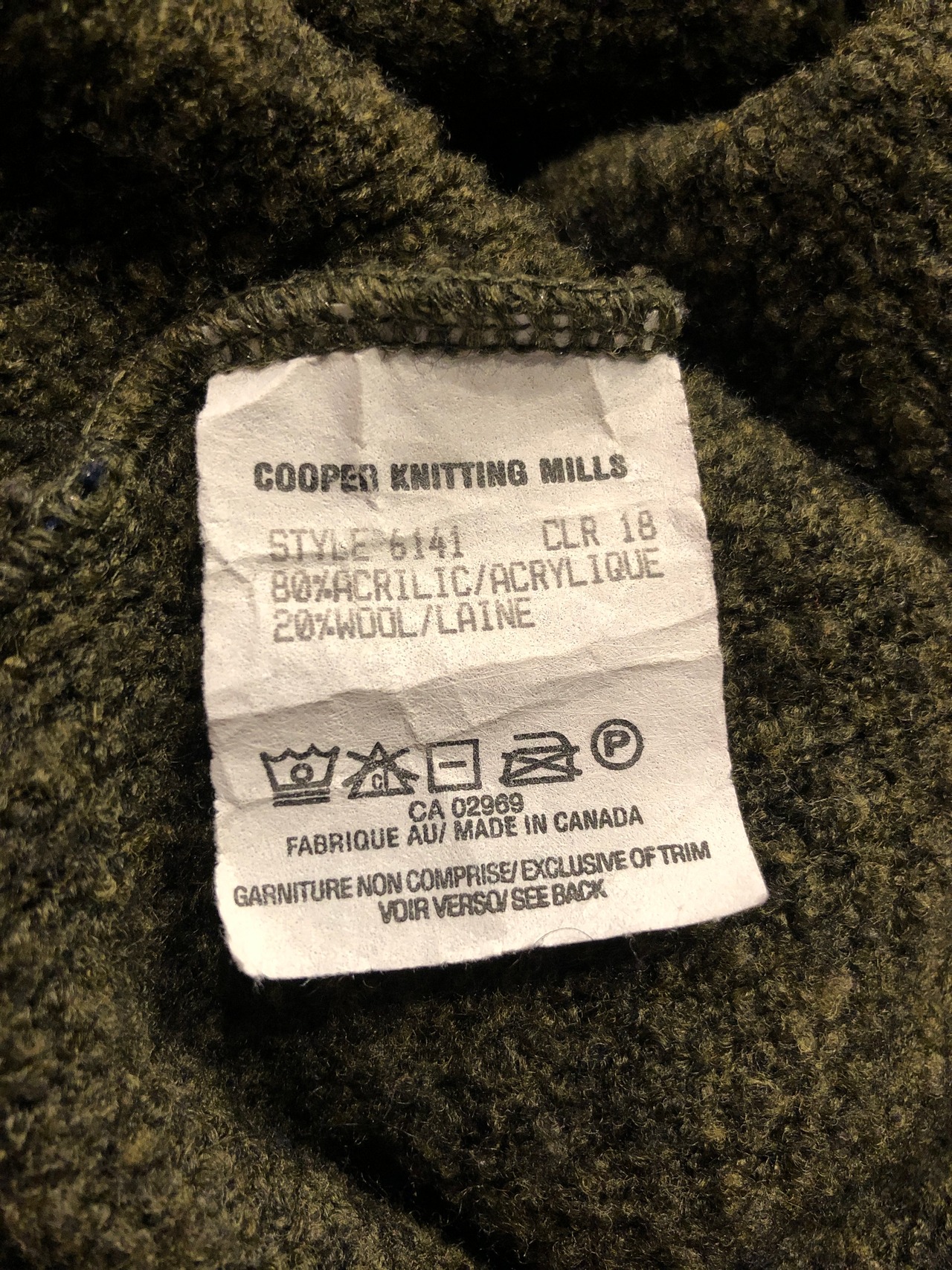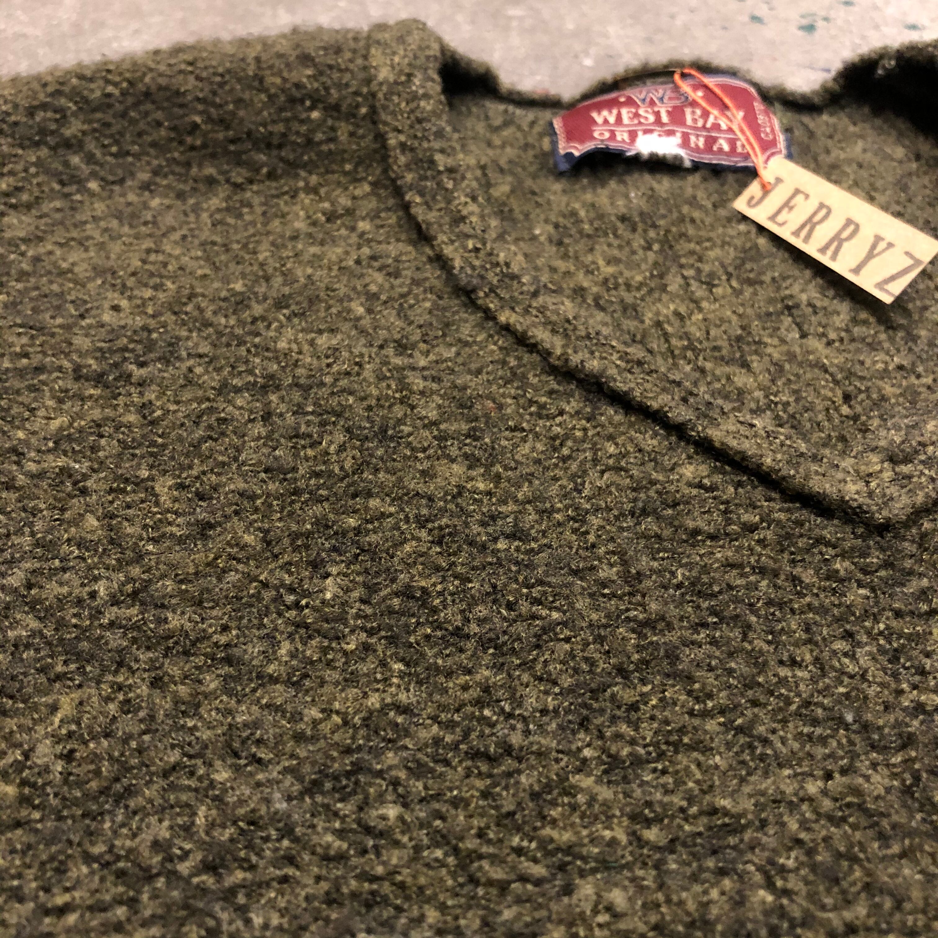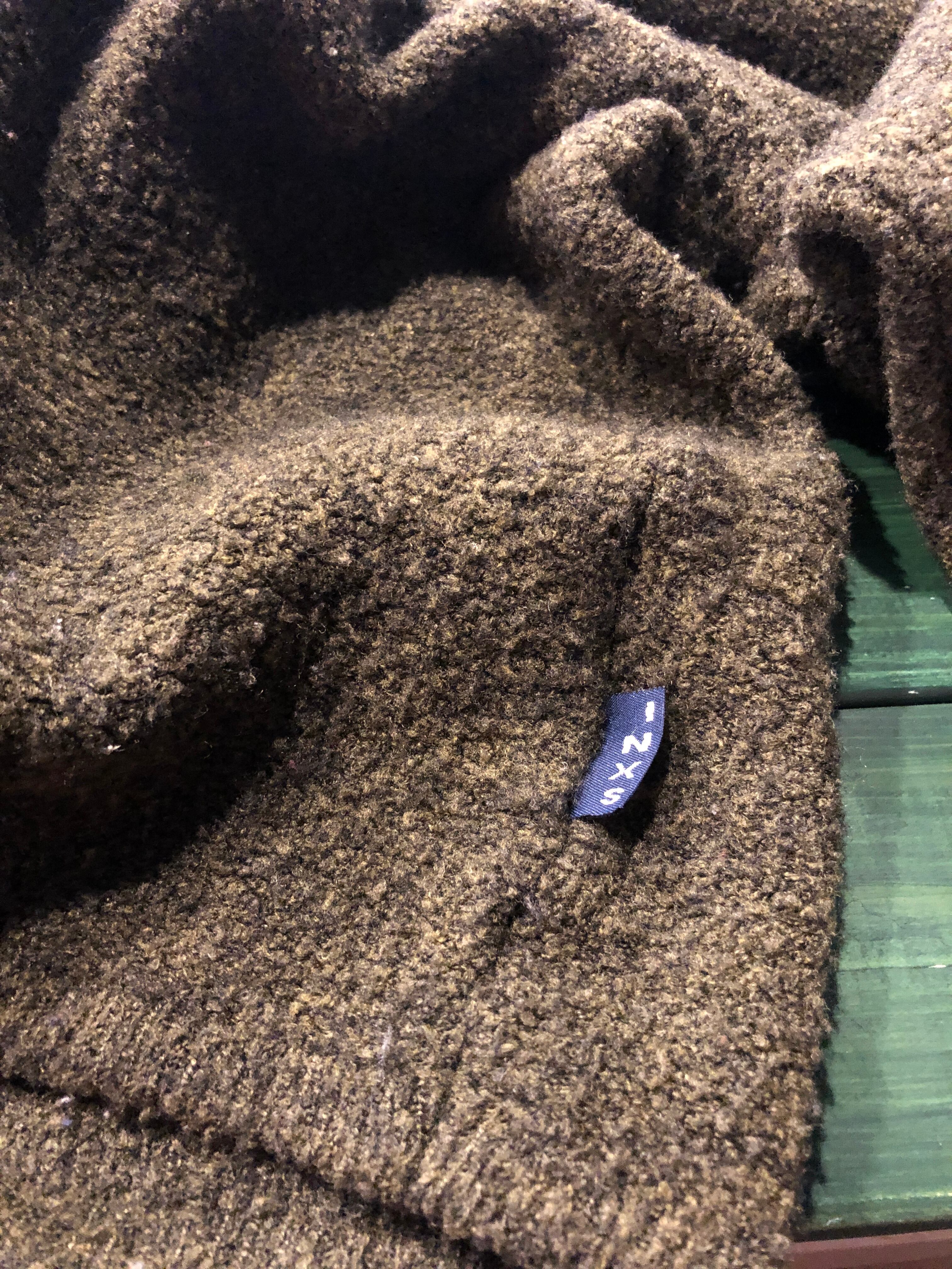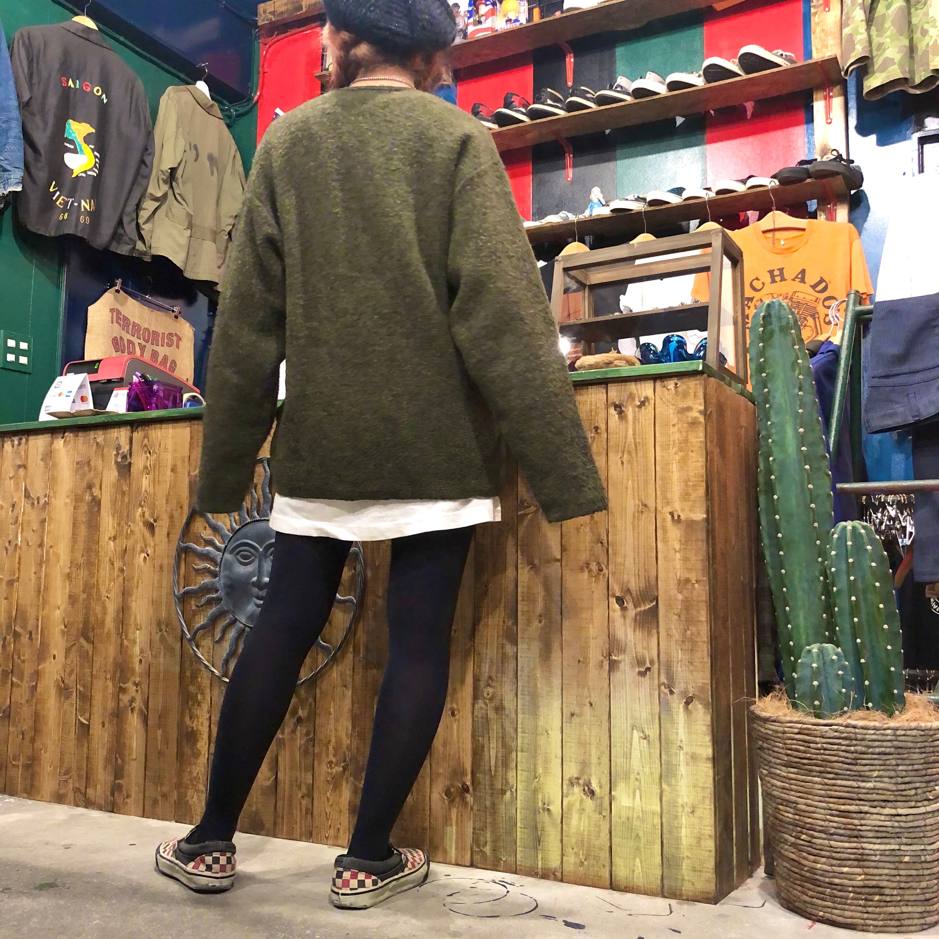 もこもこした質感とシブいカーキが良い感じです。どこにでもありそうに見えてなにか気になる魅力があり、着たときの雰囲気が良いです。