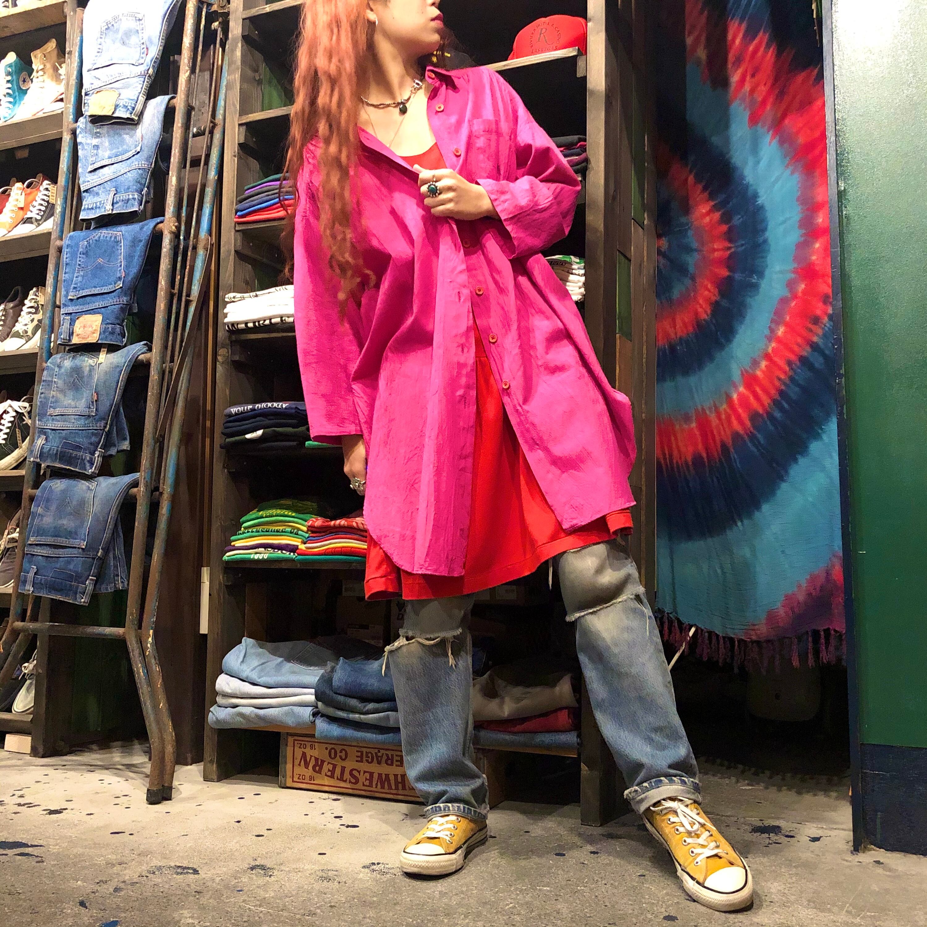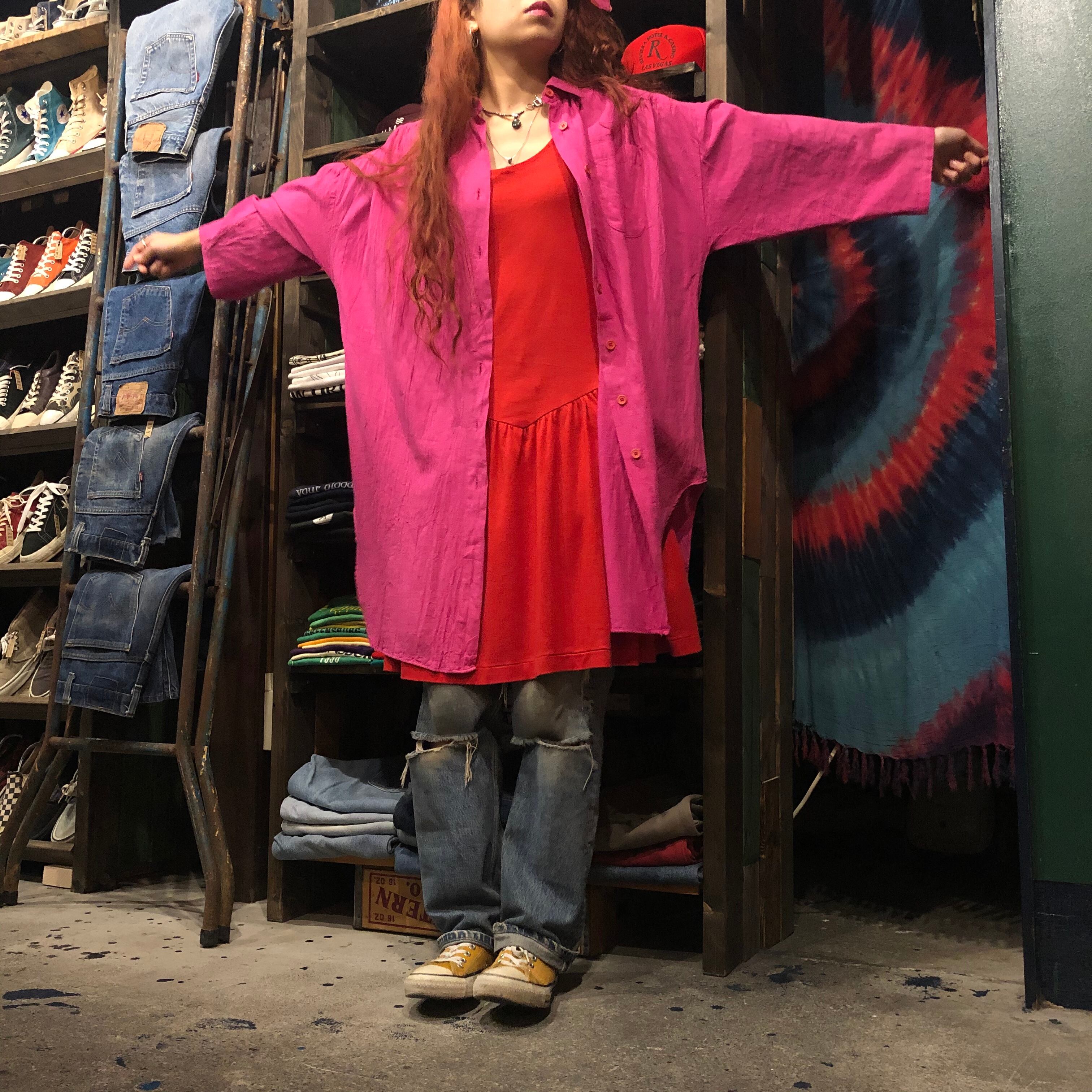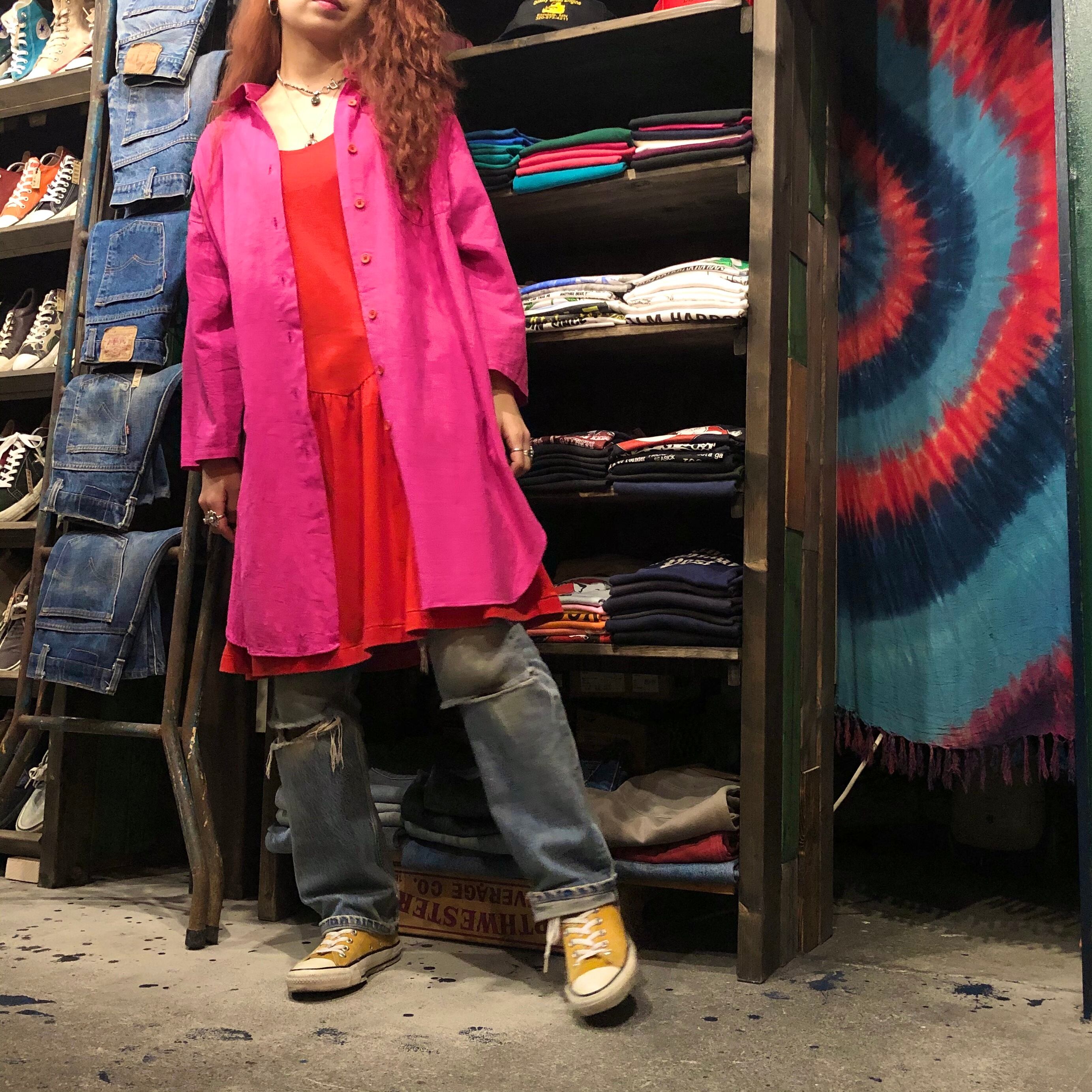 かなり軽い感じなので夏も着ていただけそうです。この濃い目のピンクはいつ見てもやっぱりかわいいと思ってしまう色ですね。まだ寒い時期はニットを上に重ねて襟と裾だけ出しても良いですね!