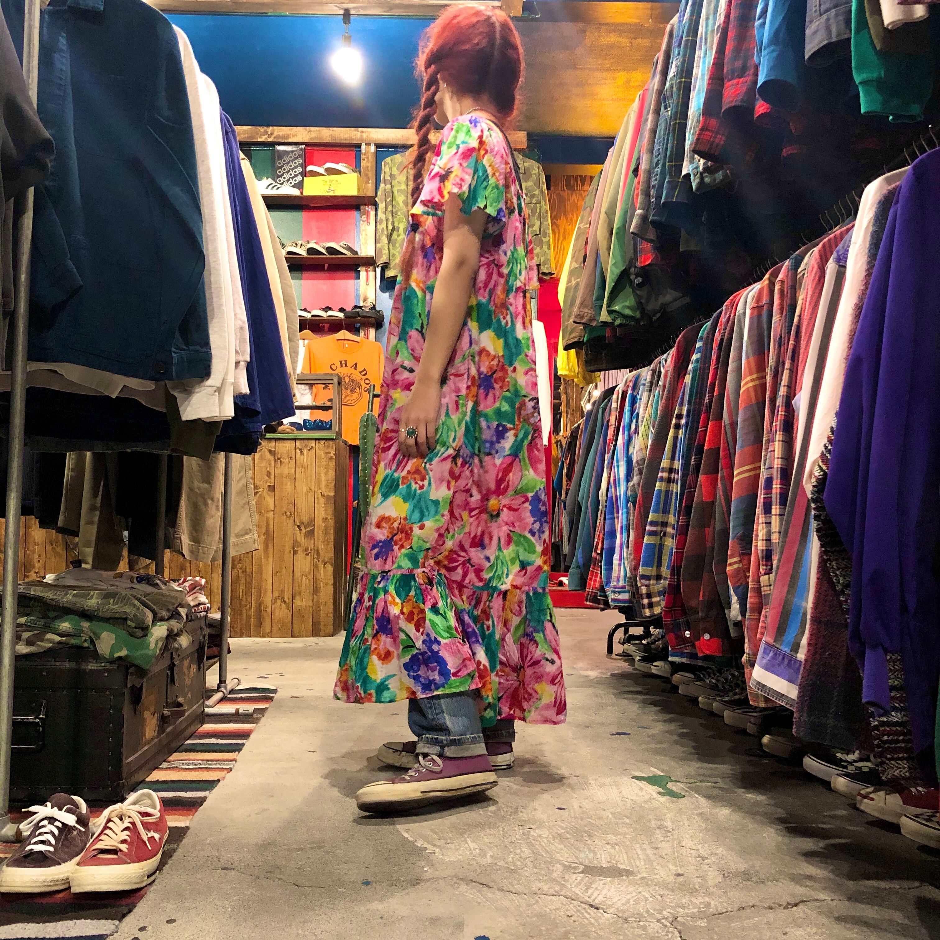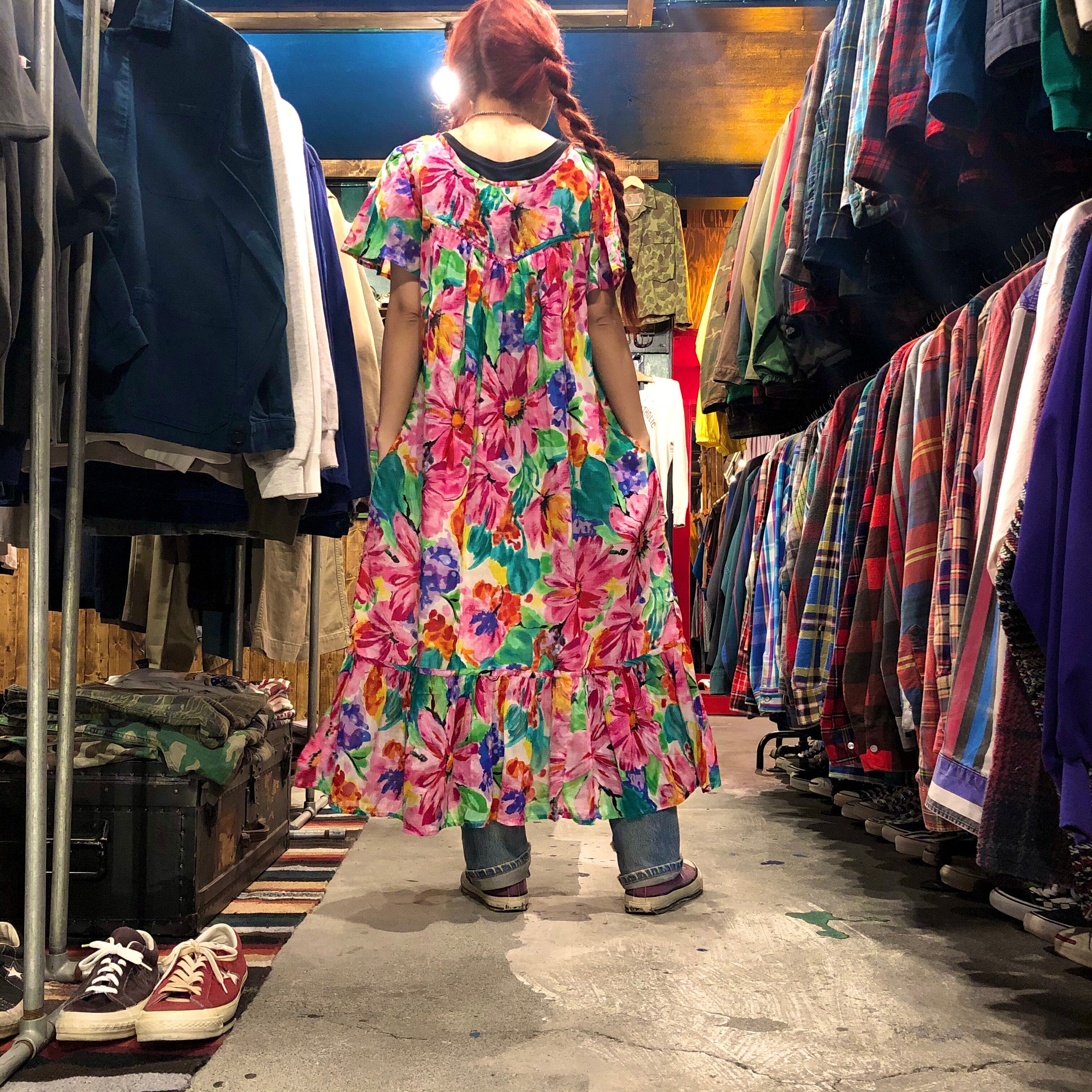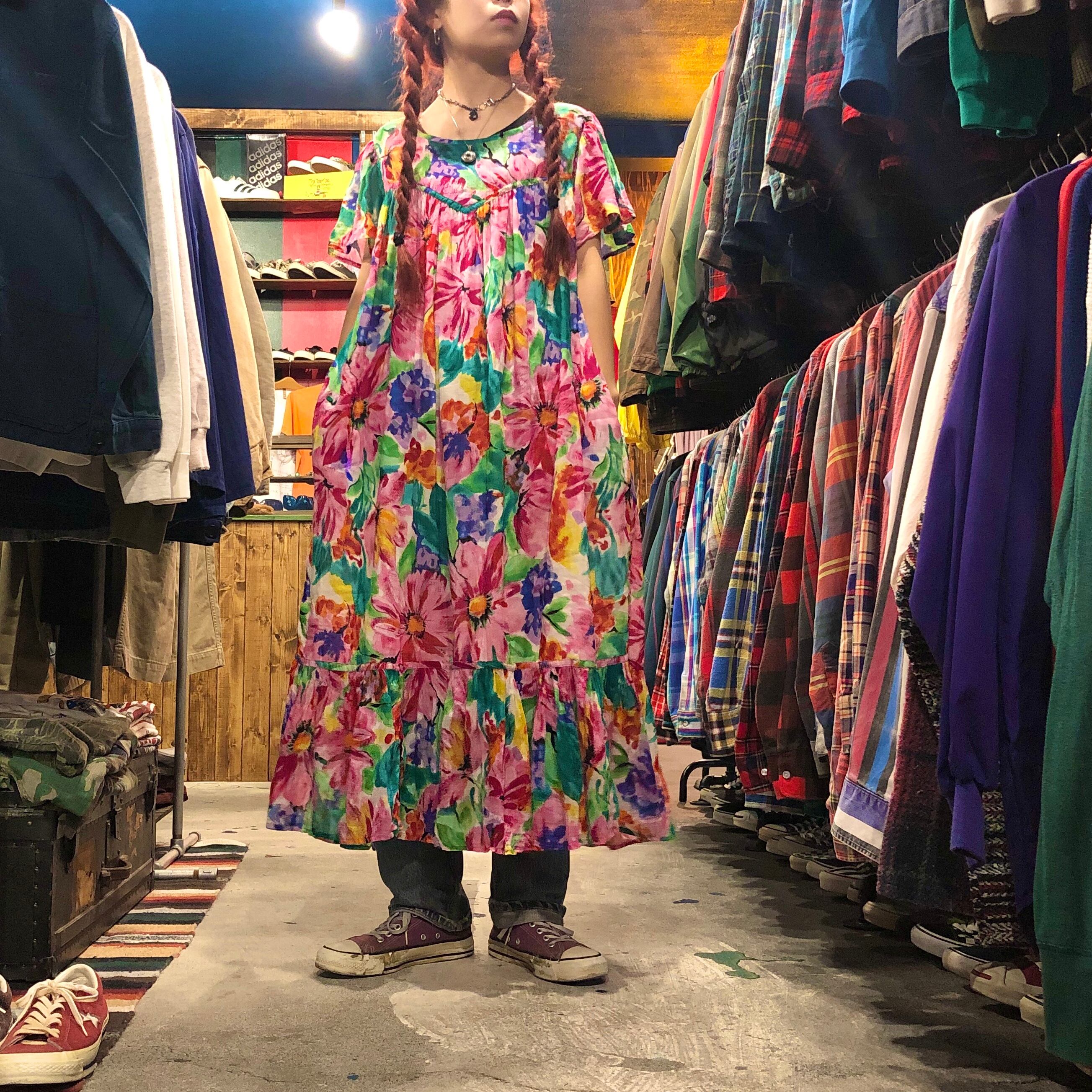薄いガーゼのようなコットンのワンピースです。ピンクとグリーン多めの花柄が鮮やかでかわいいです。そでのヒラヒラ具合も程よく、夏は一枚で涼しく着れそうです!