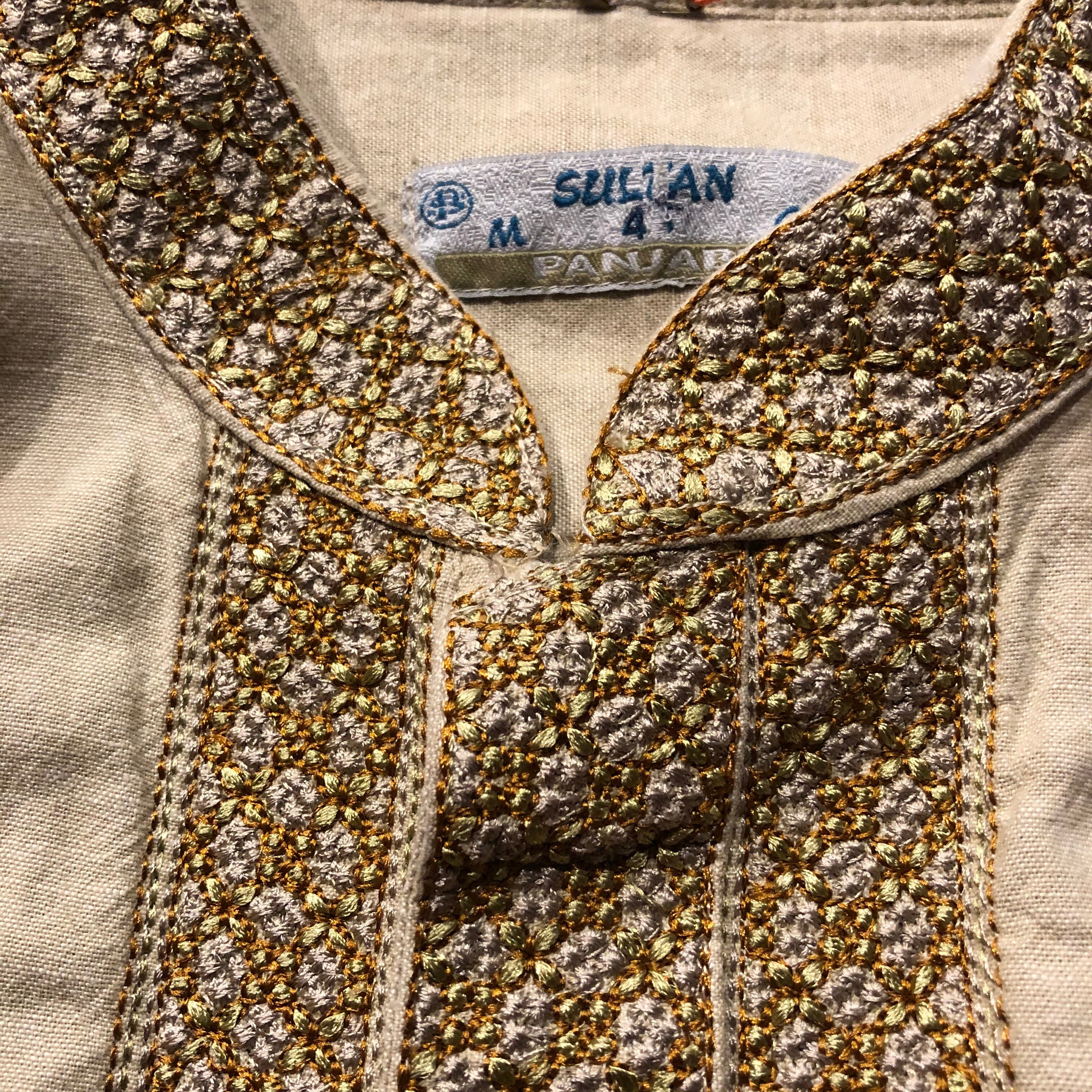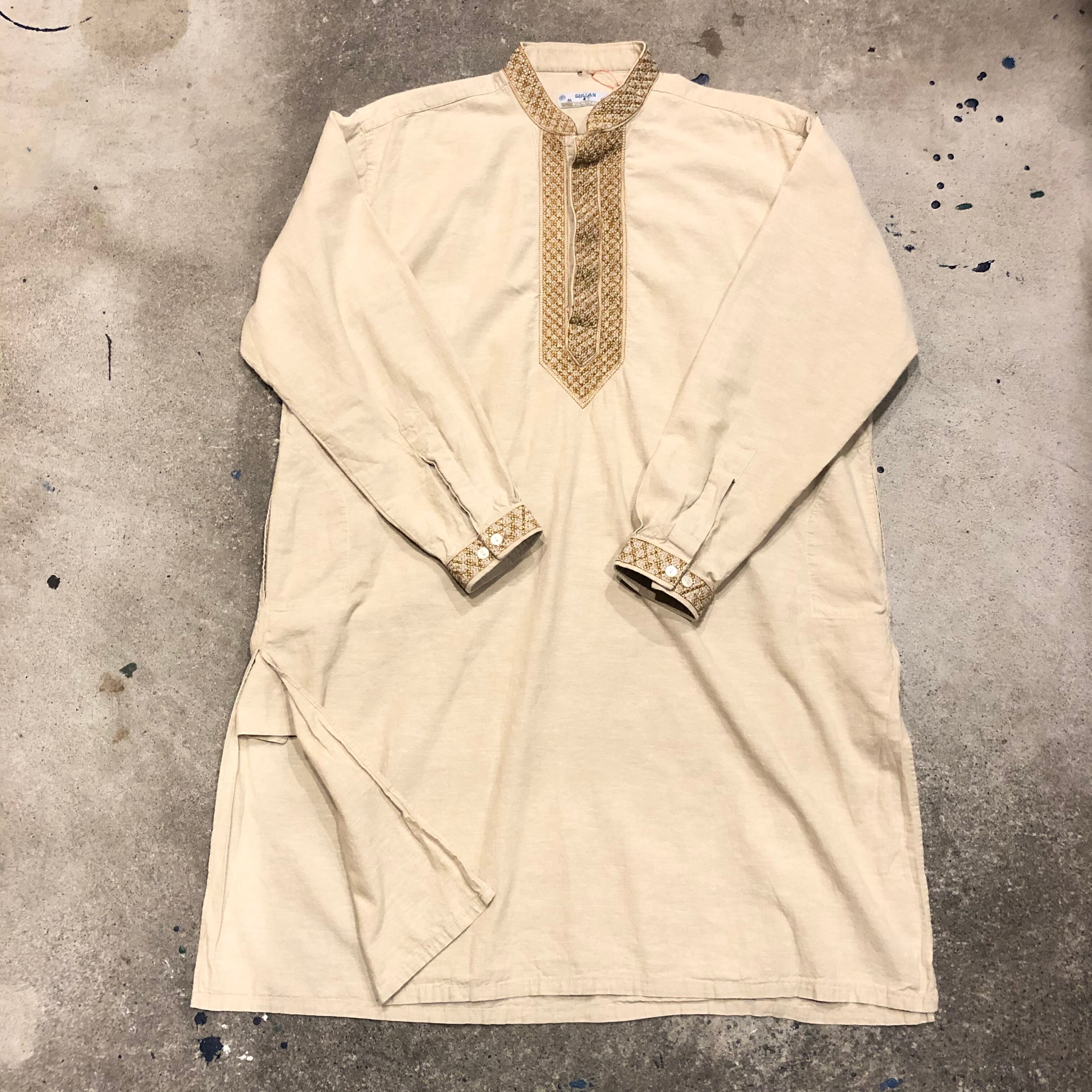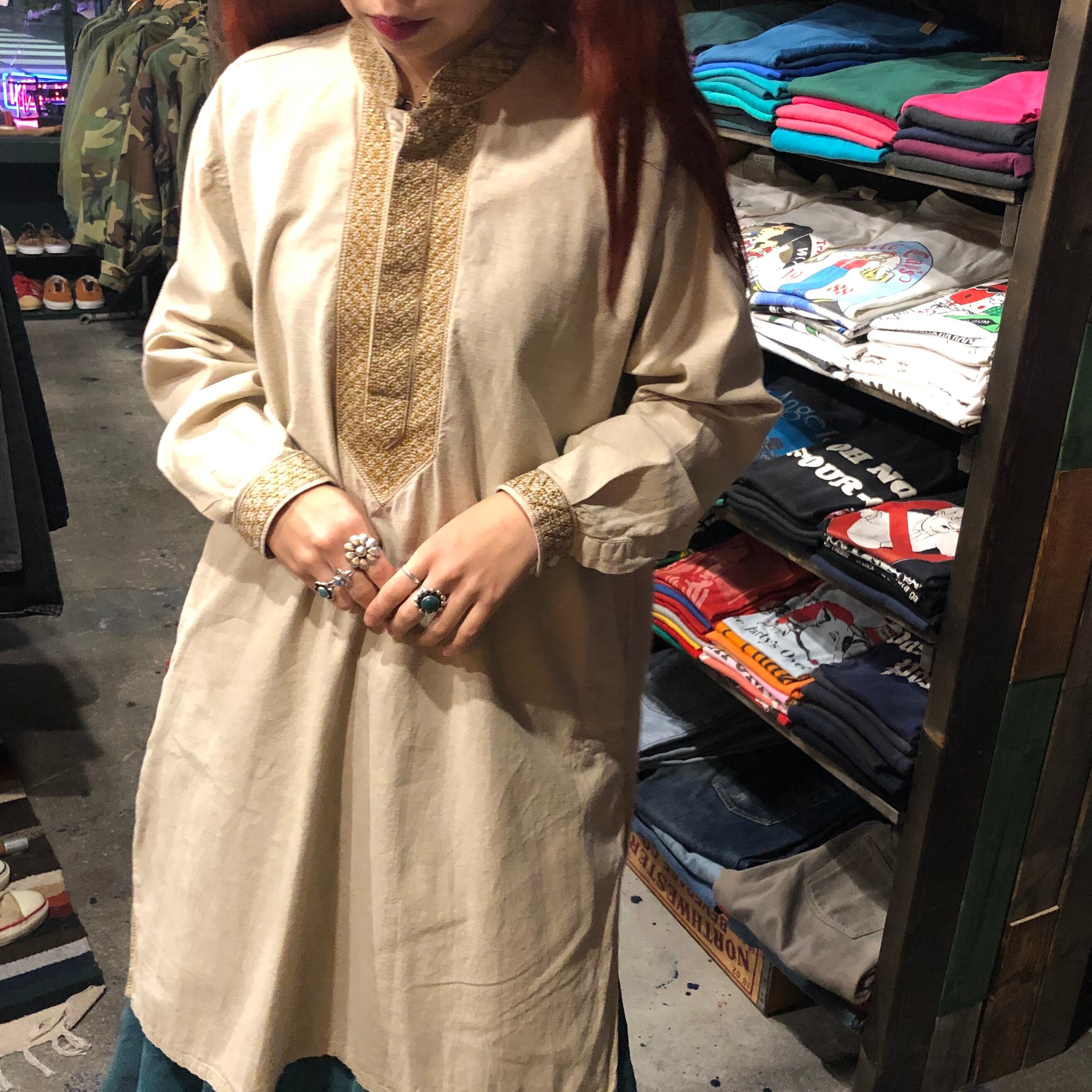 シンプルで薄いベージュなので何色でも合わせやすいです。襟元、袖口の細かな刺繍も素敵です。元々男性が着るものですので、男性にもおすすめです!