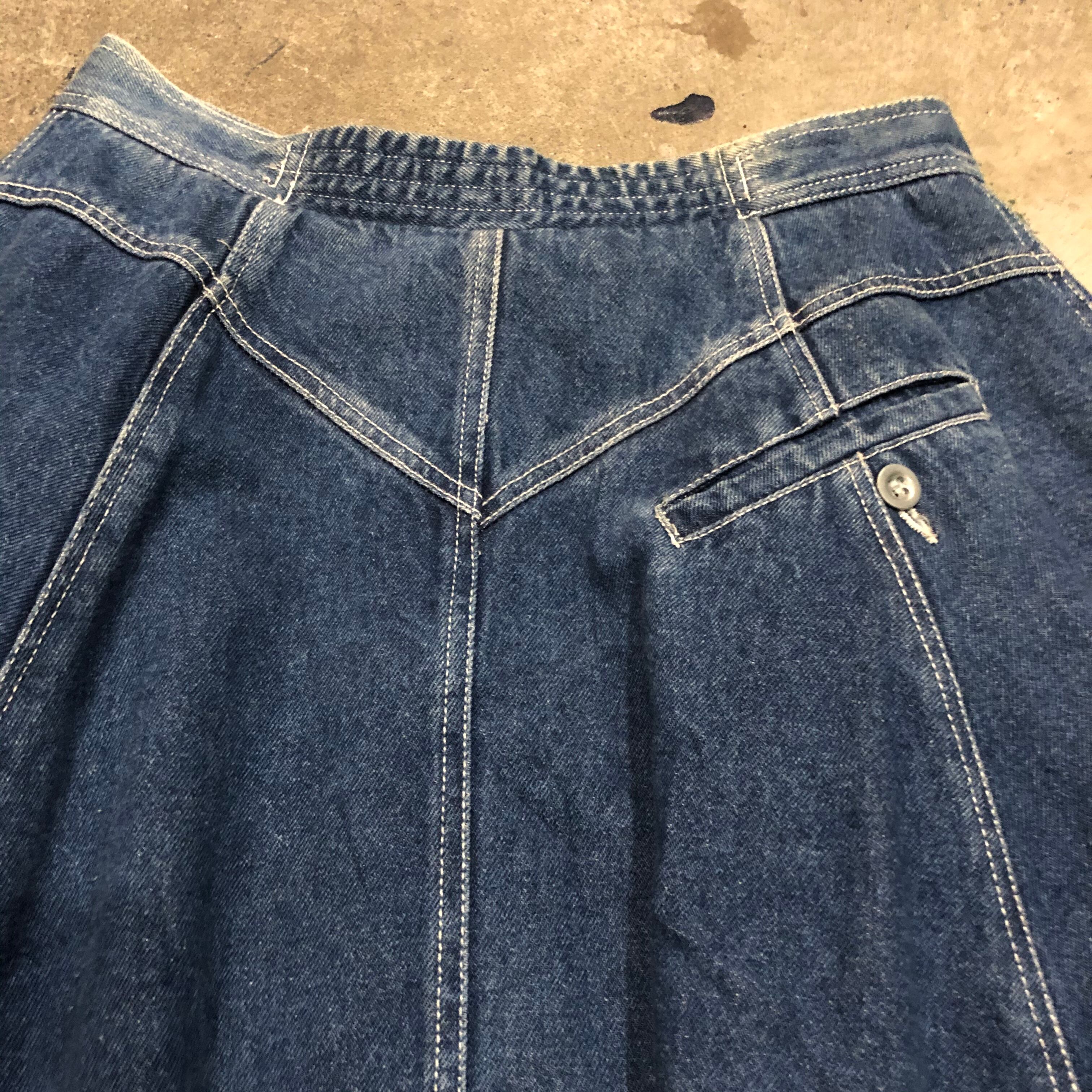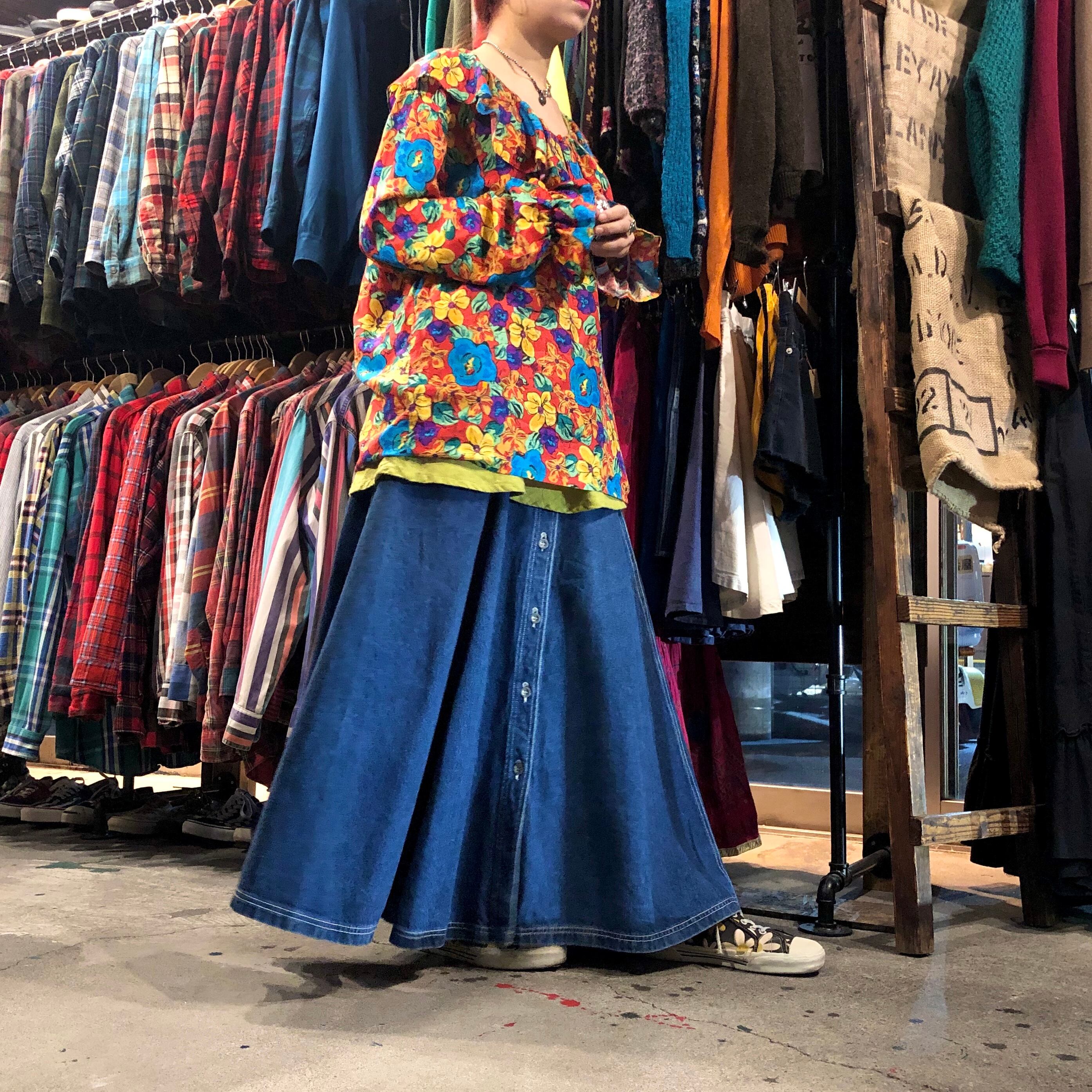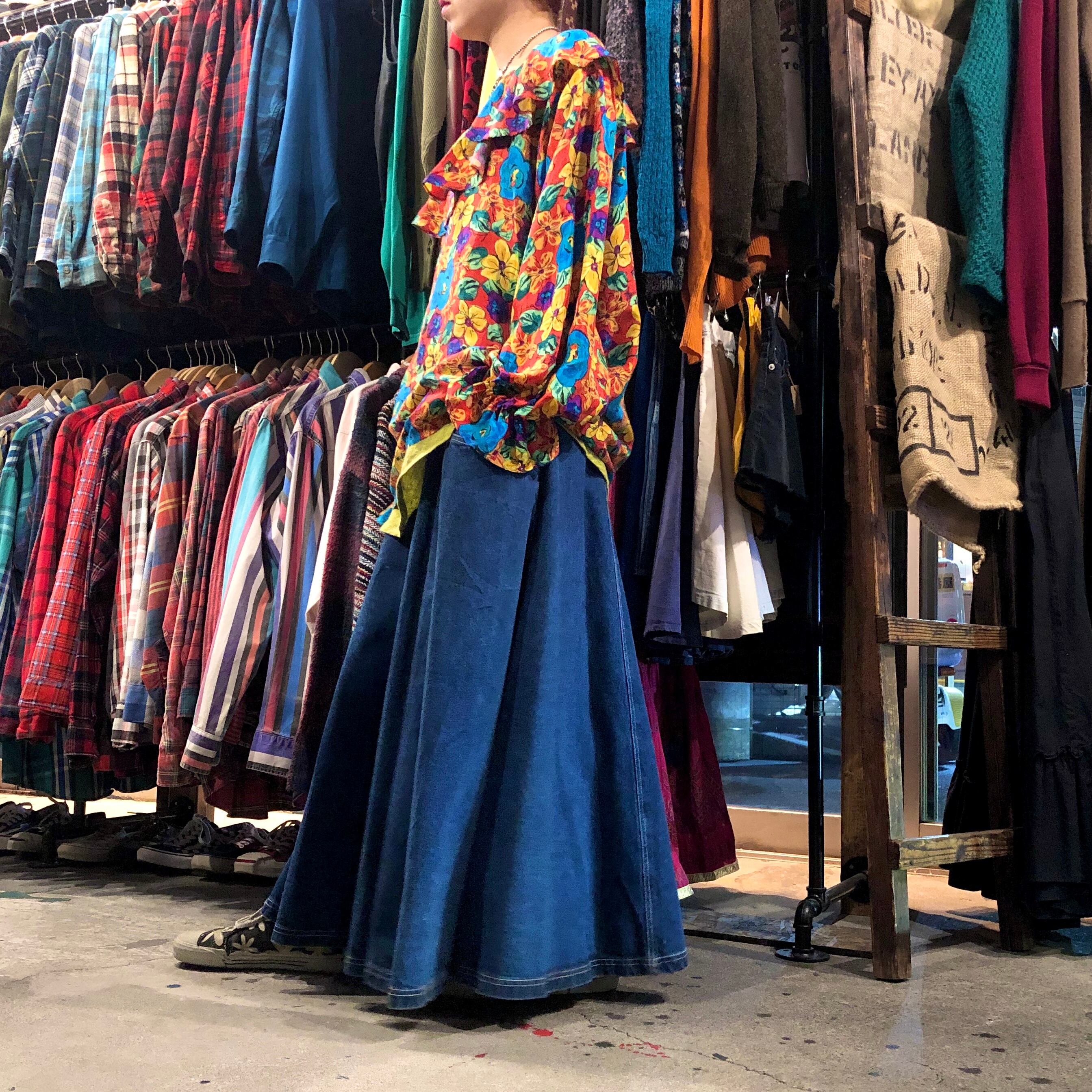 厚手のデニムをたっぷり使ってあるロングスカートです。このボリューム感たまりません。大きなポケットが付いているのもポイントです!