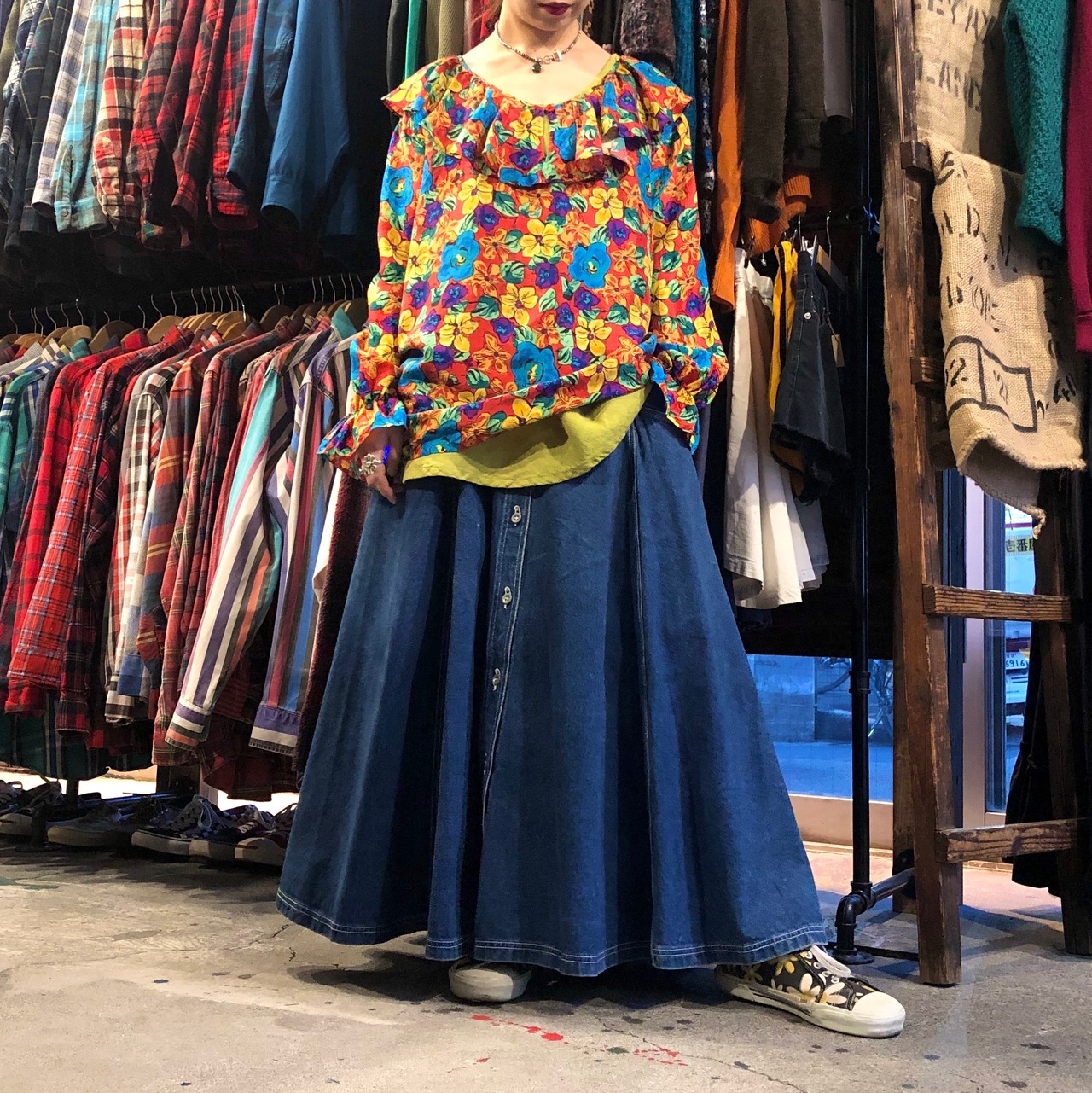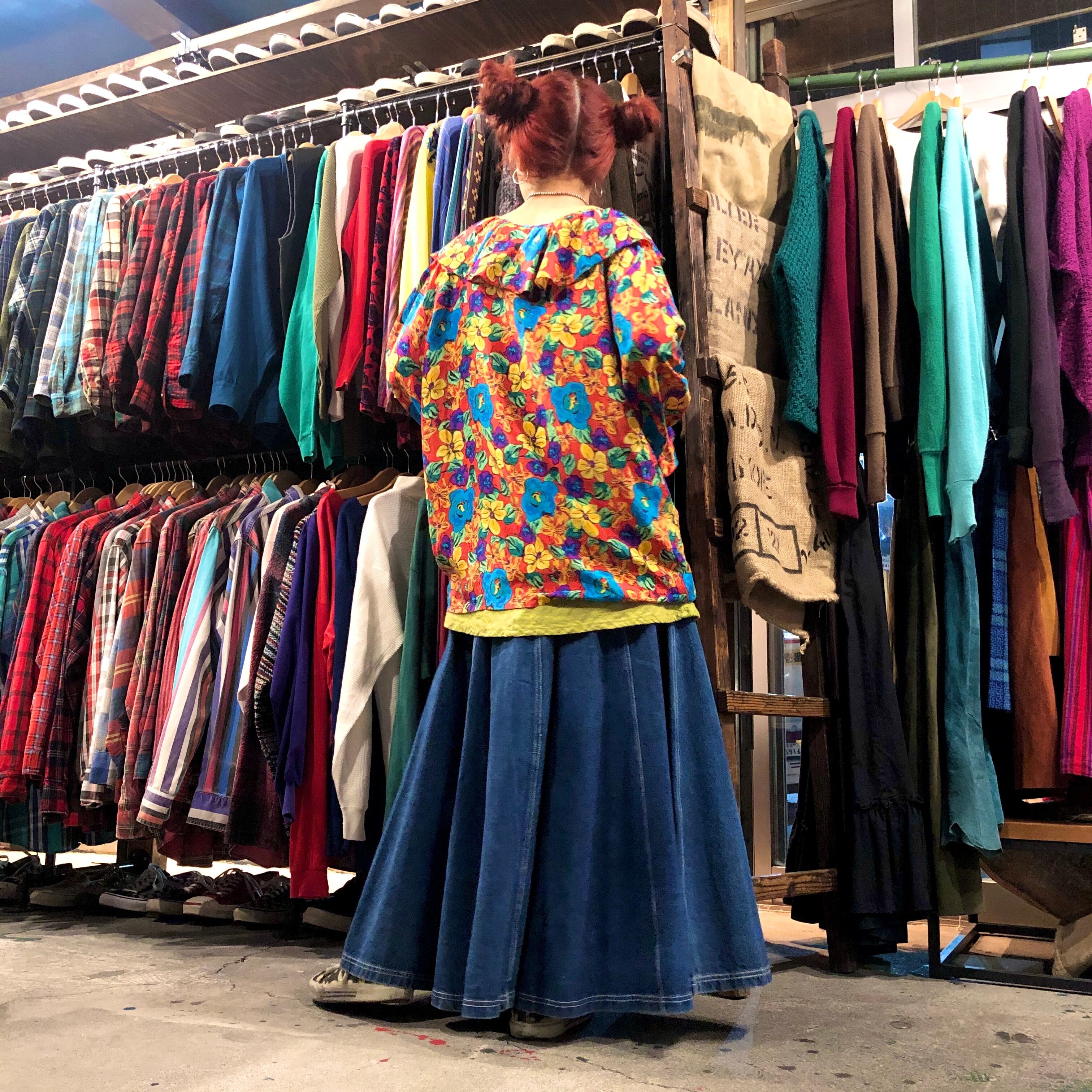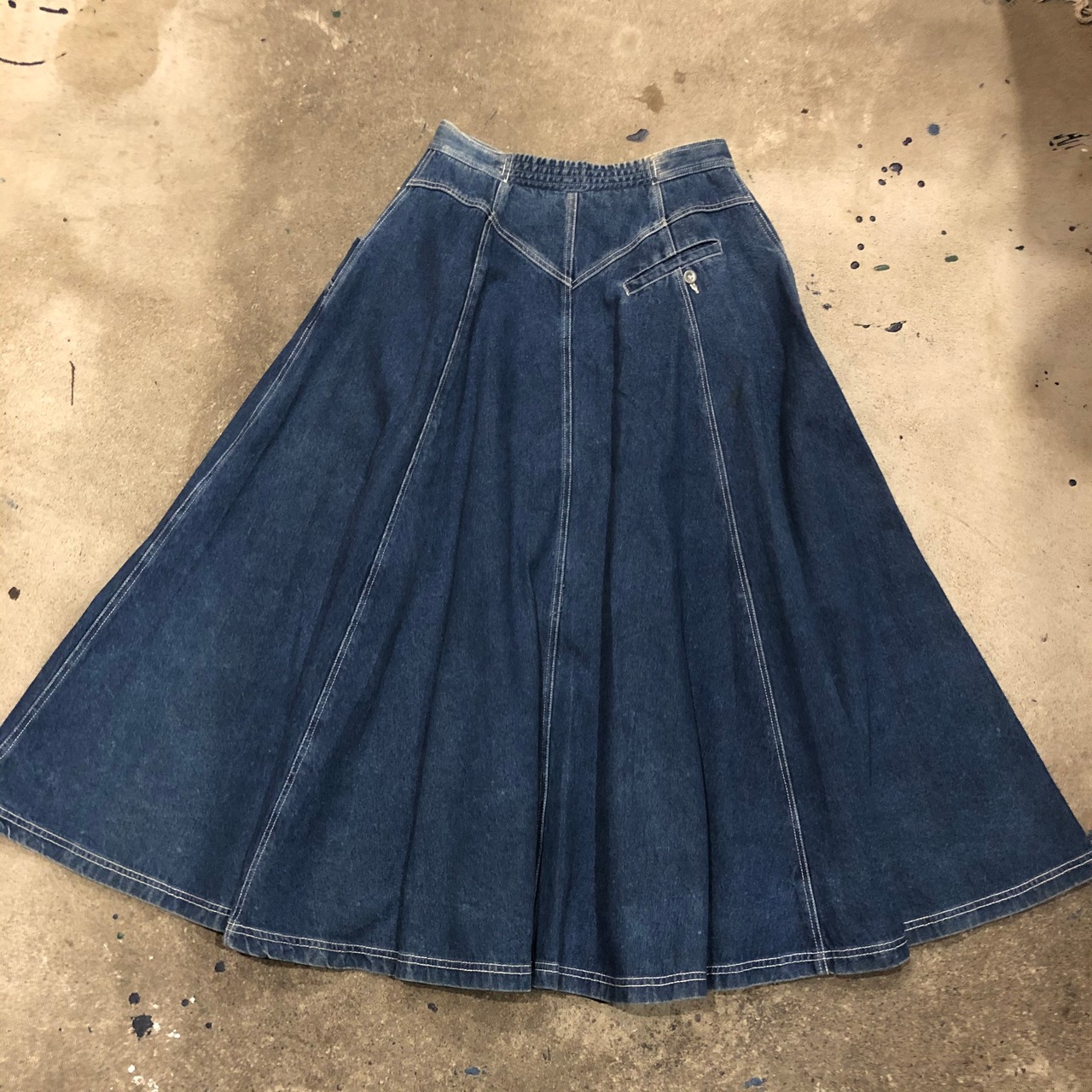 厚手のデニムをたっぷり使ってあるロングスカートです。このボリューム感たまりません。大きなポケットが付いているのもポイントです!
