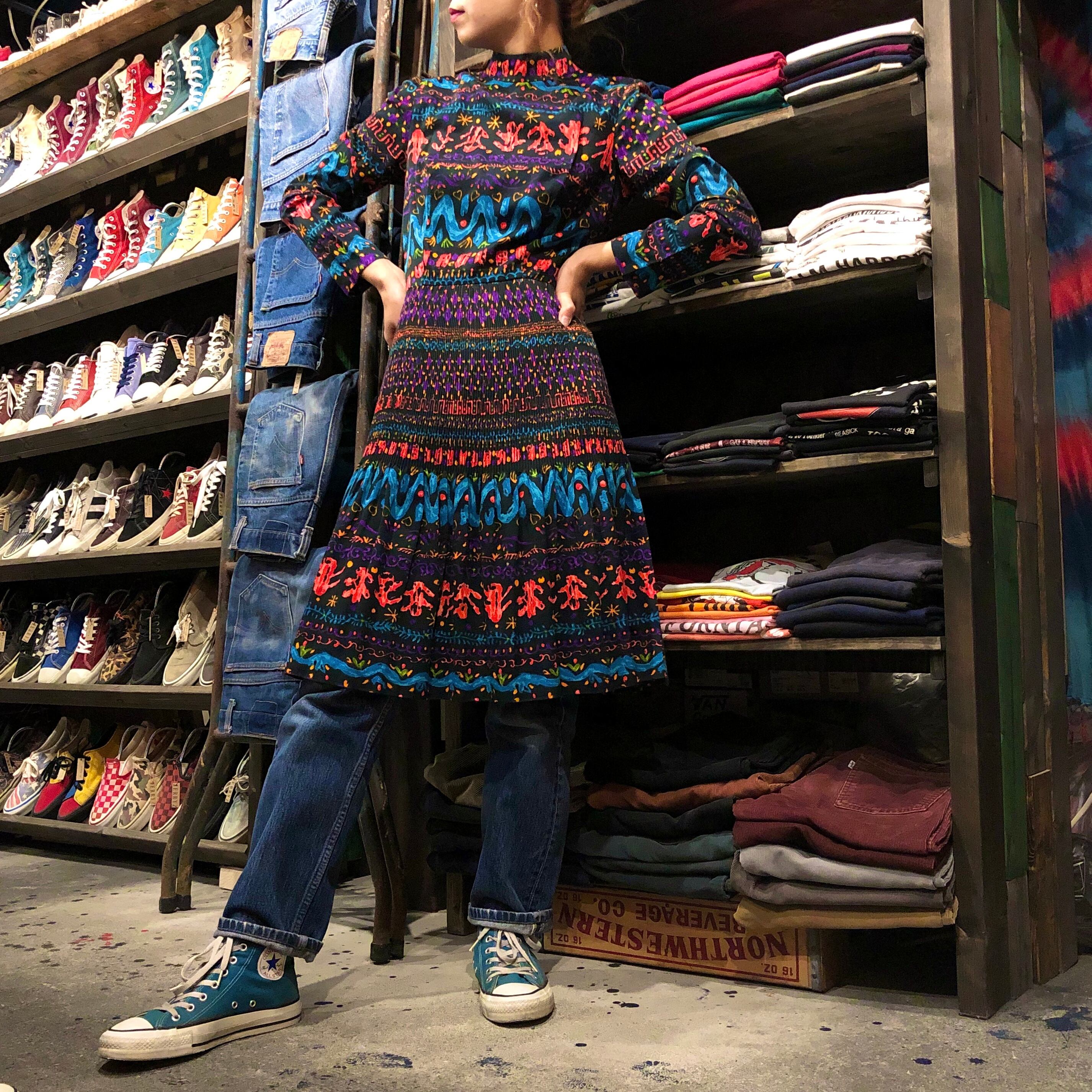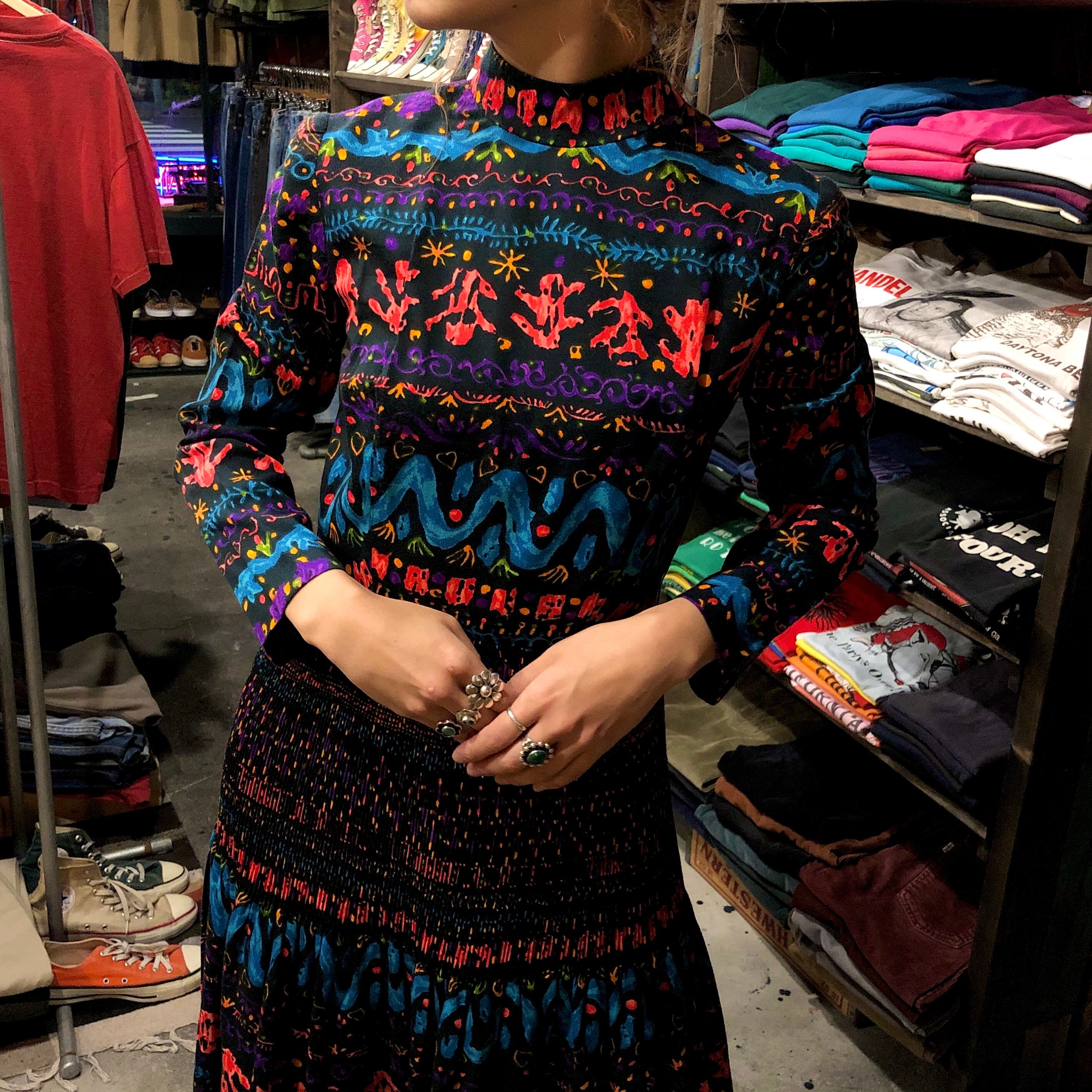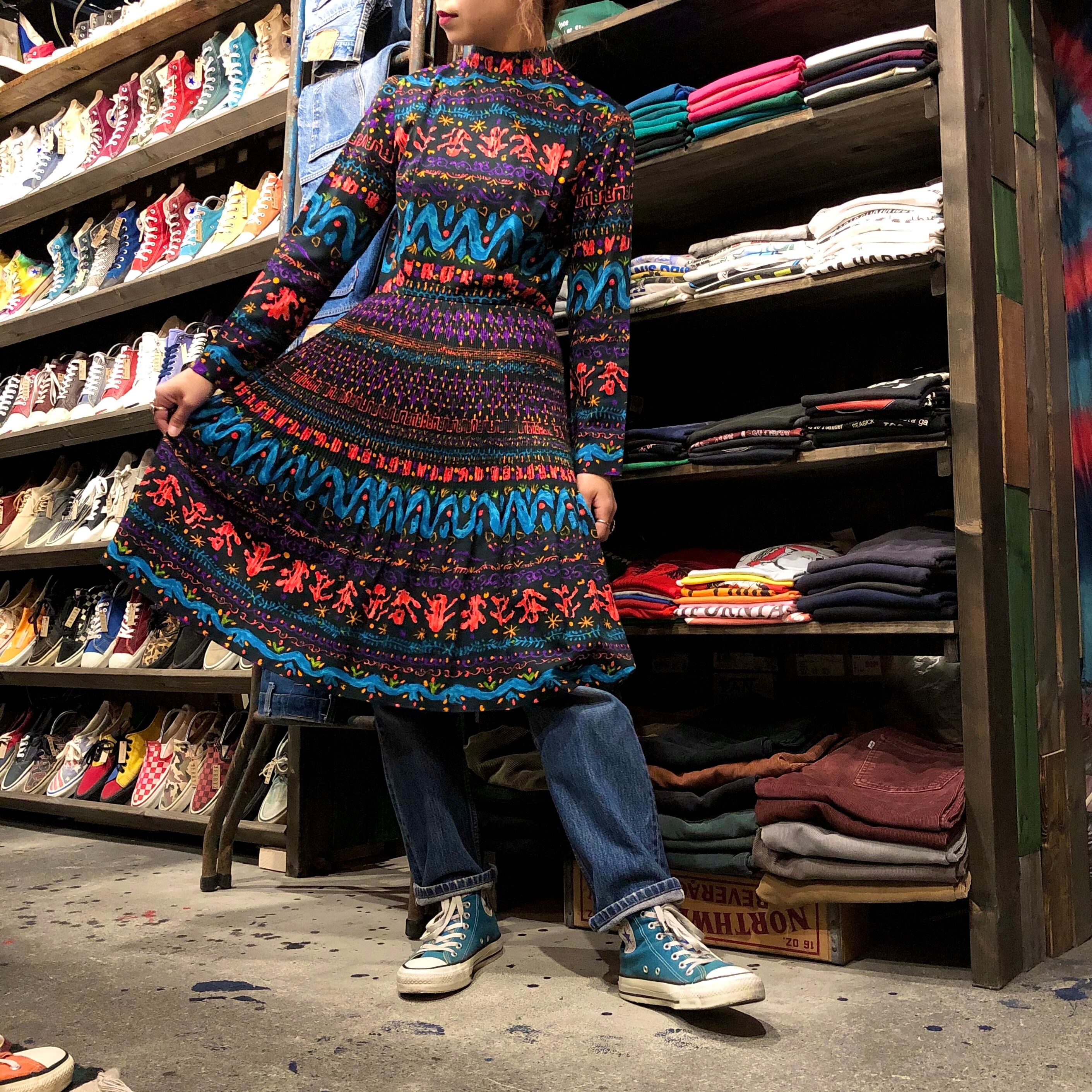 独特な総柄、色合いも魅力的なワンピースです。ウエスト部分から30cmほどかなり細かいプリーツになっていたり珍しい形もポイントです。きれいなシルエットなので、ドレスコードのあるような場所にも着ていけそうな雰囲気です。