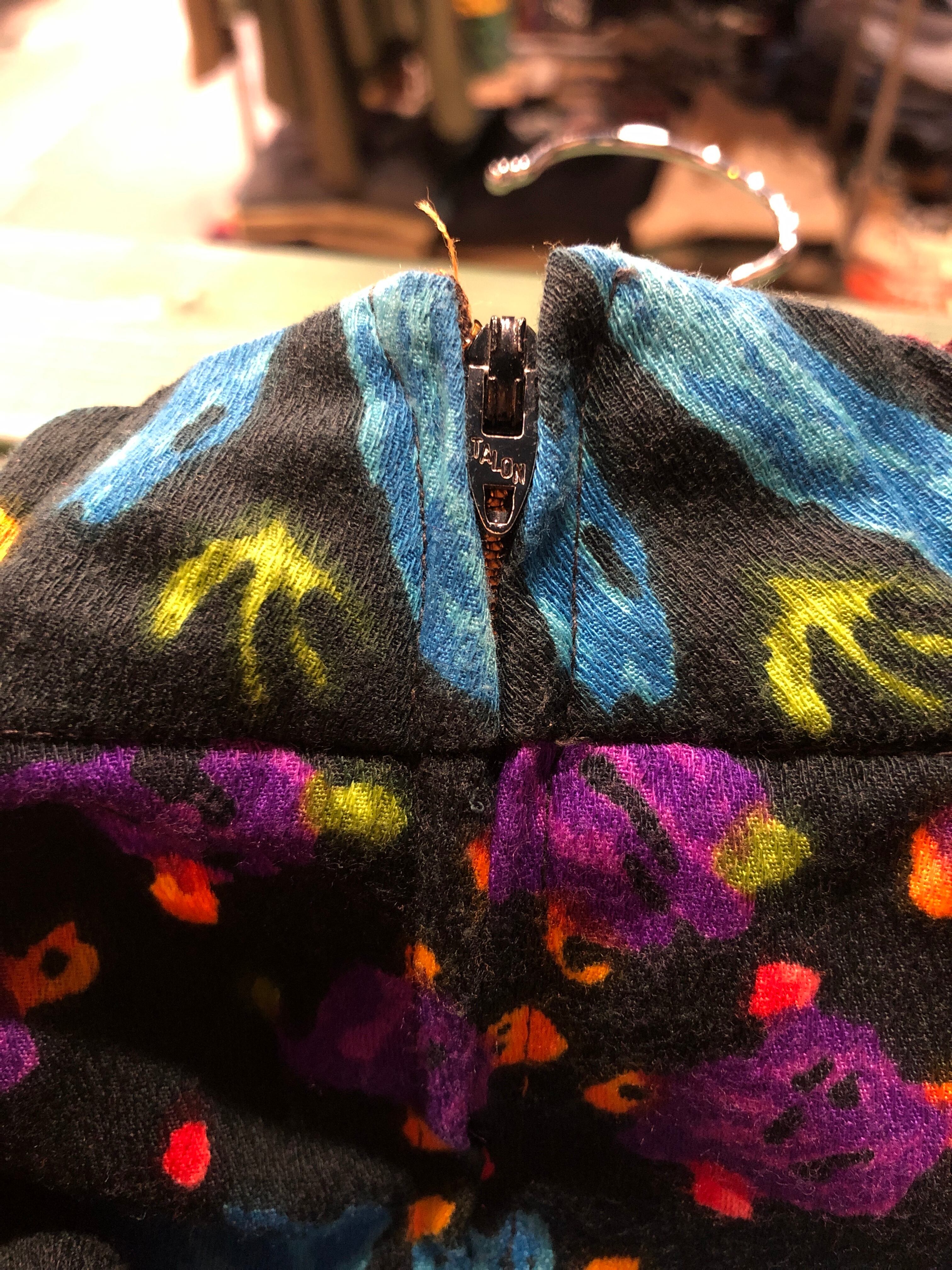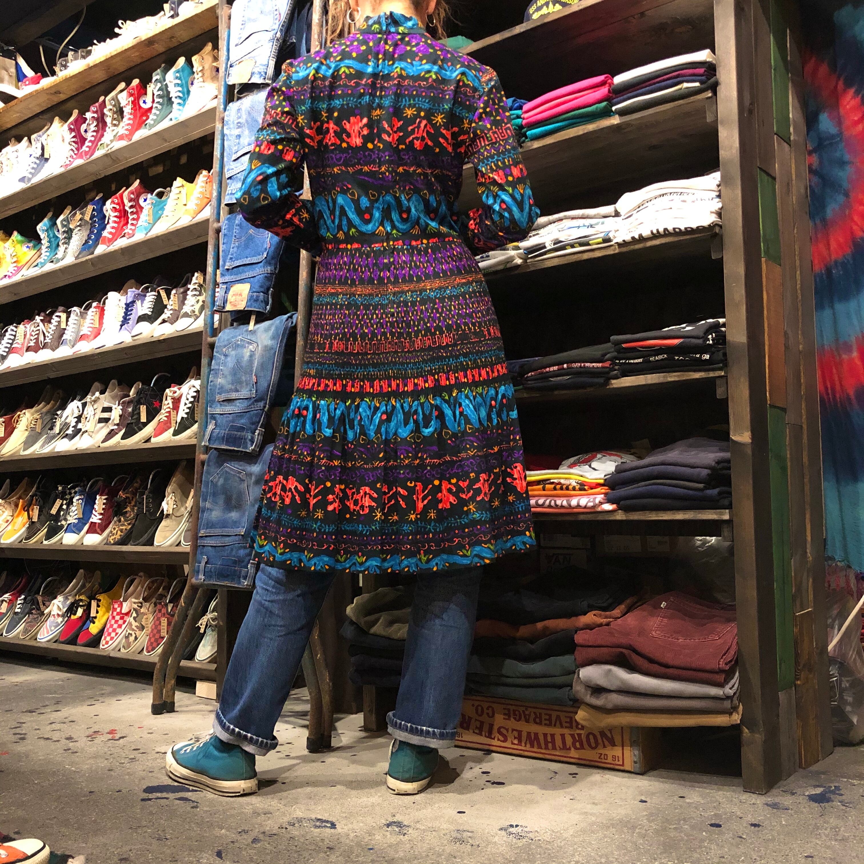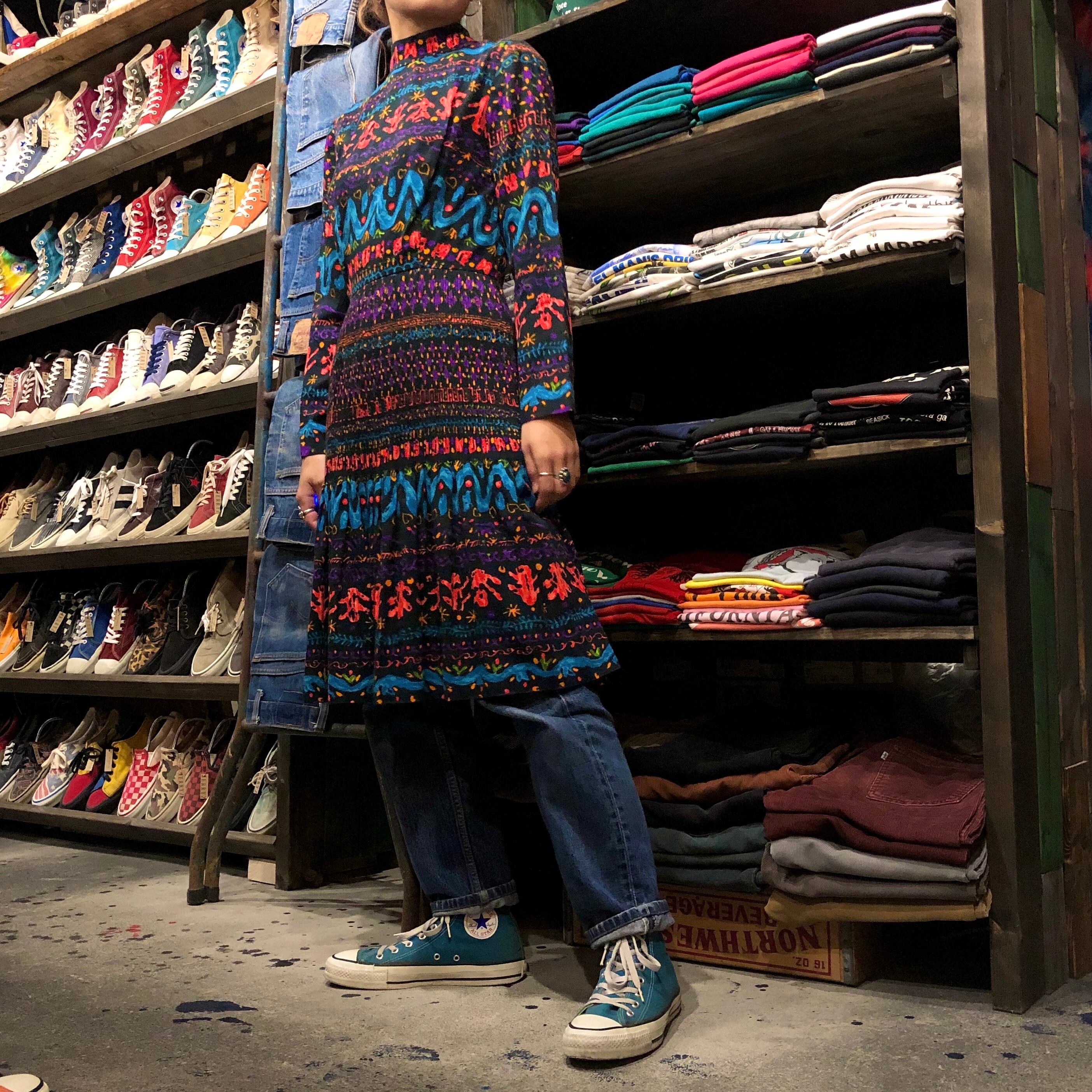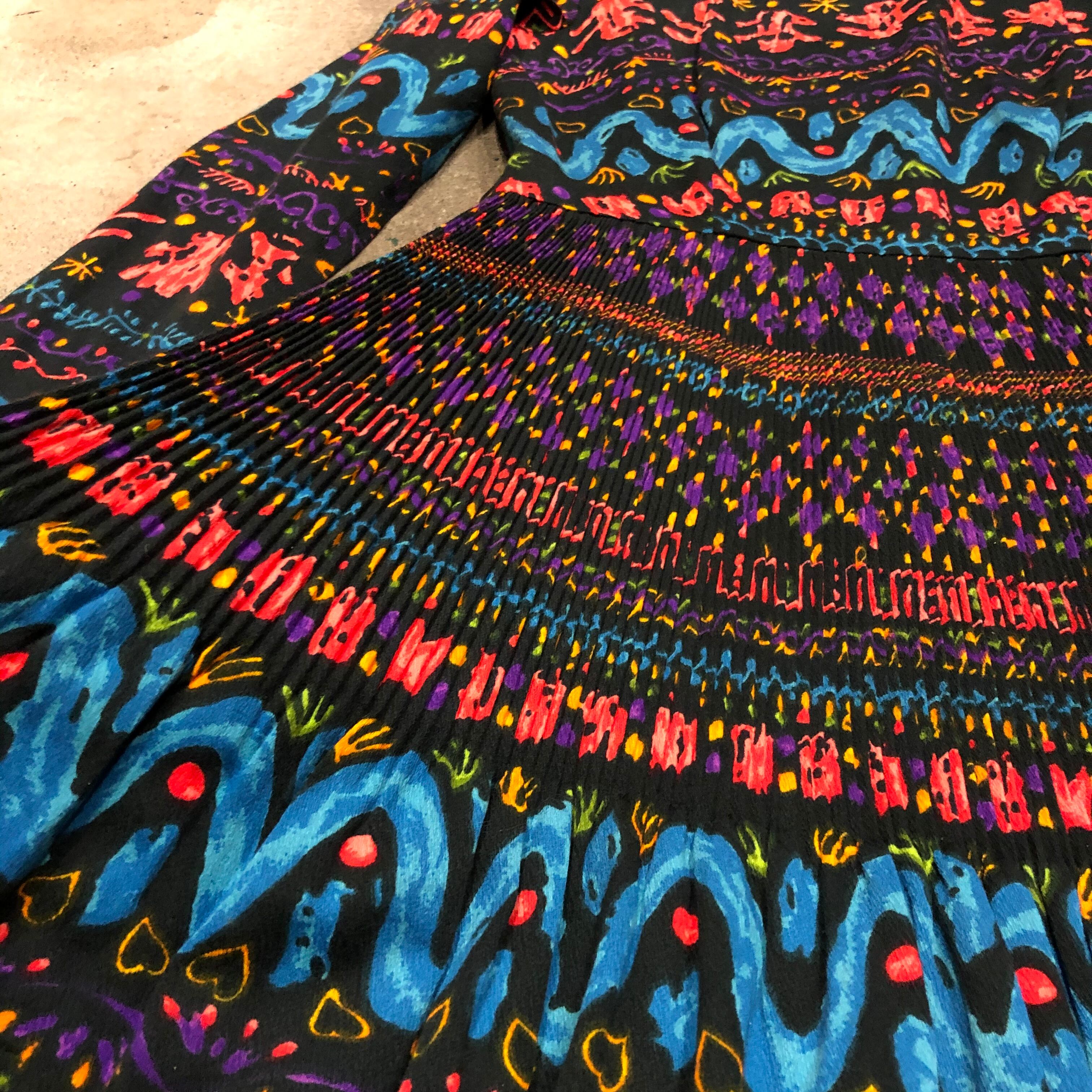 独特な総柄、色合いも魅力的なワンピースです。ウエスト部分から30cmほどかなり細かいプリーツになっていたり珍しい形もポイントです。きれいなシルエットなので、ドレスコードのあるような場所にも着ていけそうな雰囲気です。