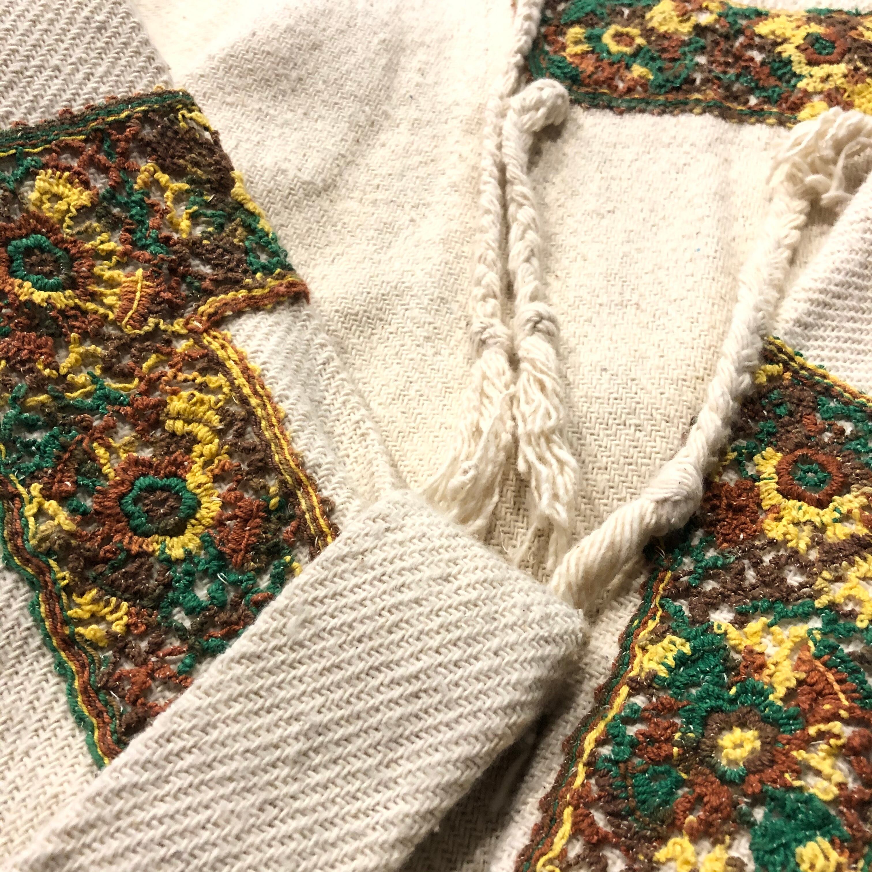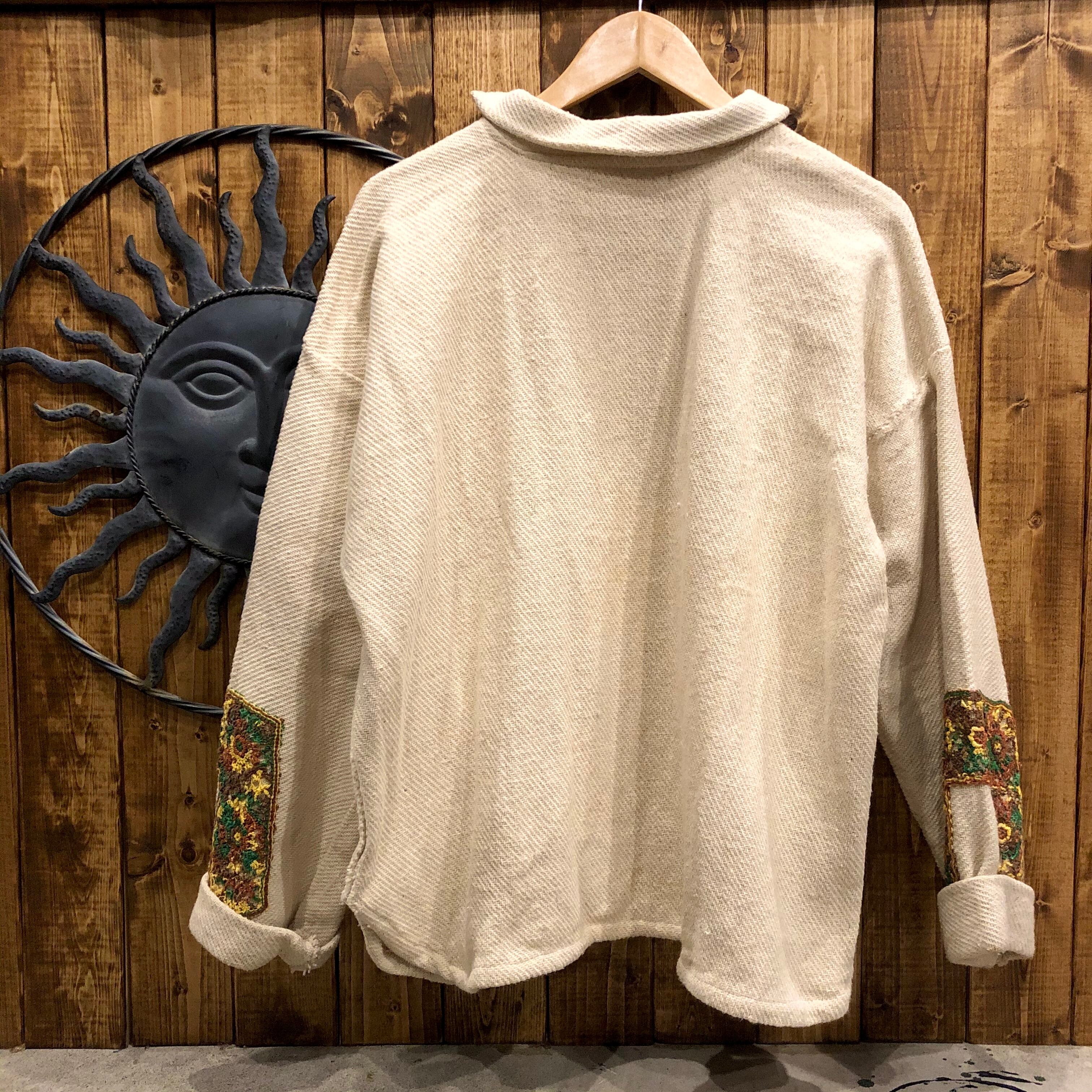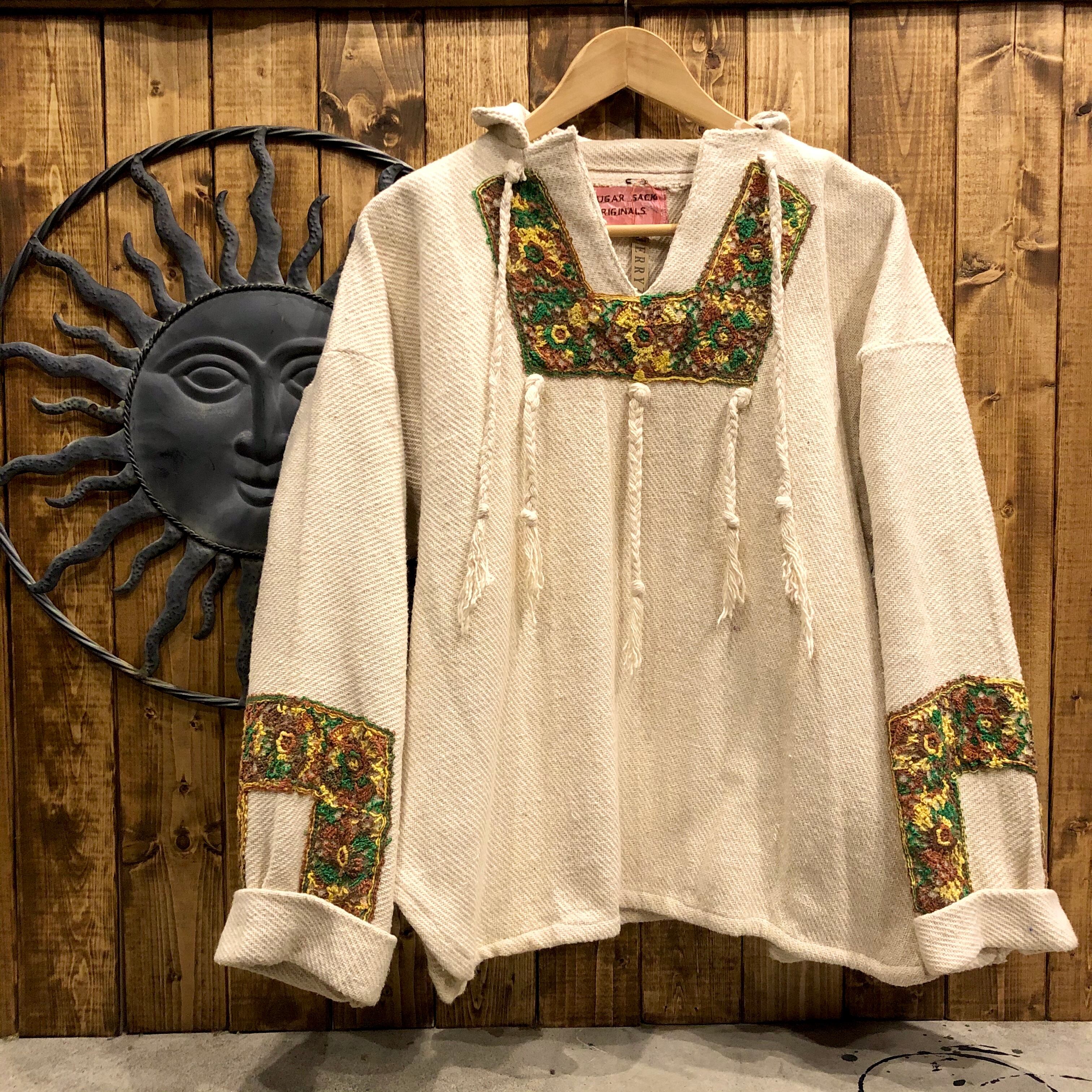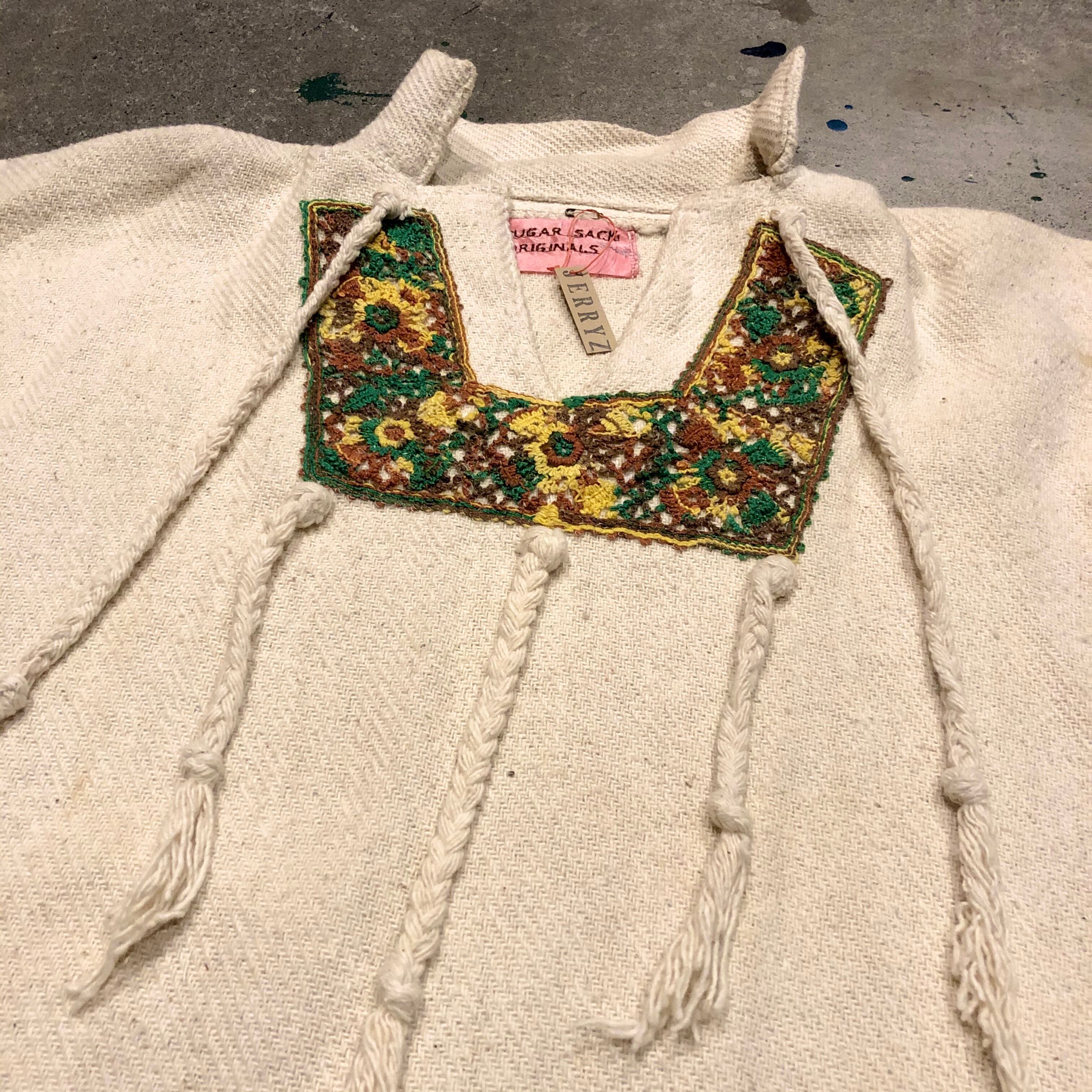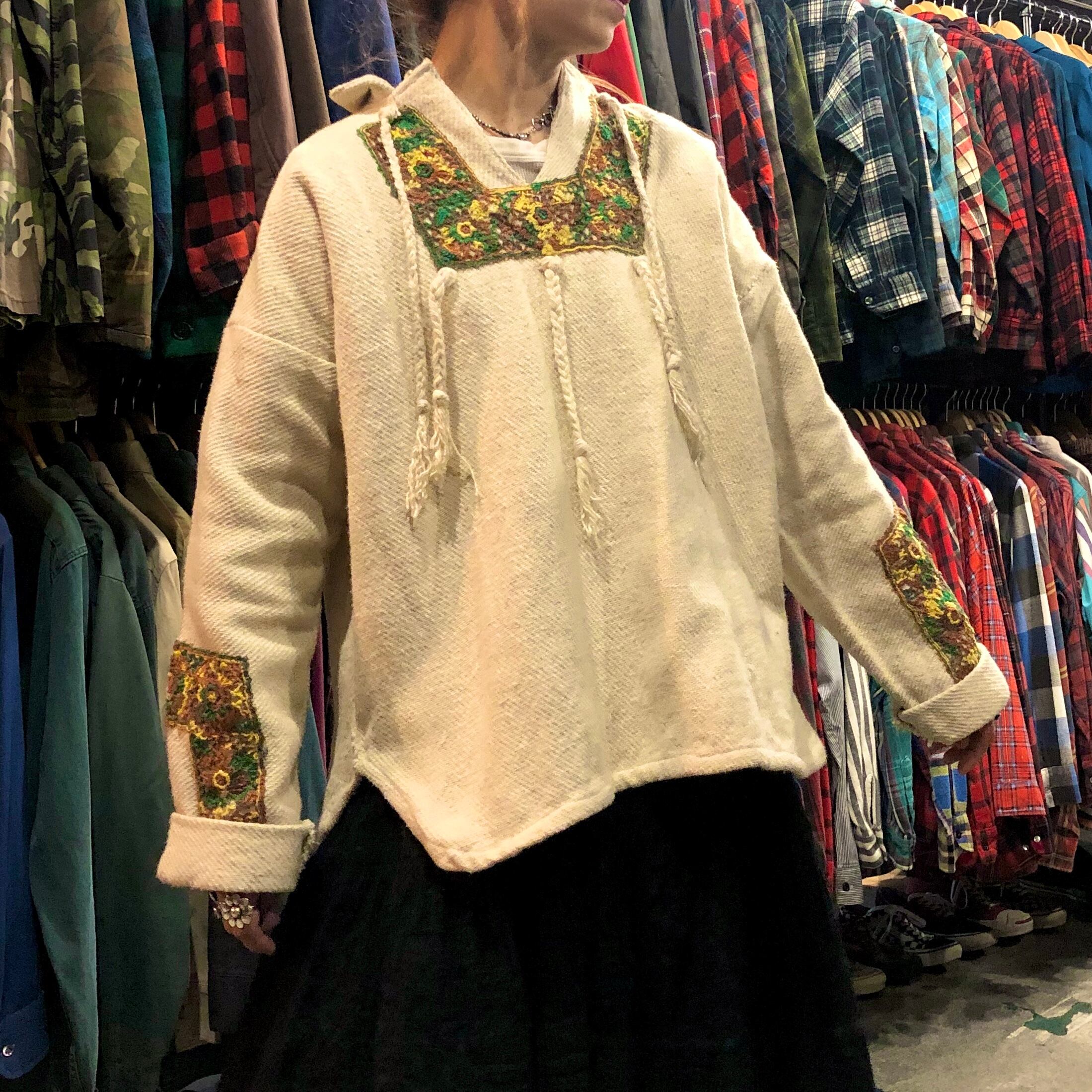 メキシカンパーカーをリメイクしたと思われるトップスです。三つ編みの紐やレースモチーフがつけてあり、個性的な印象になっています。大きめですが、裾両サイドがスリットになっていてバランス良く着れます。