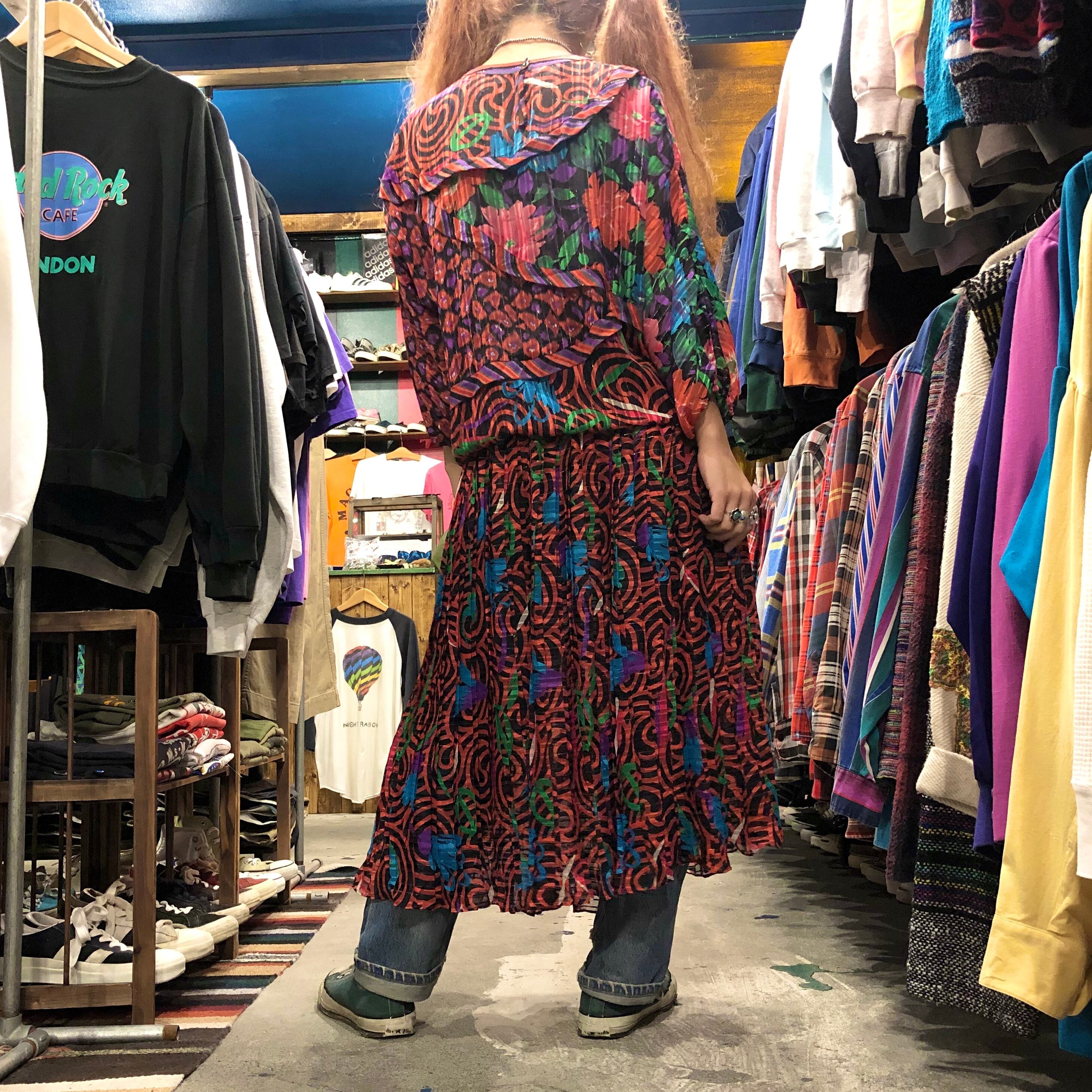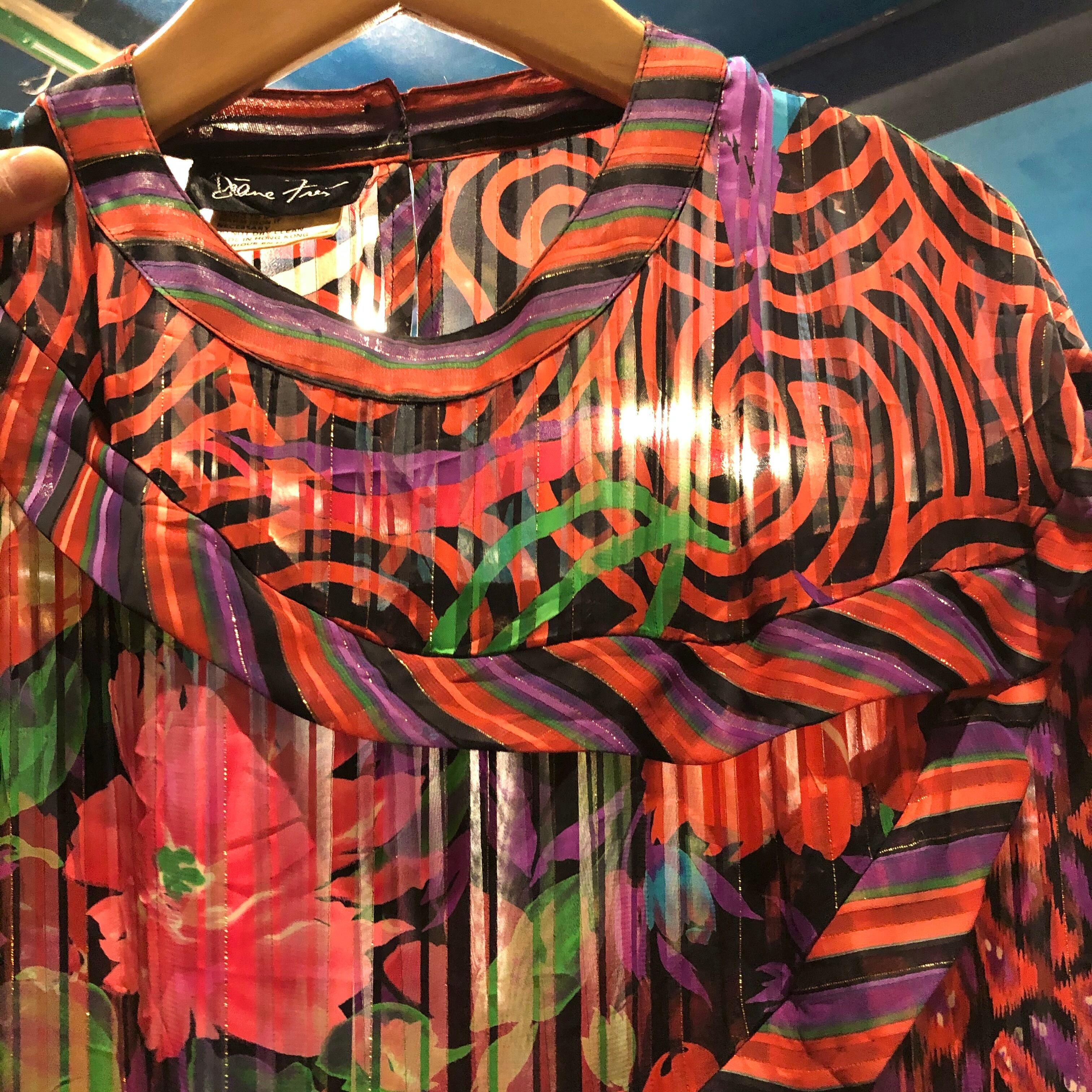 キラキラの糸やスケスケの素材が大人っぽいダイアンフレイスのワンピースです。柄の切り替えやヨークの切り替えか個性的な印象です。パーティーなど華やかな場所にも活躍しそうです。