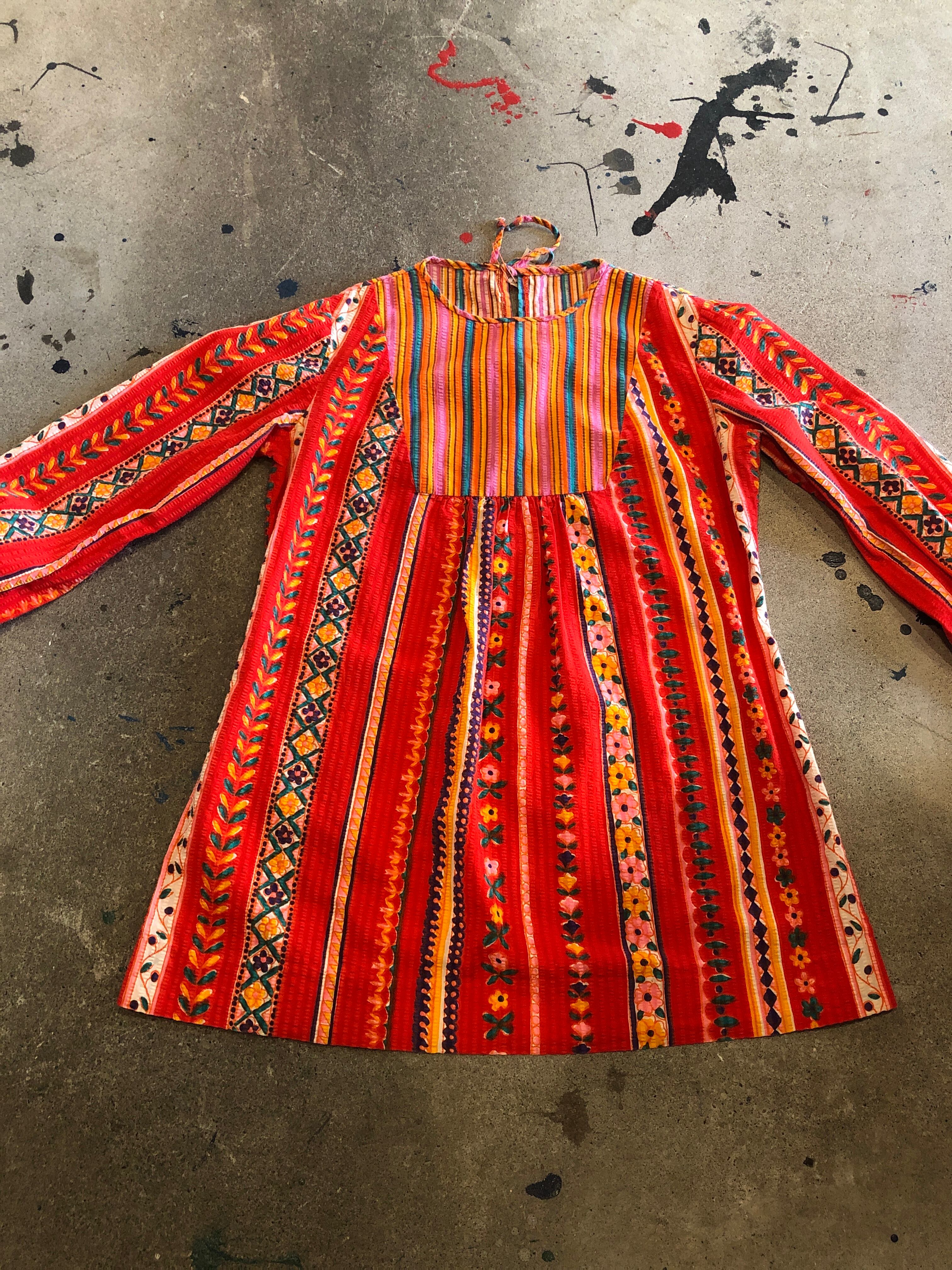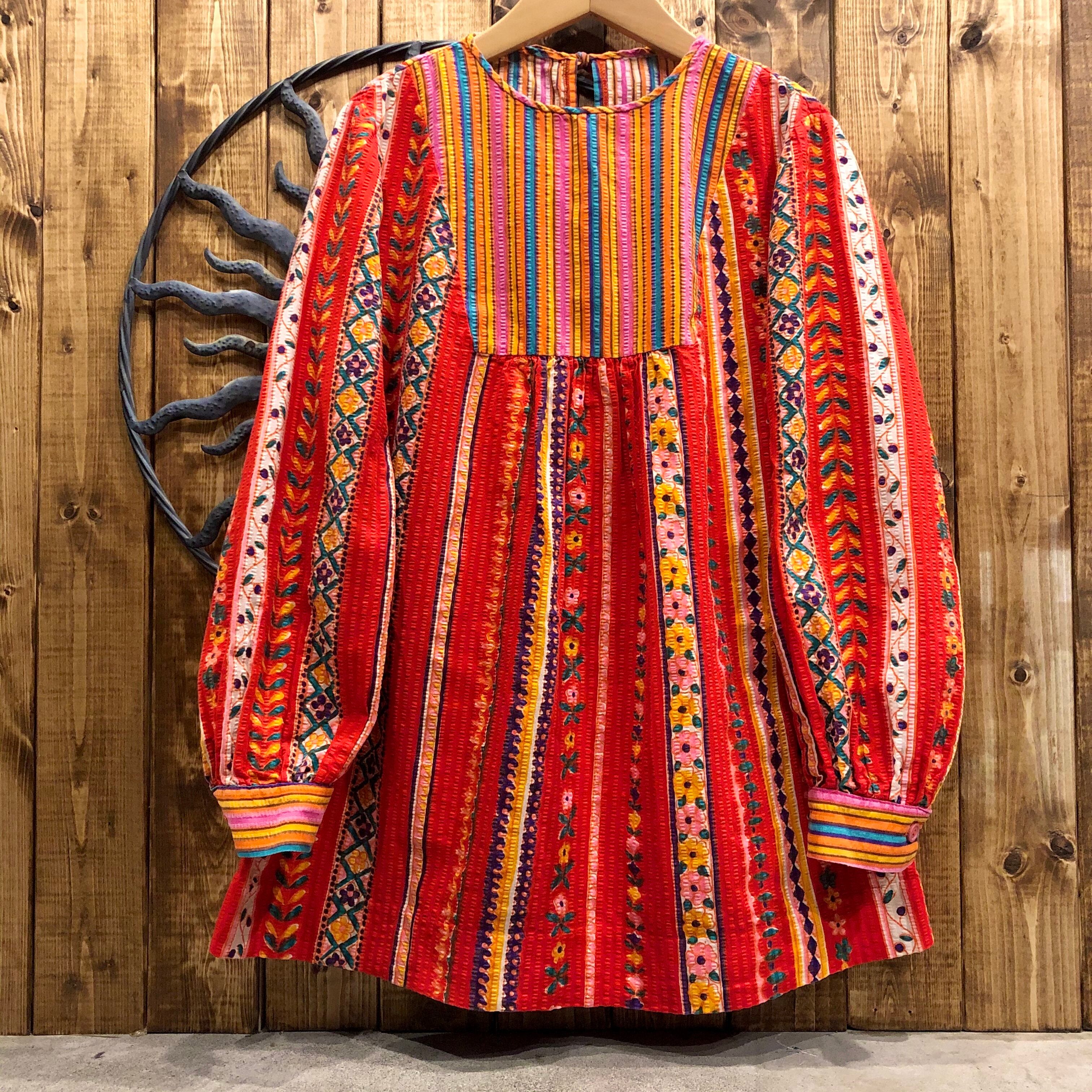 カラフルなストライプとチロリアン風の花柄の切り替えがとてもかわいいブラウスです。Aラインのシルエットや、後ろでリボン結びする仕様も女性らしい一着です。