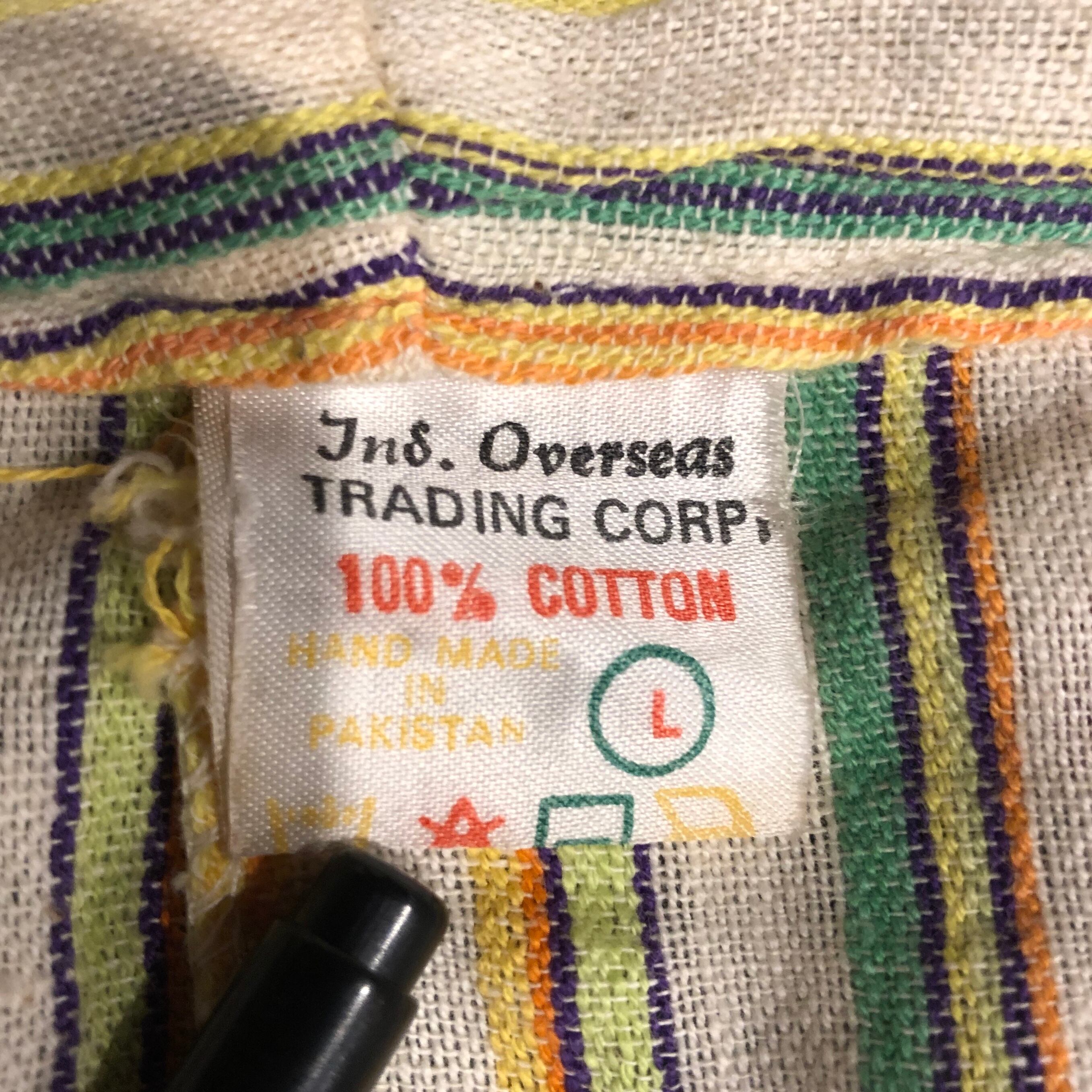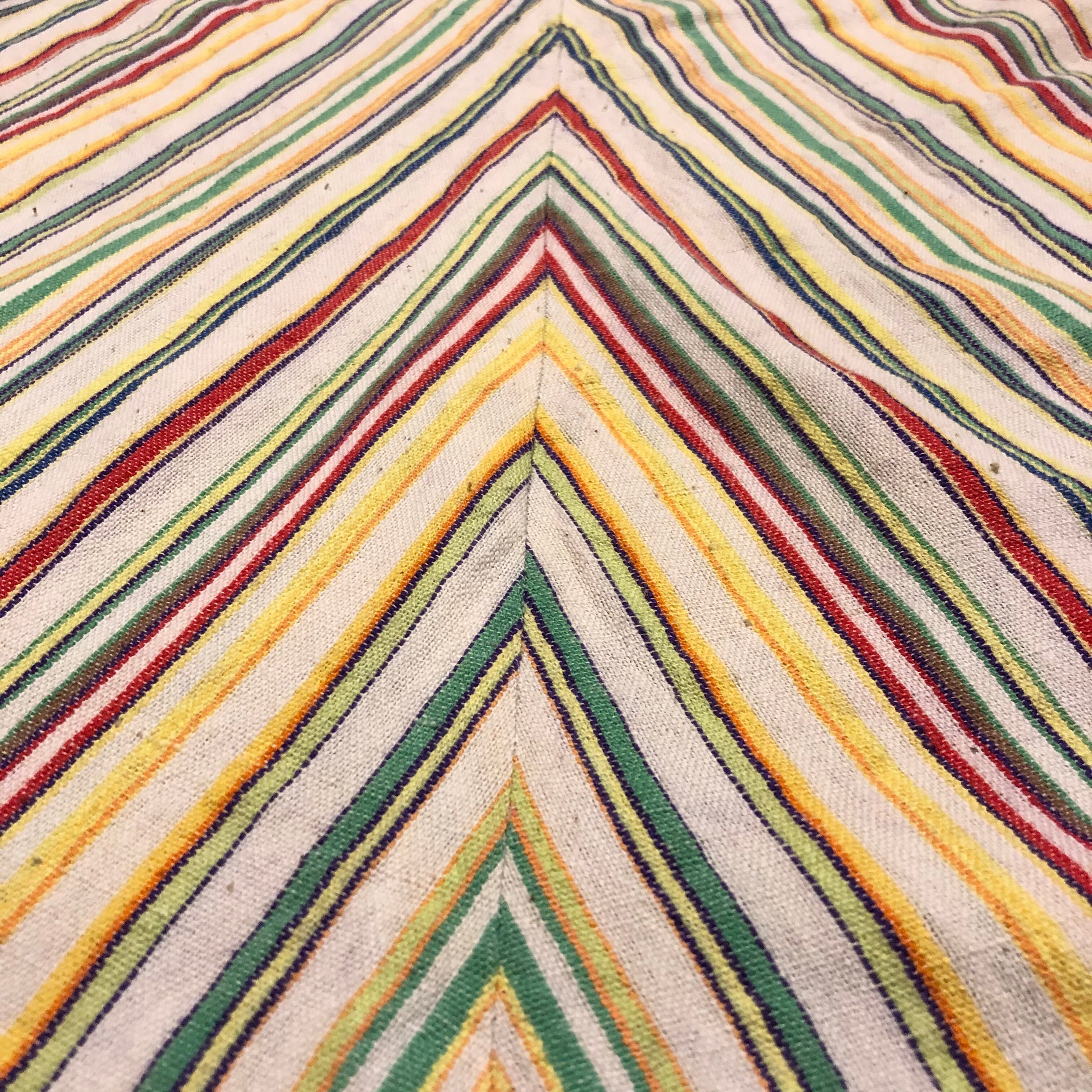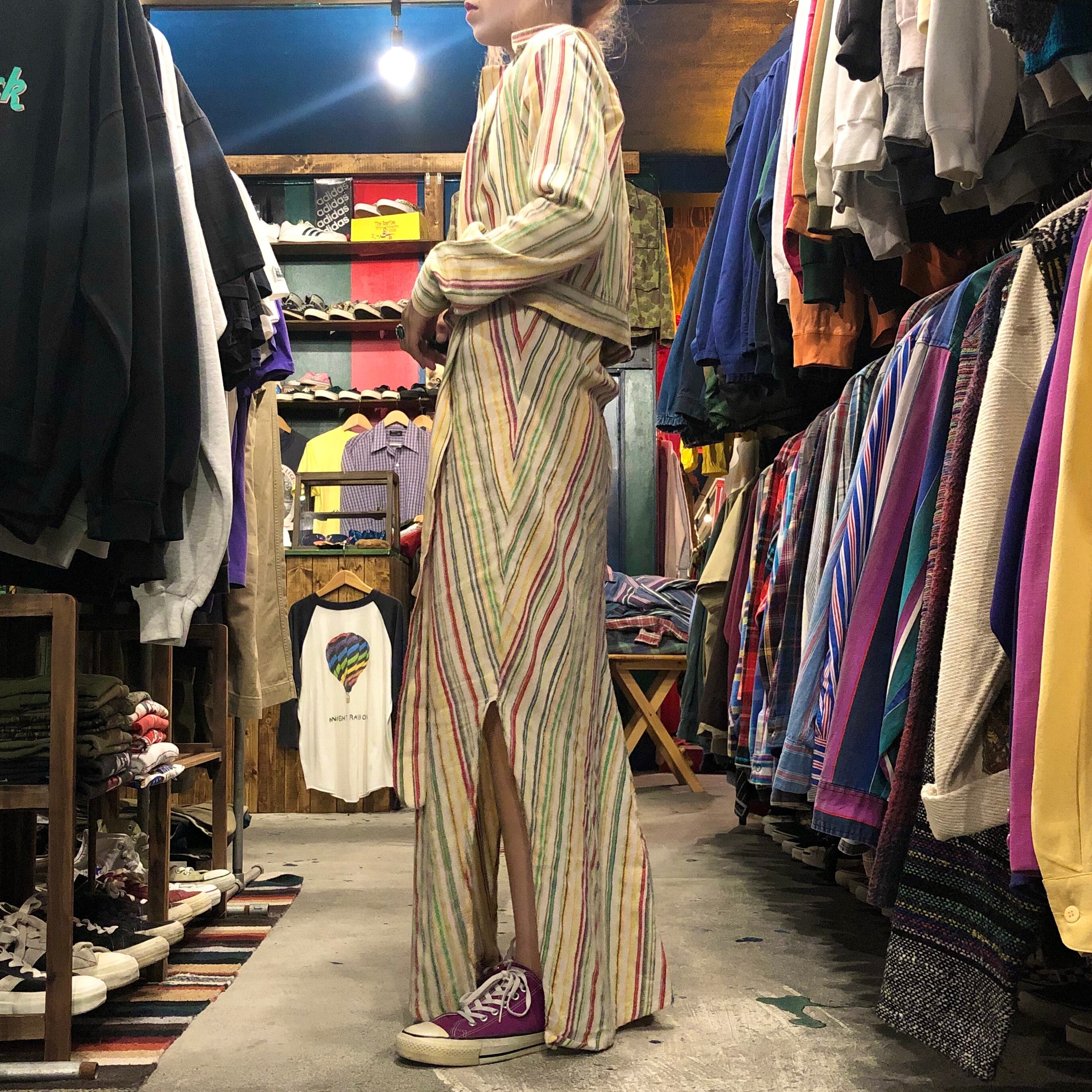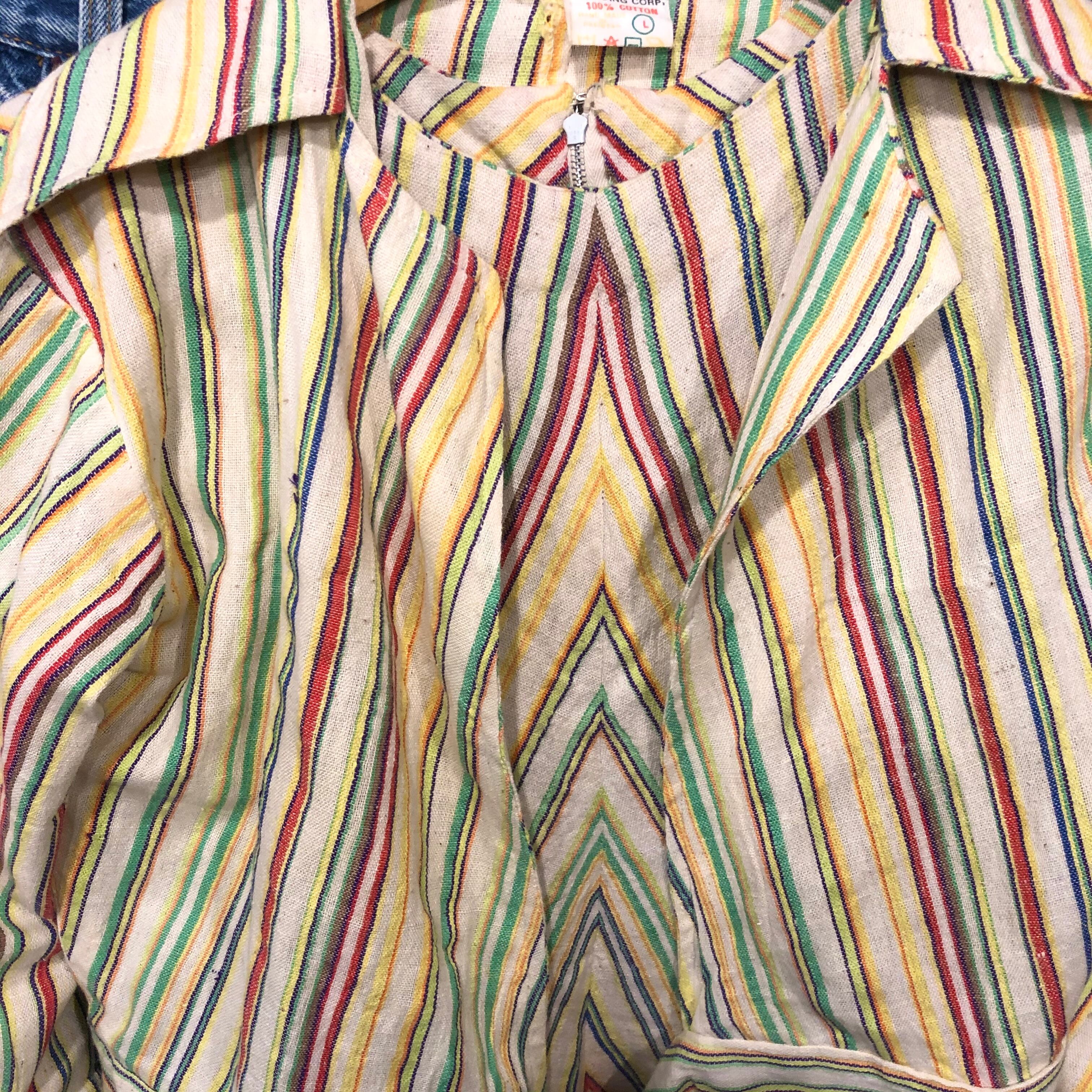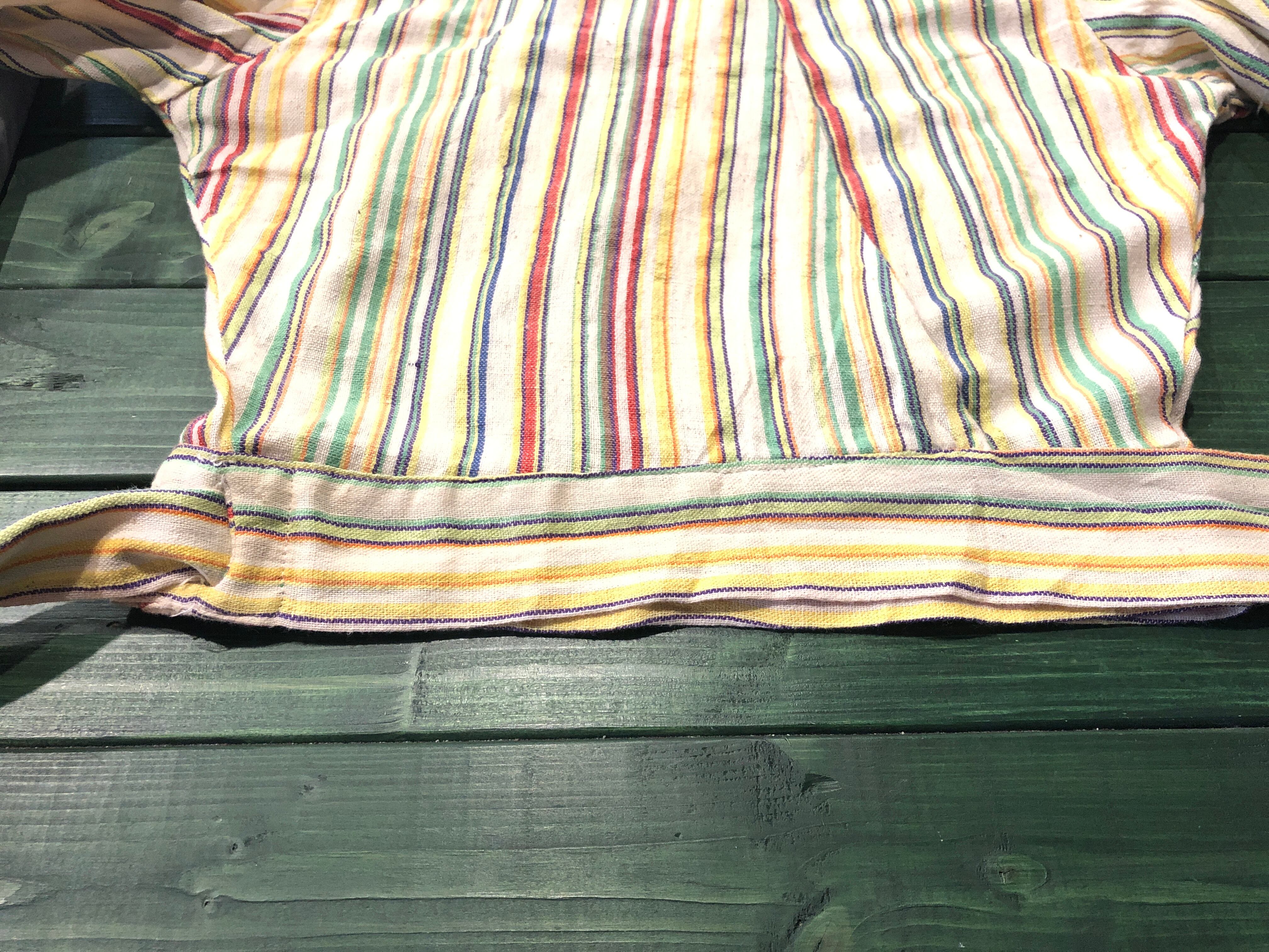 パキスタン製ハンドメイドの柔らかいリネンのような肌触りのコットンと、大人っぽいシルエット、ハッピーなストライプ柄がとっても素敵なセットアップです。別々でももちろん使いまわせそうです。ジャケットの方の紐は巻きスカートのような仕組みでお使い頂く仕様ですが、そのまま垂らして着るのもかわいいです!