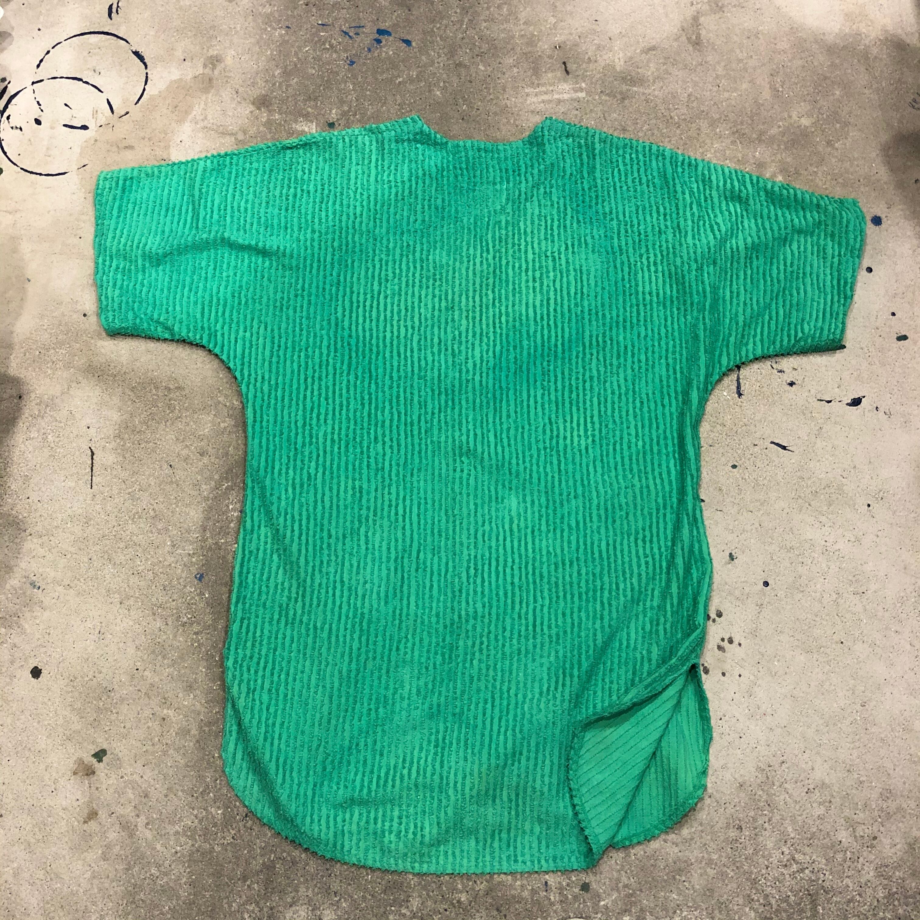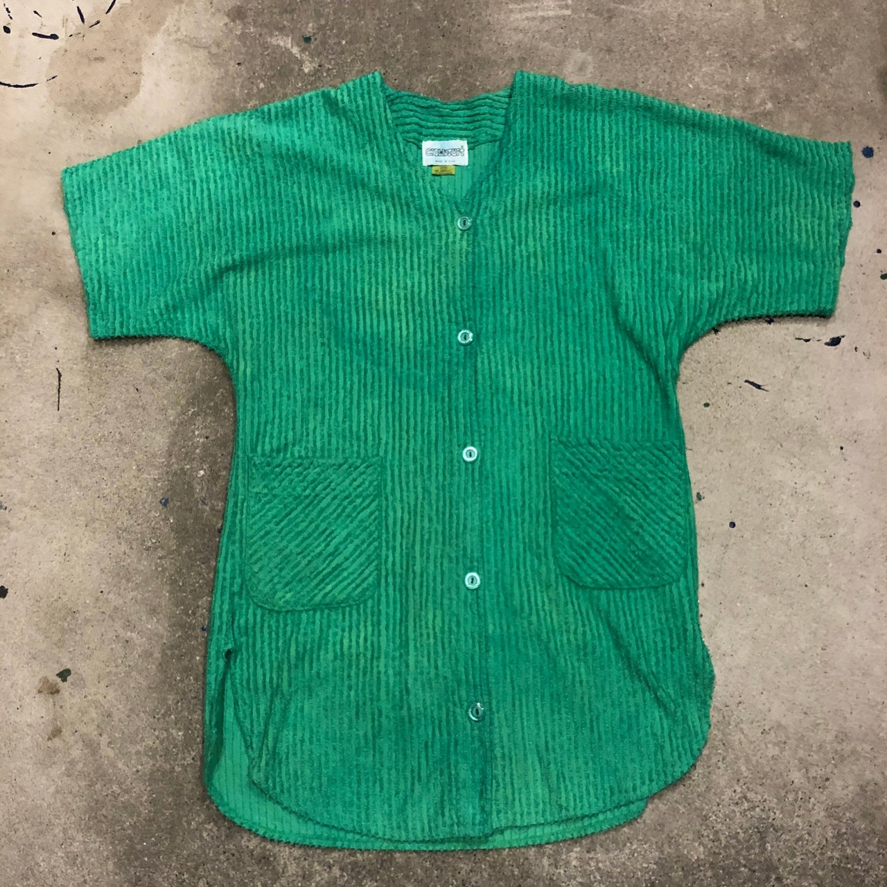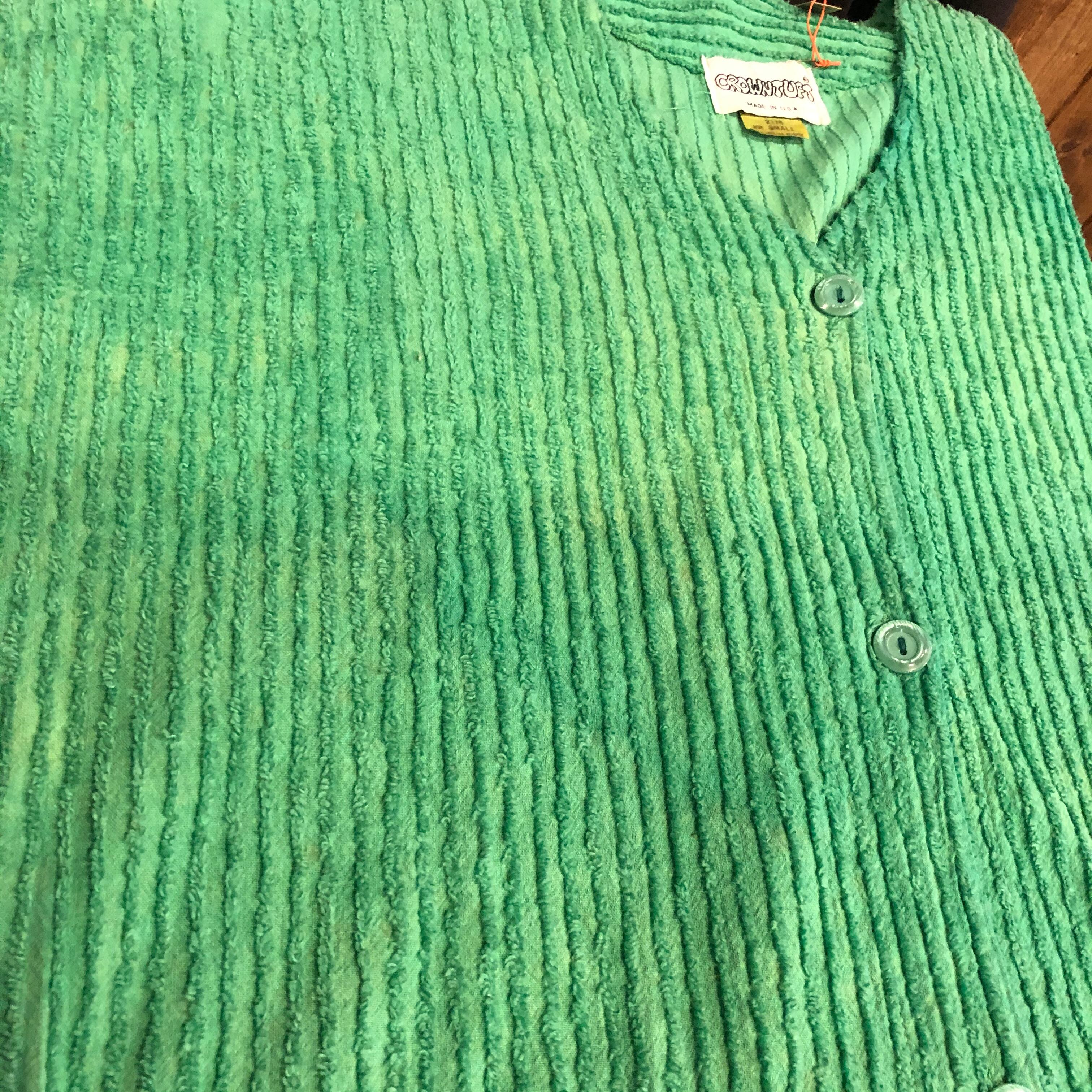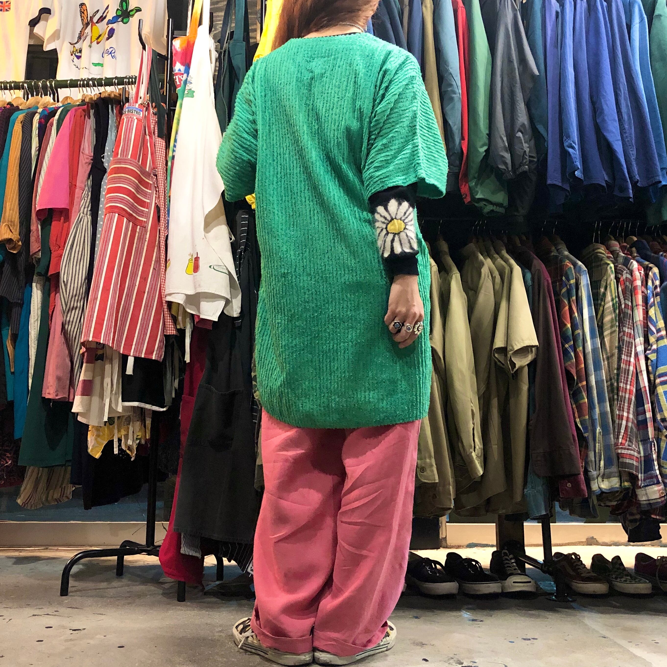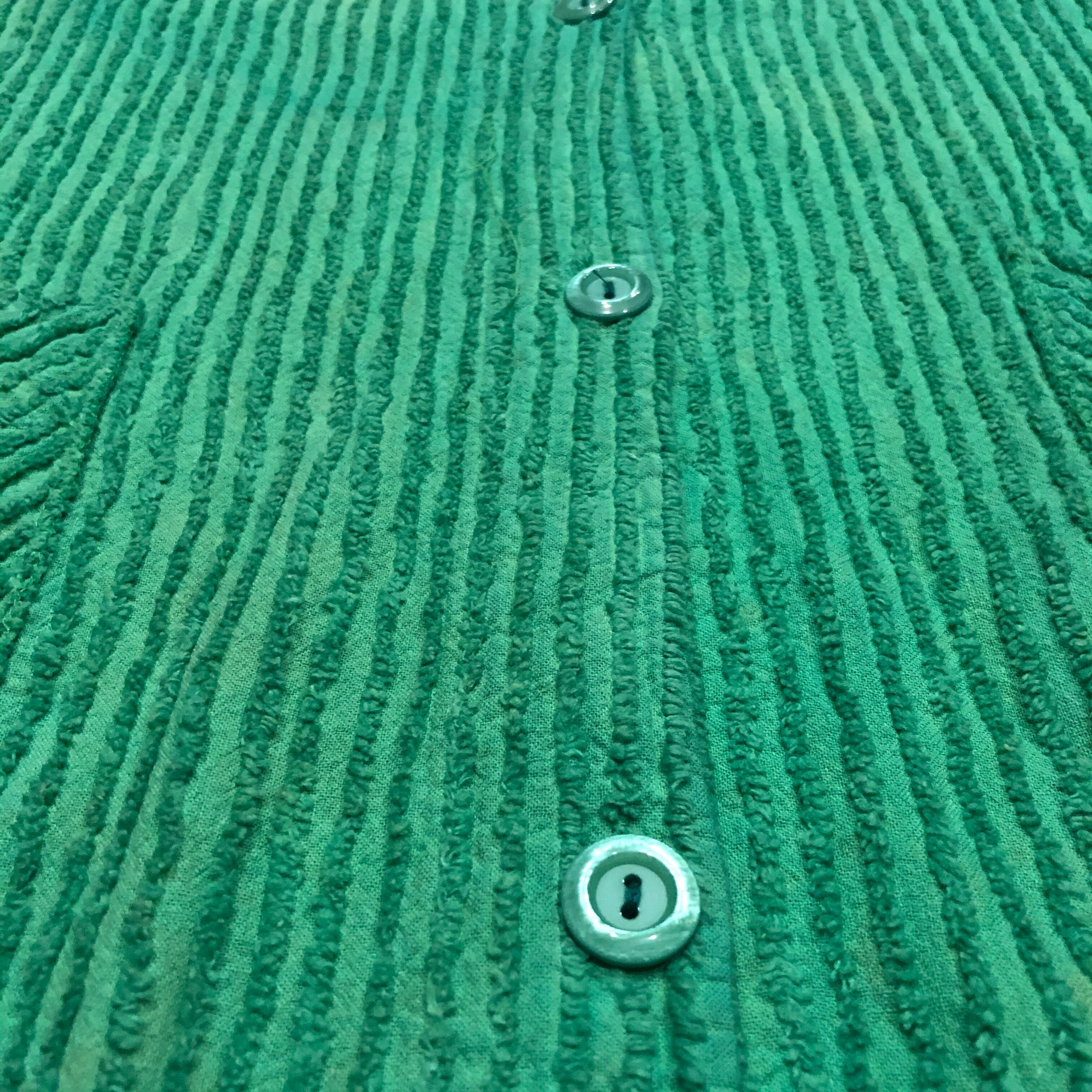 春らしい鮮やかな緑のトップスです。細かいシェニール織が立体的でかわいいです!日焼けしている箇所がたくさんあり色むらがある感じになっていて、野菜みたいで私はとても好きです。