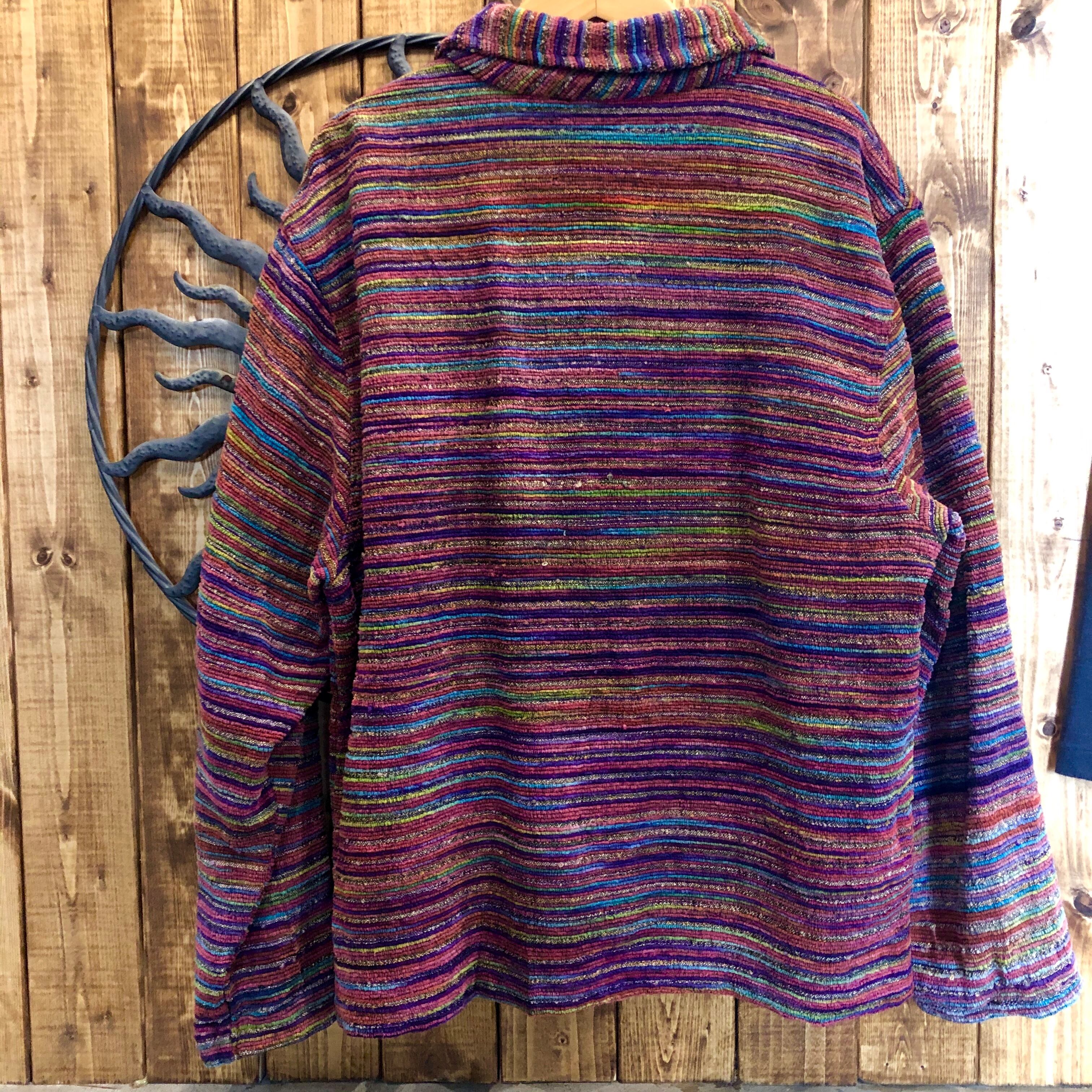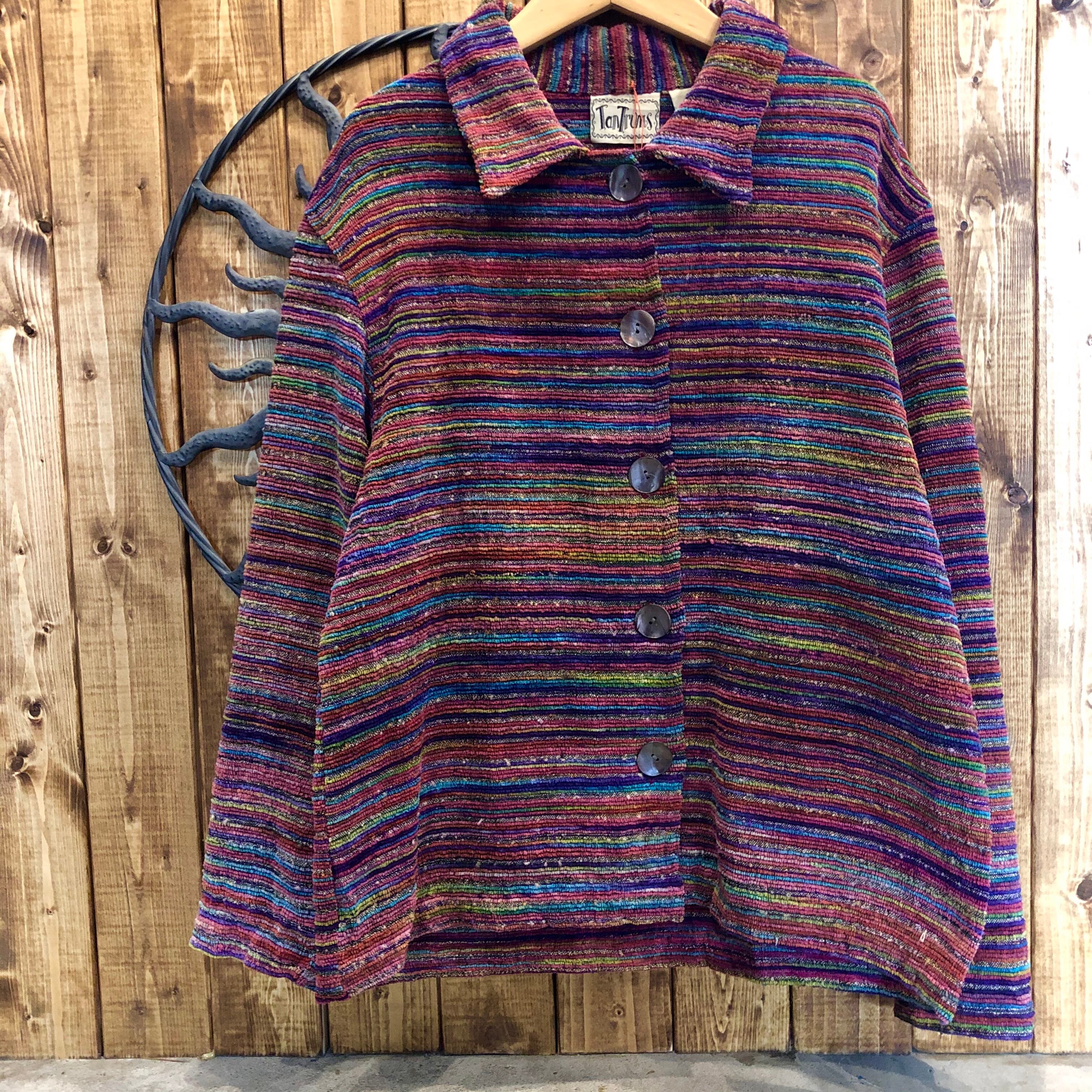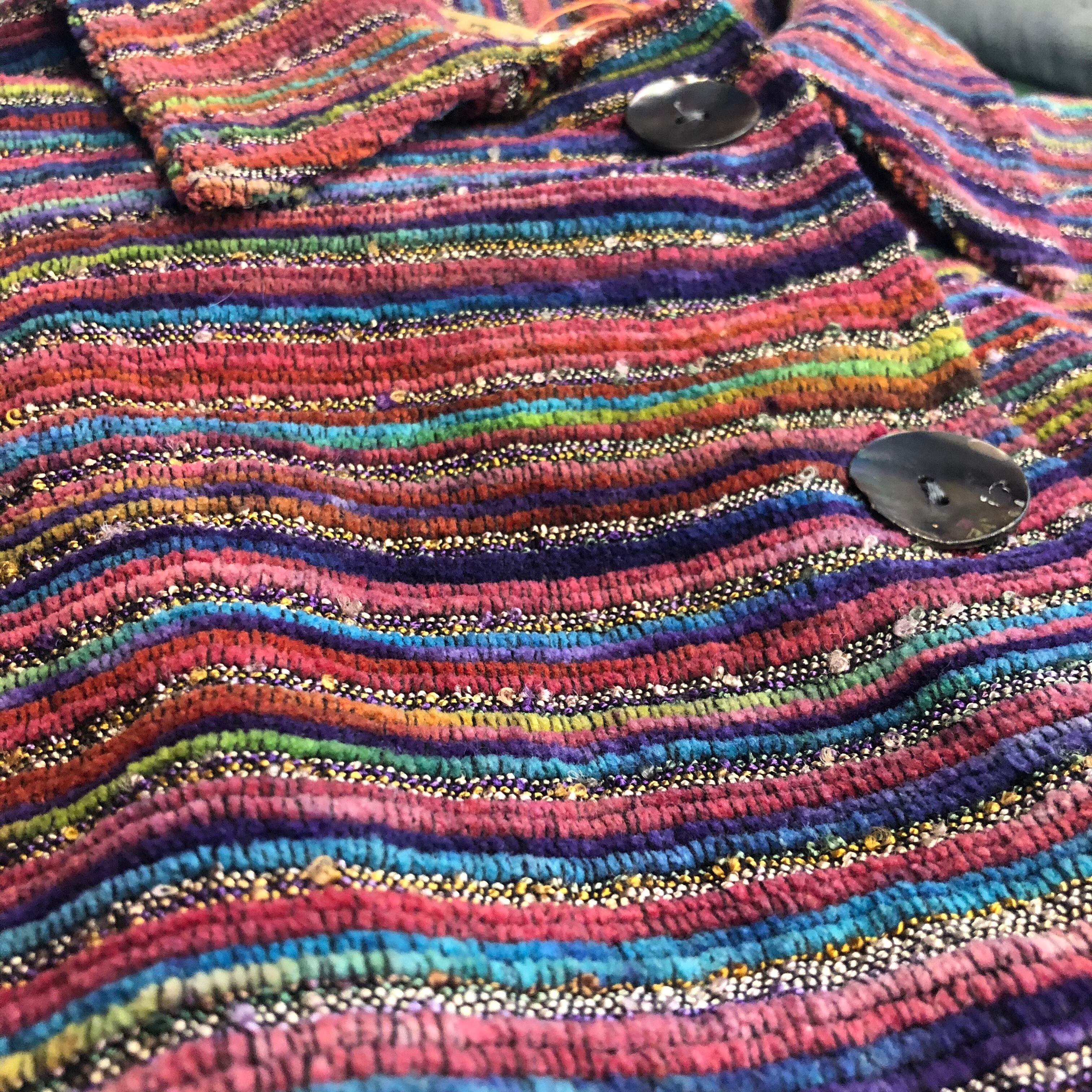 カラフルでぽこぽこ立体的な生地がとっても素敵なジャケットです。大きな貝ボタンも雰囲気があってかわいいです。
