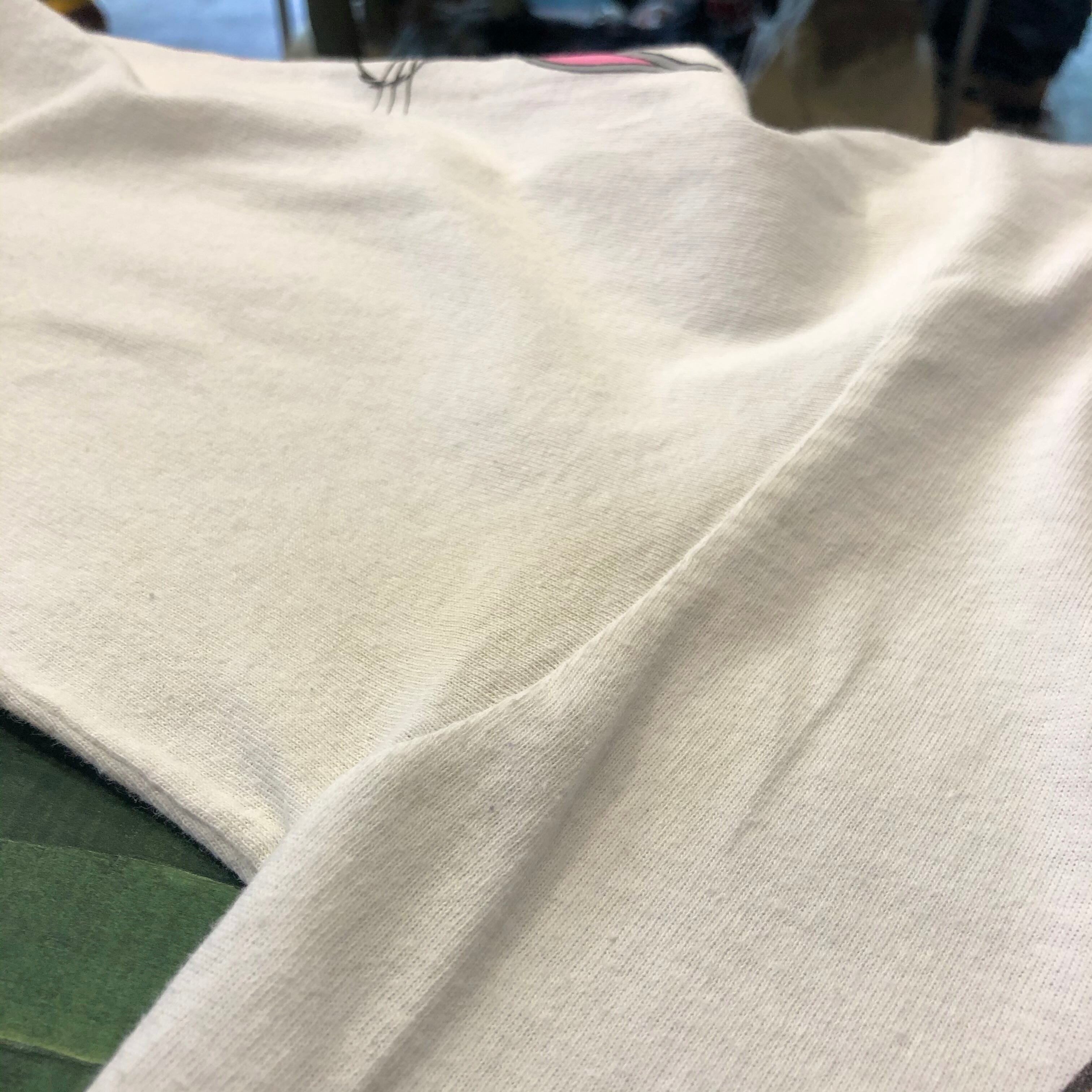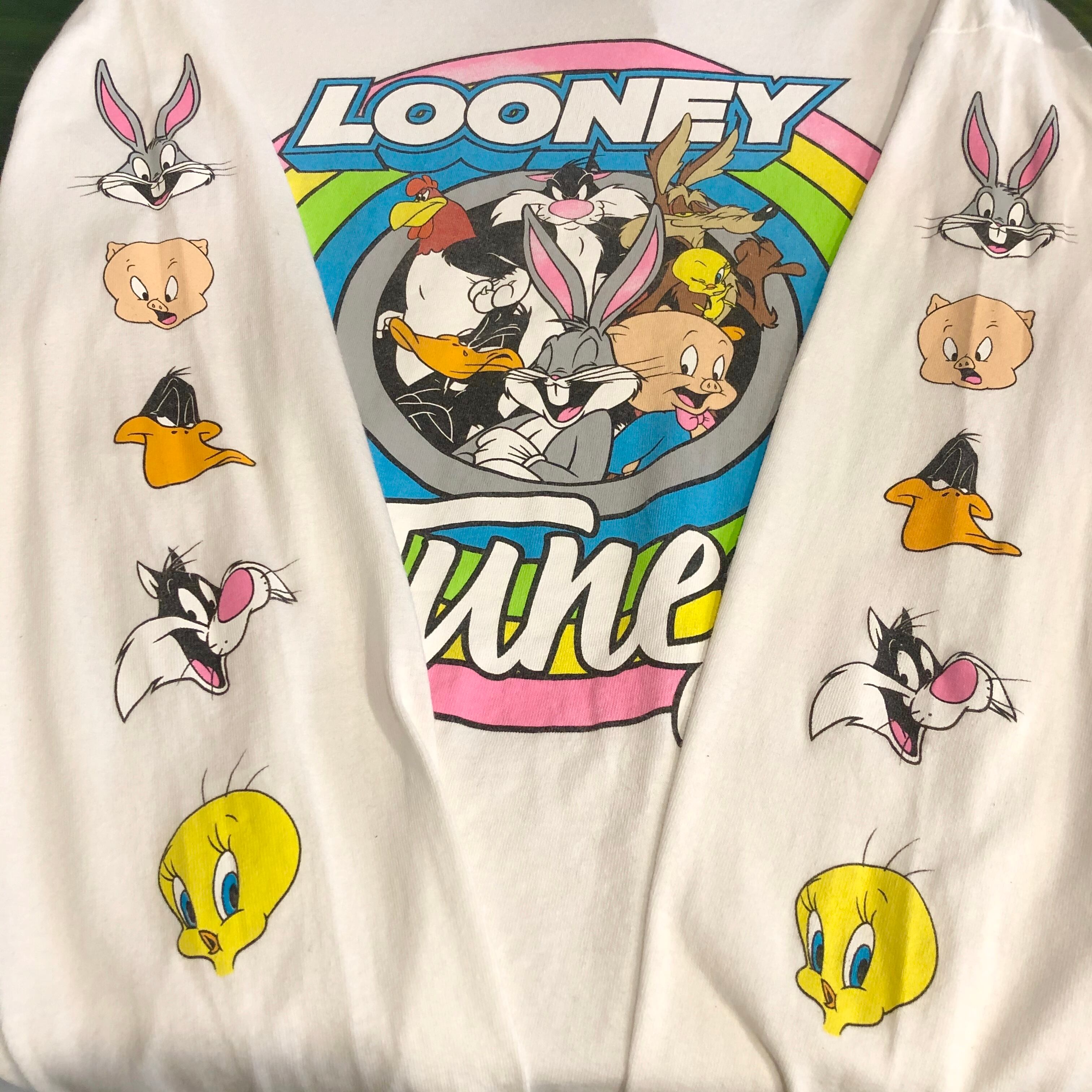 両袖のキャラクター達がかわいすぎるロンTです。シンプルにデニムショーツスニーカーキャップった感じに合わせるとポップで可愛いと思います。男性が着ていたら、よりかわいいと思います!
