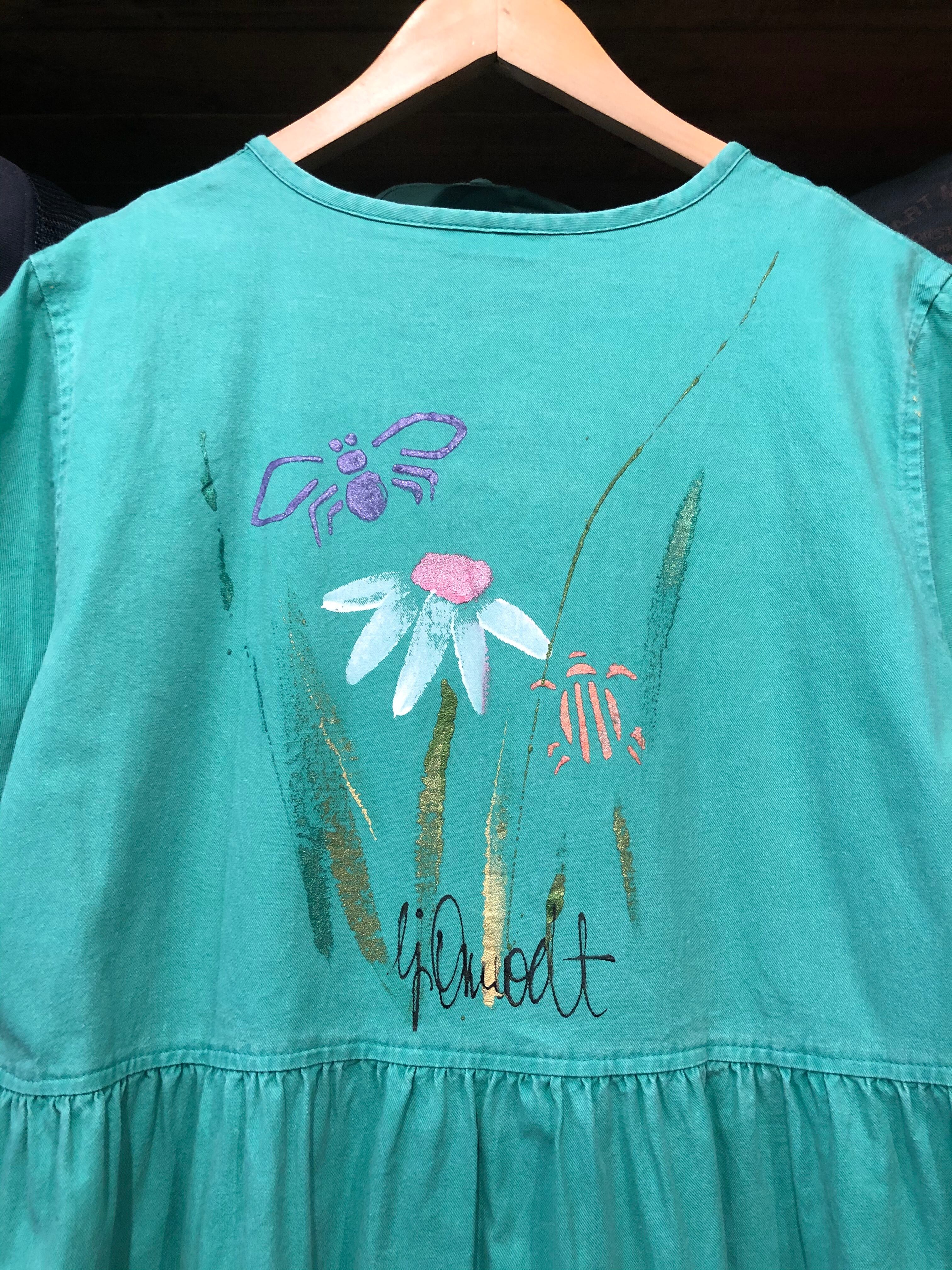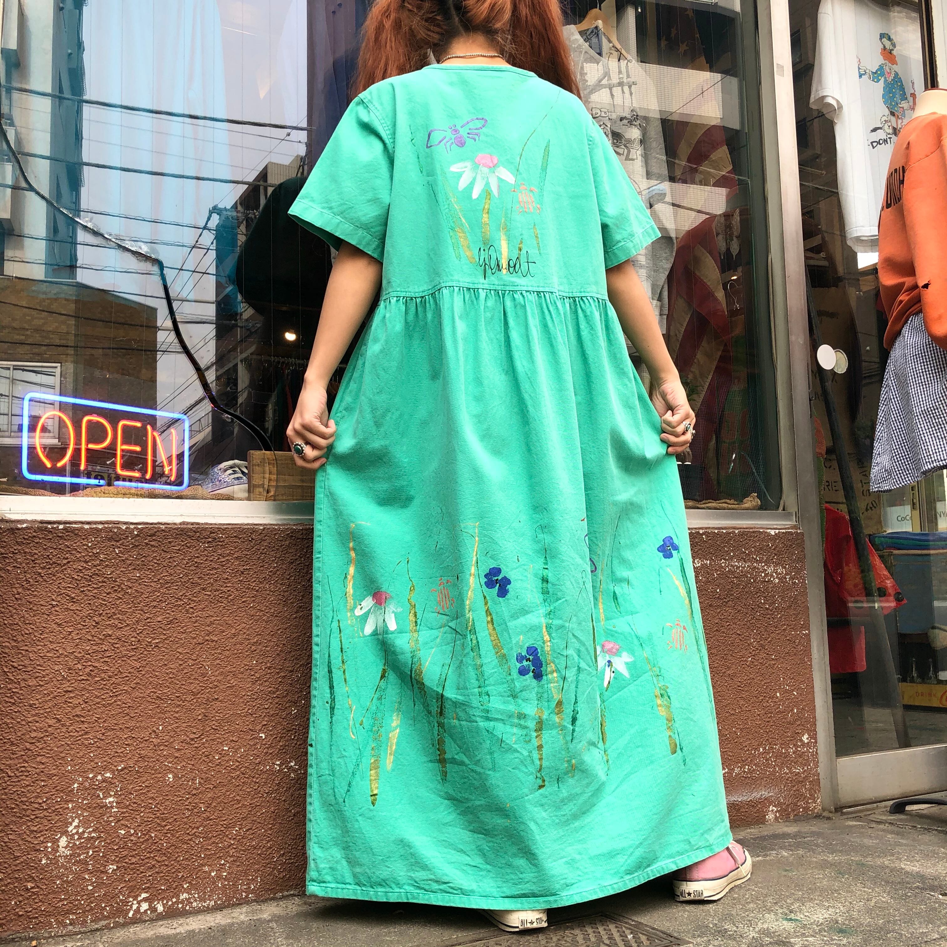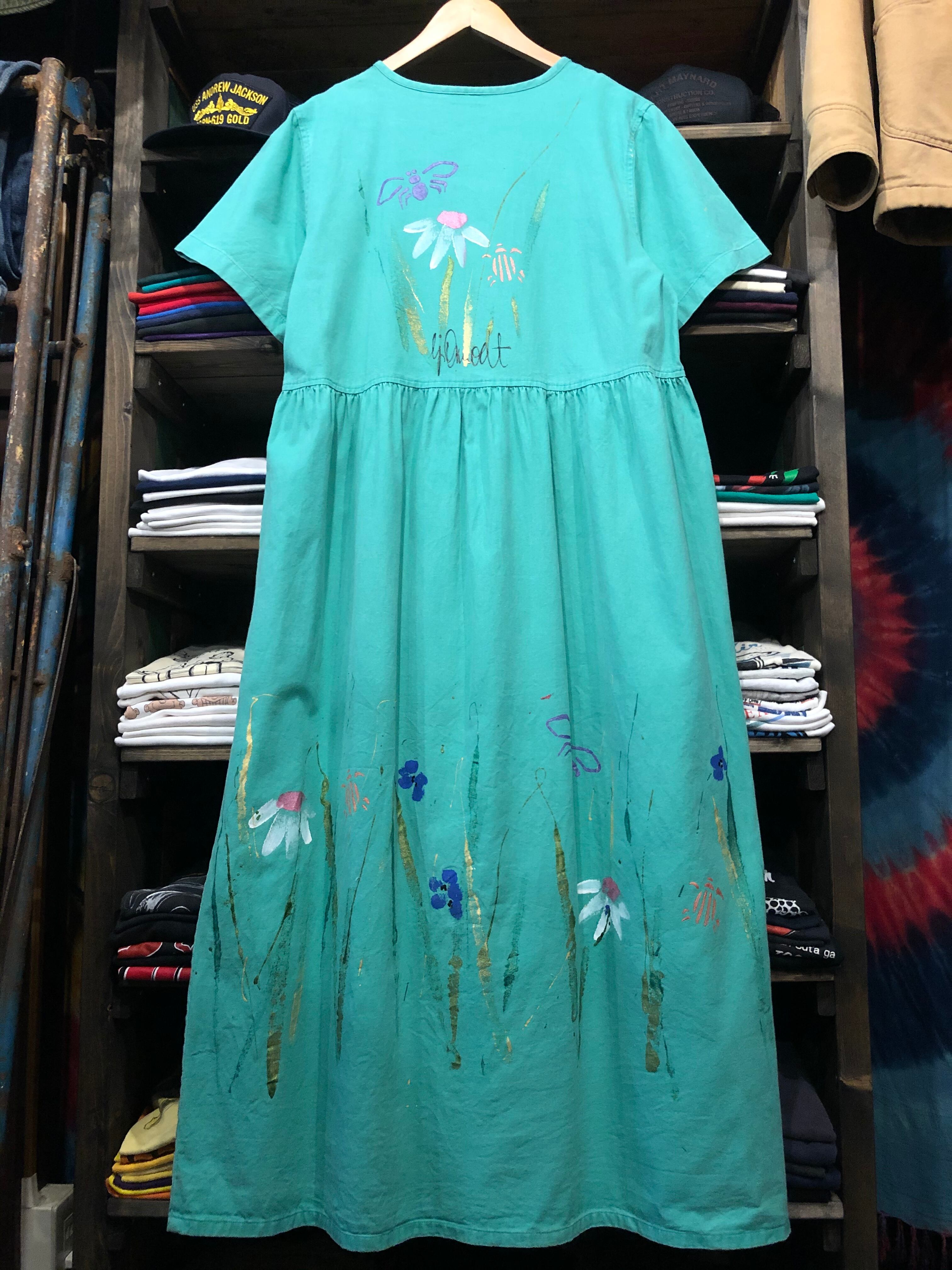 エメラルドグリーンがきれいな厚手のコットンにキラキラの絵の具でお花や虫が描かれているワンピースです。 大胆なペイントで迫力がありとてもかわいいです!