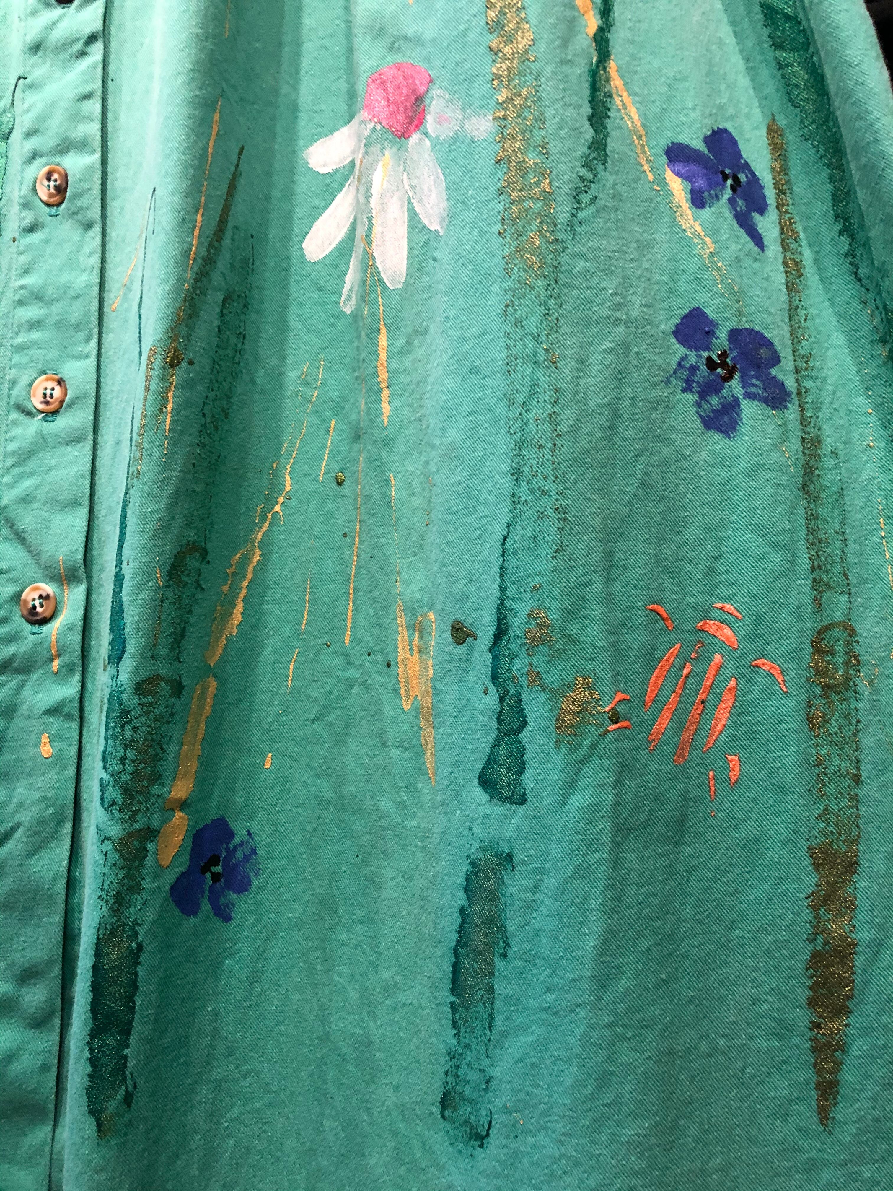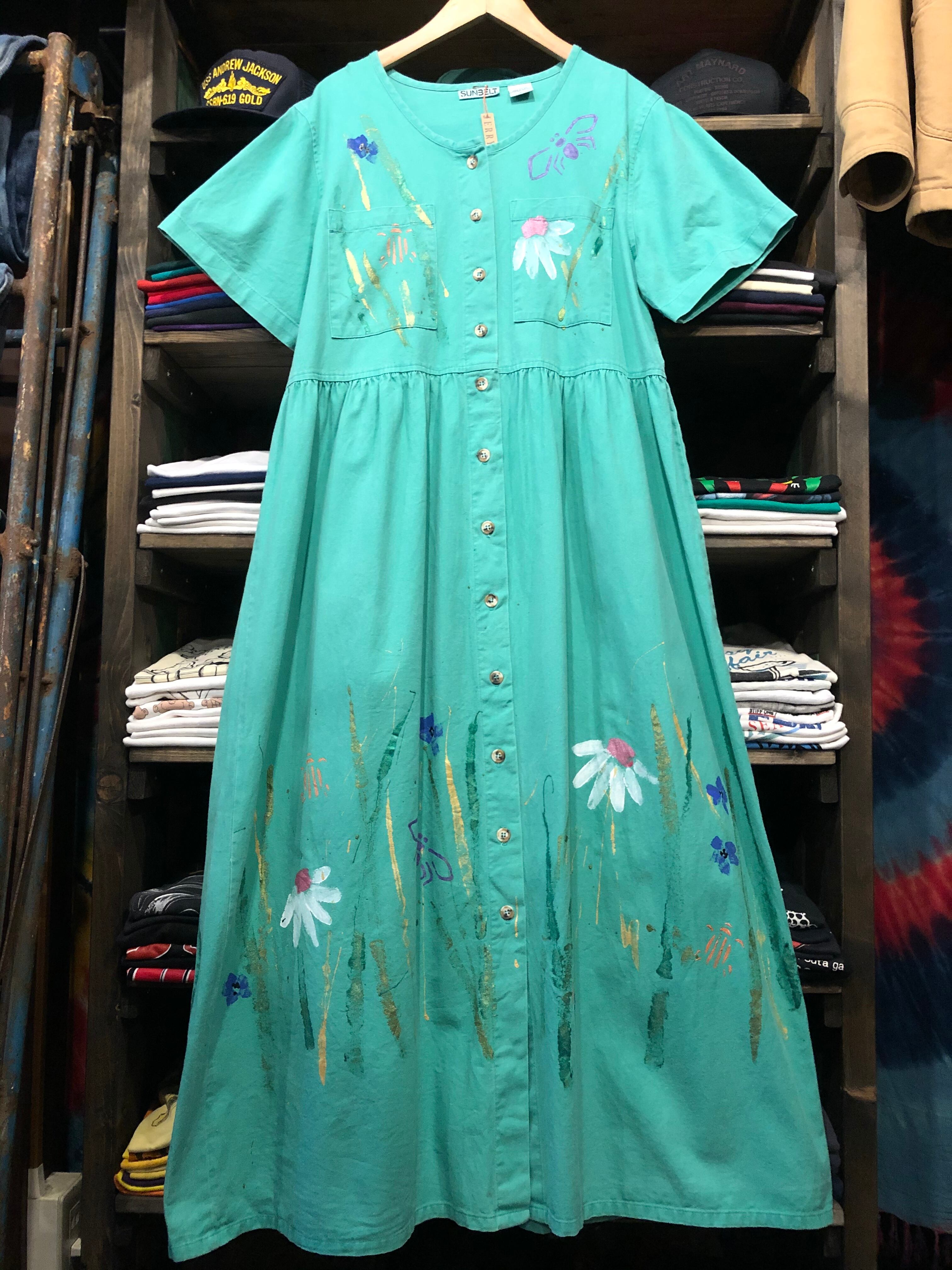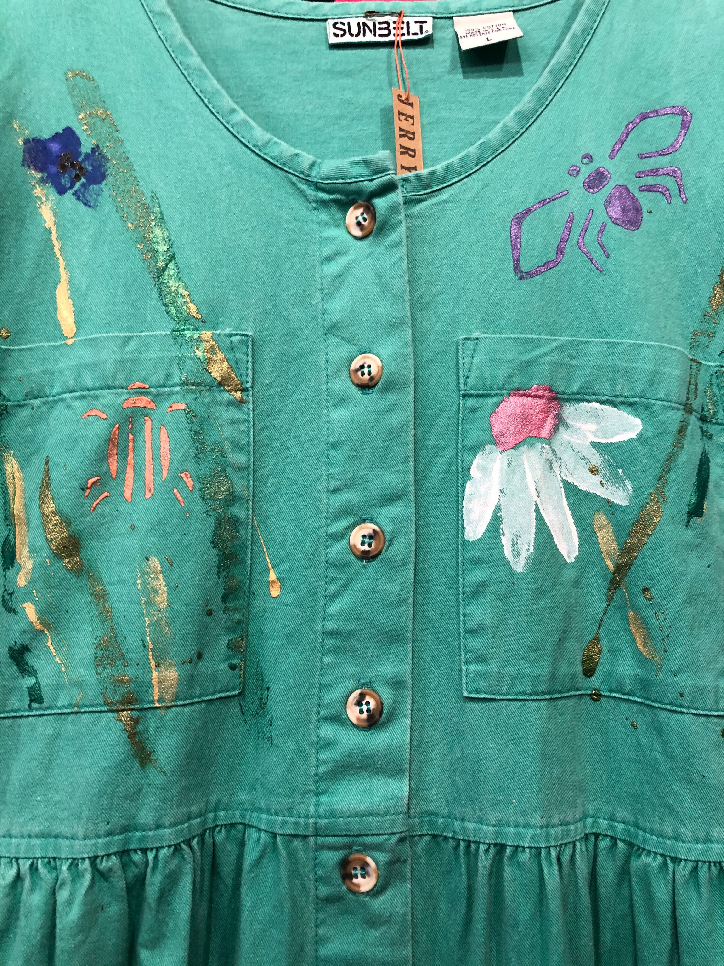 エメラルドグリーンがきれいな厚手のコットンにキラキラの絵の具でお花や虫が描かれているワンピースです。 大胆なペイントで迫力がありとてもかわいいです!