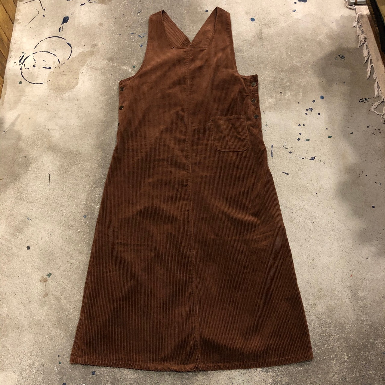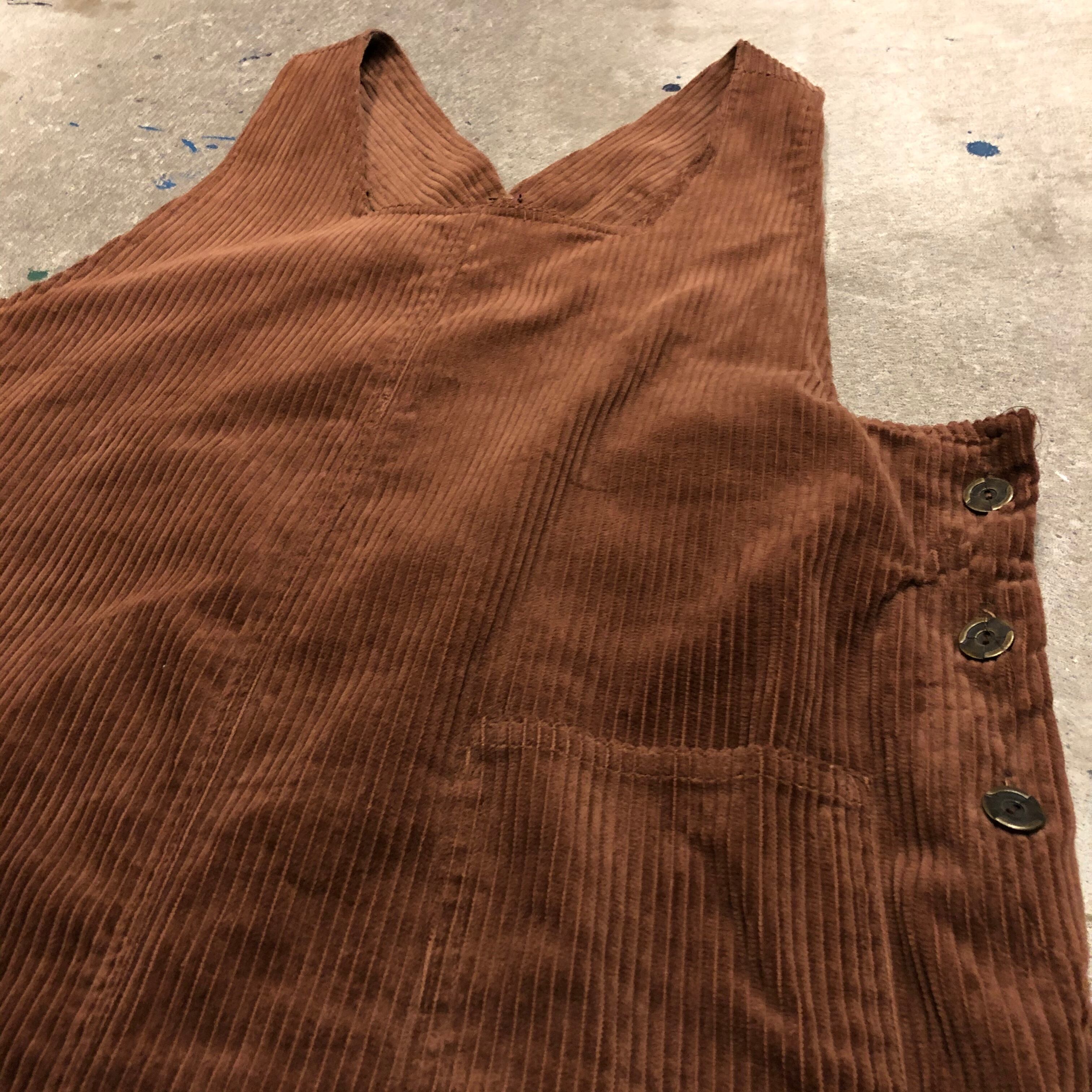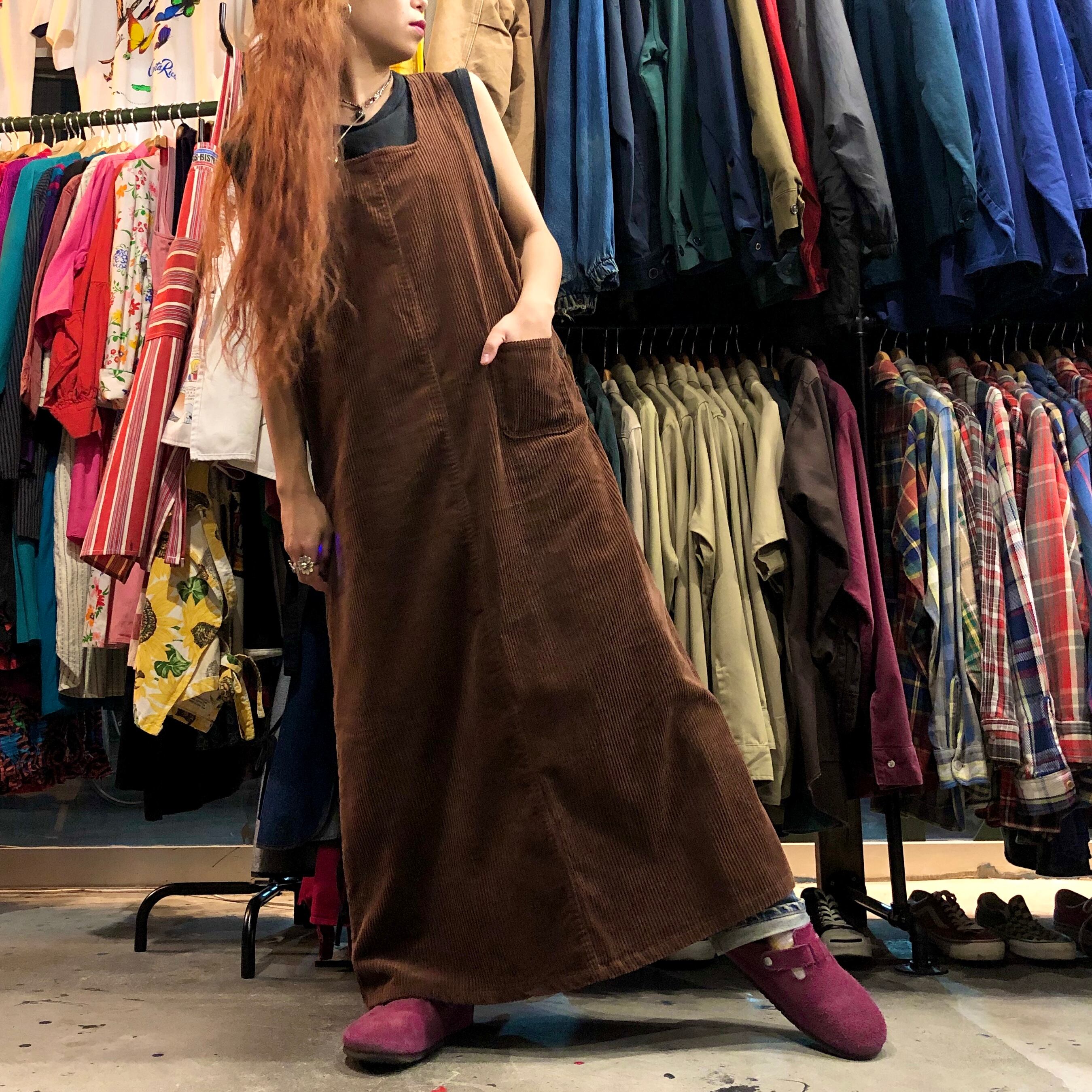 太畝コーデュロイのジャンパースカートです。茶色であまり広がりのないシルエットが大人っぽい印象です。素材的に秋冬のイメージの方が強いですが、ノースリーブを合わせて着るのが個人的におすすめです!
