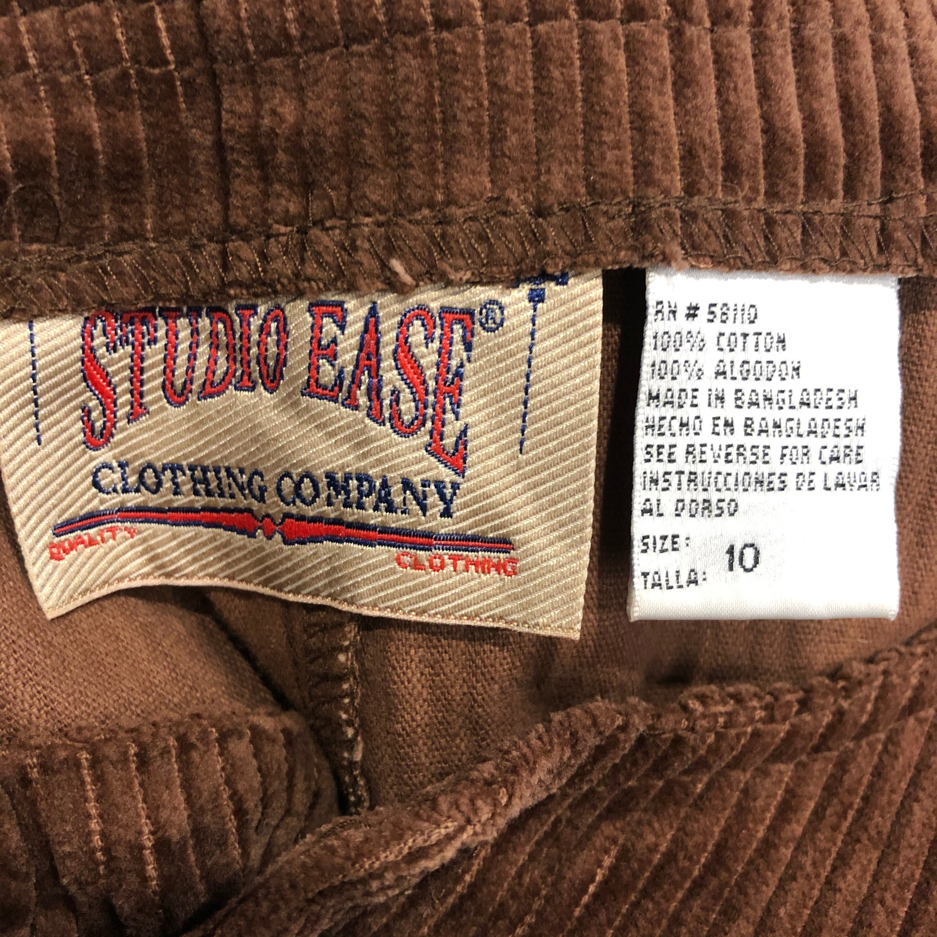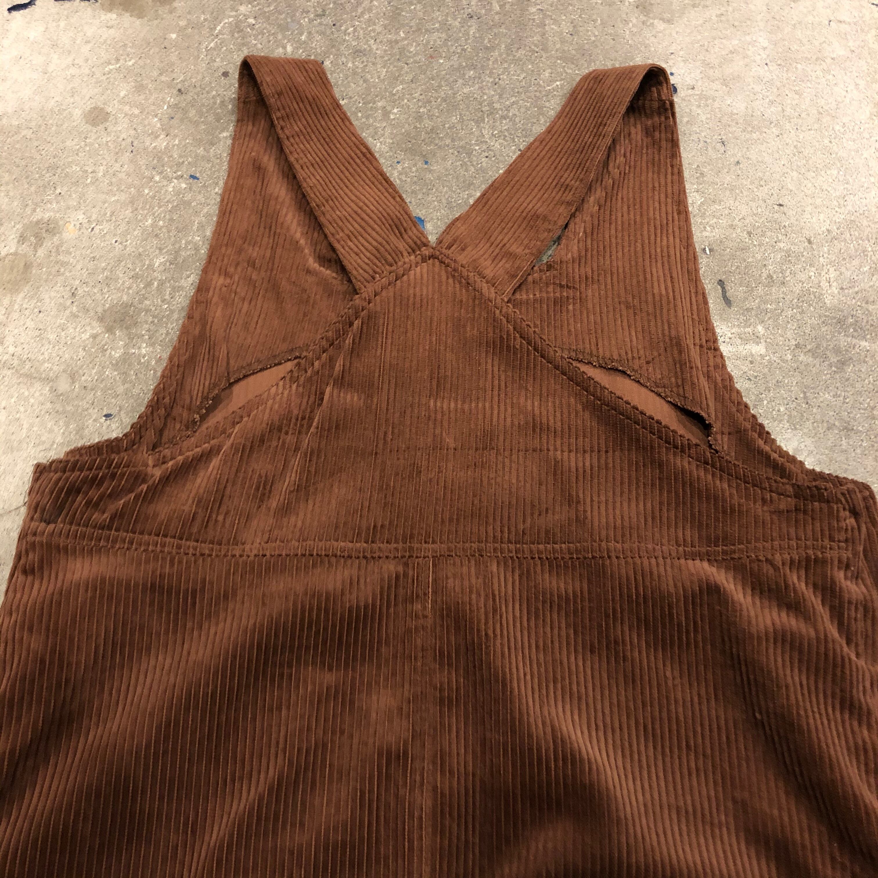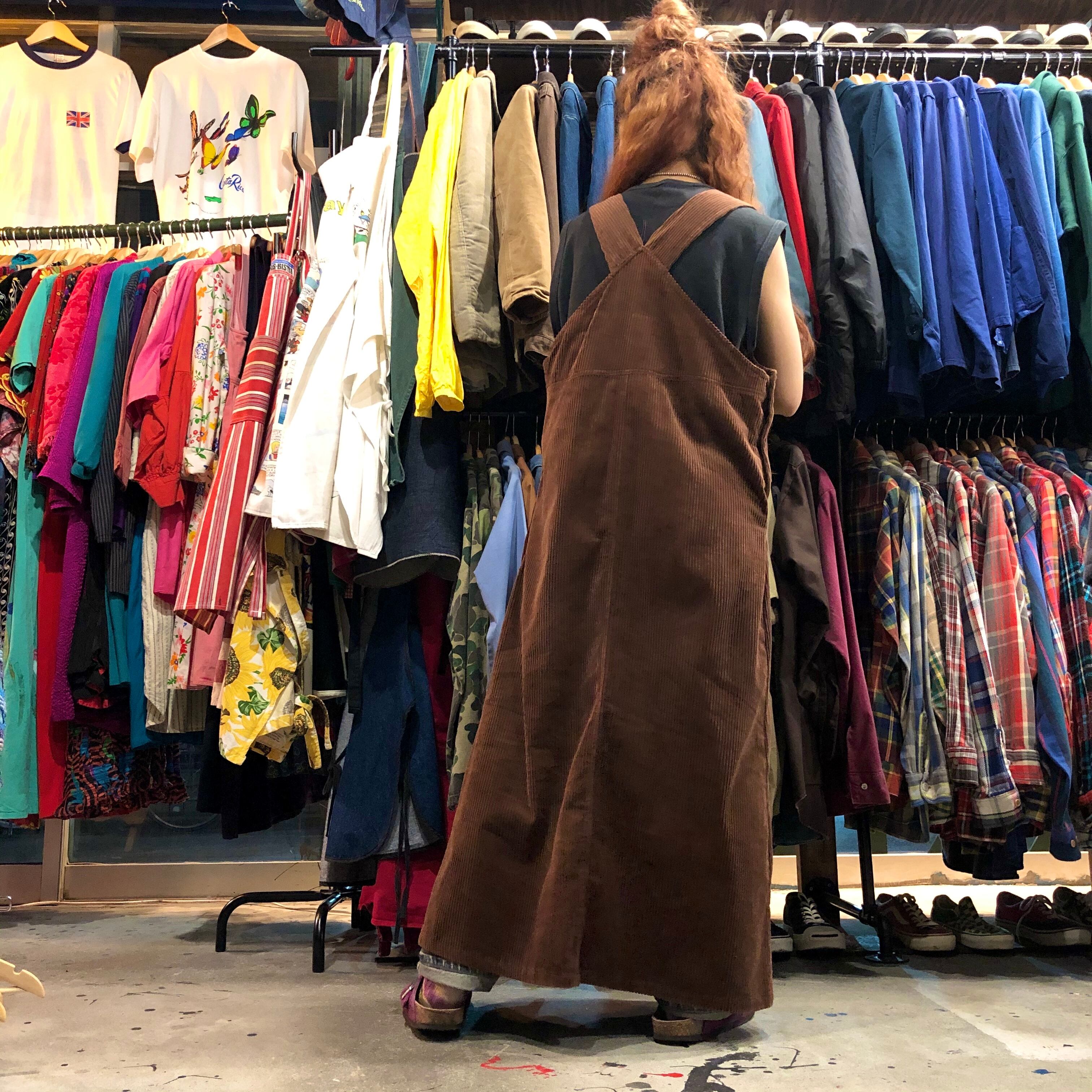 太畝コーデュロイのジャンパースカートです。茶色であまり広がりのないシルエットが大人っぽい印象です。素材的に秋冬のイメージの方が強いですが、ノースリーブを合わせて着るのが個人的におすすめです!