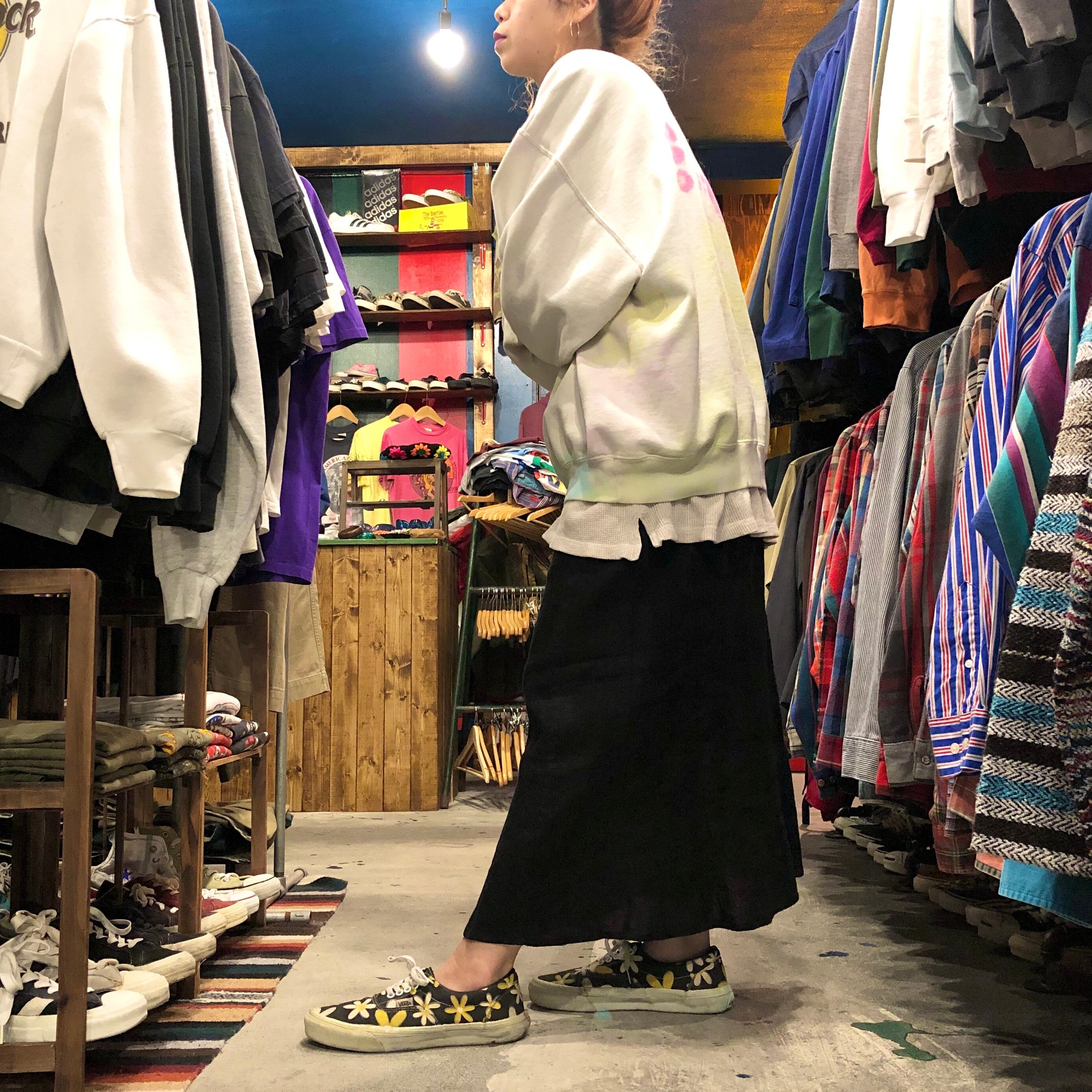 黒の足首見える丈がスッキリした印象で、合わせやすいと思います。写真では少し下げて腰で履いています。裏地はついていないので日の当たるところでは少し透けます。