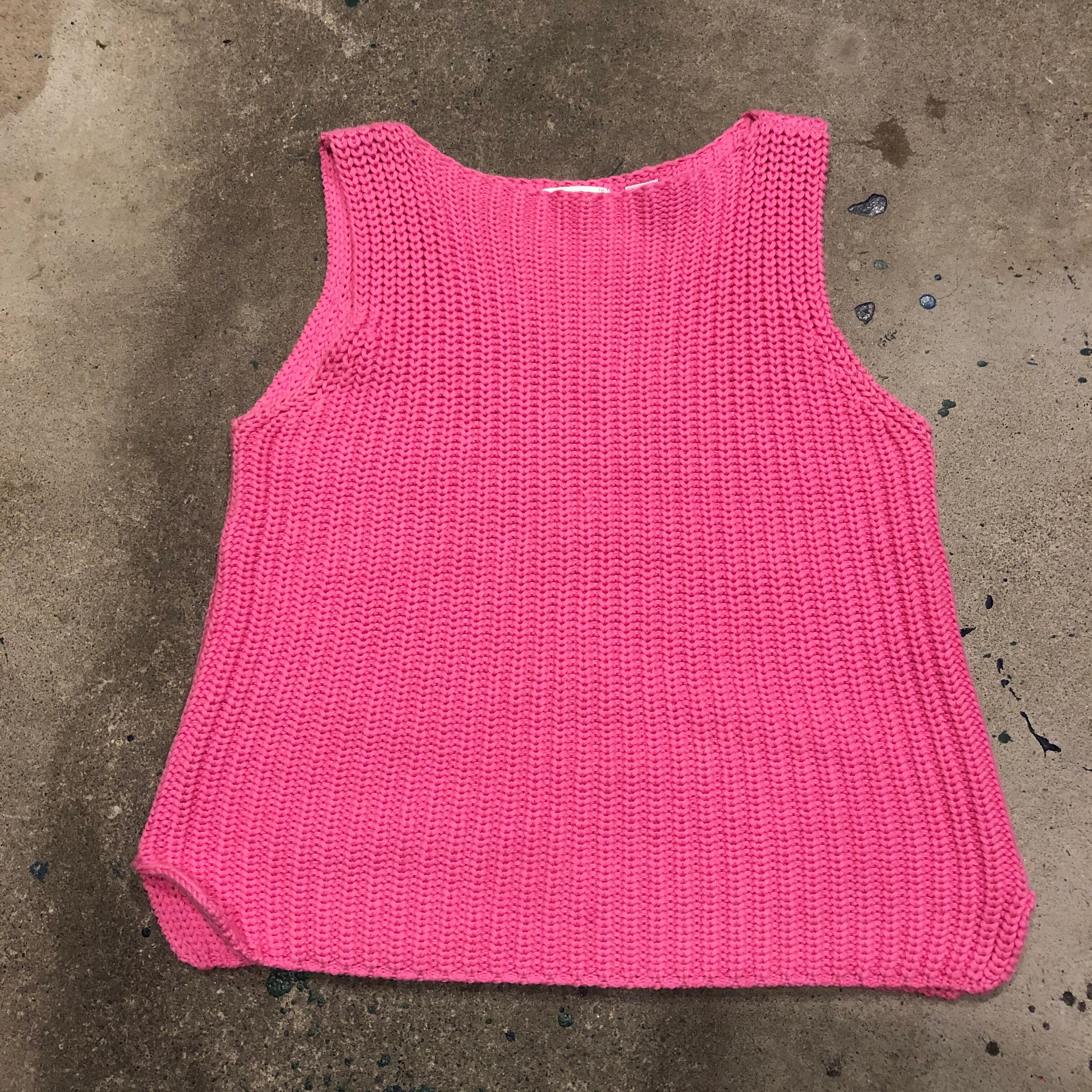 アメリカのガムのようなピンクいろと柔らかいコットンニットがとてもかわいいトップスです。重ね着にも一枚でも一年中着られそうな一着です。