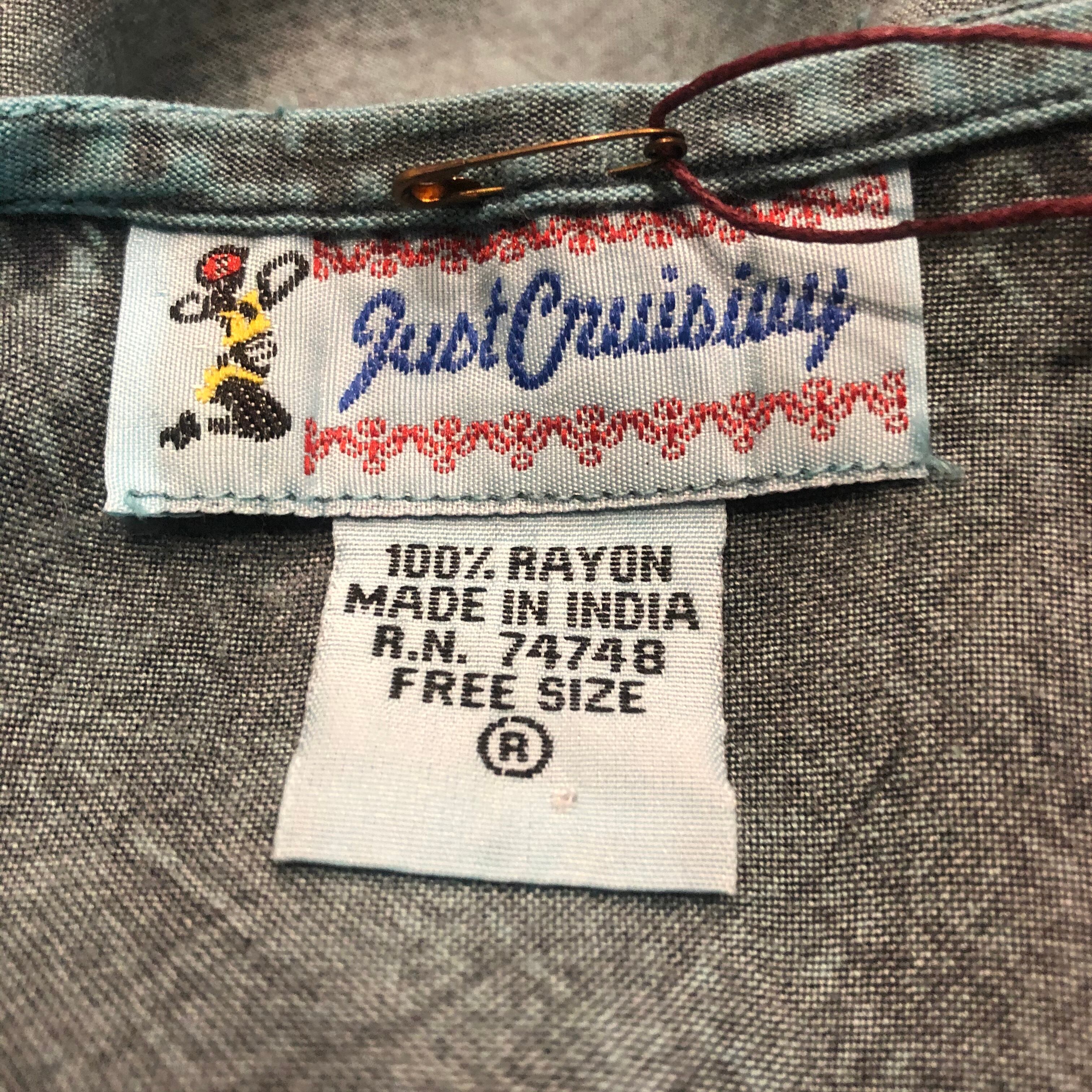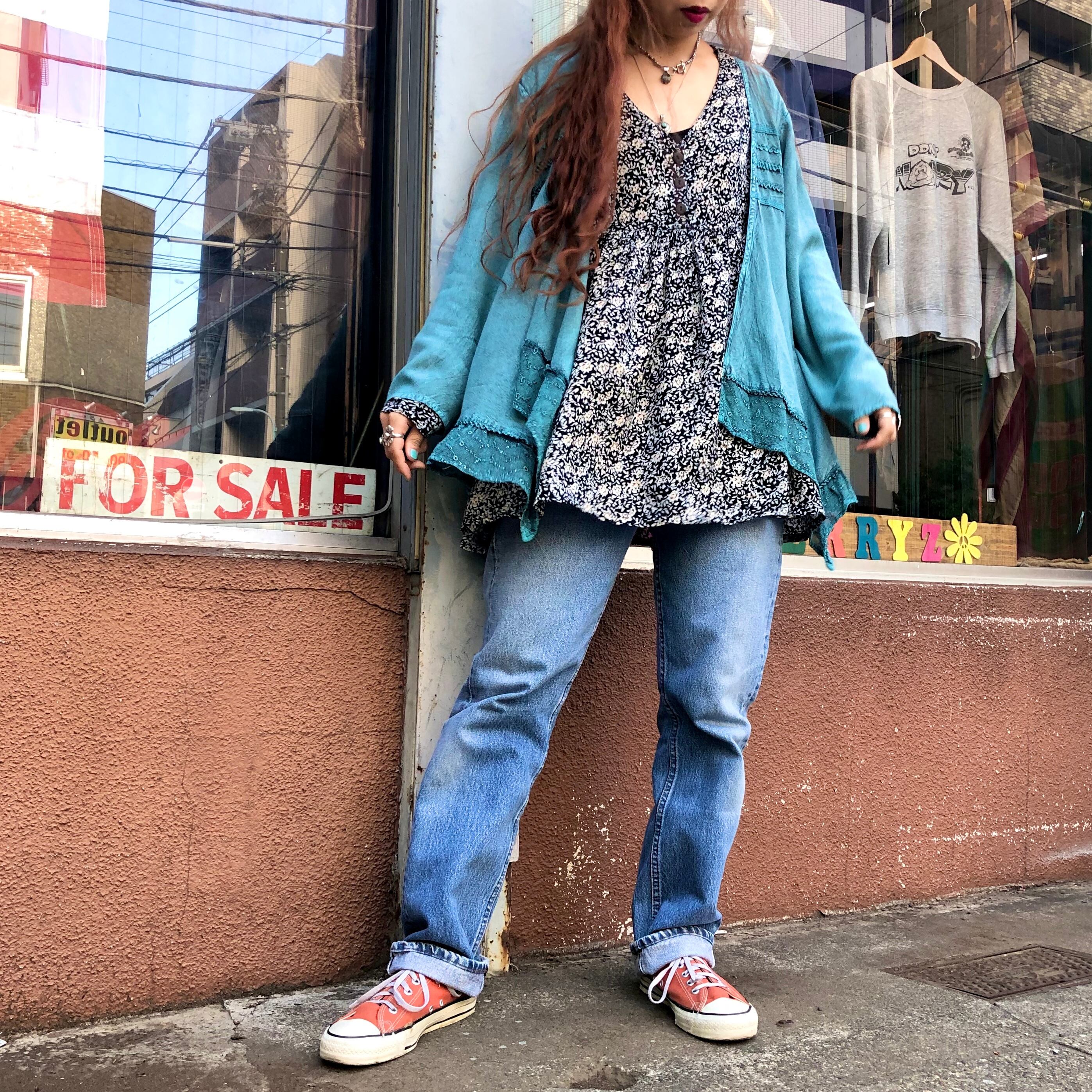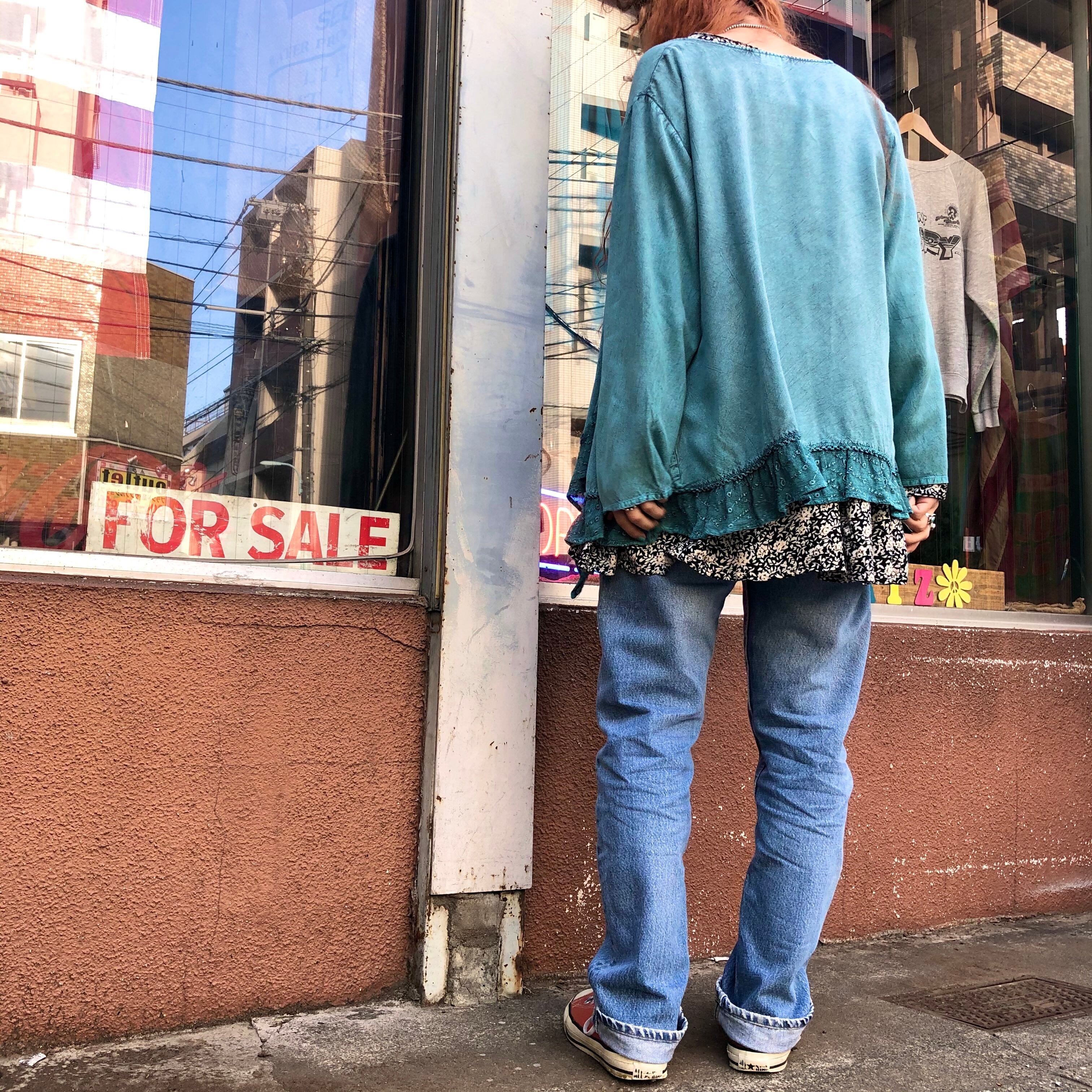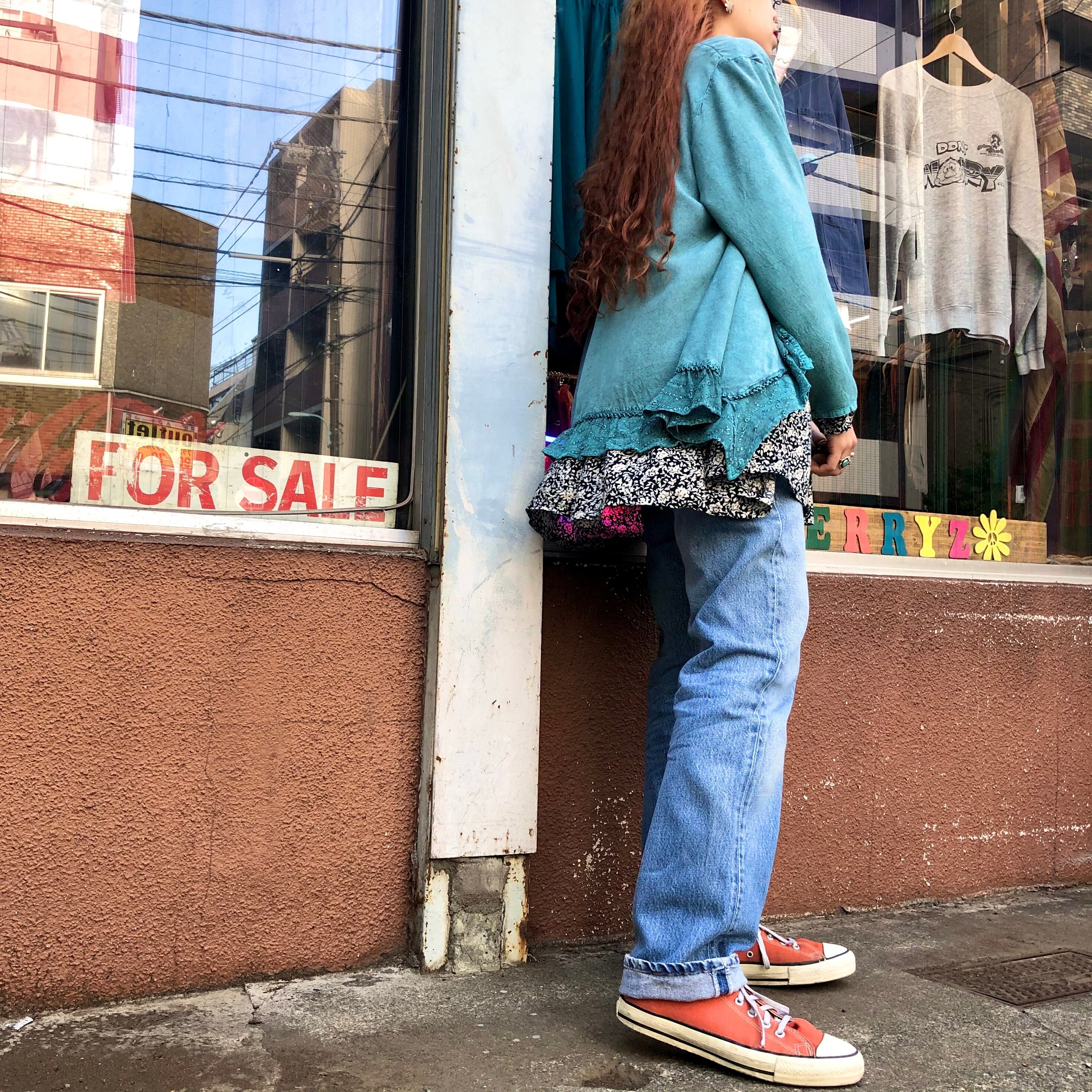 水色のデニムが色落ちしたような絶妙の色合いと、レーヨンの柔らかい素材感が気持ち良い一着です。夏にキャミソールの上などに羽織るのもかわいいと思います!