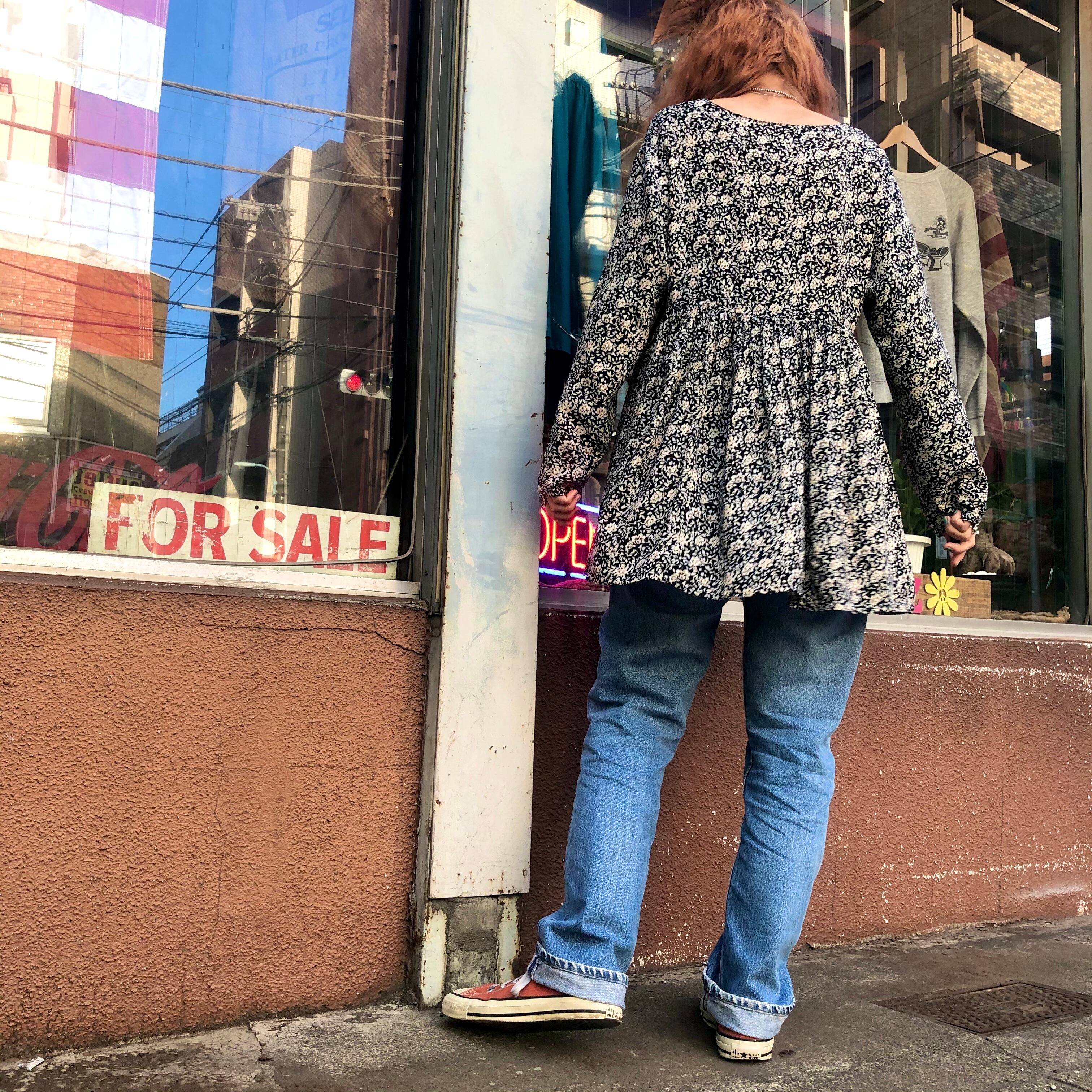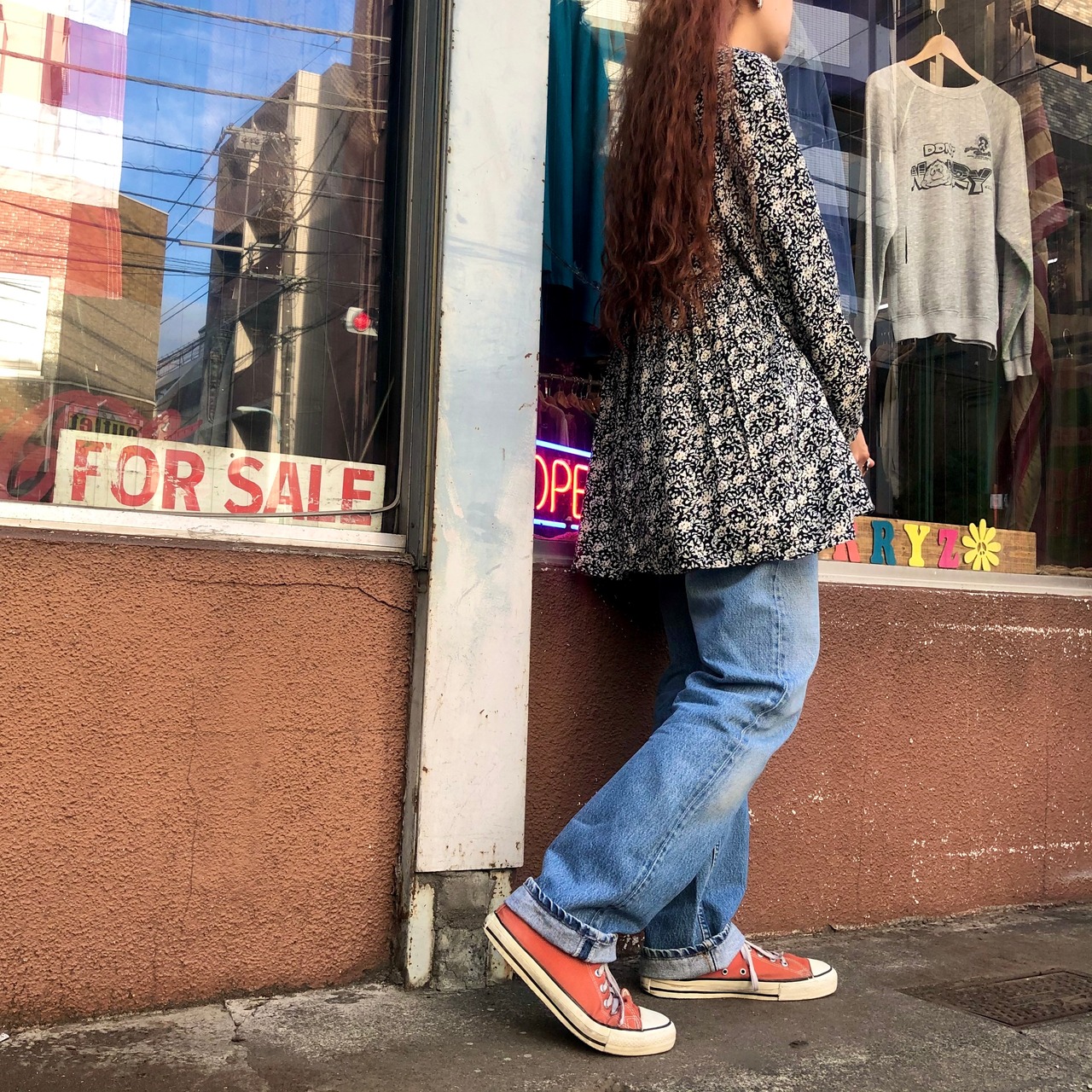 もはやチュニックのようなスーパーミニ丈のワンピースです。おそらく前の持ち主が短くリメイクしたのではないかと思われます。個人的にミニ丈で長袖というところがツボです。ショーパンを合わせてミニ丈を楽しむのも良いですね!