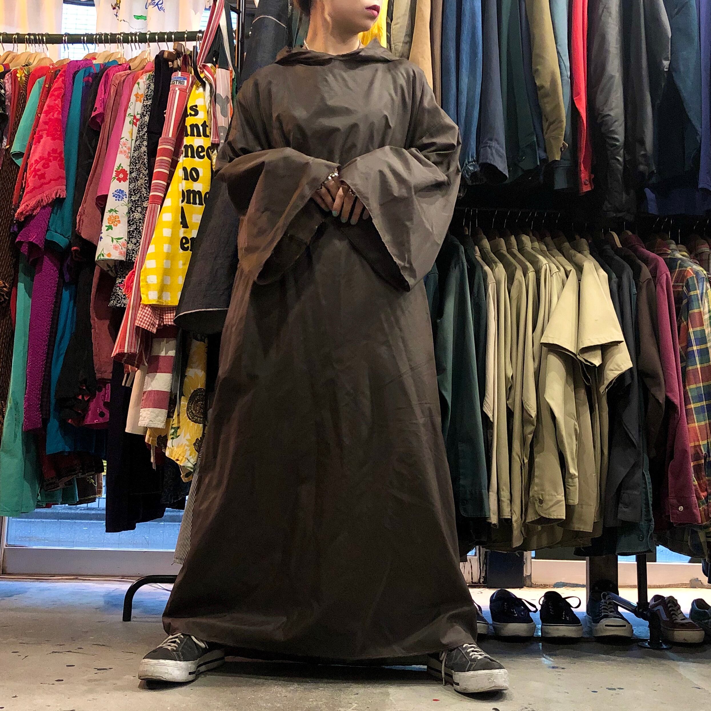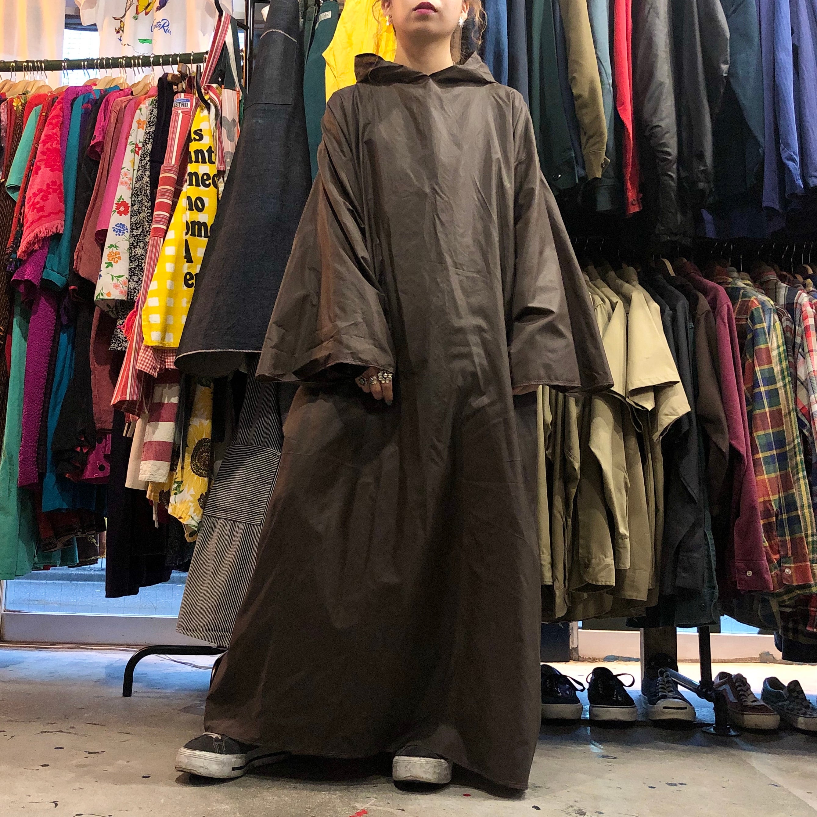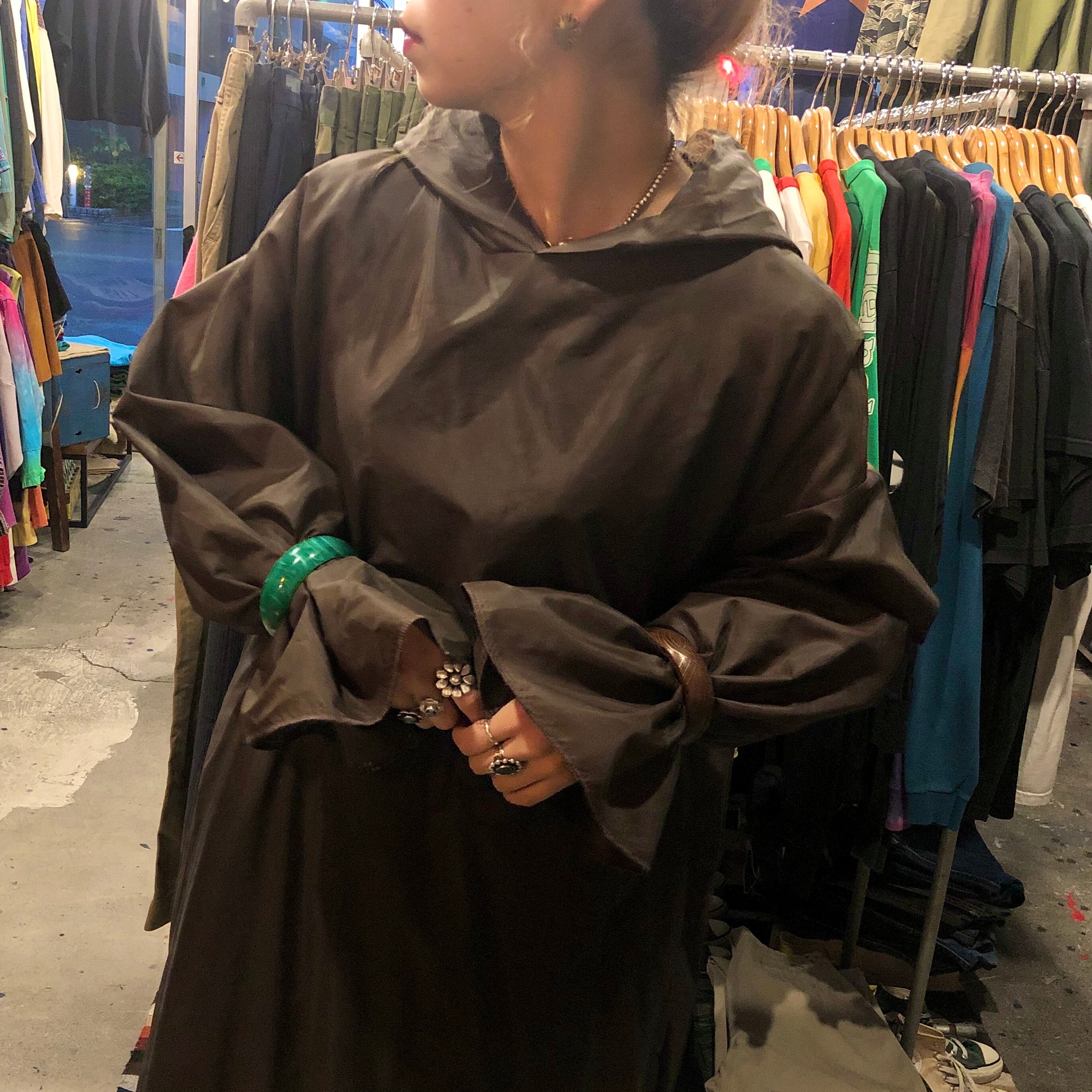 マキシ丈のナイロンコートです。カッパの役割は果たさないとは思いますが、若干濡れないような気持ちになれます。袖口がフレアになっているので、バングルやヘアゴムなどでとめて着てもかわいいと思います!胸元にバッチをつけたりしても良いですね!