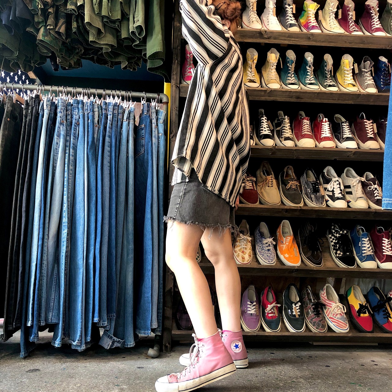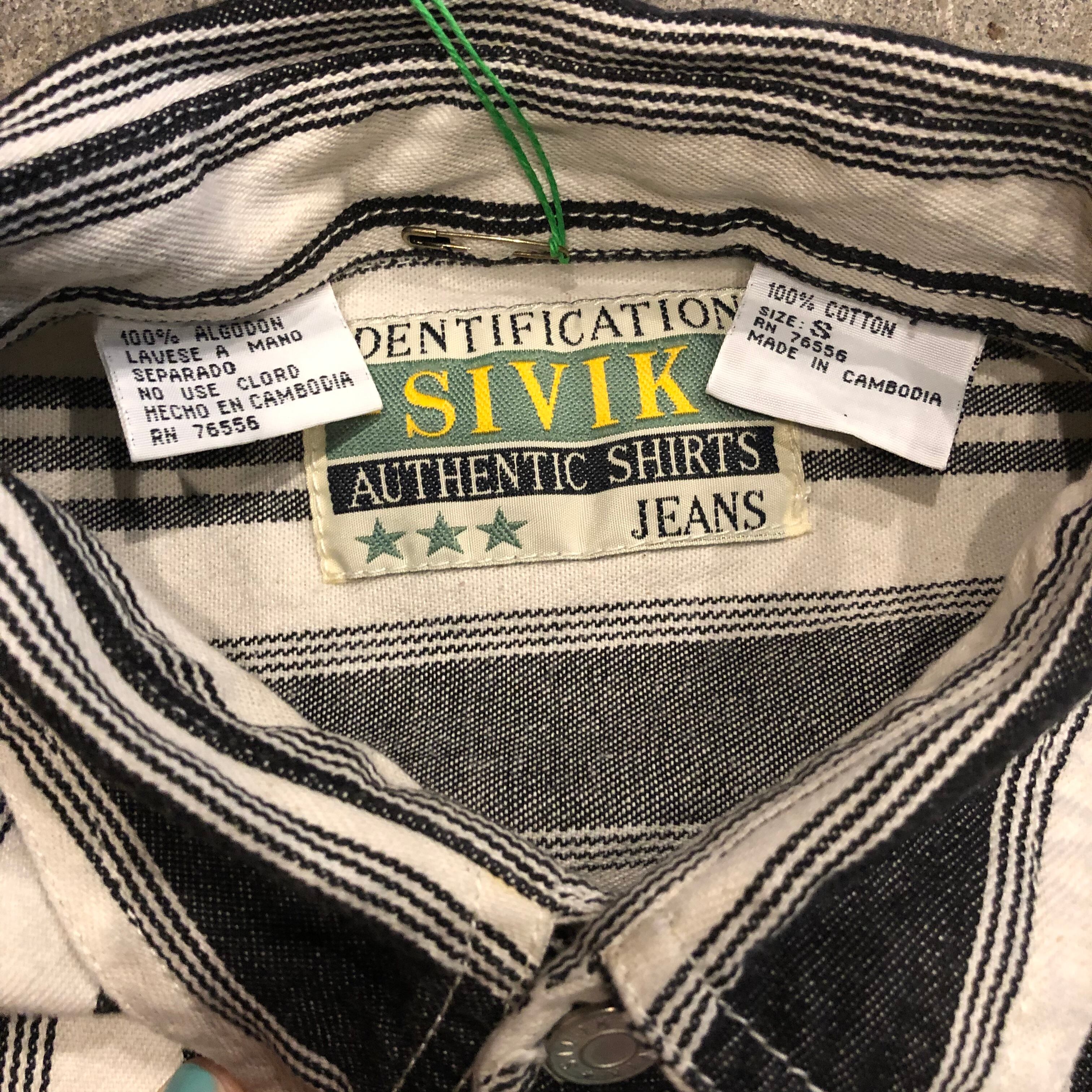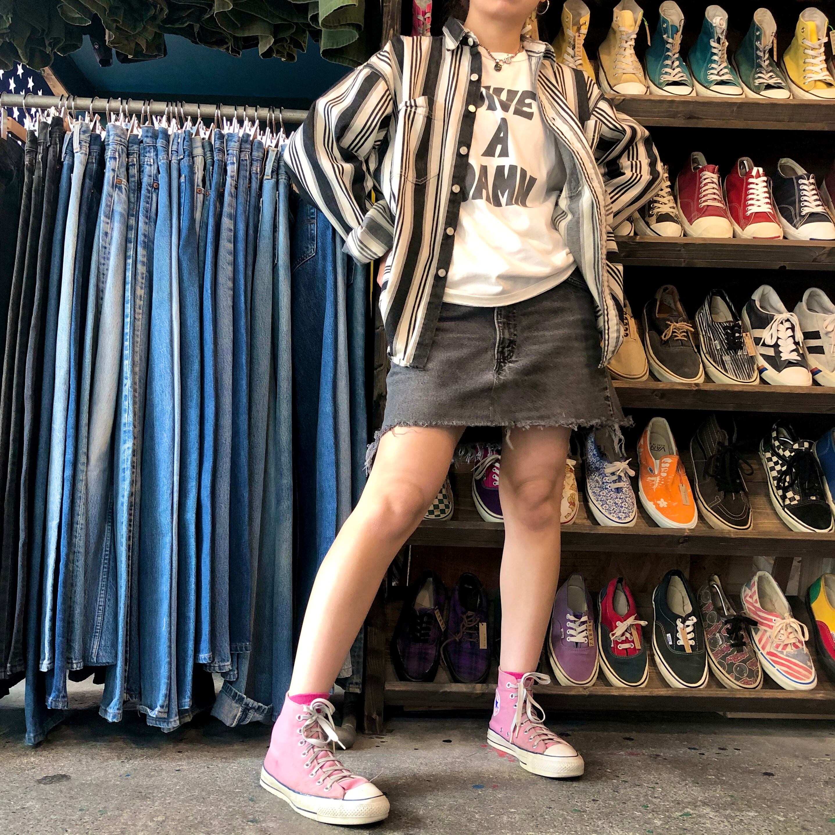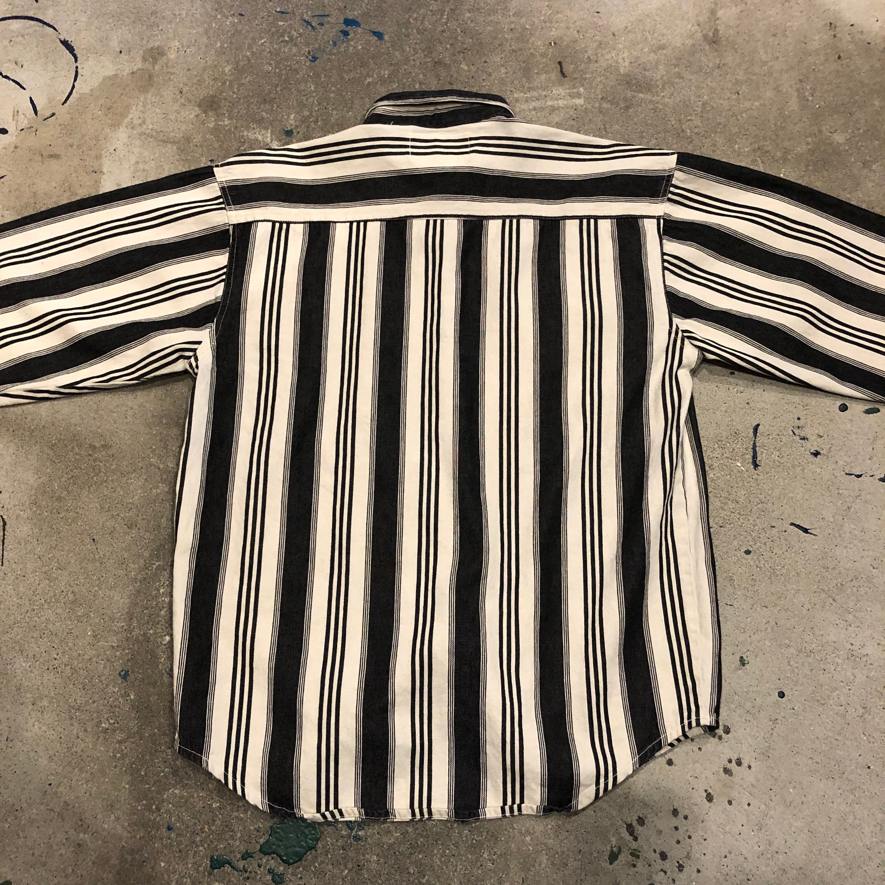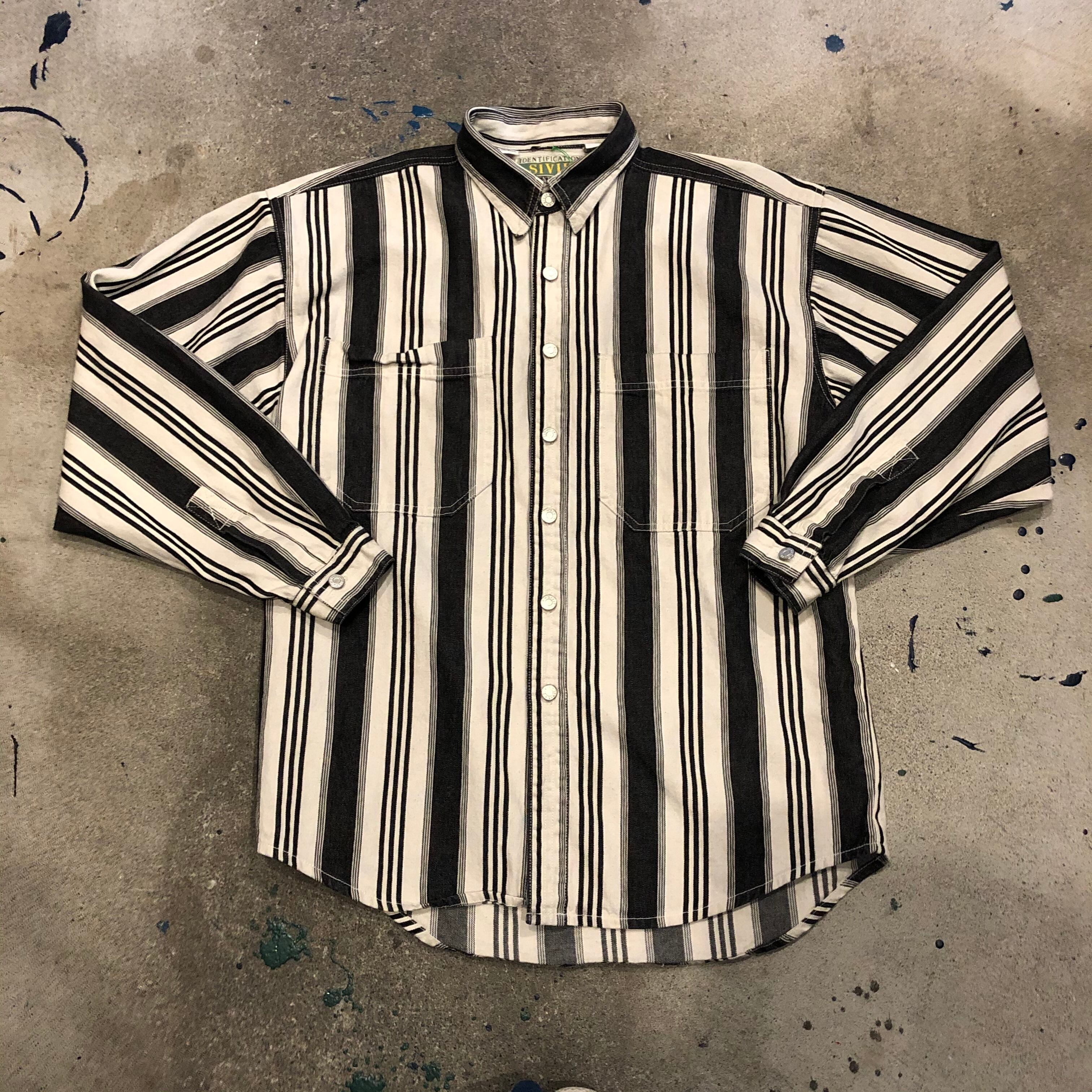 白黒ランダムストライプの薄手のデニムシャツです。シンプルですが、存在感があって使いやすいアイテムです。デニムジャケットより気軽に羽織れて良い感じです!