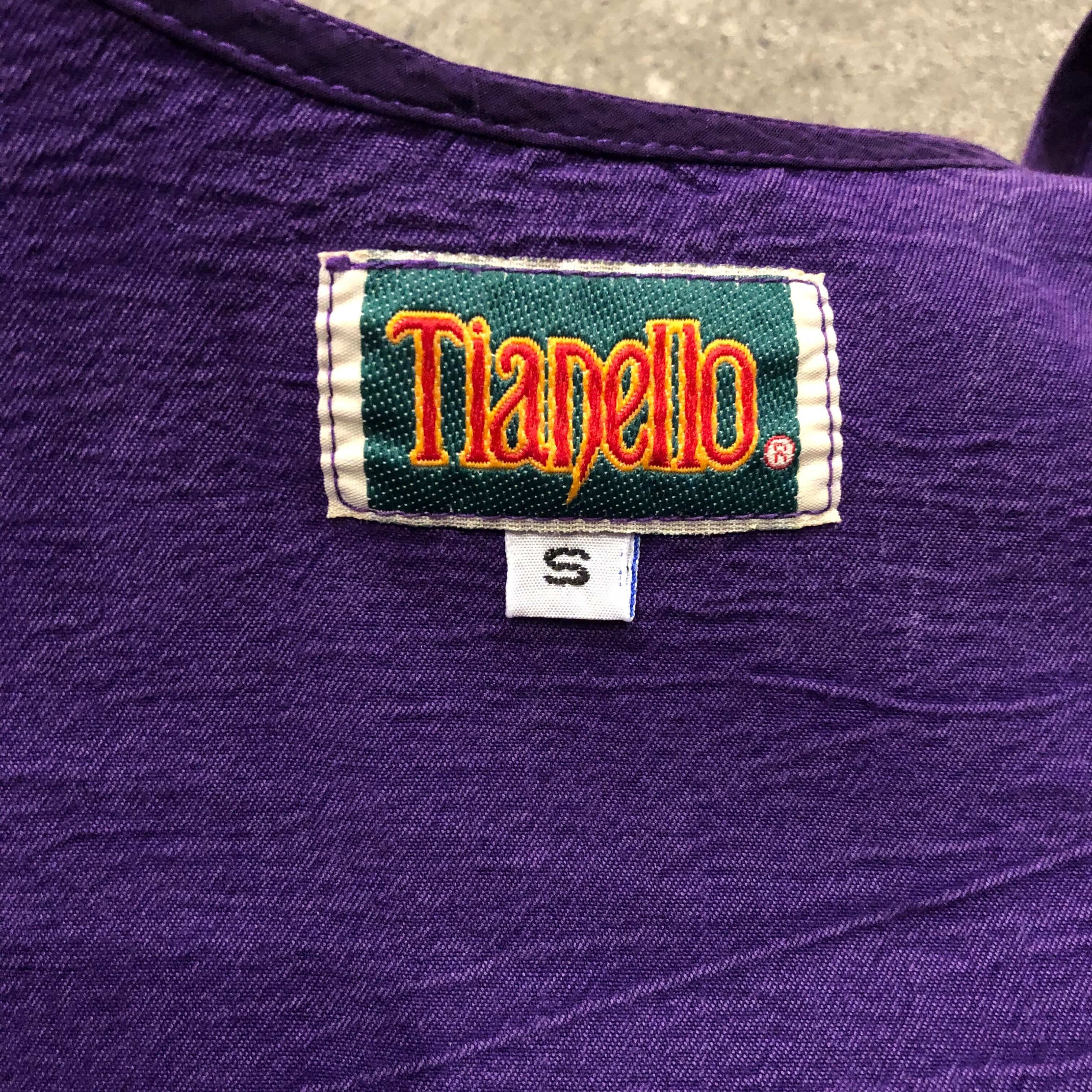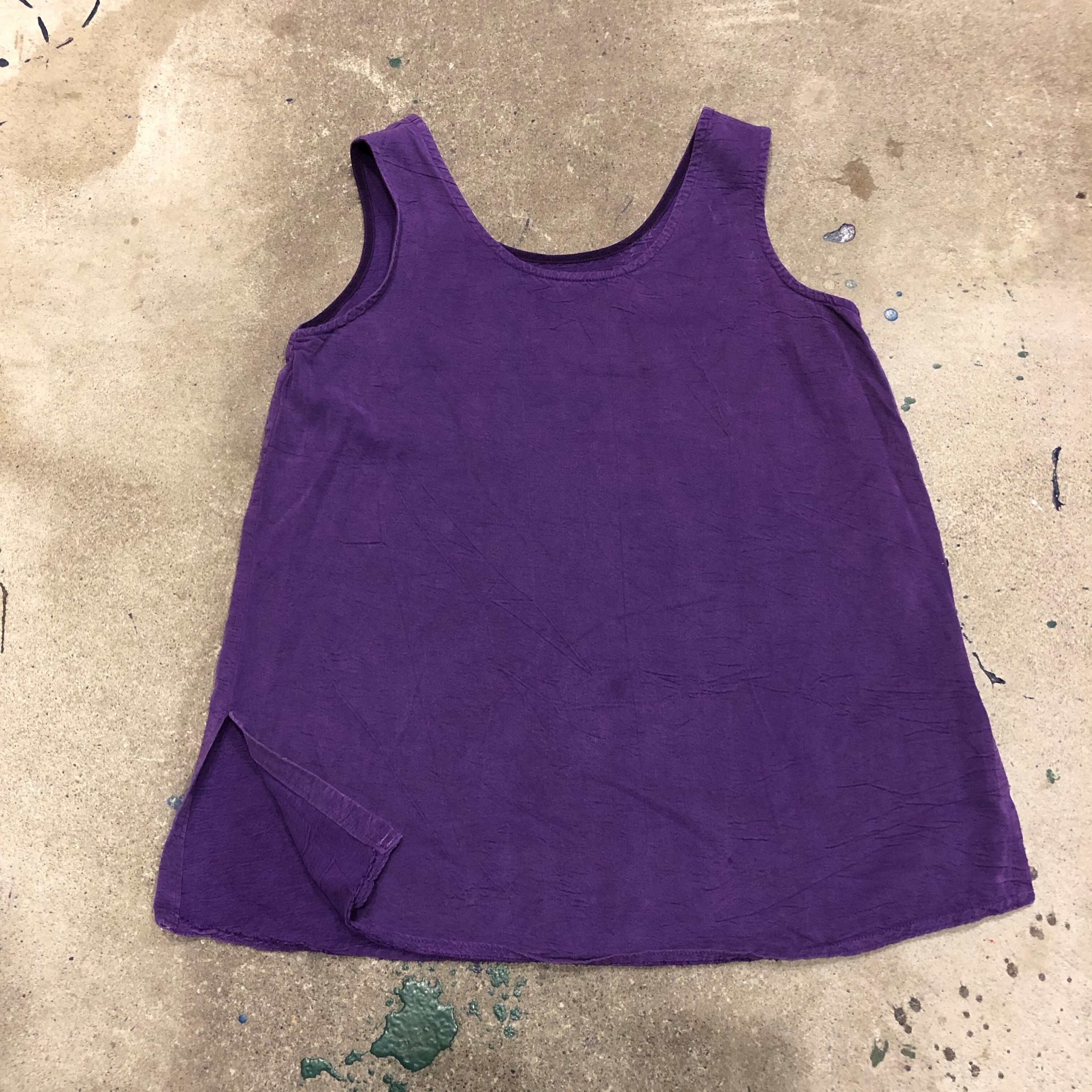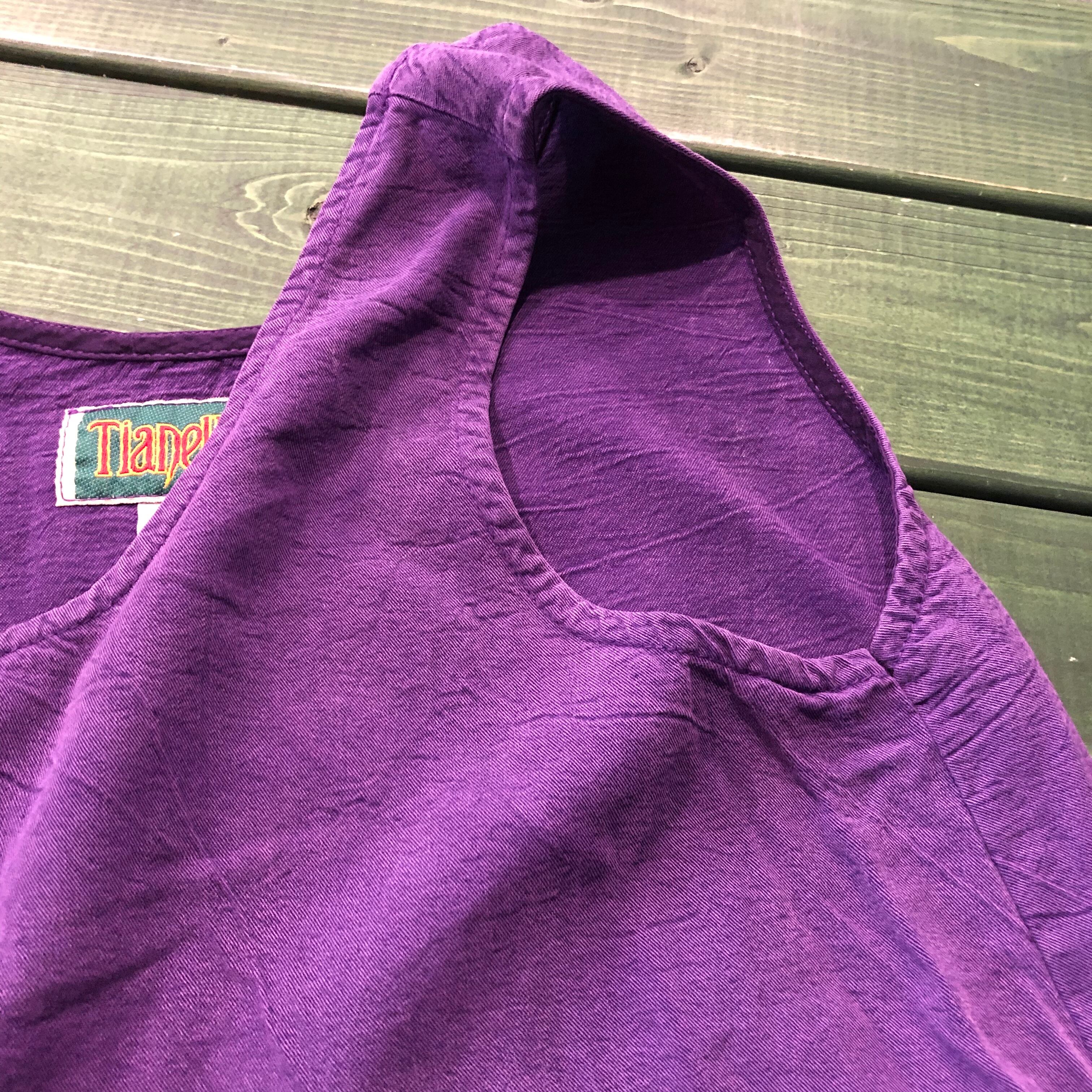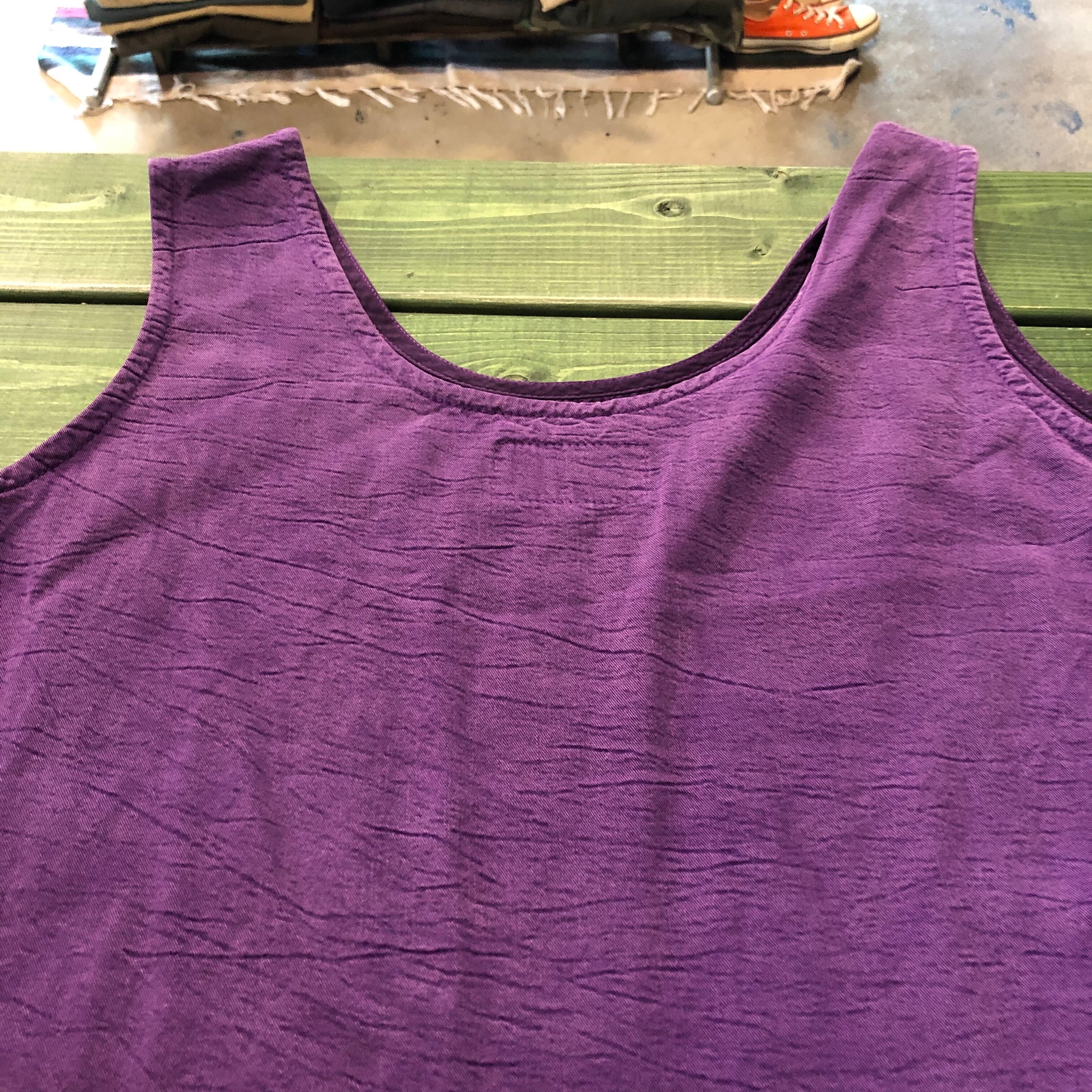 アメリカのブランド"Tianello"のタンクトップです。表示は無いですがテンセルというシルクっぽいレーヨンっぽい滑らかでとろみのある生地だと思われます。写真によって色が違うように写ってしまいますが、ザぶどう色という感じです。紫は合わせやすいので一枚あると便利だと思います!