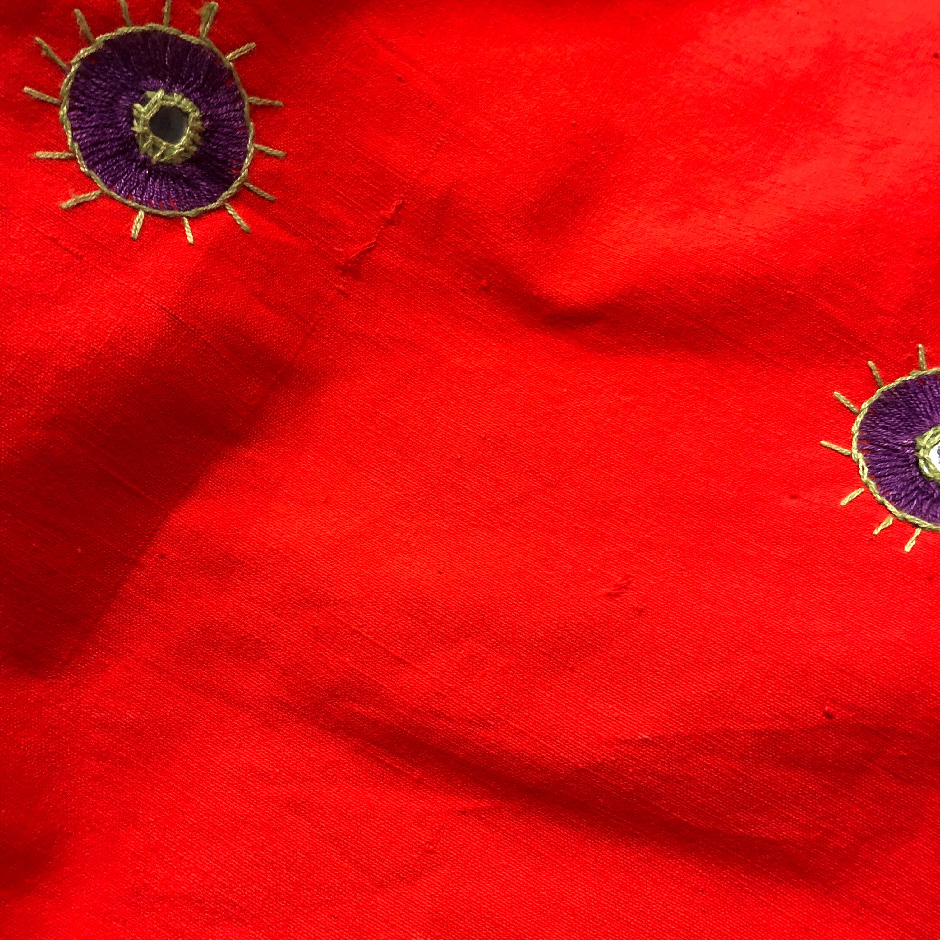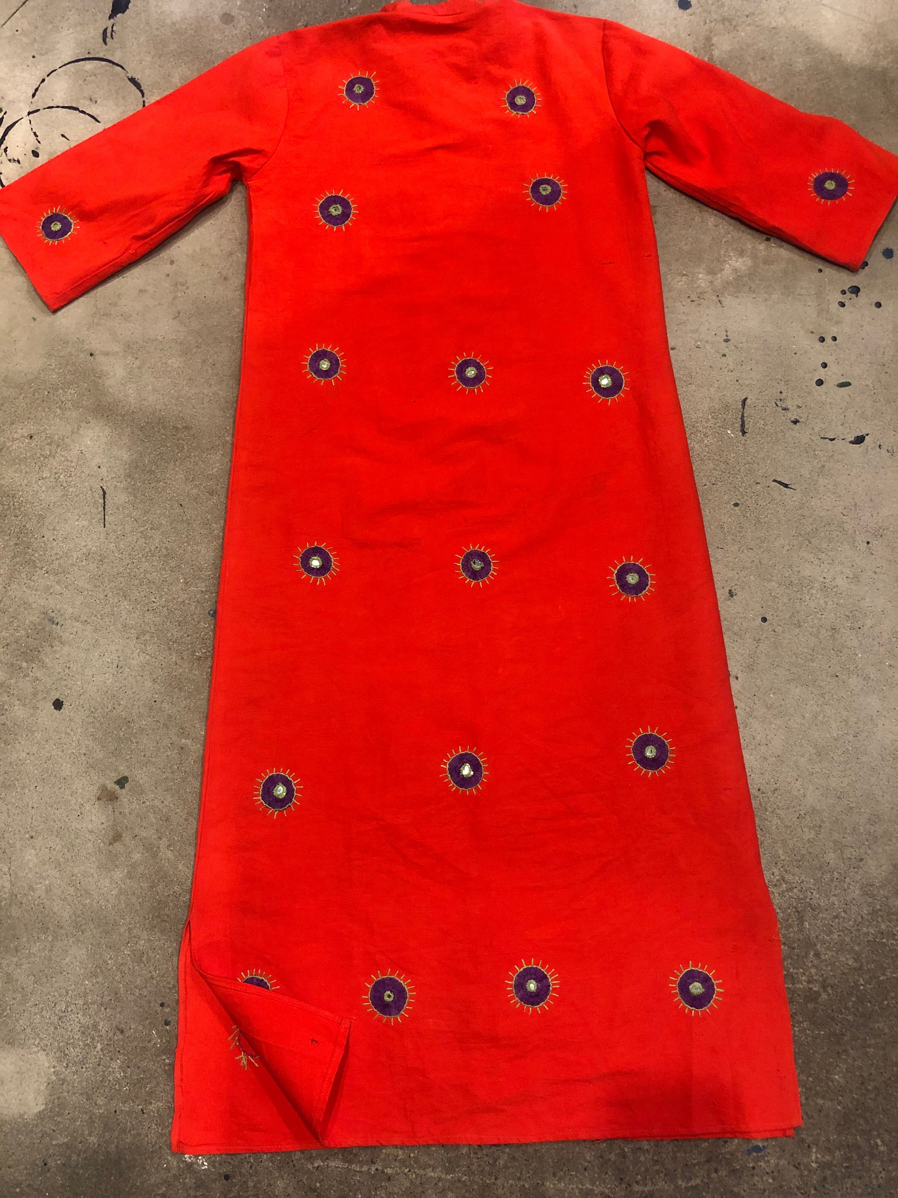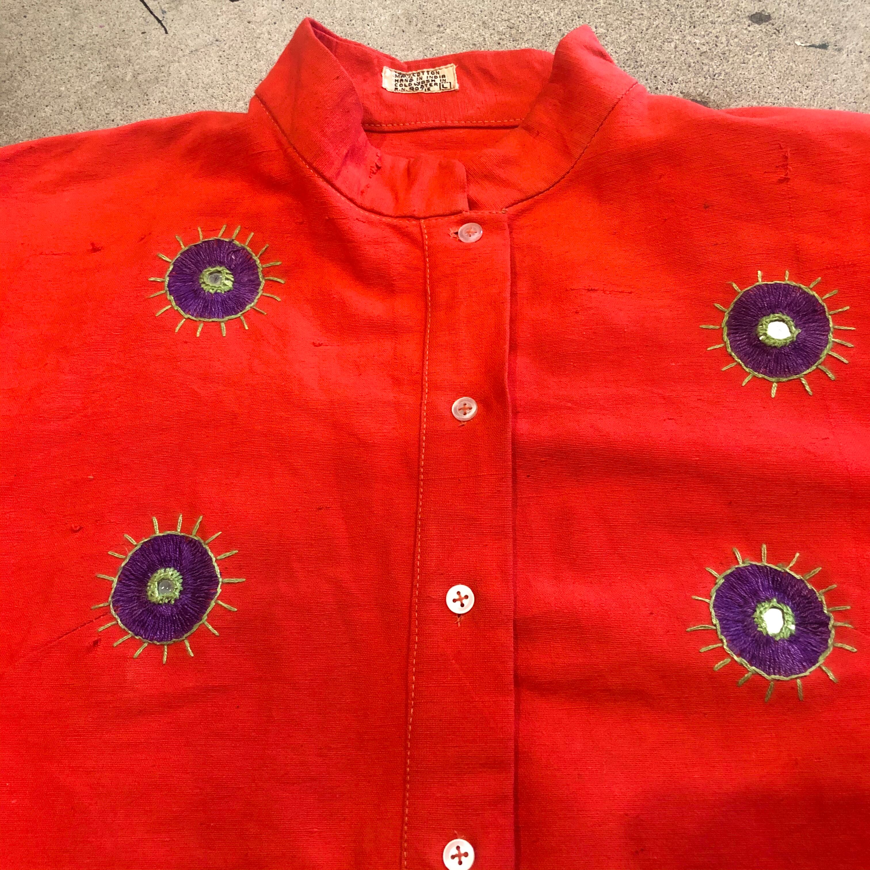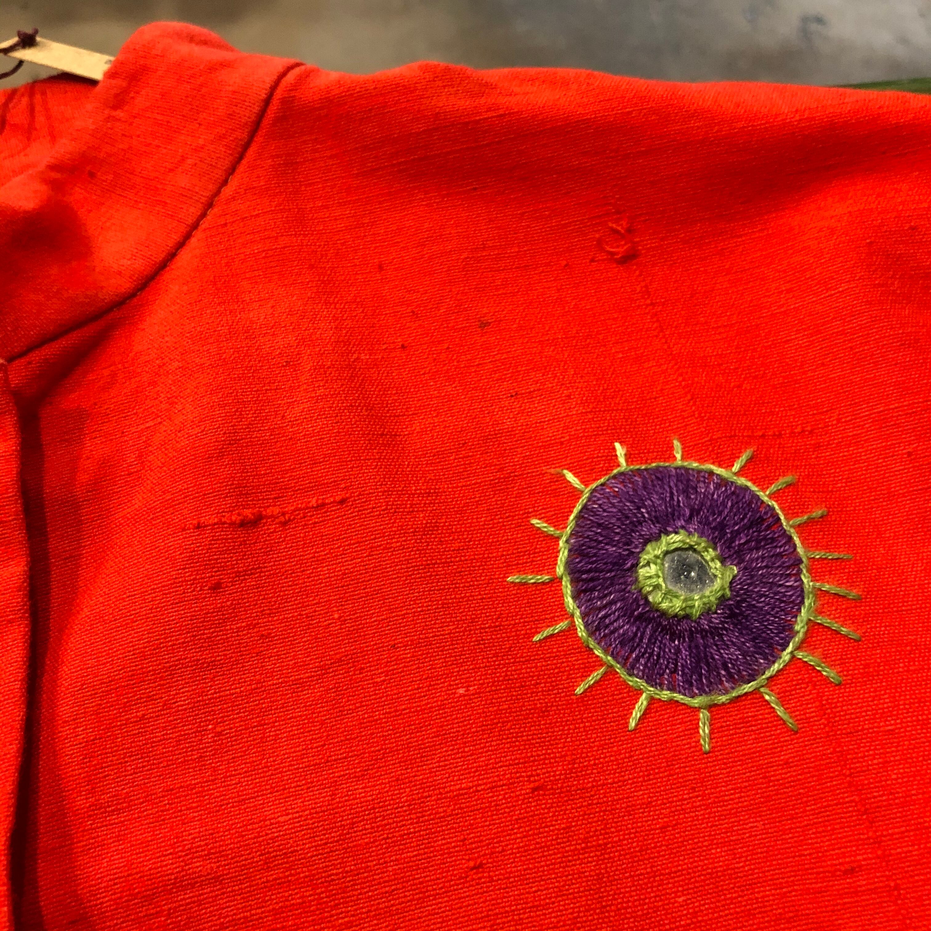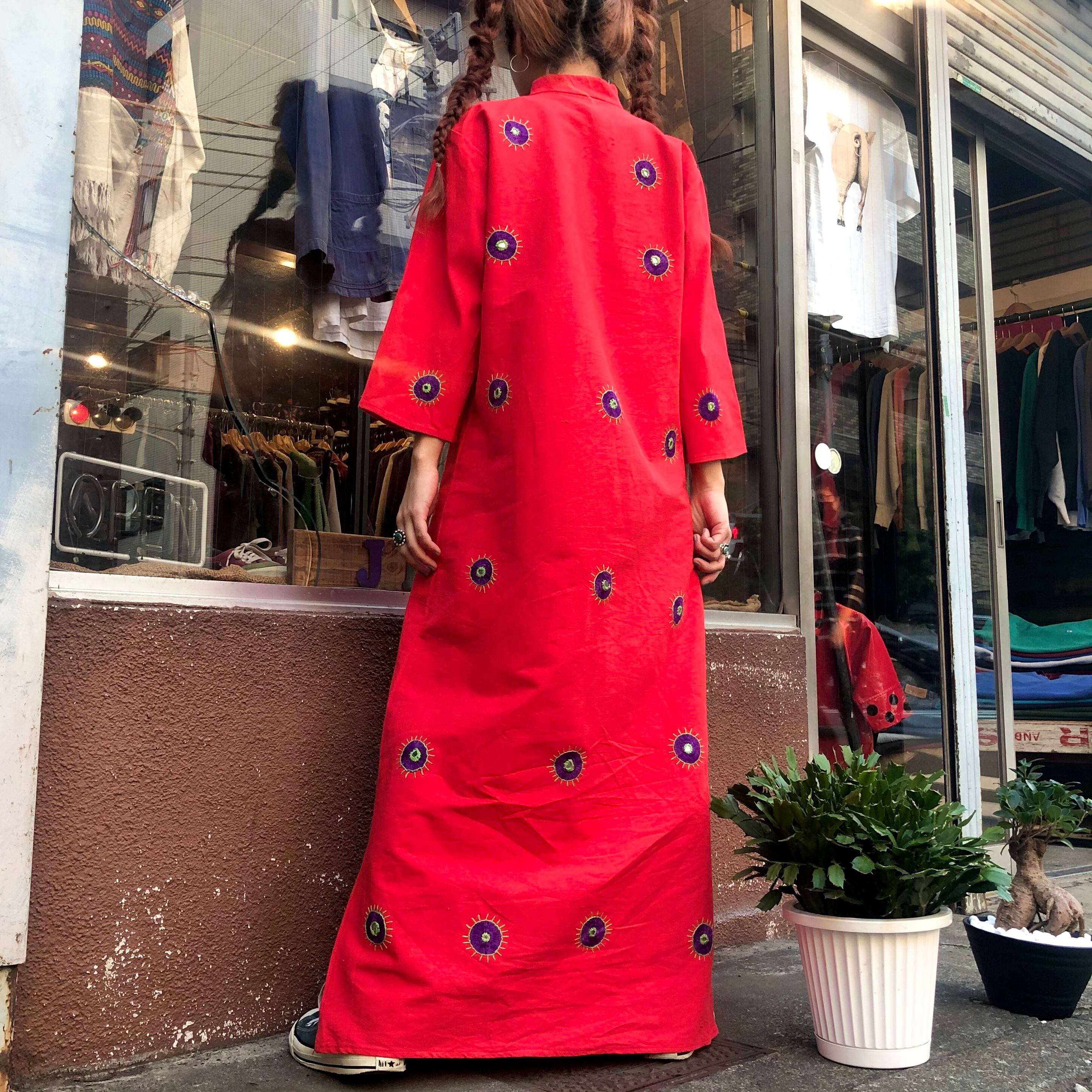真っ赤な厚手のコットンにハンドステッチとミラーワークがぽつぽつ施してあり、異国感溢れるワンピースです。糸が紫と黄緑なところもグッときます。すとーんとした真っ直ぐなラインがかっこいいです。