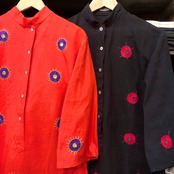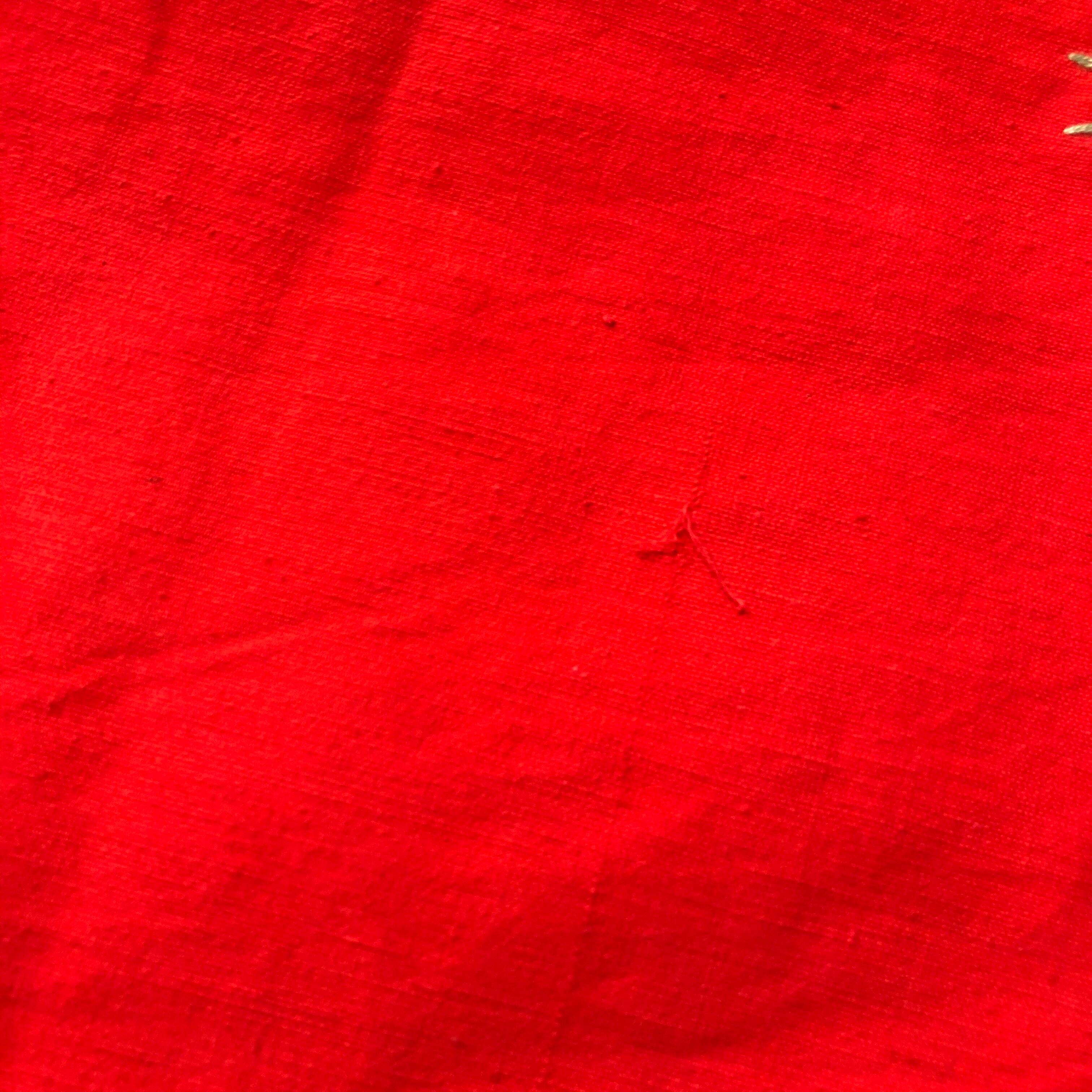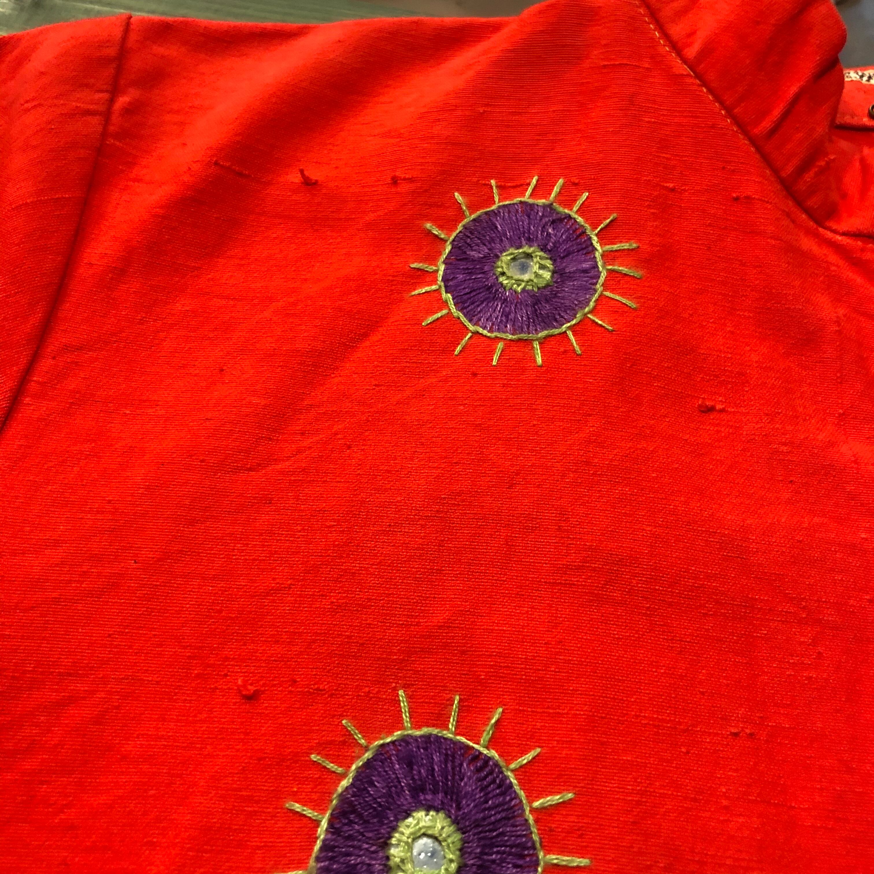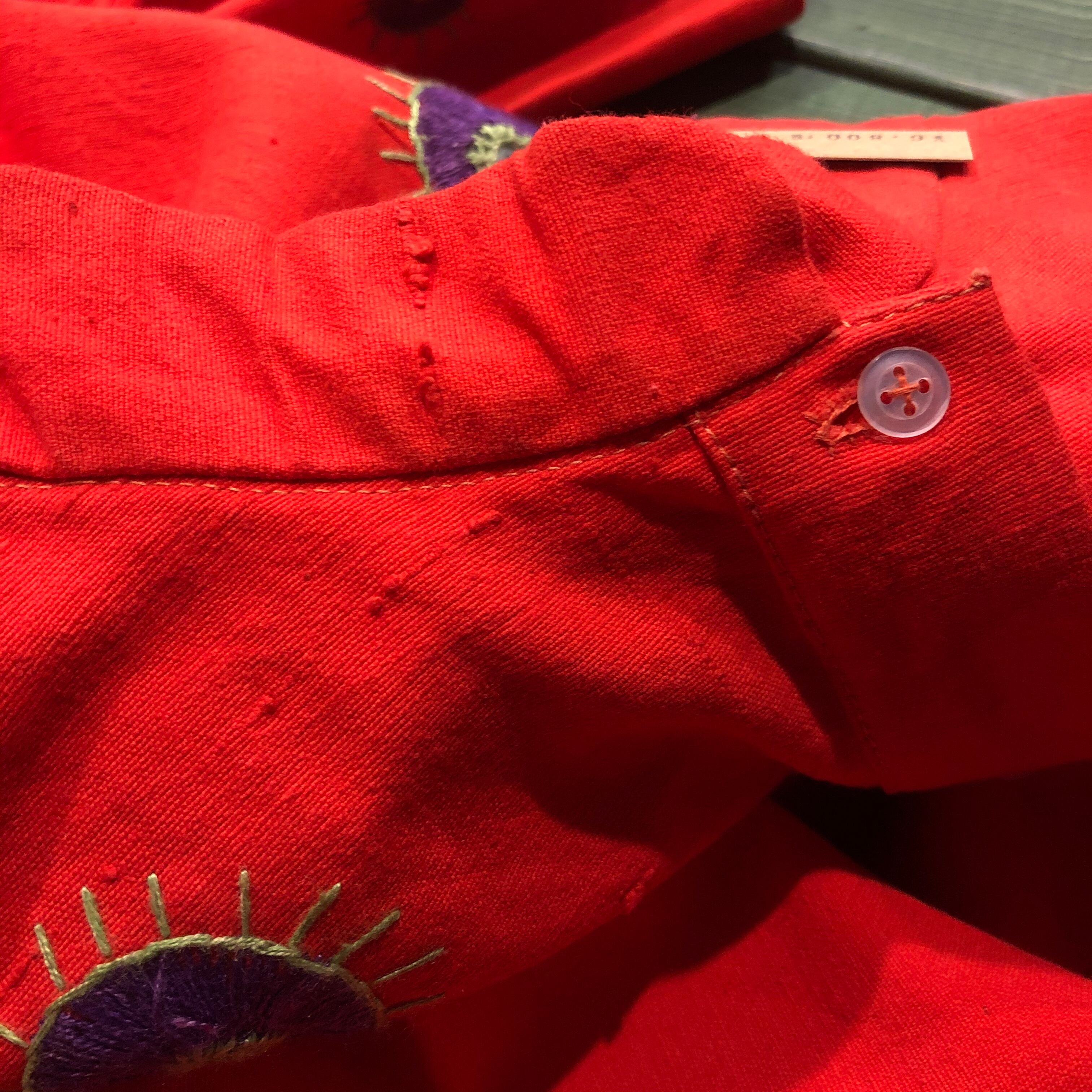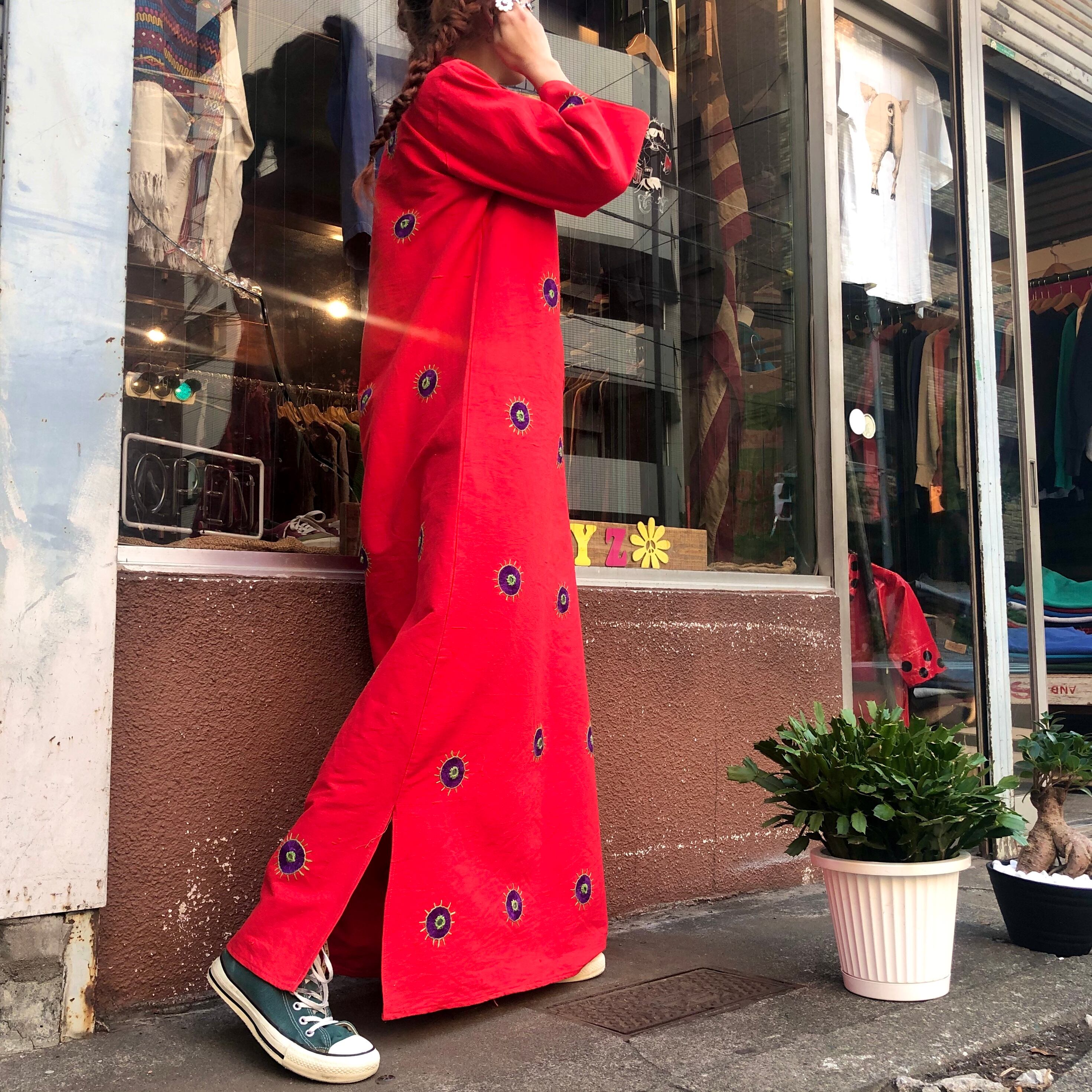 真っ赤な厚手のコットンにハンドステッチとミラーワークがぽつぽつ施してあり、異国感溢れるワンピースです。糸が紫と黄緑なところもグッときます。すとーんとした真っ直ぐなラインがかっこいいです。