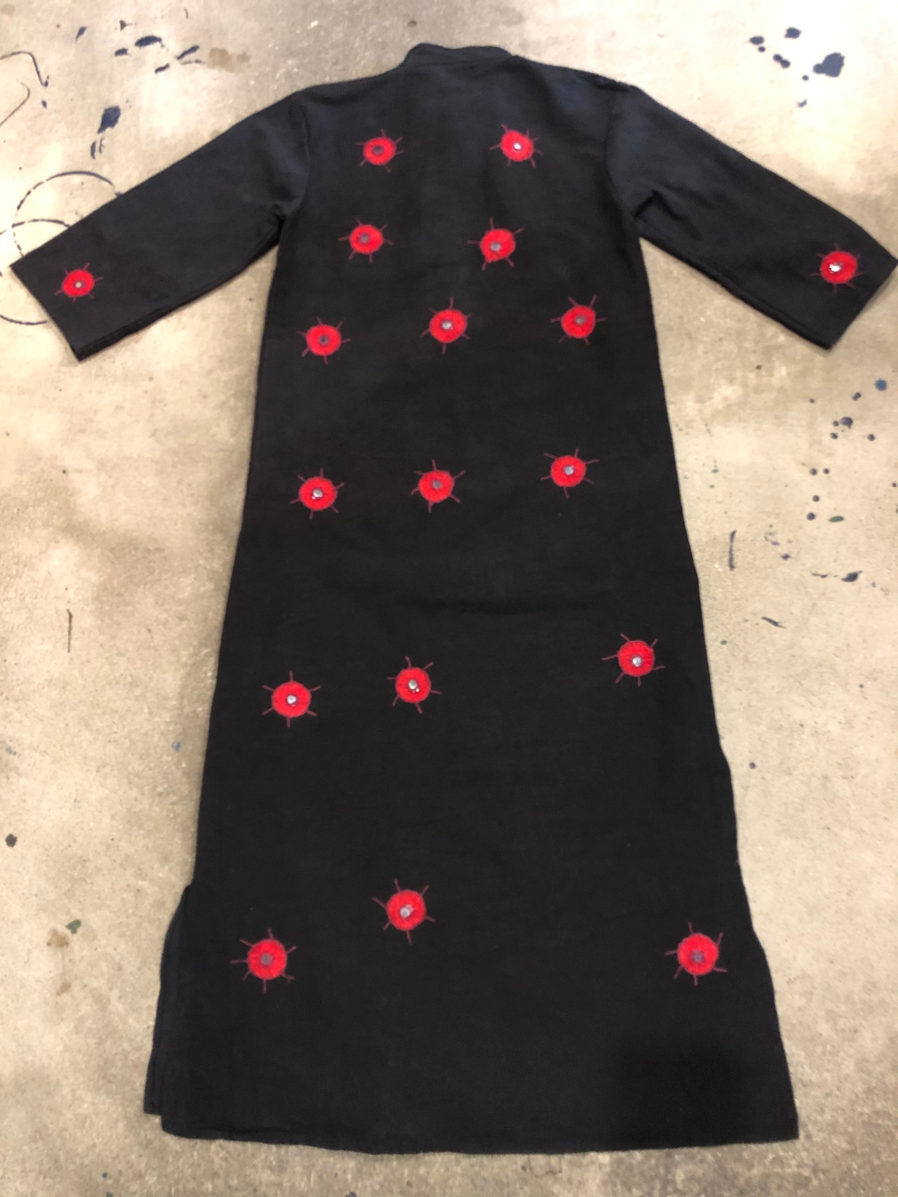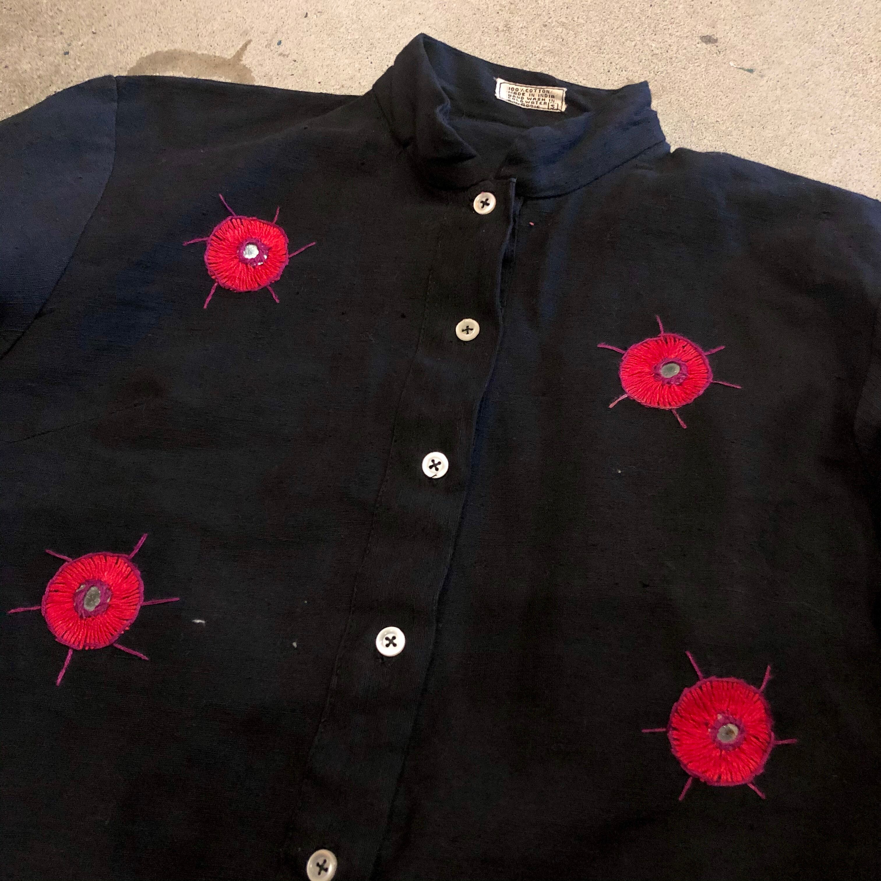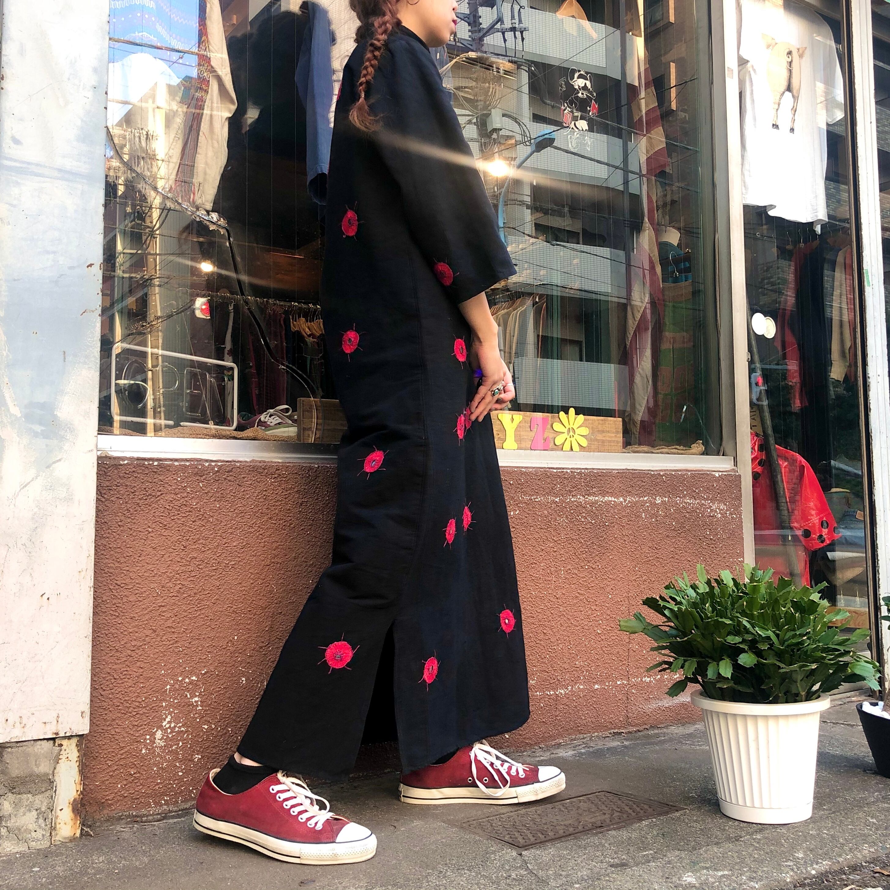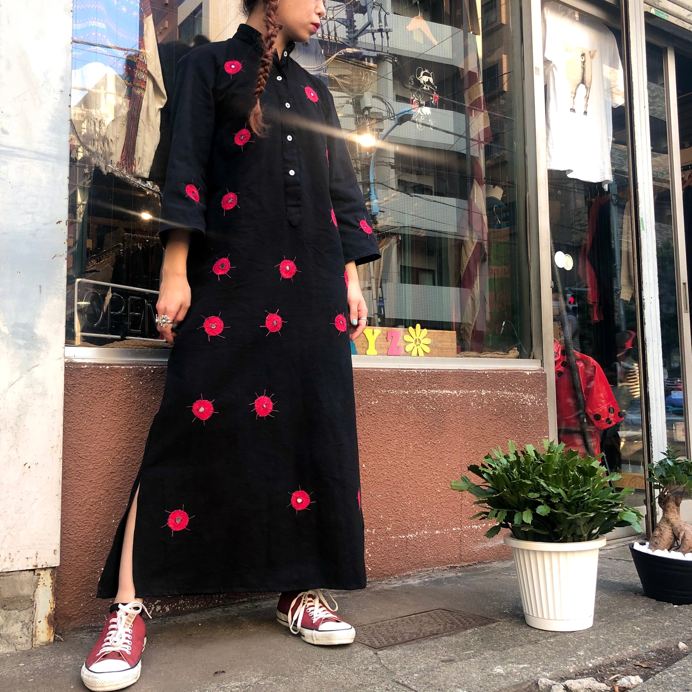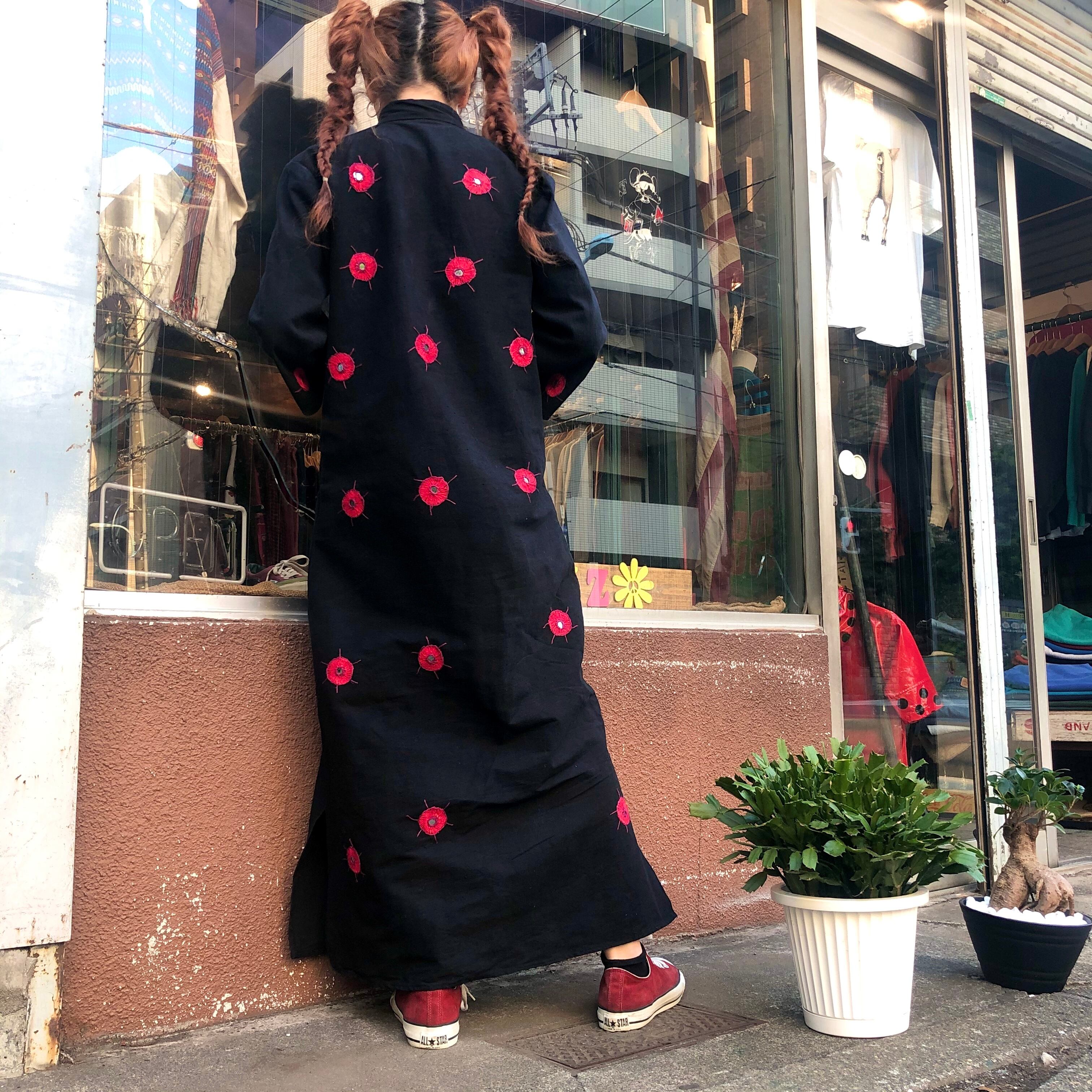 厚手のコットンにハンドステッチとミラーワークが施されたワンピースです。柄自体のデザインもそれぞれ適当で、全体のバランスも適当なところが明らかに手を抜いてる感じで面白いです。黒地に赤なので、インパクトがあってかわいいです。