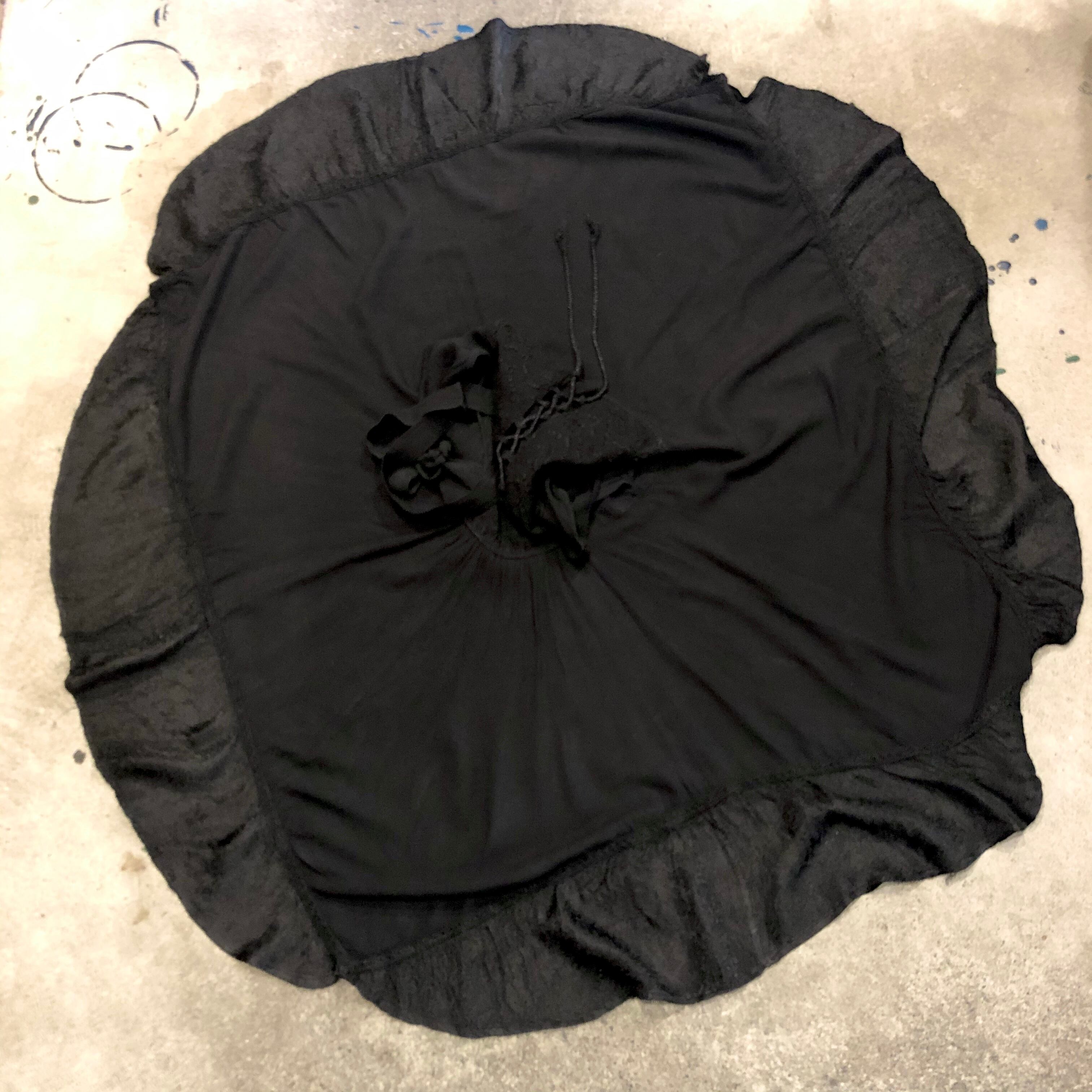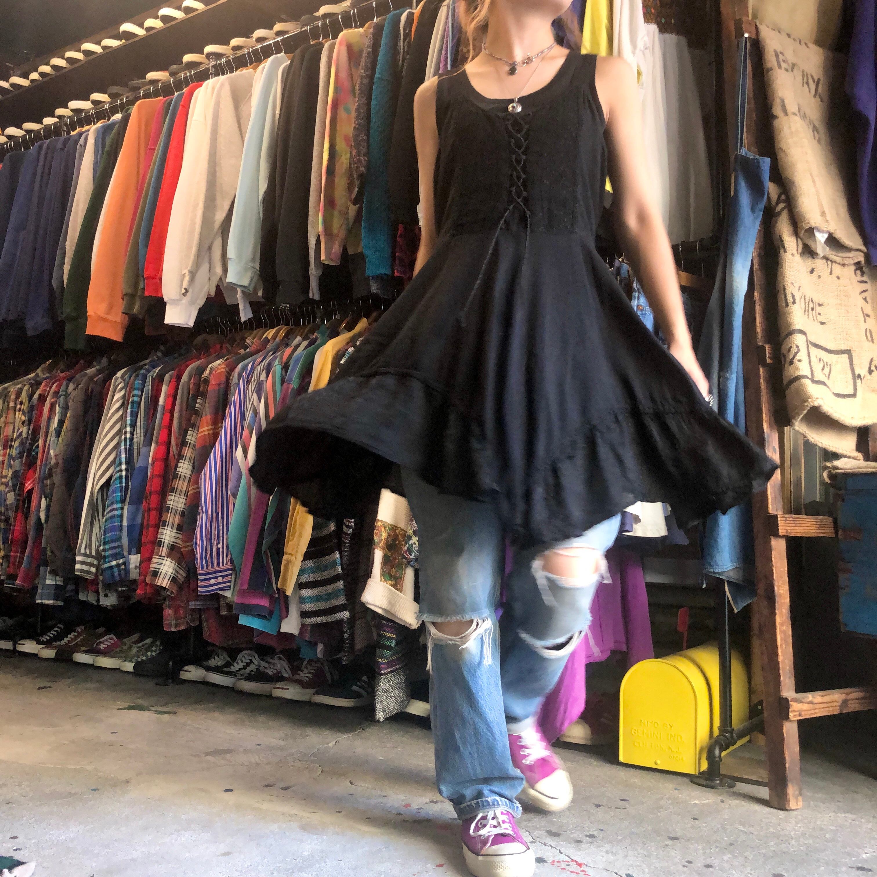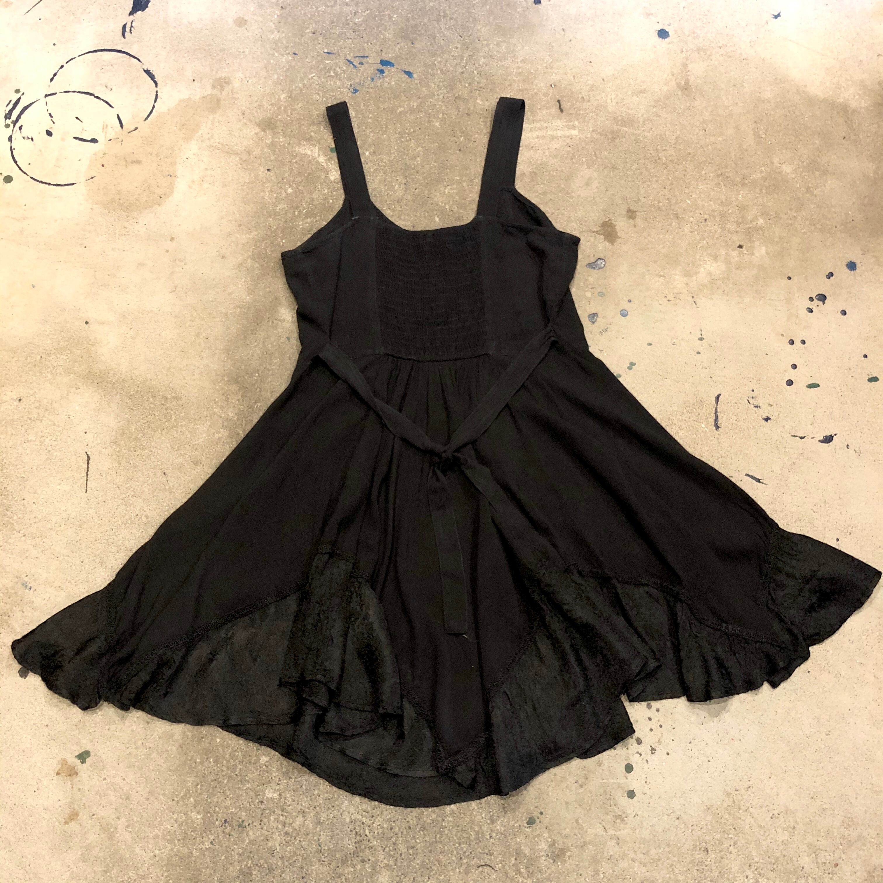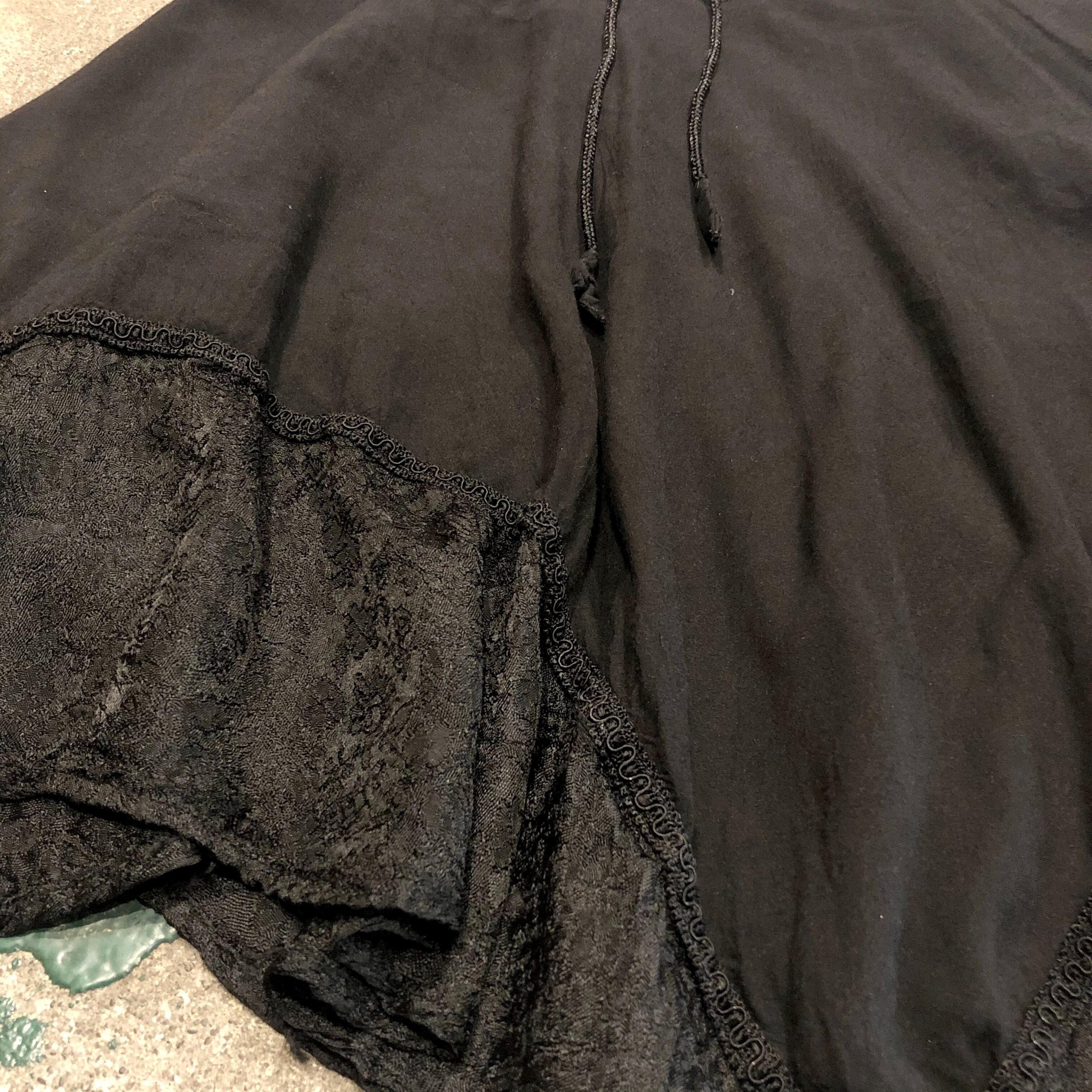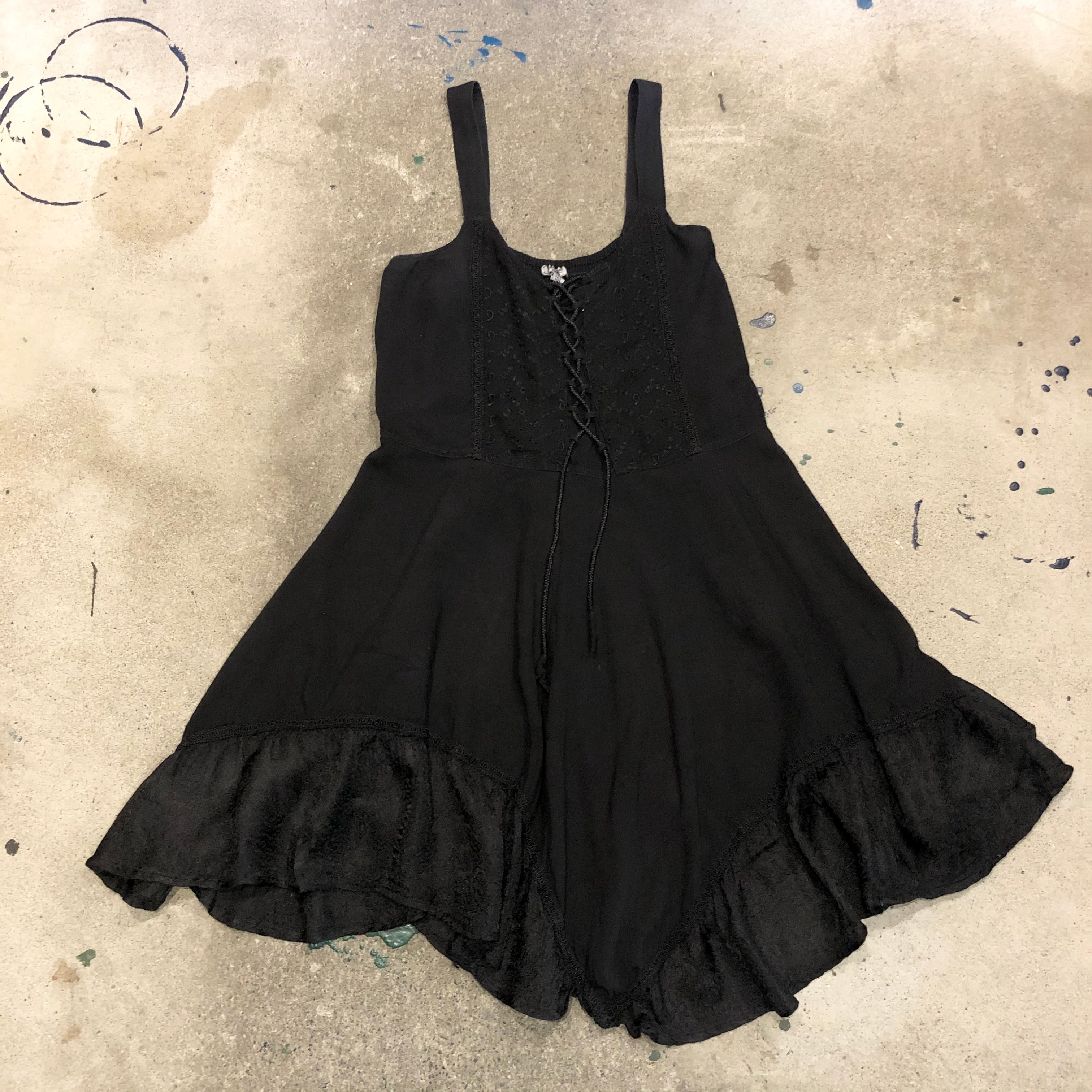 キャミソールタイプのインド製レーヨンワンピースです。真っ黒ですが胸元にレースアップや刺繍、裾にも光沢のある別布がついていたりシンプルすぎなくてかわいいです。スカート部分はサーキュラーの広がりがあり、アシンメトリーな作りになっていて素敵です。
