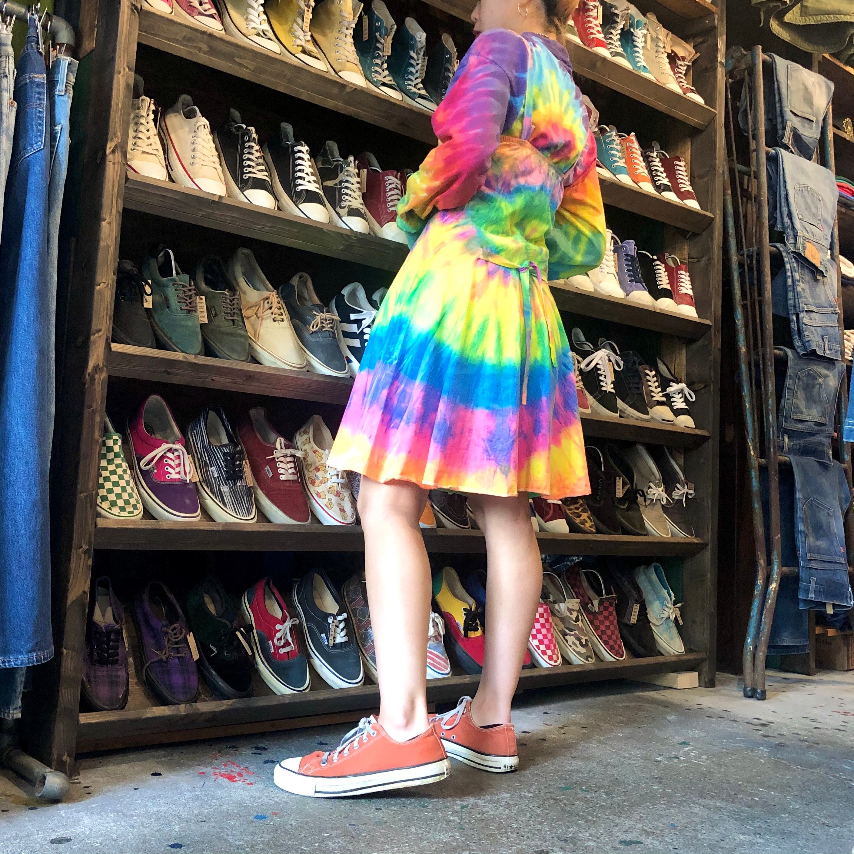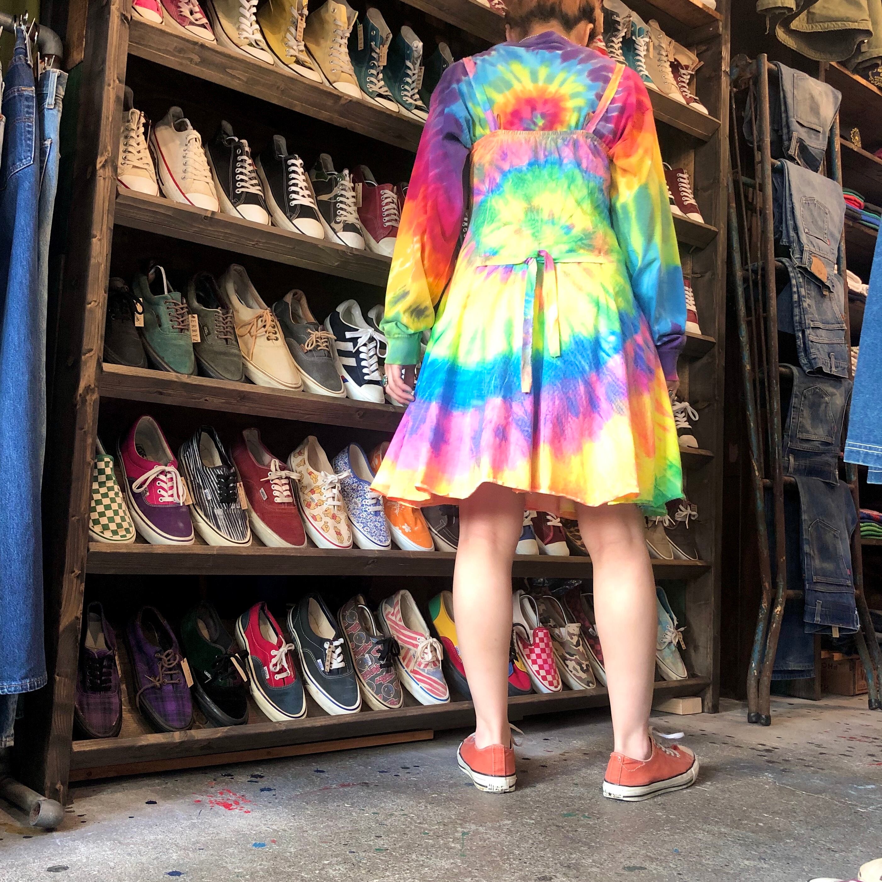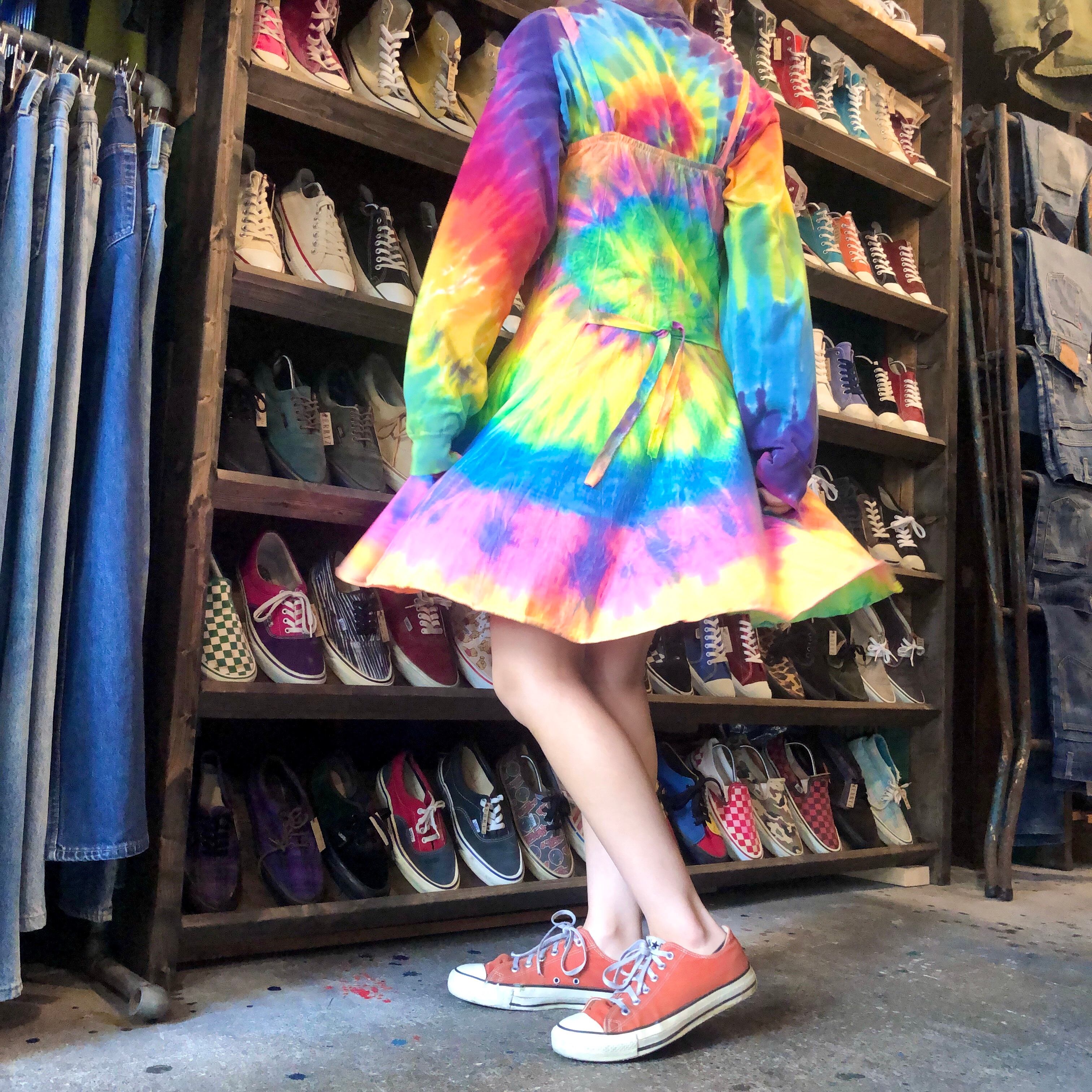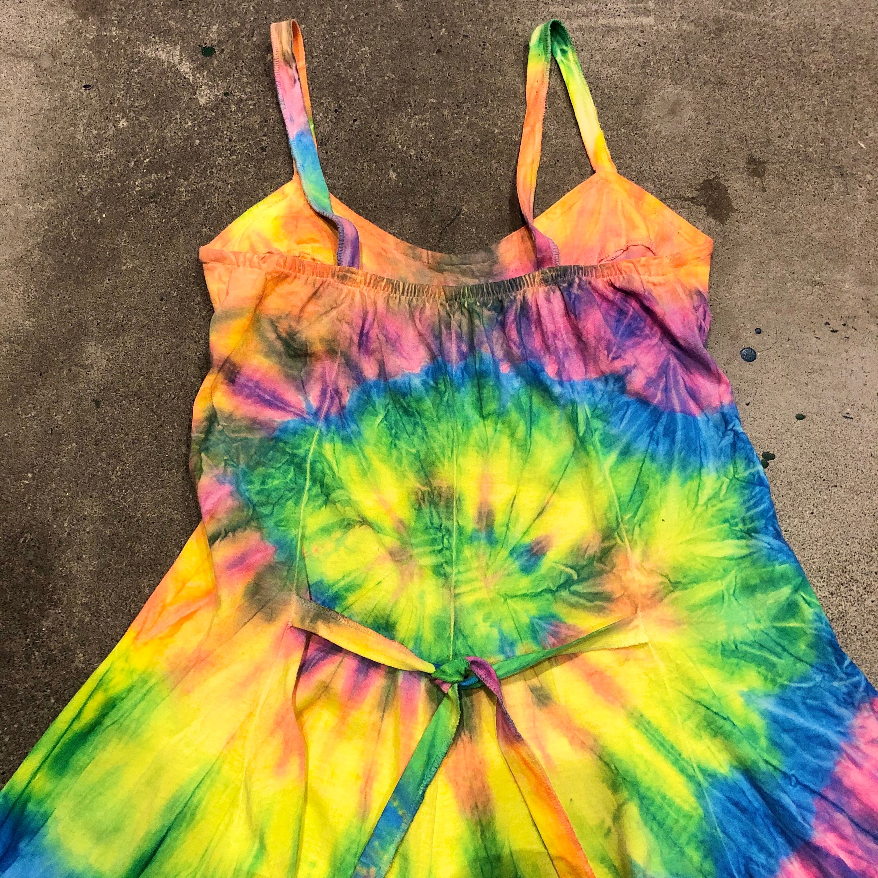 蛍光色っぽいカラーリングのタイダイワンピースです。フェスや海が似合いそうですね!一枚で着るのはもちろん、上にTシャツなどを合わせてスカート部分だけ見せればそんなに派手になりすぎず使えそうです。形がとてもきれいなところもポイントです。