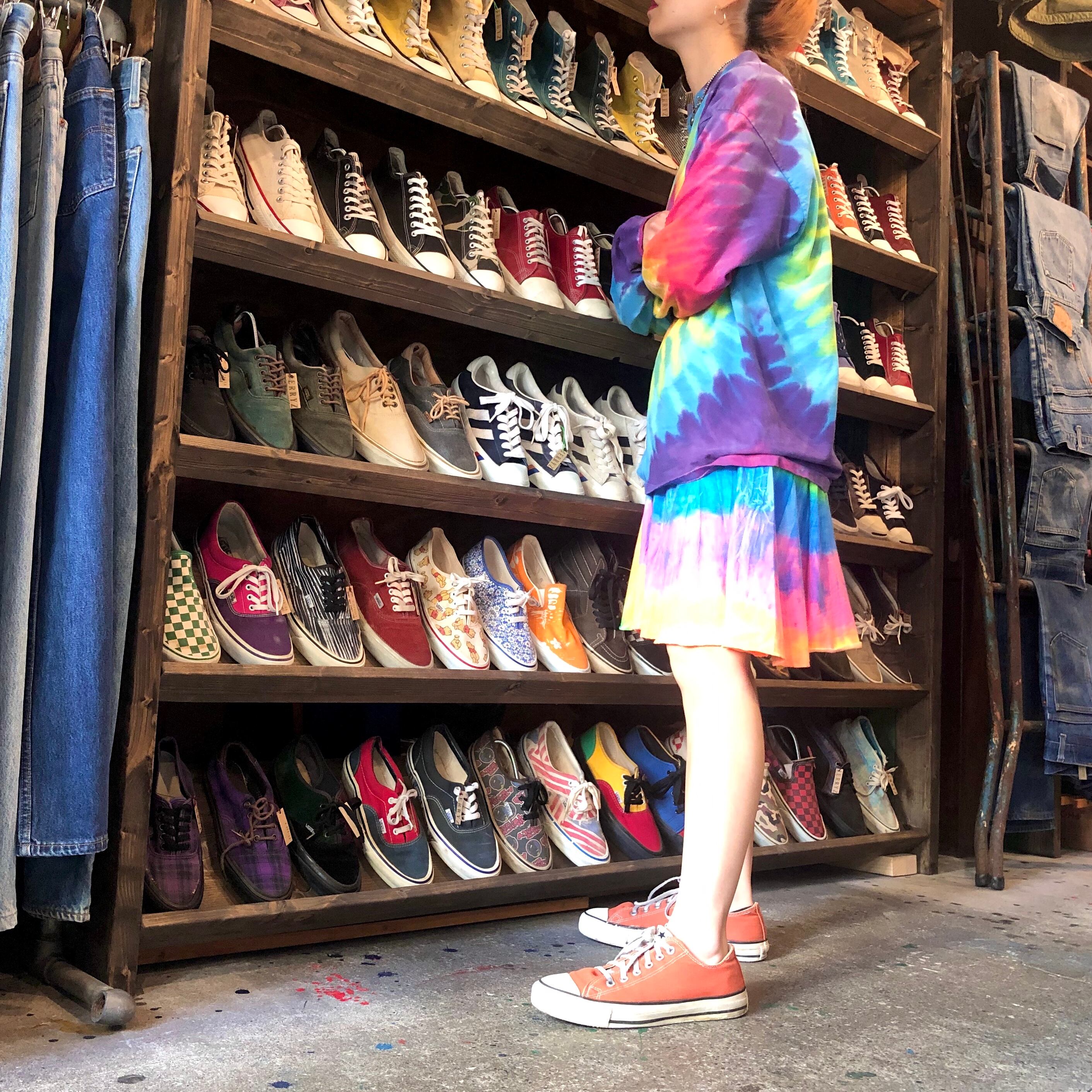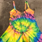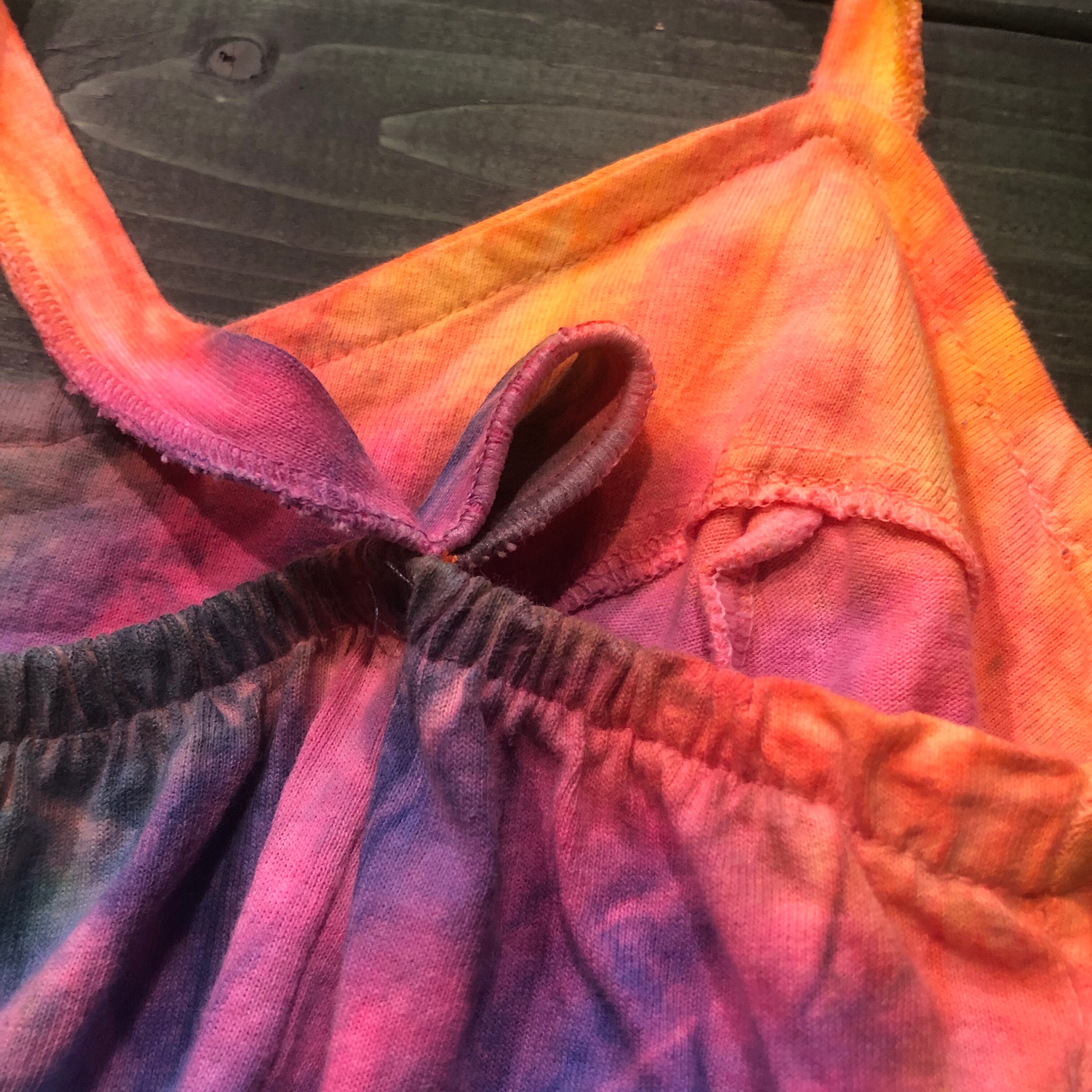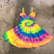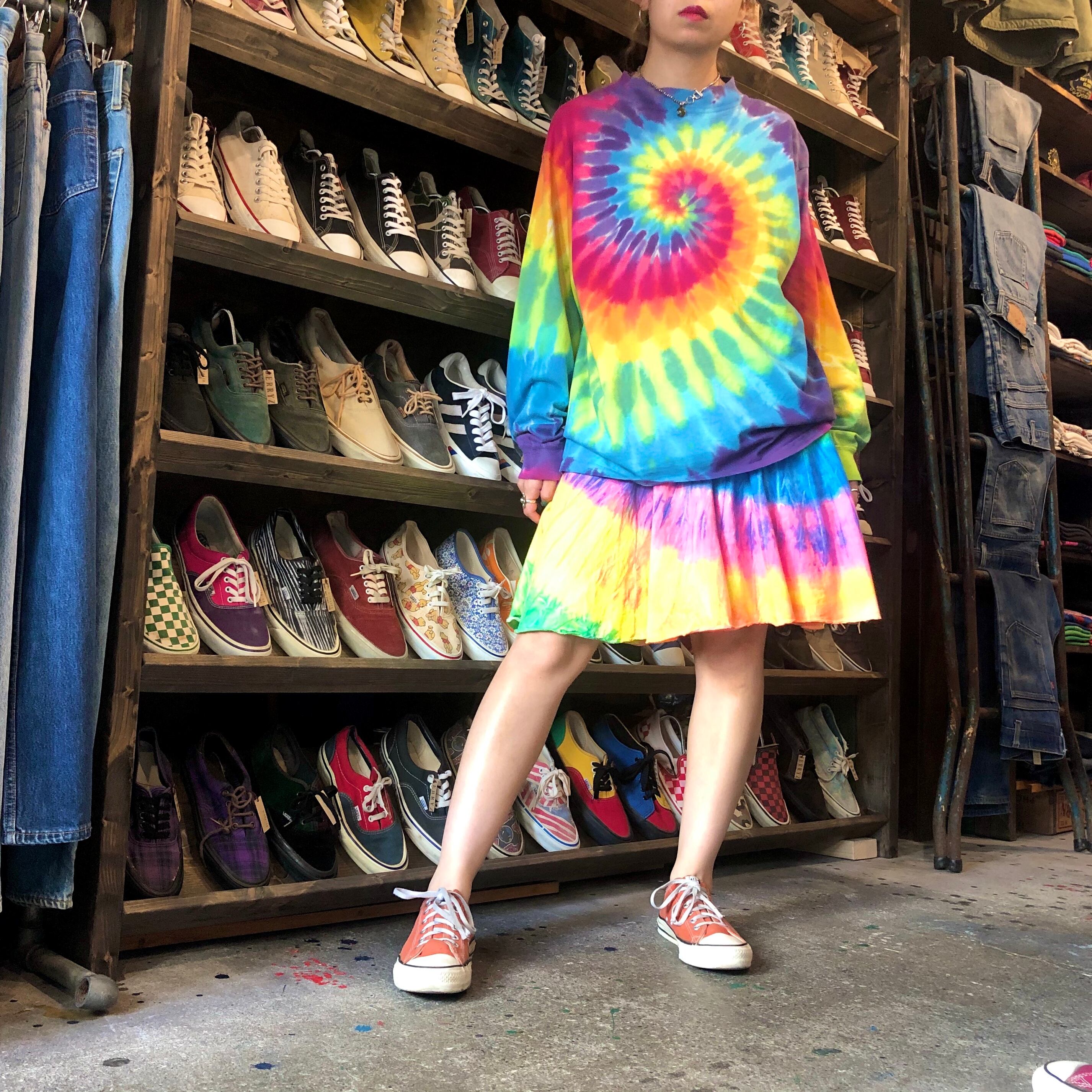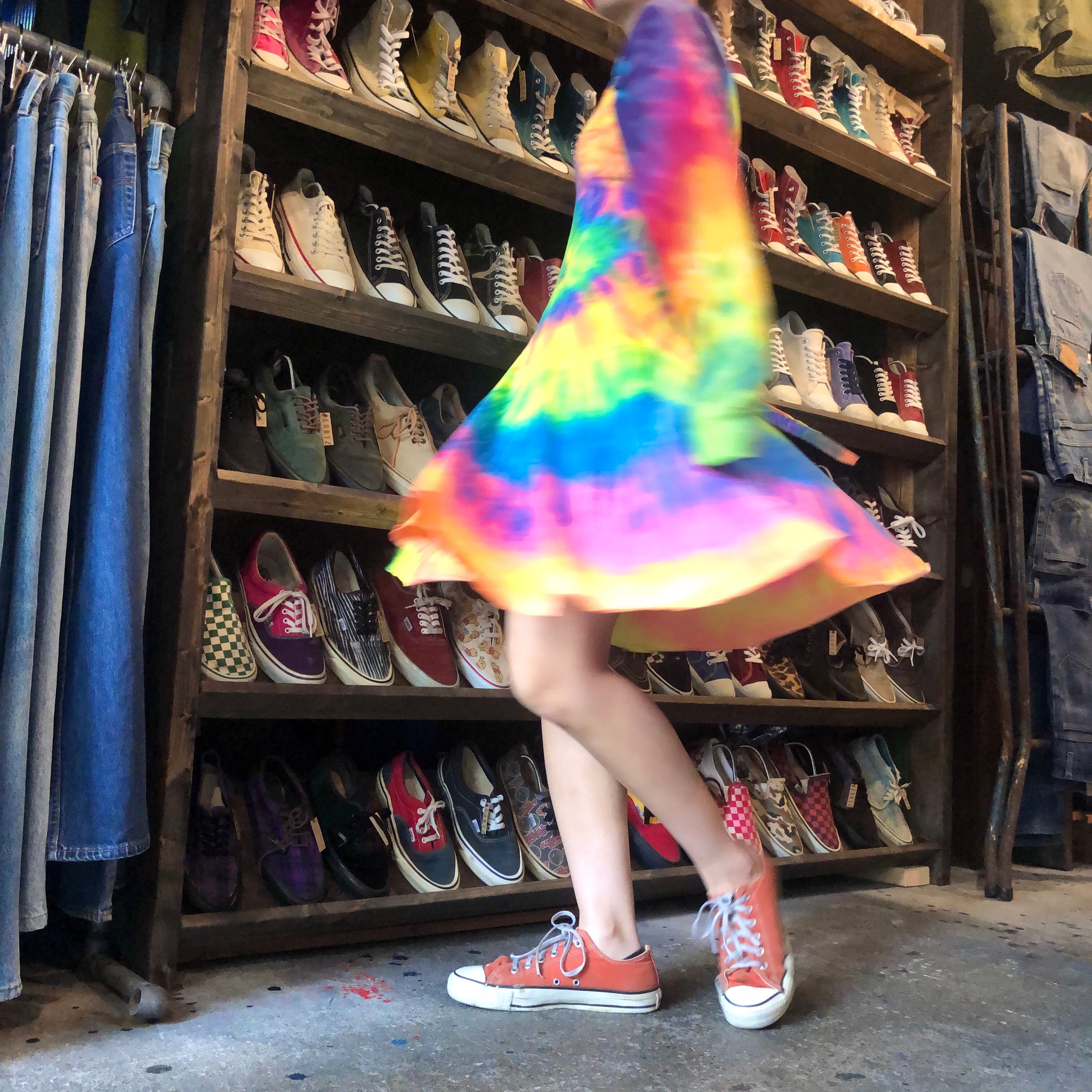 蛍光色っぽいカラーリングのタイダイワンピースです。フェスや海が似合いそうですね!一枚で着るのはもちろん、上にTシャツなどを合わせてスカート部分だけ見せればそんなに派手になりすぎず使えそうです。形がとてもきれいなところもポイントです。