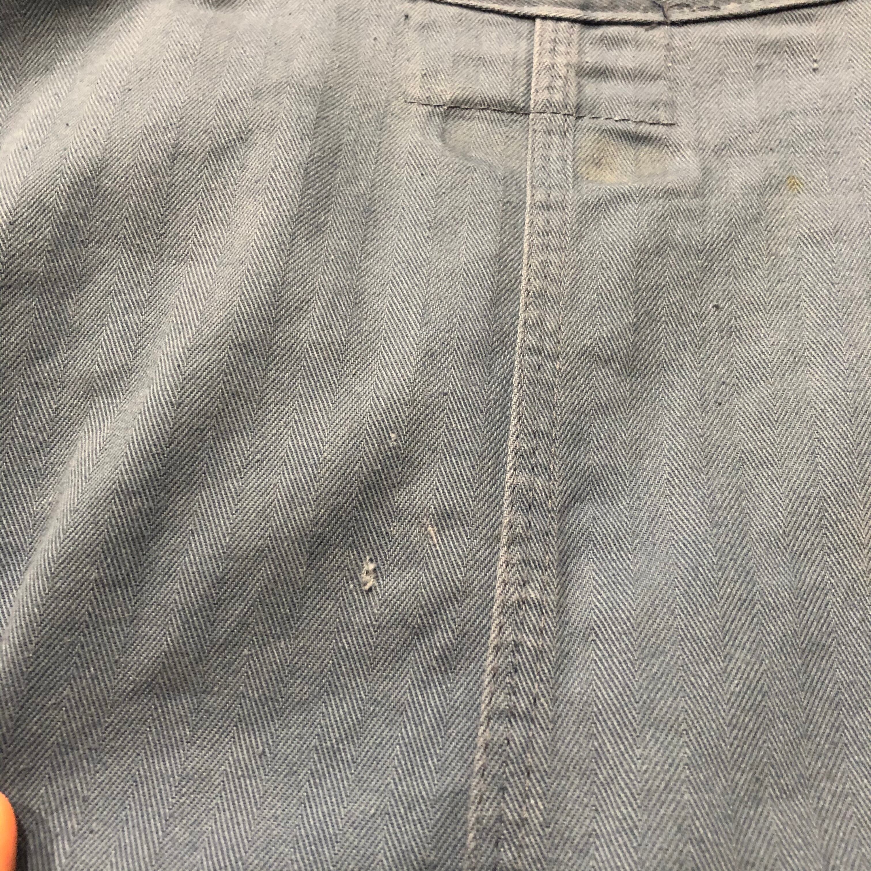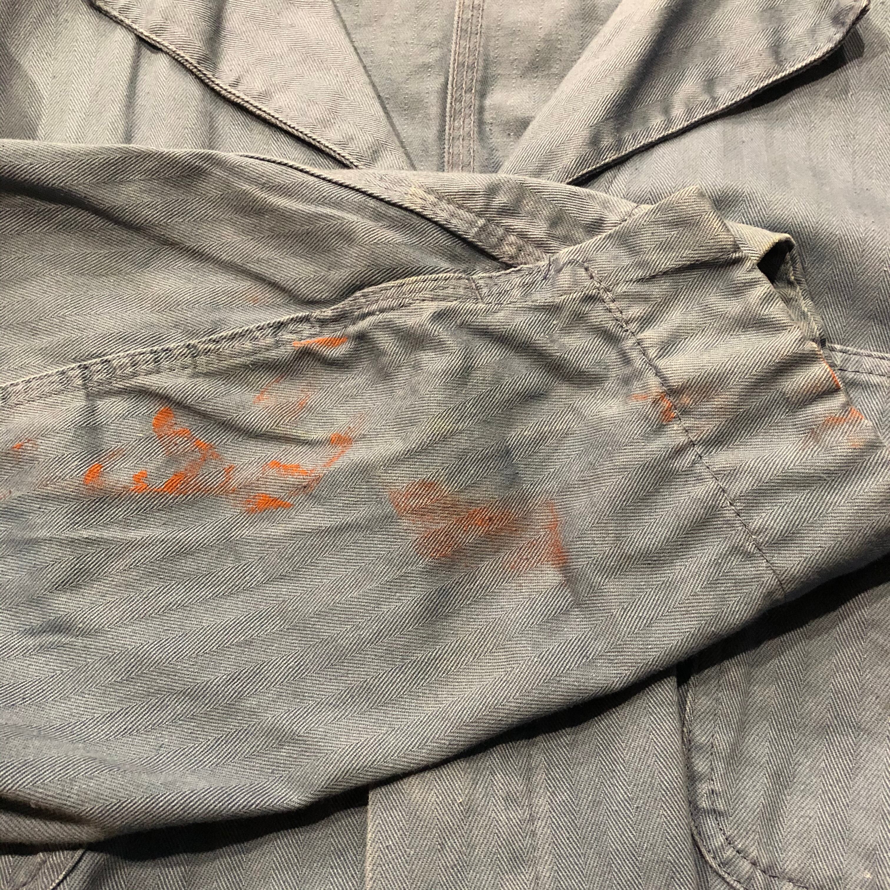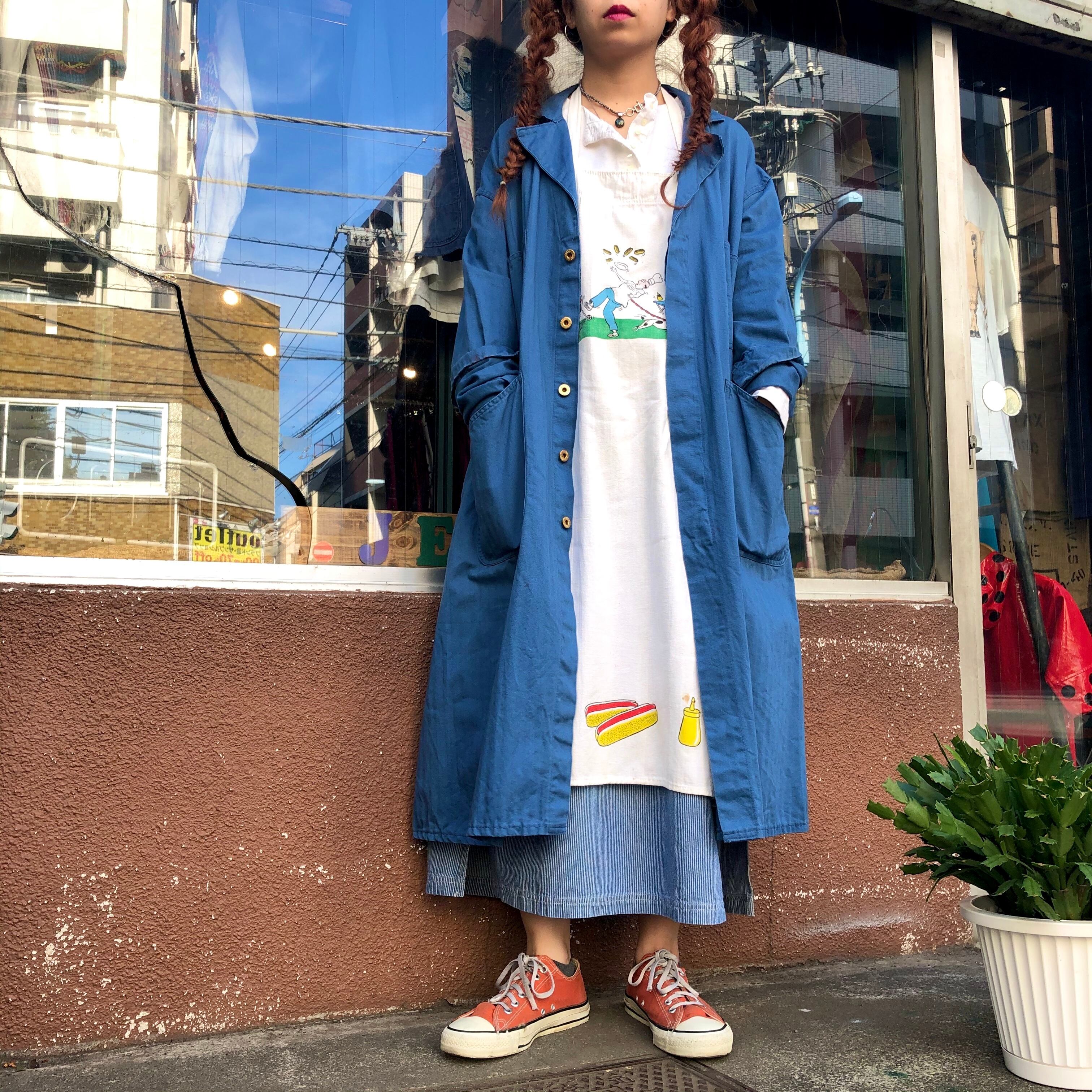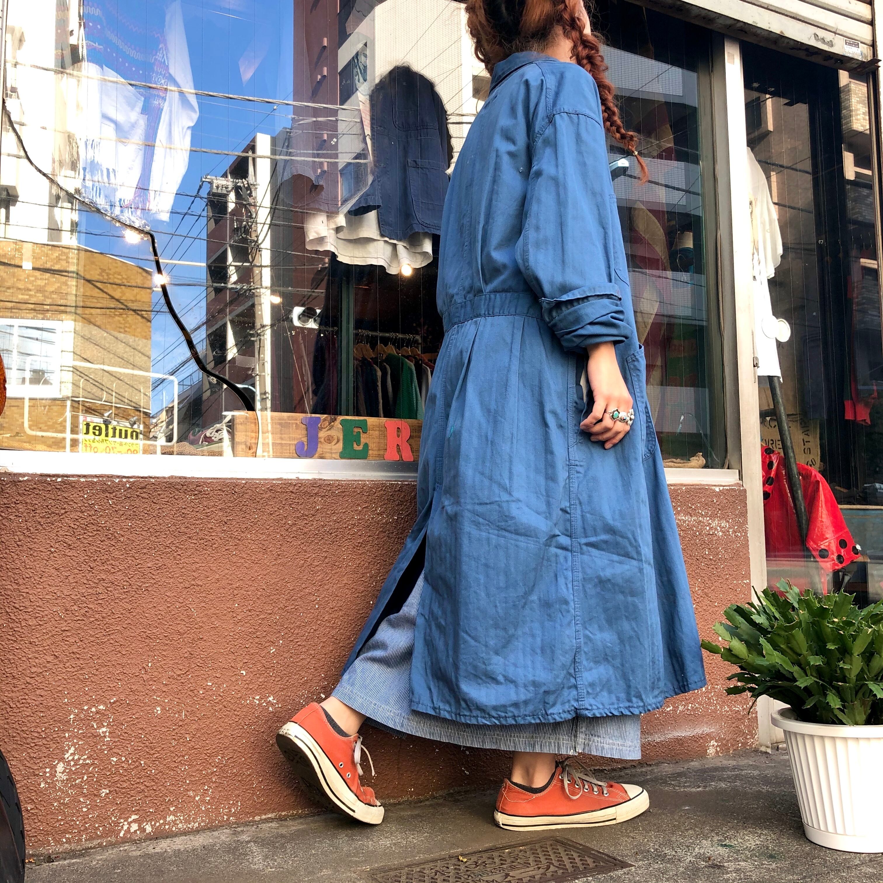 60-70年代アメリカ製、ユニバーサルオーバーオールのショップコートです。ブルーグレーのカラーが結構合わせやすいです。ワークアイテムならではの男臭さが良い感じで、傷やペンキなどのダメージがアジを出しています。大きいサイズなのでもちろん男性がゆったり着るのもおすすめです!