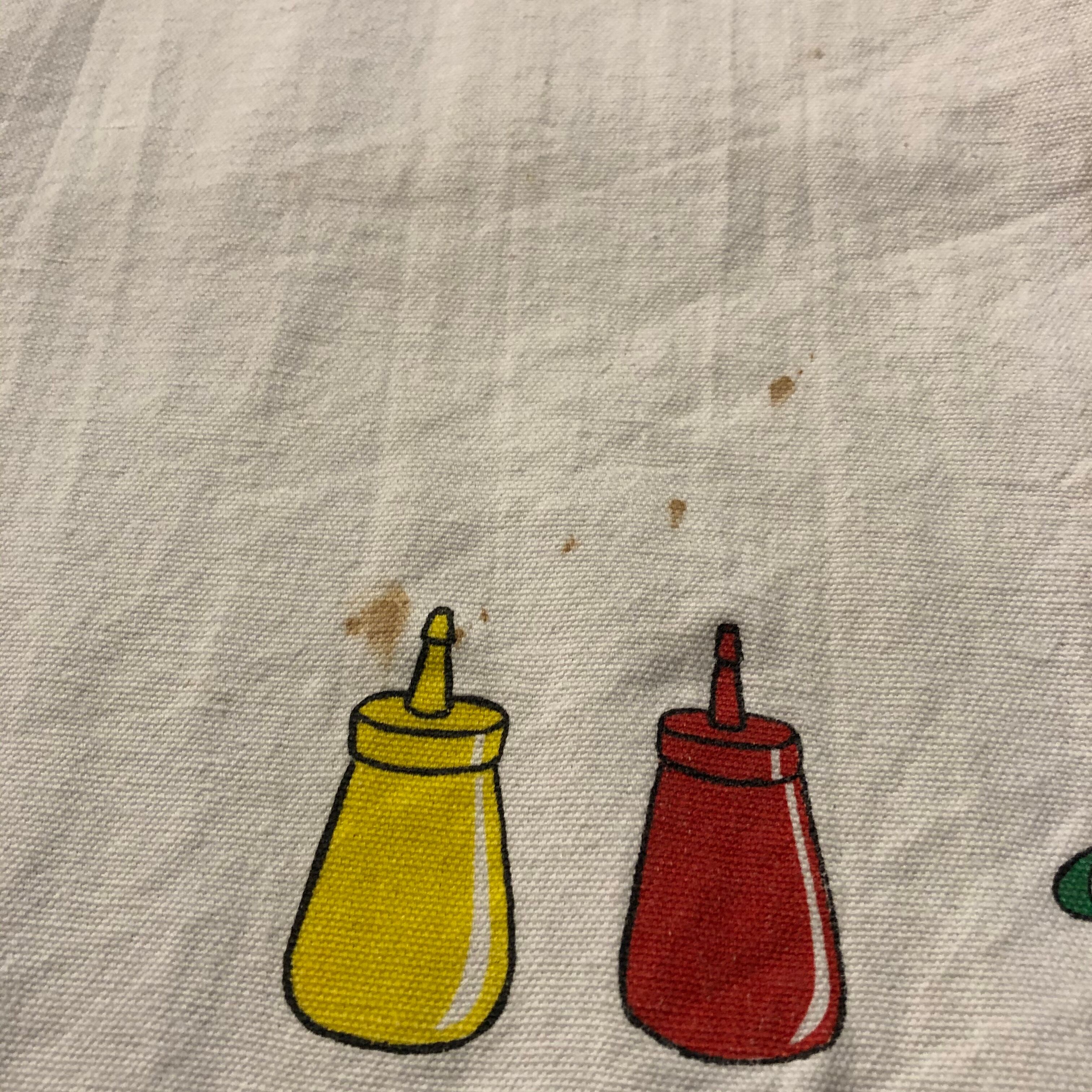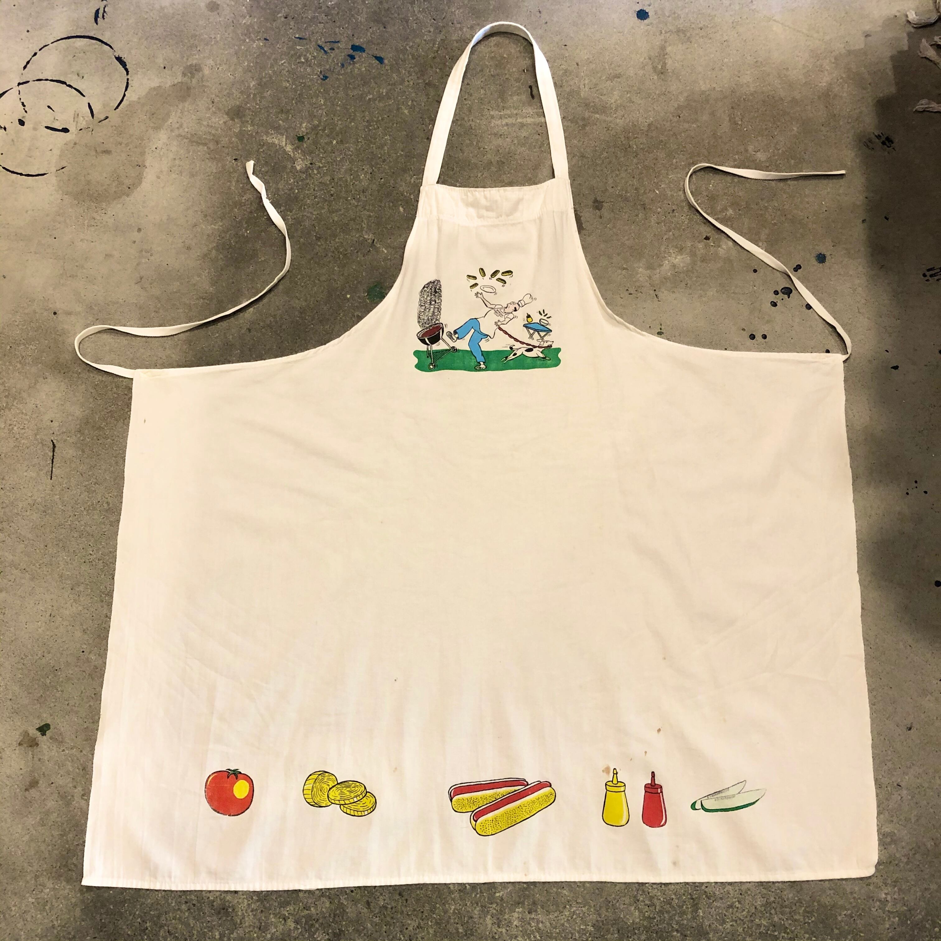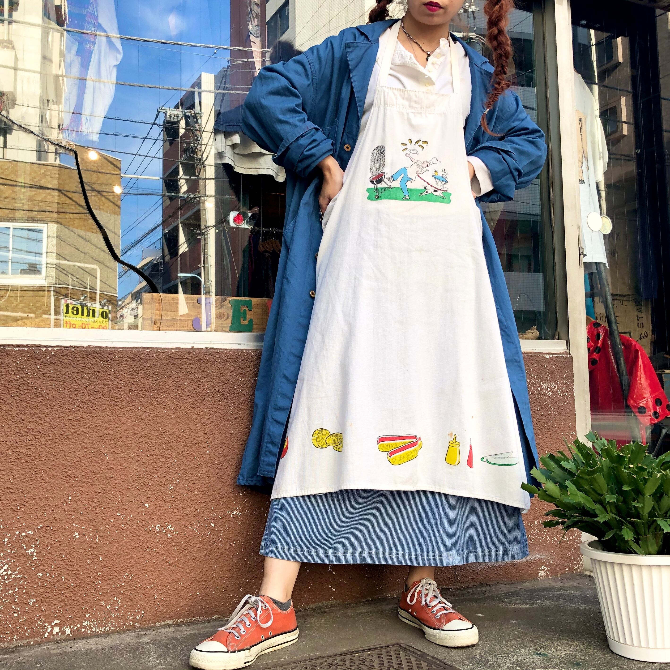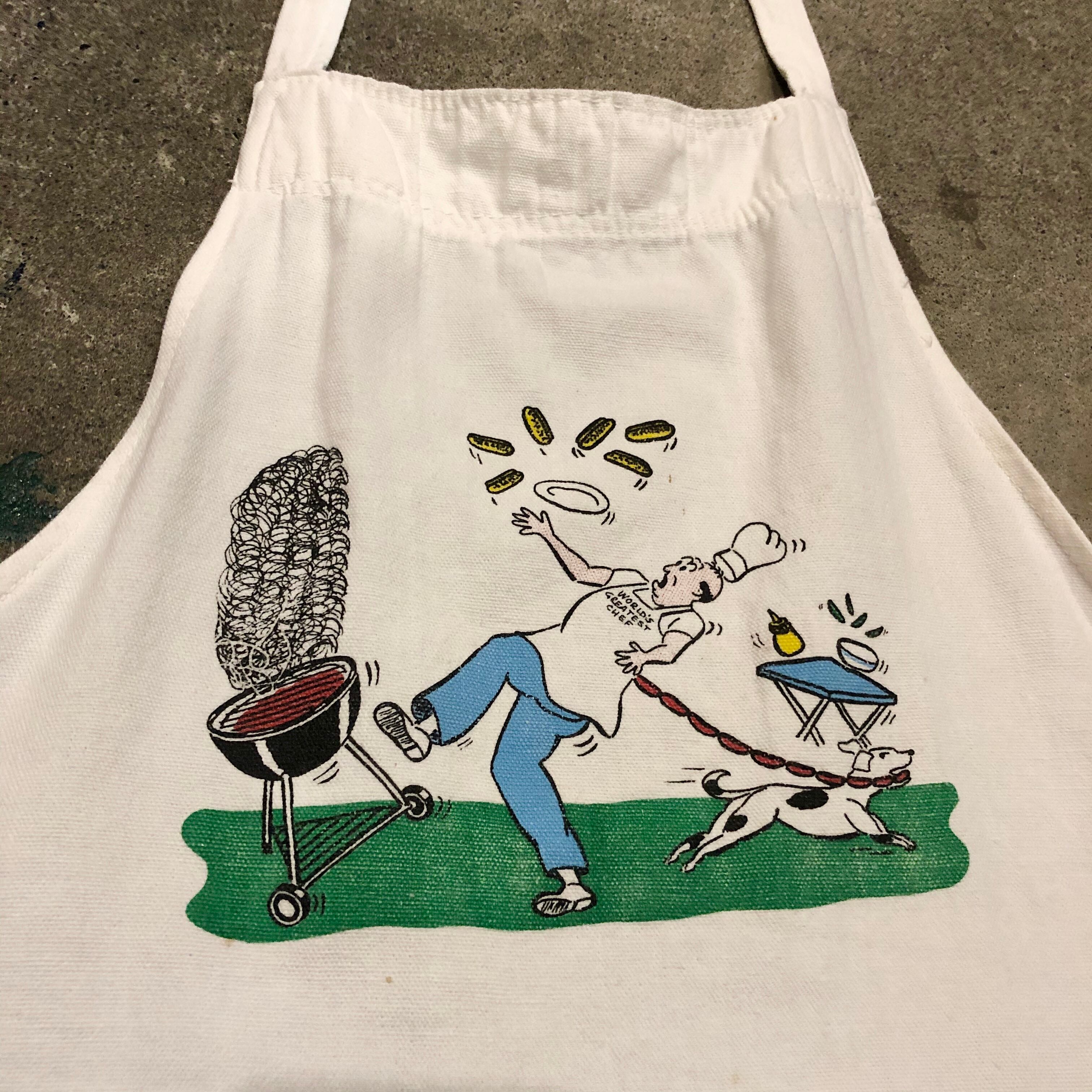 ホットドッグを作ろうとしてるシェフのコミカルなイラストがかわいいエプロンです。裾にはホットドッグの材料がプリントされています。