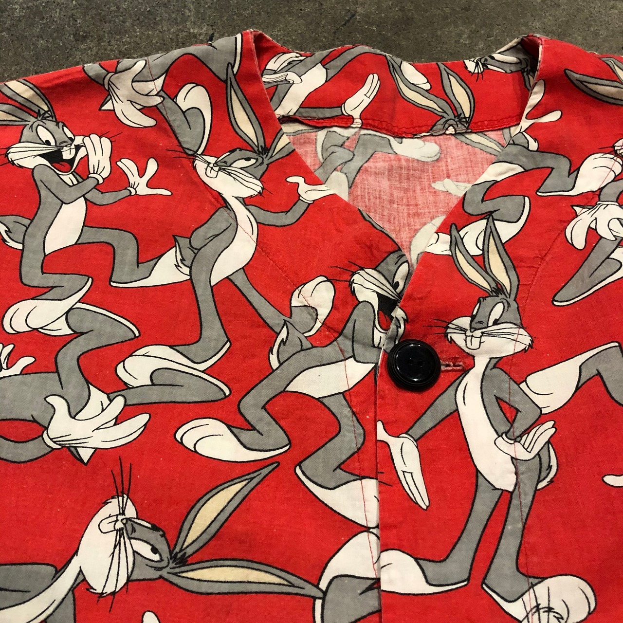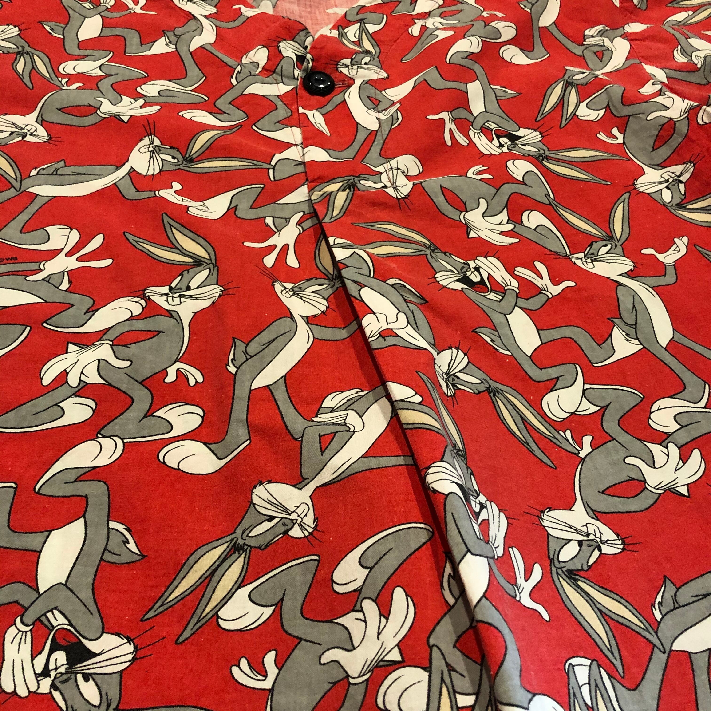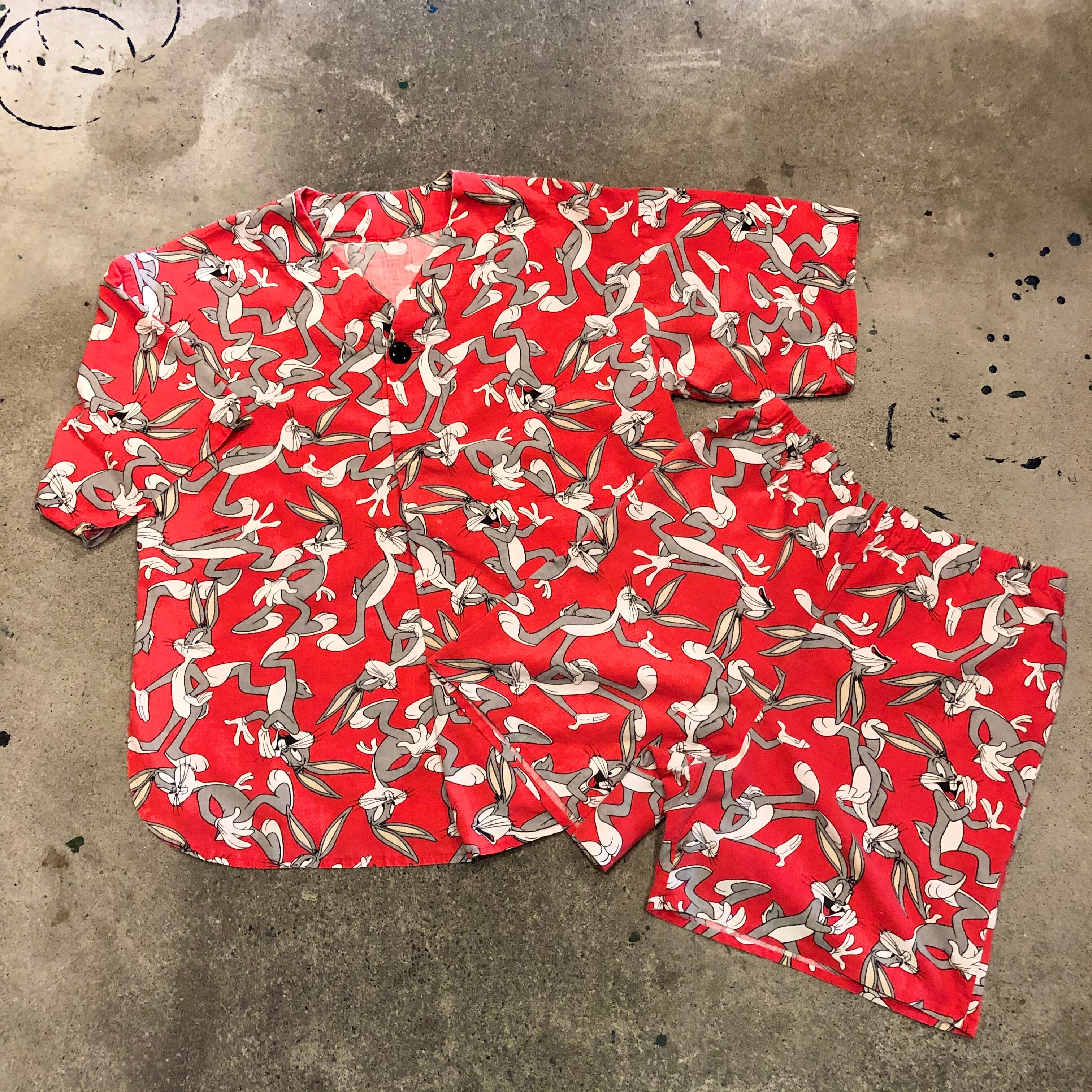 バッグスバニー総柄のハンドメイドによるセットアップです。セットで着たら目立つこと間違いなしですね!別々でトップスはデニムと合わせてポップに、ショーツはTシャツを合わせて着るのも可愛いと思います。