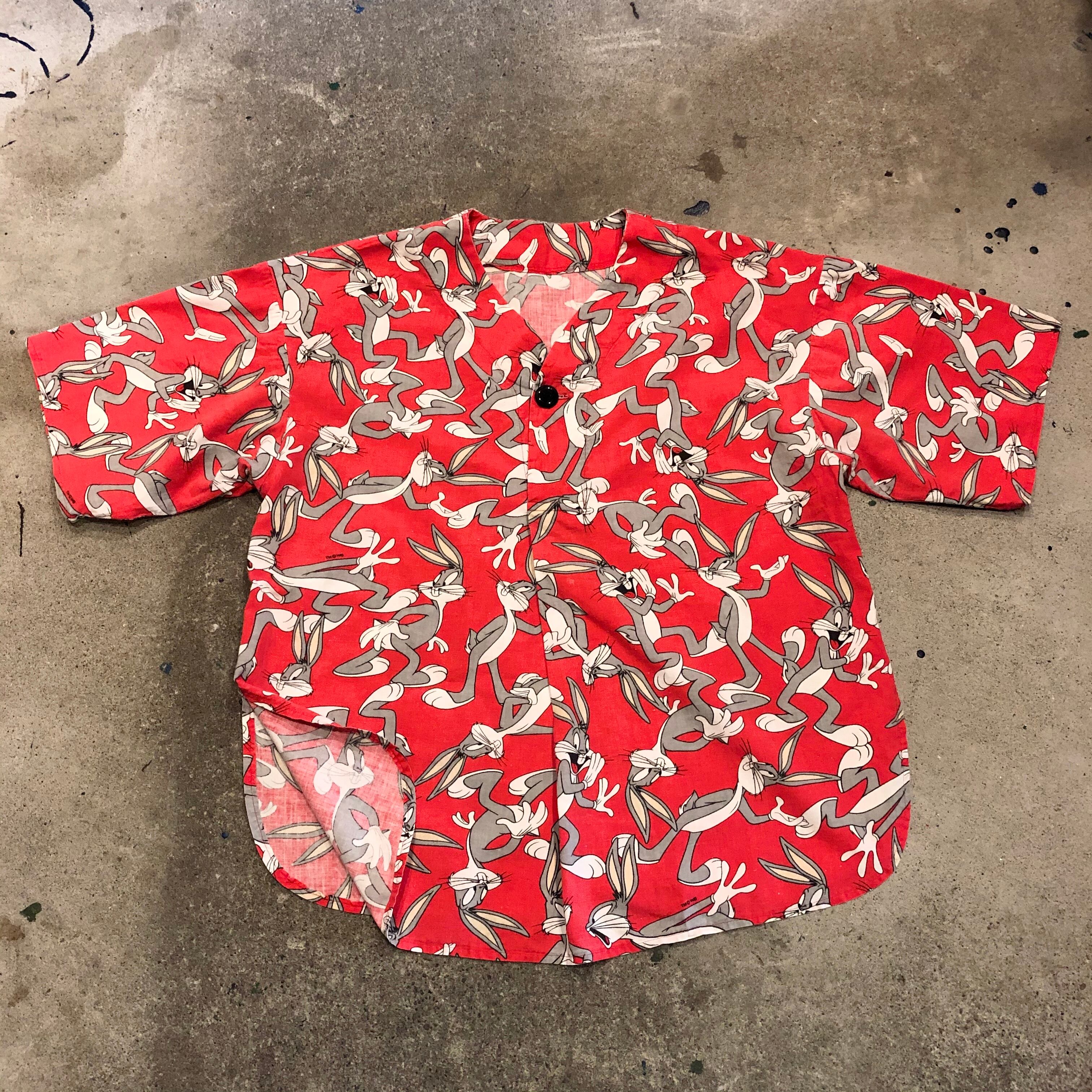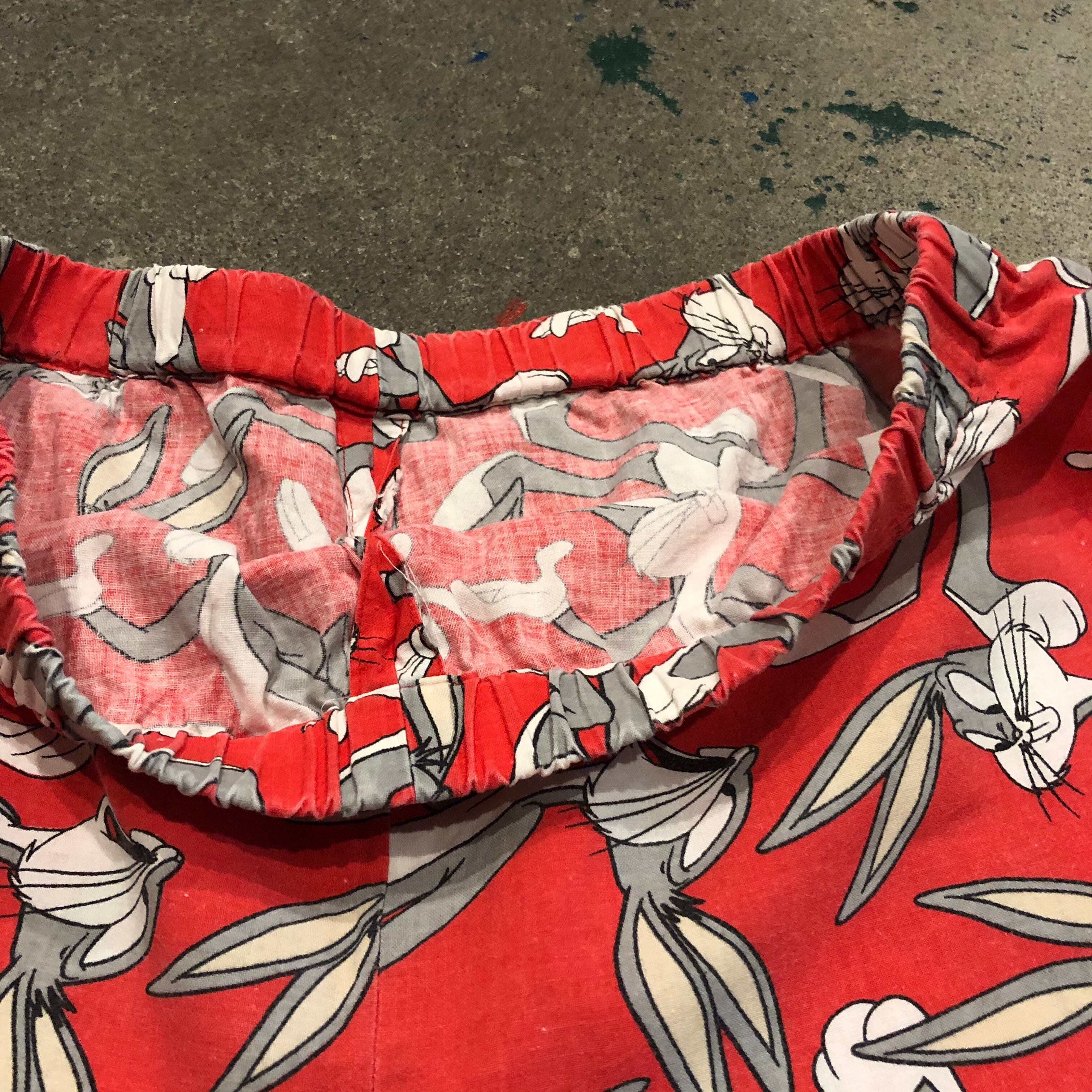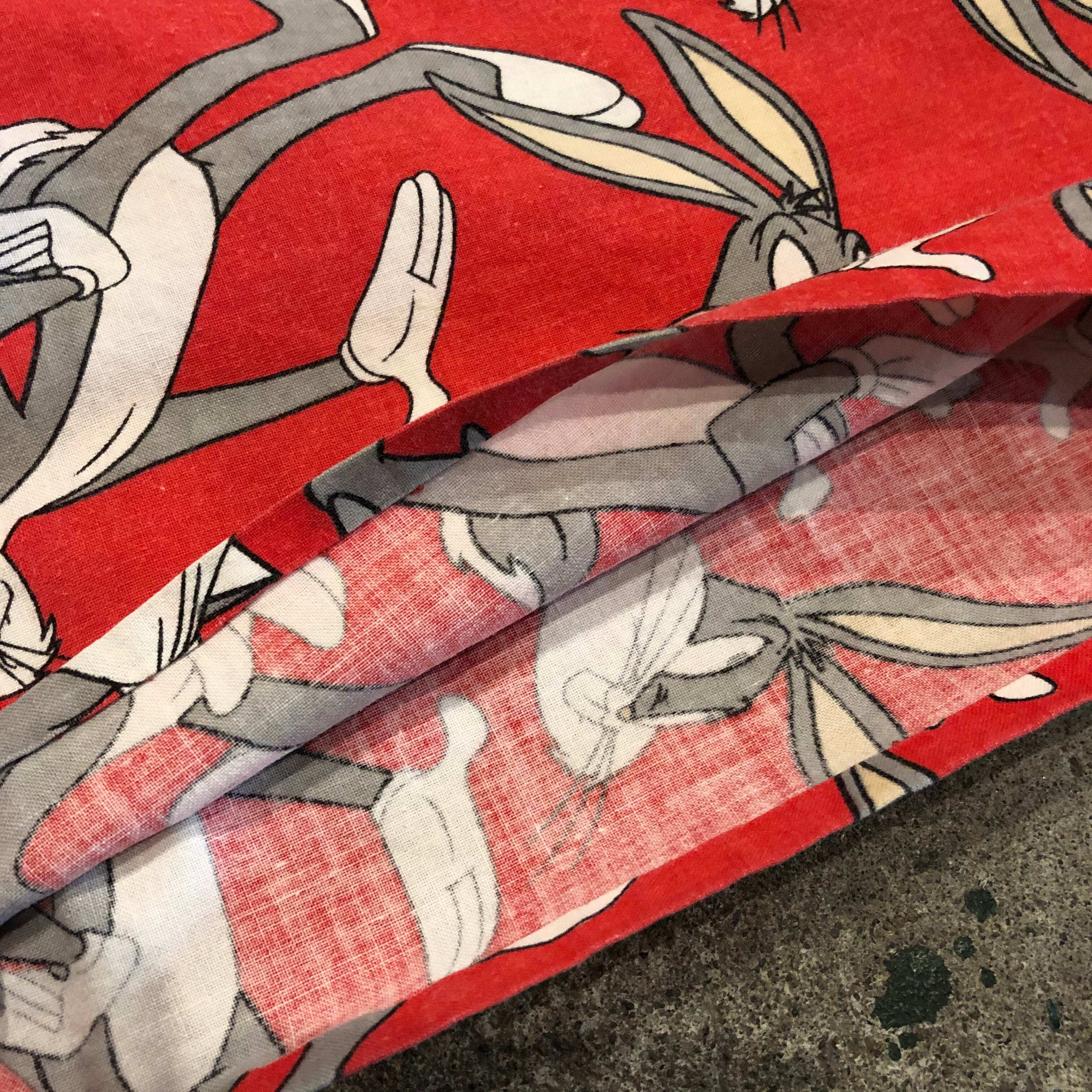 バッグスバニー総柄のハンドメイドによるセットアップです。セットで着たら目立つこと間違いなしですね!別々でトップスはデニムと合わせてポップに、ショーツはTシャツを合わせて着るのも可愛いと思います。