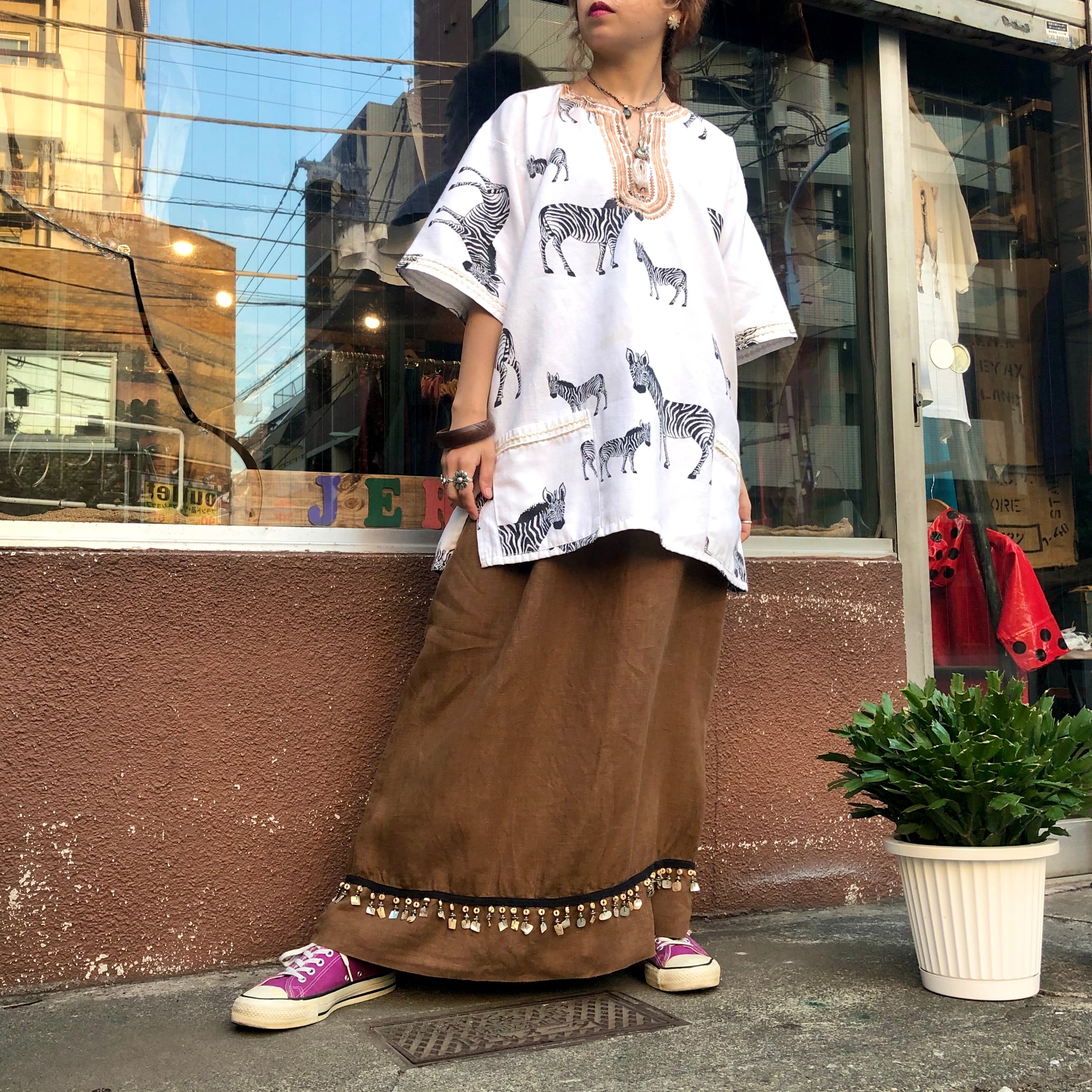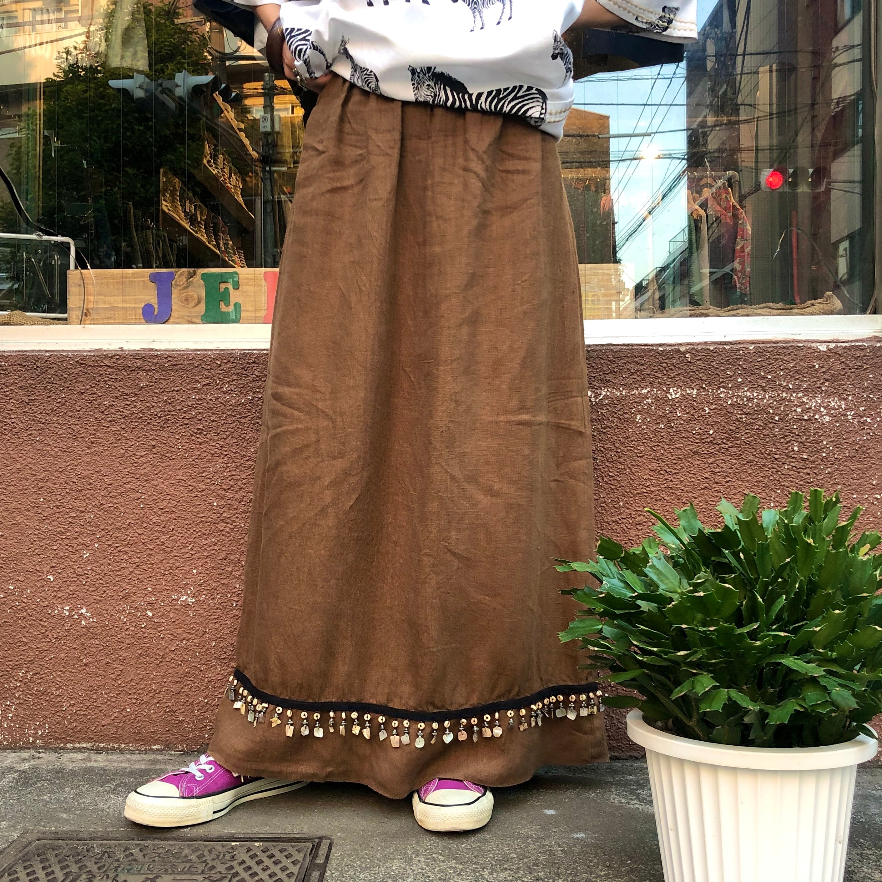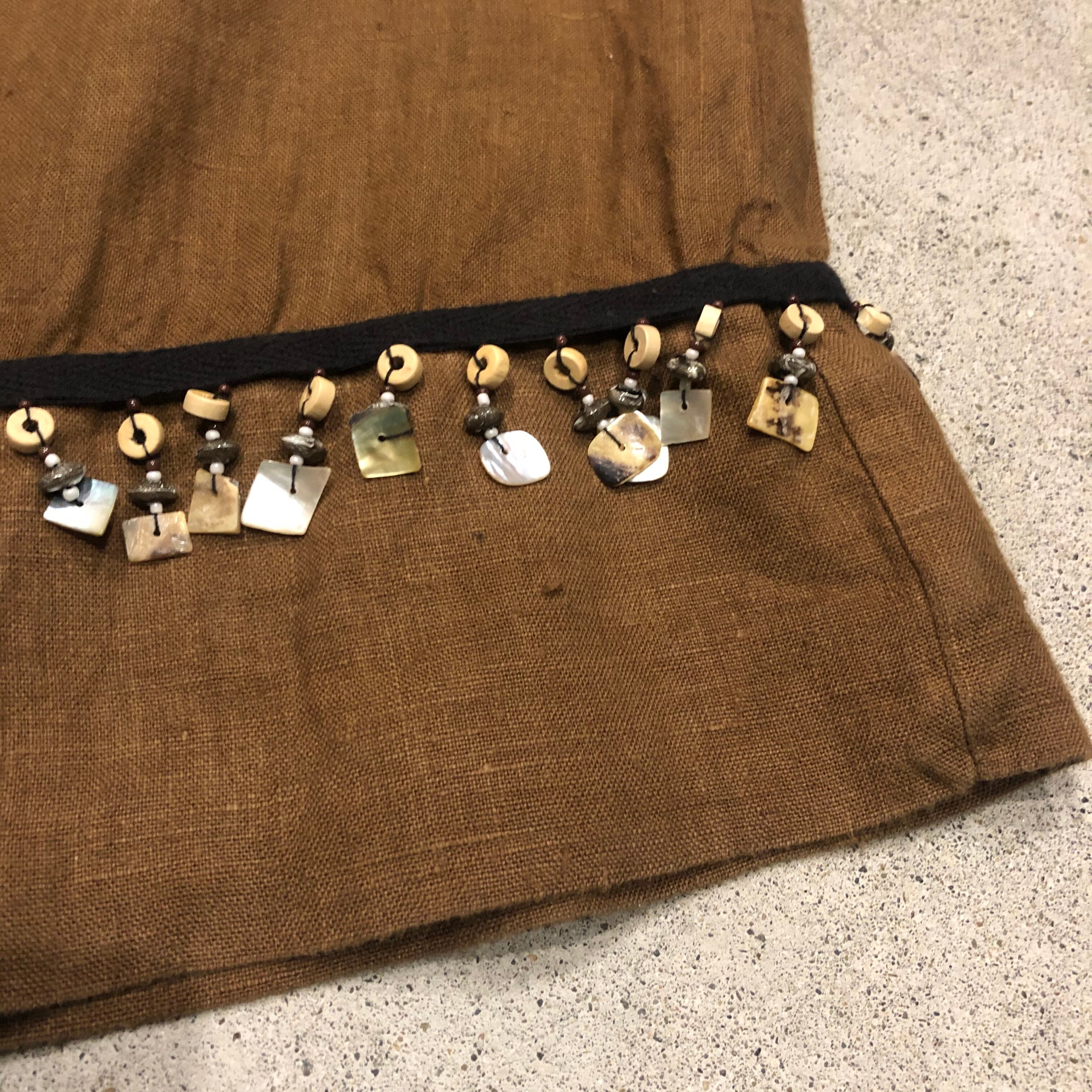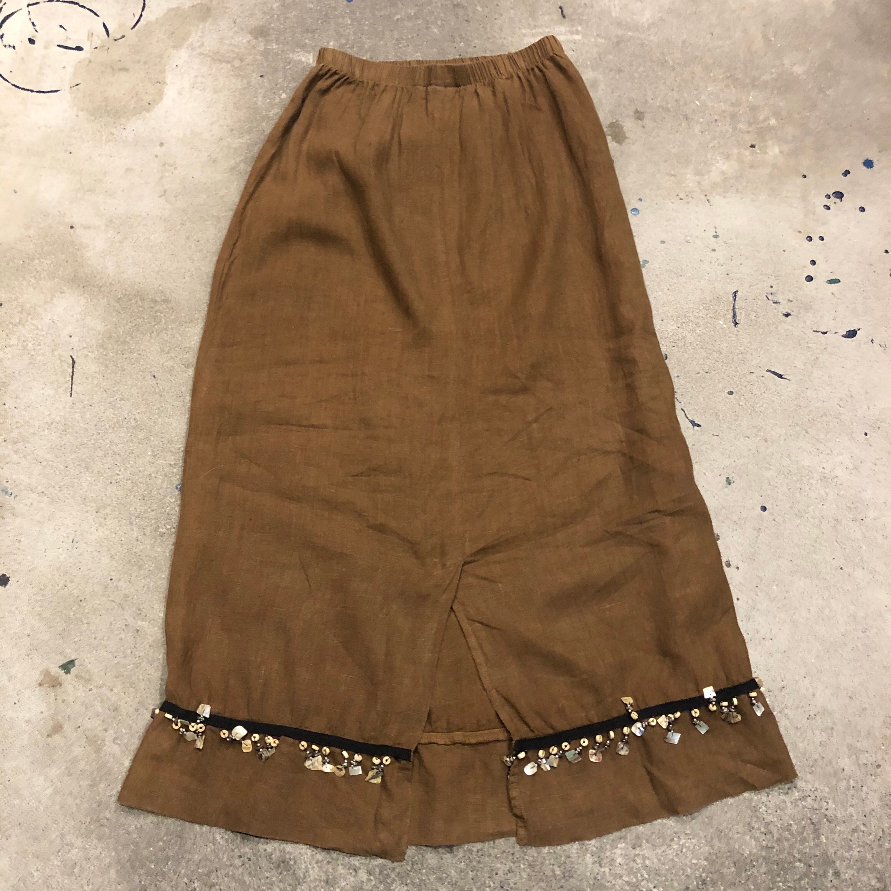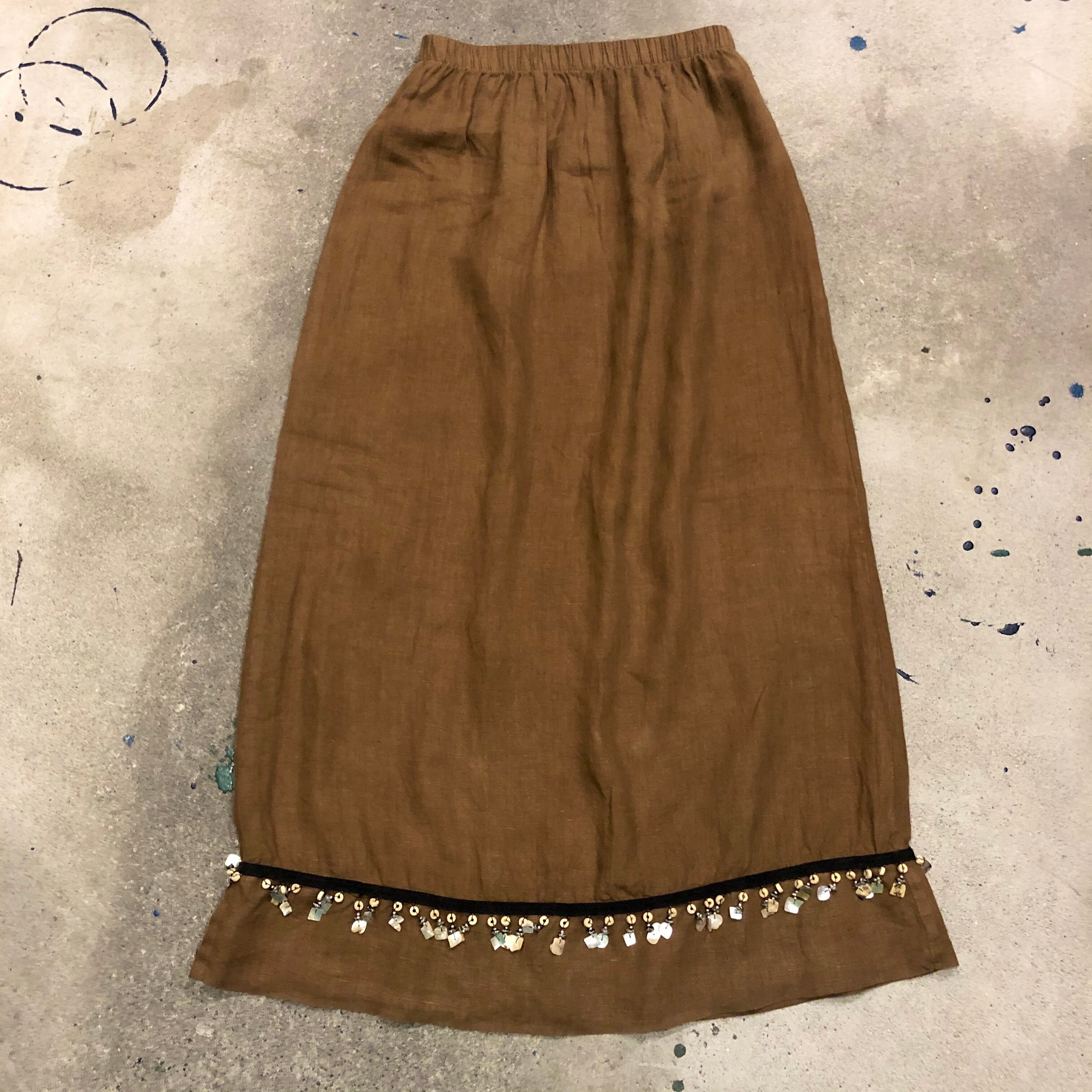 茶色のリネンが大人っぽい印象のロングスカートです。裾にシェルビーズやウッドビーズの装飾がしてあり、きらっとしたりしゃらしゃら涼しげな音がなります。すべて天然素材でこだわって作られているところも素敵です。
