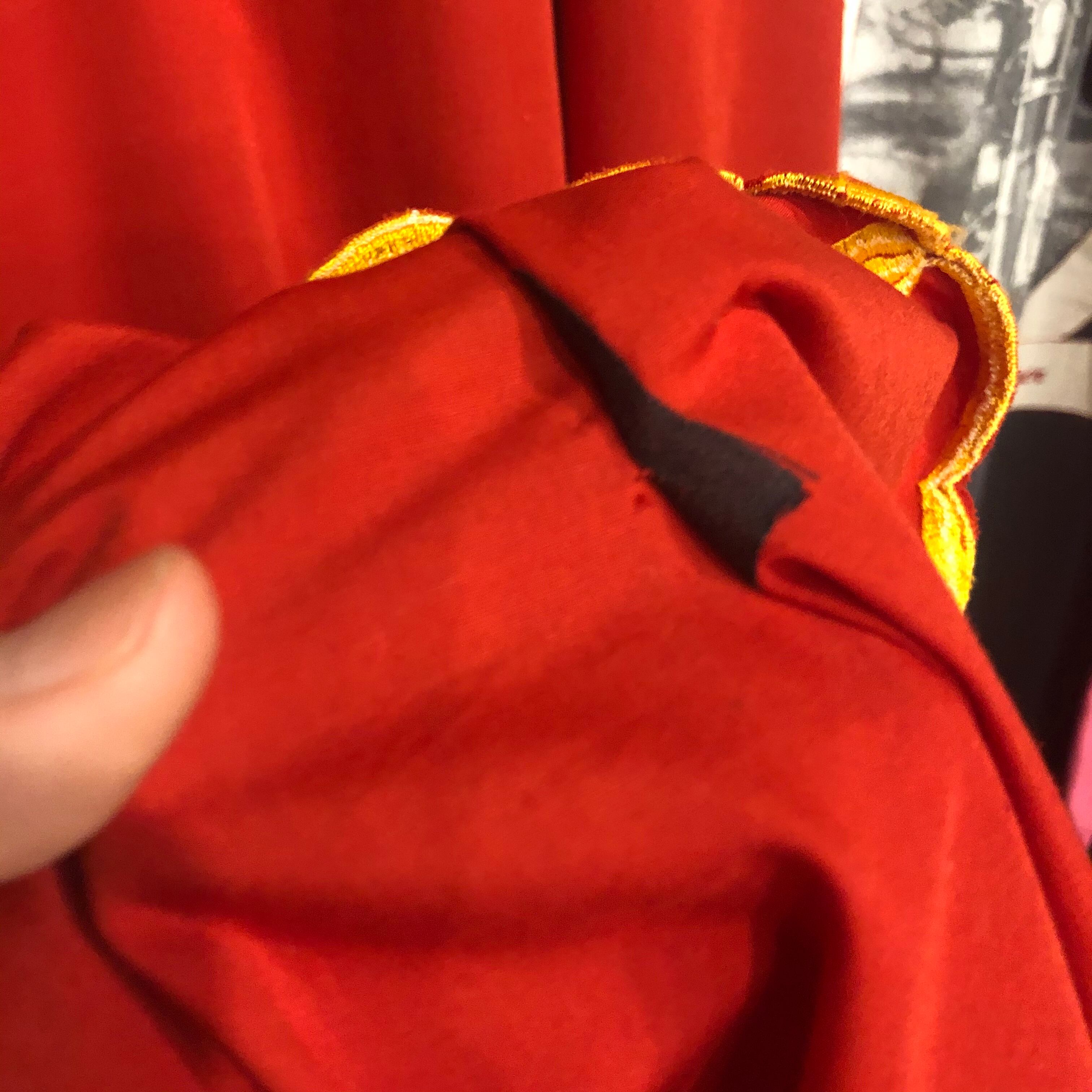 両サイドの裾部分の縫い目部分が切れています。刺繍部分の糸のほつれも数カ所あります。古着にご理解のある方のご購入をお願い致します。